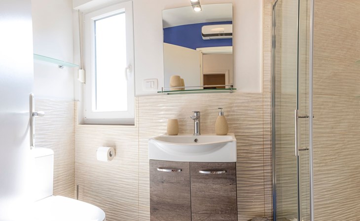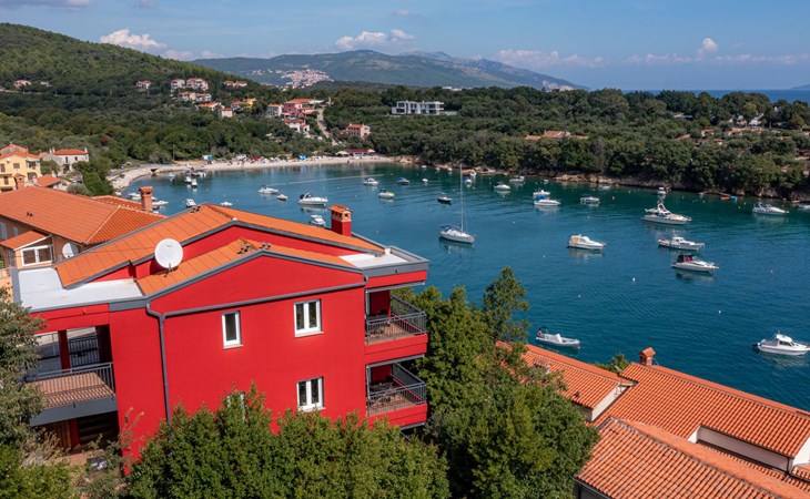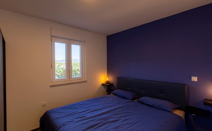 This flat is located in the centre of our apartment building. With two bedrooms with box-spring beds (180x200cm) and a marvellous view of a small bay of Sveta Marina, it offers space for four people.