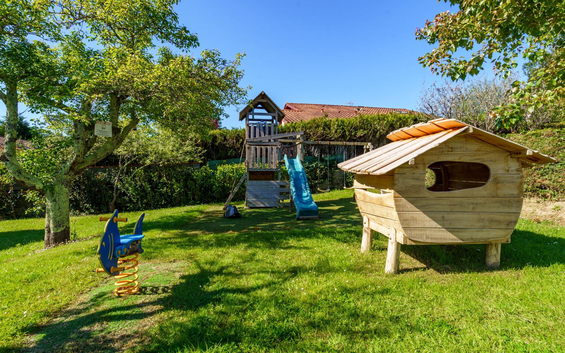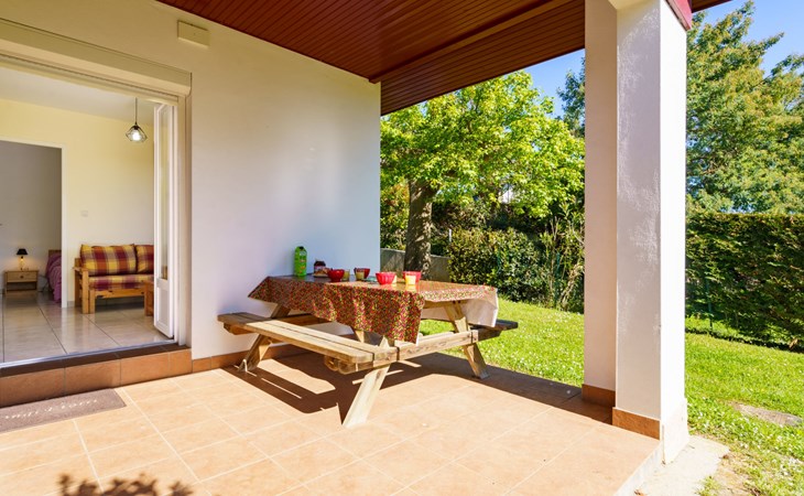 Resort "Les 7 Nains". 7 houses in the resort. In a quiet position, 800 m from the sea, 800 m from the beach, in a cul-de-sac. For shared use: garden (fenced), swimming pool angular (6 x 12 m, seasonal availability: 04.May. - 04.Oct. pool opening hours: 10:00-18:00). Table tennis, boccia, barbecue house, children's playground, pool maintenance by the owner/gardener. In the house: washing machine (for shared use). Shop, grocery 500 m, supermarket 3.5 km, shopping centre 3.5 km, restaurant 500 m, bar 800 m, bakery 500 m, café, bicycle rental 450 m, bus stop "Estalo" 350 m, railway station "Biarritz" 7 km, sandy beach "Parlementia" 800 m (small), thermal baths "Thalmar" 6 km. Golf course (9 hole) 5.3 km, surf school 800 m. Nearby attractions: Port de Guéthary 1 km, Musée Saraleguinea 1.1 km, Bida'Parc 1.2 km, Moulin de Bsssilour 3.3 km, Cité de l'Océan 4.7 km, Musée de la Mer 8.5 km. Hiking paths: La Rhune 16 km. Please note: suitable for families. The owner does not accept any groups. The owner lives on the same property. Additional accommodations can be booked.
