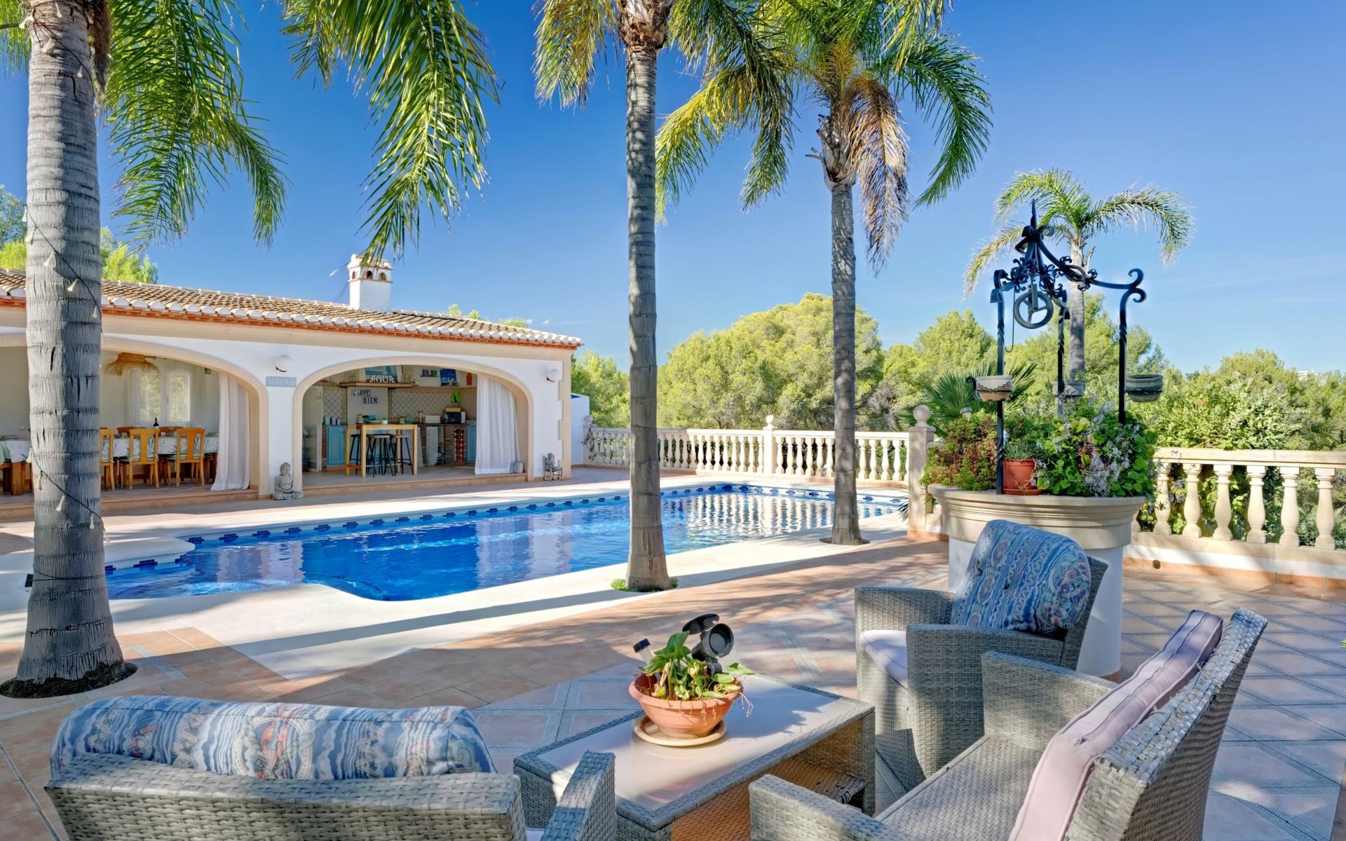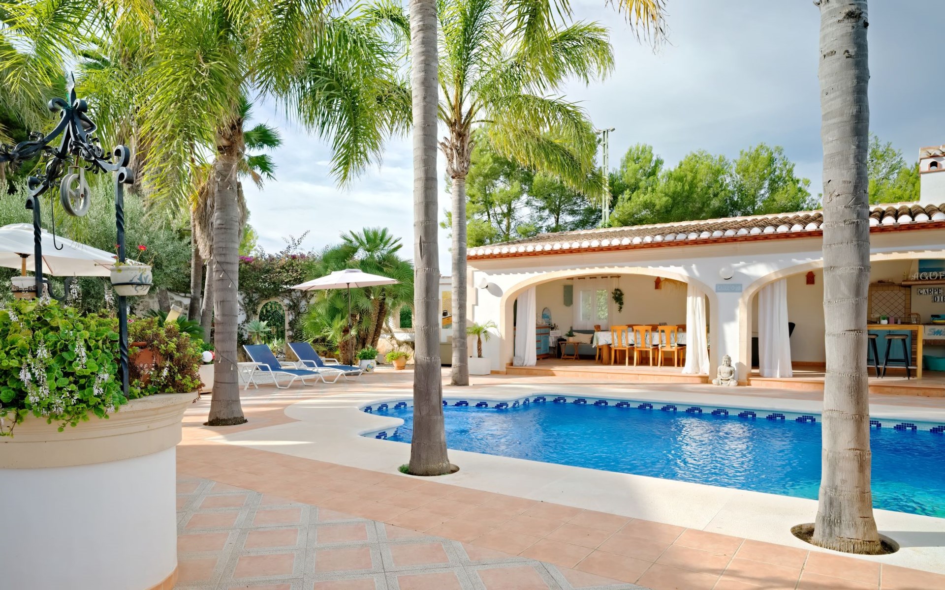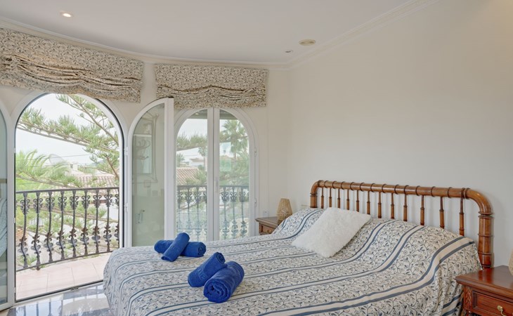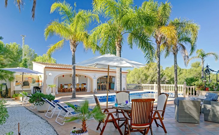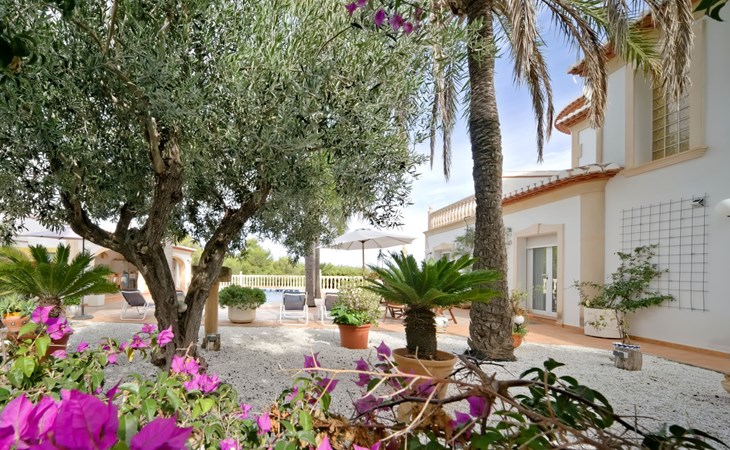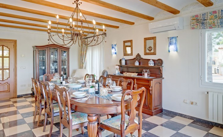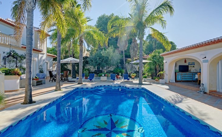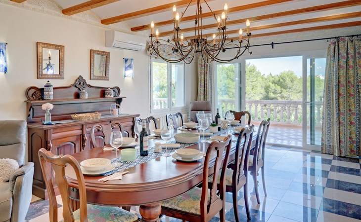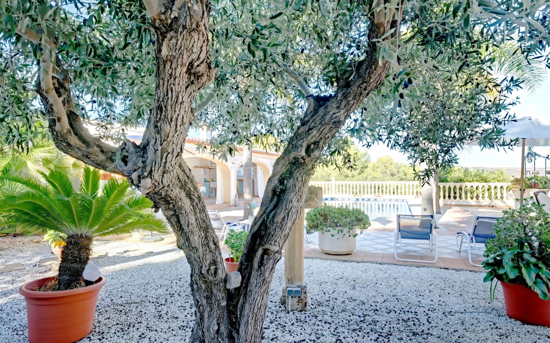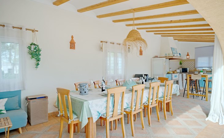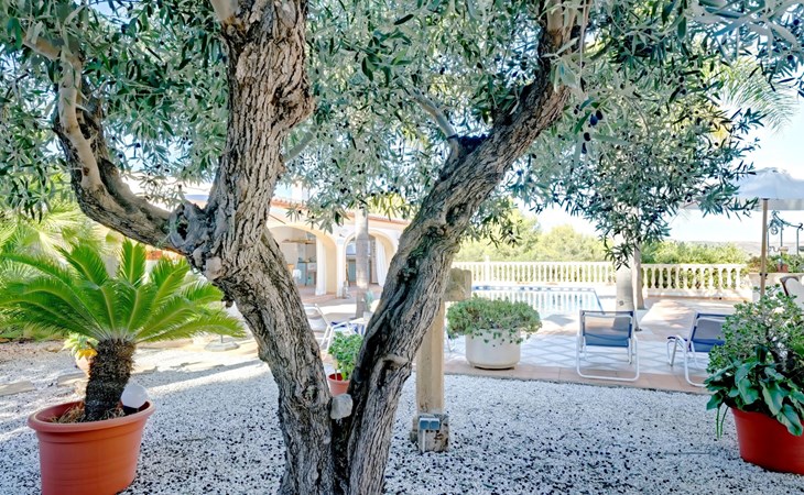 Very large, very beautiful, very comfortable villa "Carpe Diem", 3 storeys. In the district of Pinosol, in the resort 2.8 km from the centre of Arenal Javea, in a quiet, sunny position, 2.8 km from the sea, 2.8 km from the beach. Private: beautiful, well-kept garden (fenced), orchard (fenced), swimming pool (14 x 5 m, depth 40 - 210 cm, seasonal availability: 01.Jan. - 31.Dec.) with internal staircase. Shower/WC in the pool area, pool house with fridge and cooking stove, pergola, garden furniture, barbecue house, parking (for 4 cars) on the premises. Supermarket 2.3 km, restaurant 500 m, café 550 m, bus stop "Parada antiguo Mas y Mas" 2 km, sandy beach "El Arenal" 2.8 km, rocky beach "Segundo Muntanya" 3 km. Sports harbour 2.8 km, surf school 2.8 km, sailing school 2.8 km, tennis 3 km. The owner does not accept any youth groups.