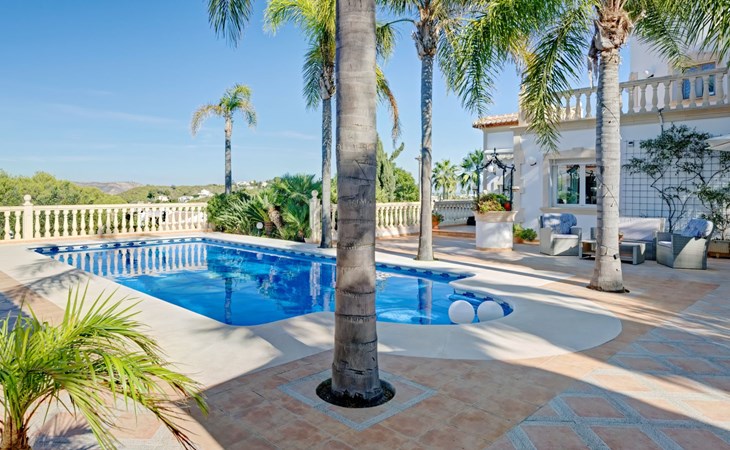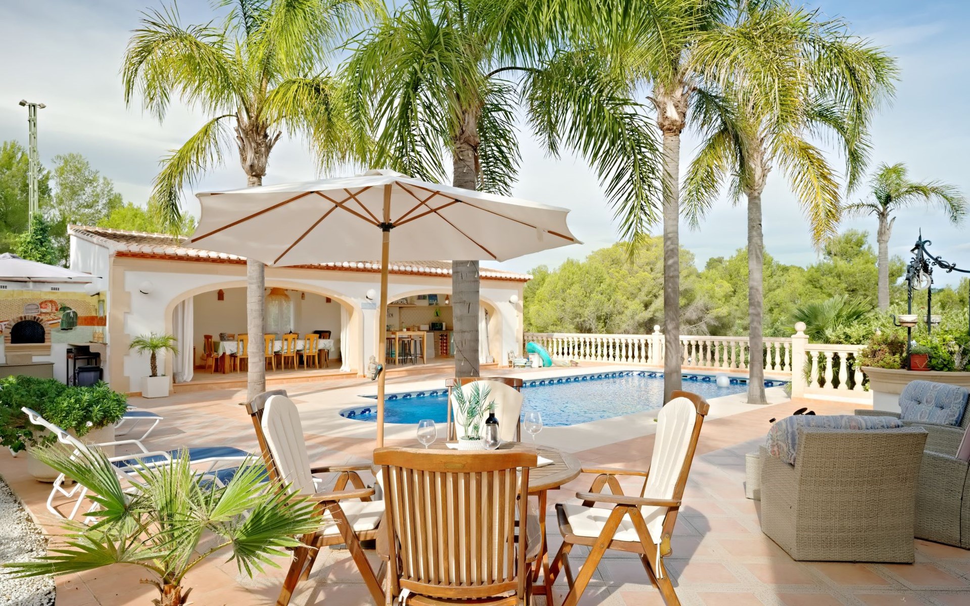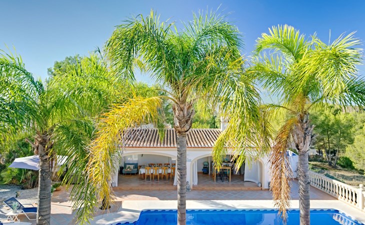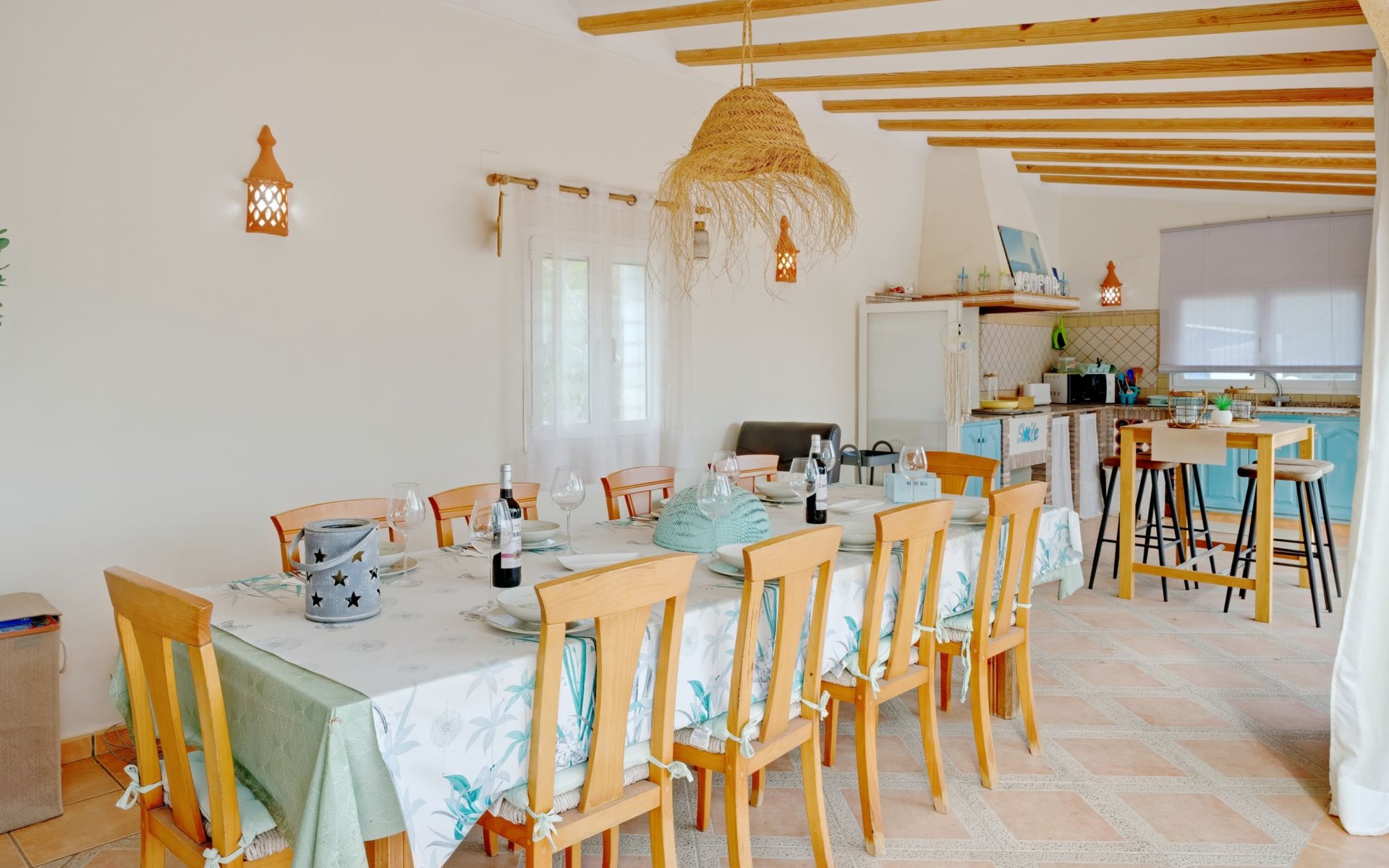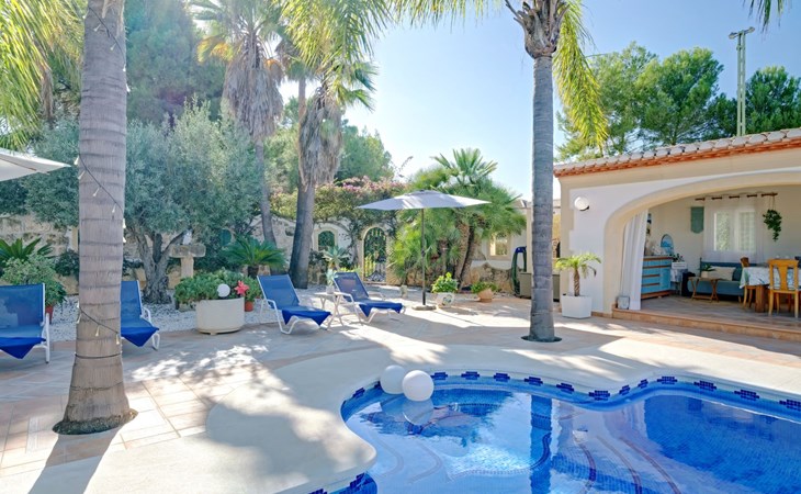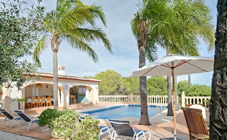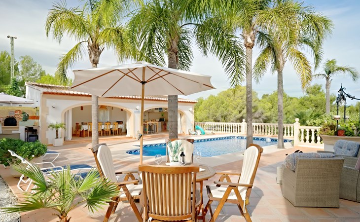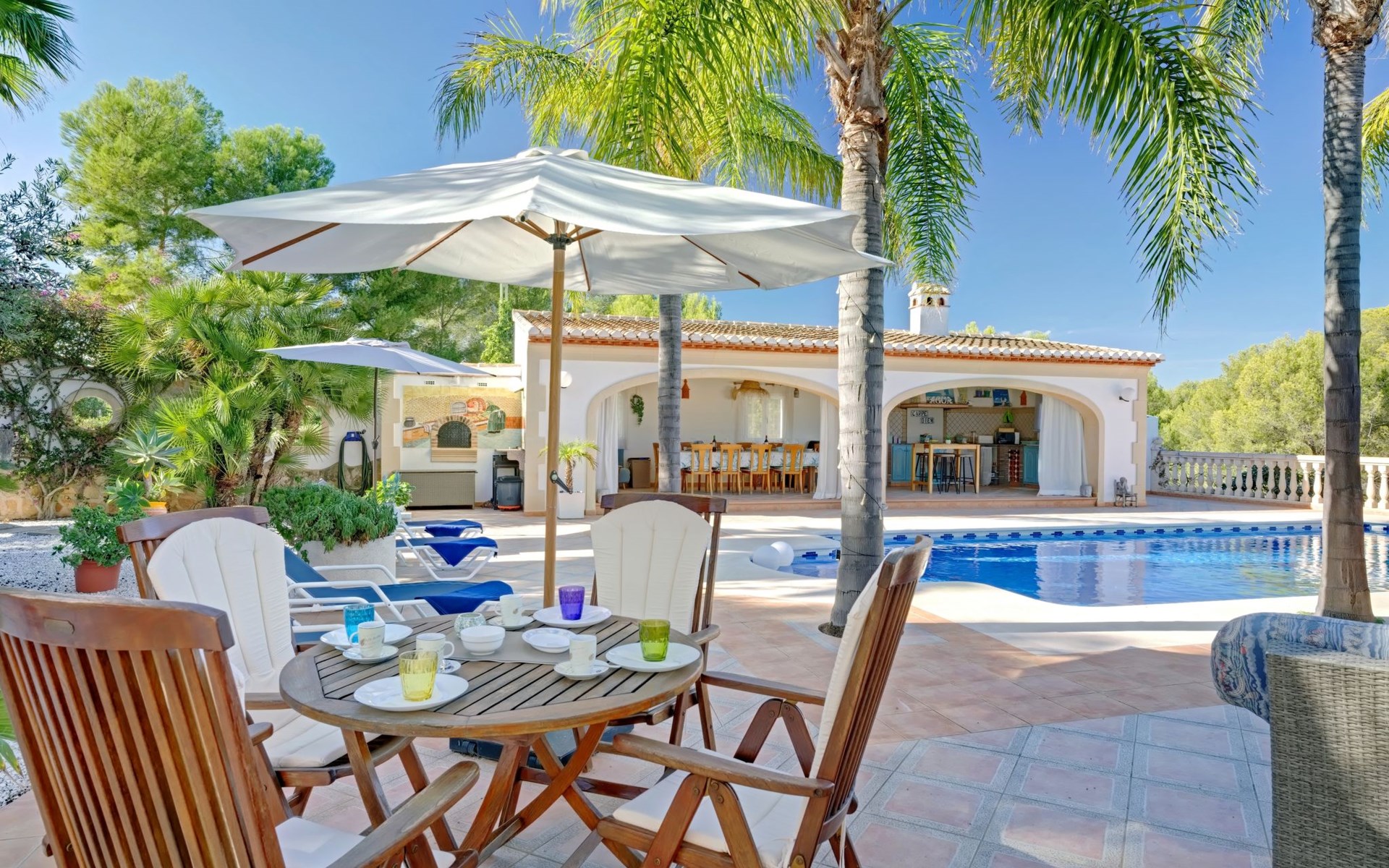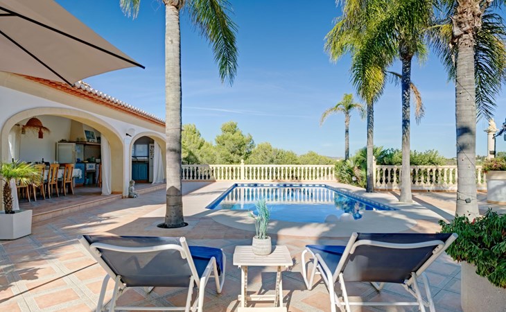 Very large, very beautiful, very comfortable villa "Carpe Diem", 3 storeys. In the district of Pinosol, in the resort 2.8 km from the centre of Arenal Javea, in a quiet, sunny position, 2.8 km from the sea, 2.8 km from the beach. Private: beautiful, well-kept garden (fenced), orchard (fenced), swimming pool (14 x 5 m, depth 40 - 210 cm, seasonal availability: 01.Jan. - 31.Dec.) with internal staircase. Shower/WC in the pool area, pool house with fridge and cooking stove, pergola, garden furniture, barbecue house, parking (for 4 cars) on the premises. Supermarket 2.3 km, restaurant 500 m, café 550 m, bus stop "Parada antiguo Mas y Mas" 2 km, sandy beach "El Arenal" 2.8 km, rocky beach "Segundo Muntanya" 3 km. Sports harbour 2.8 km, surf school 2.8 km, sailing school 2.8 km, tennis 3 km. The owner does not accept any youth groups.