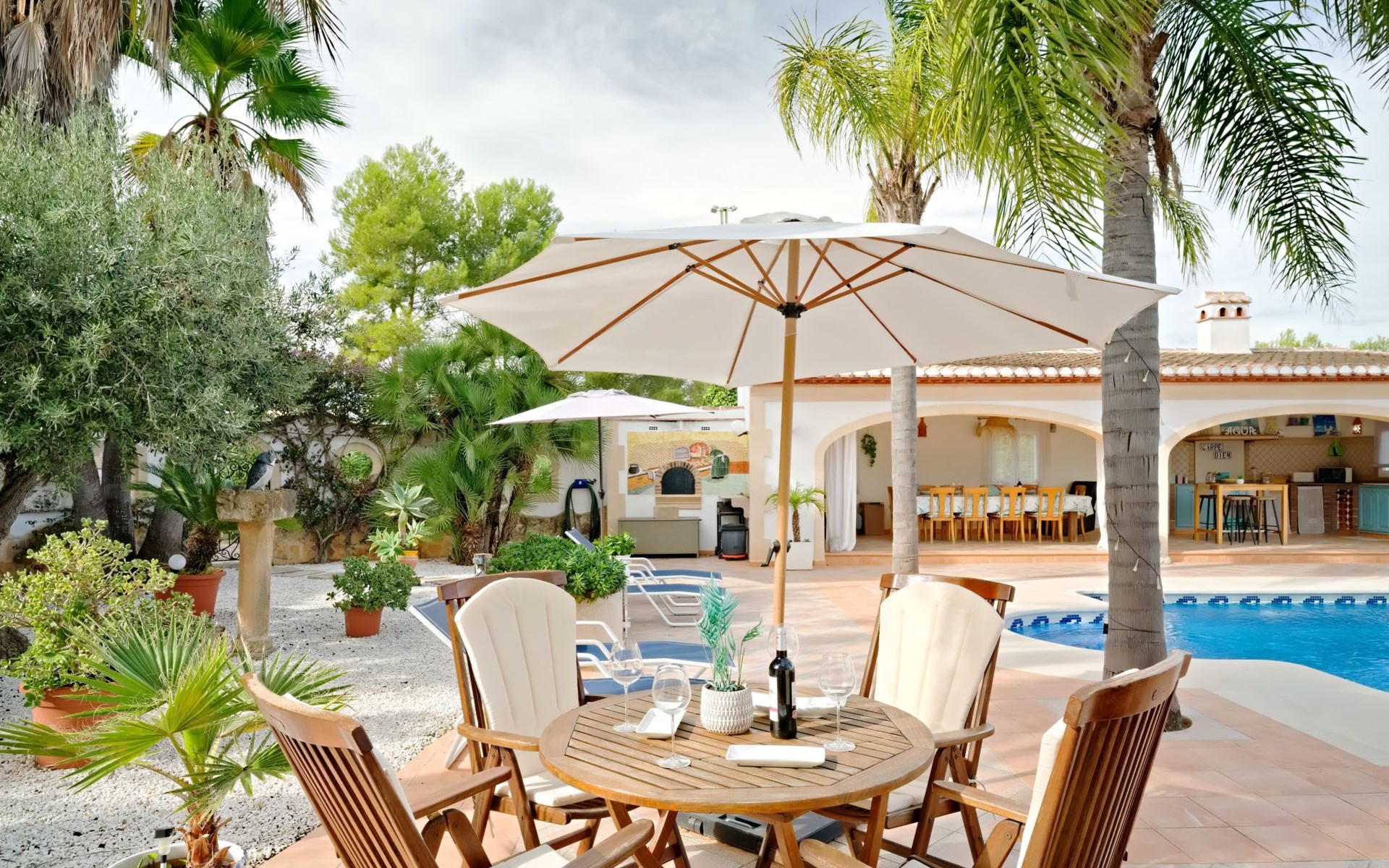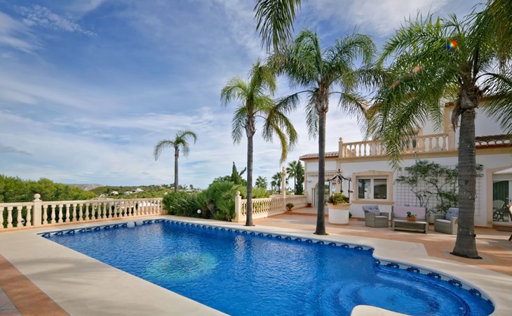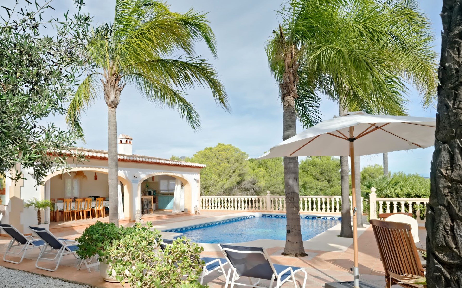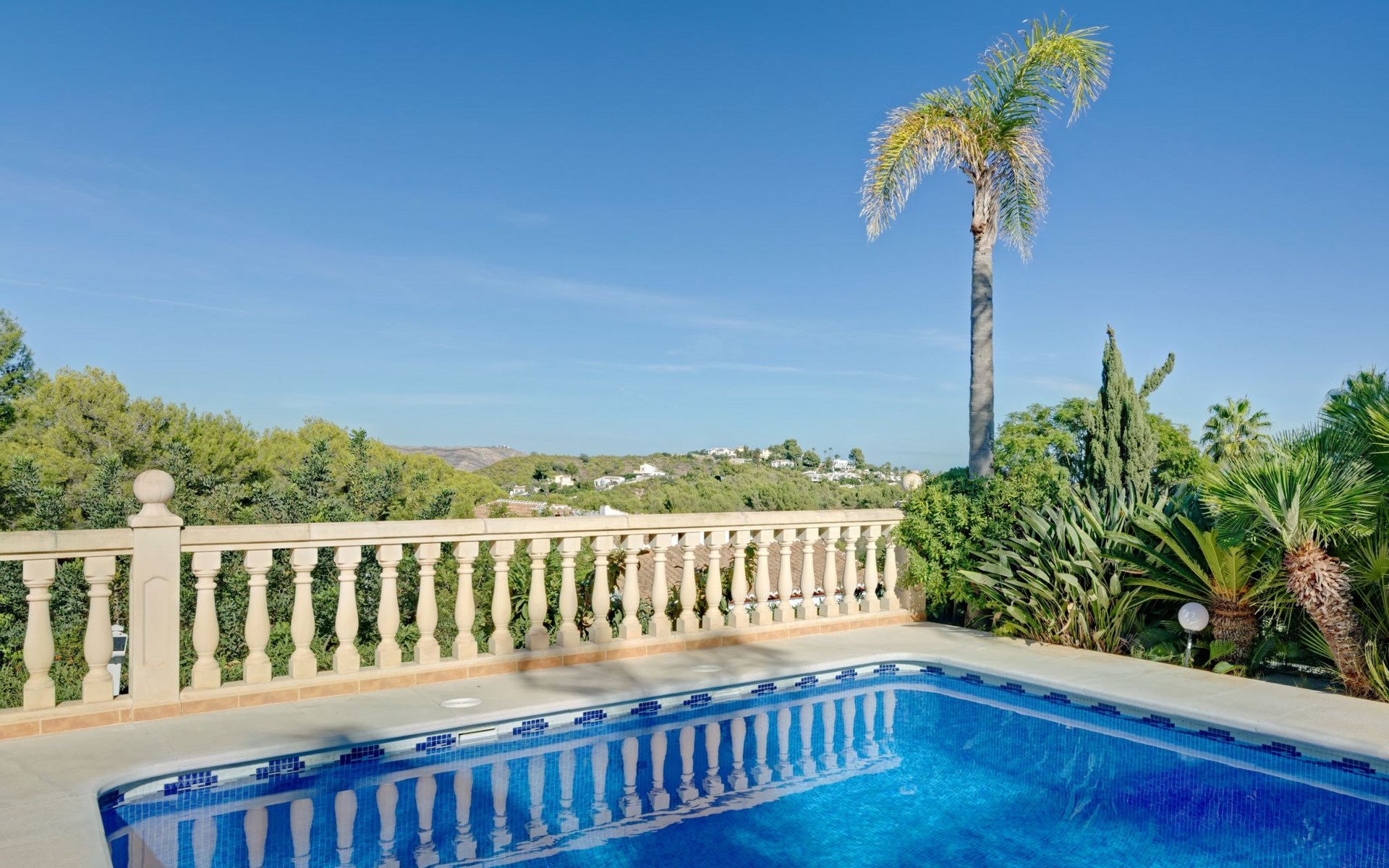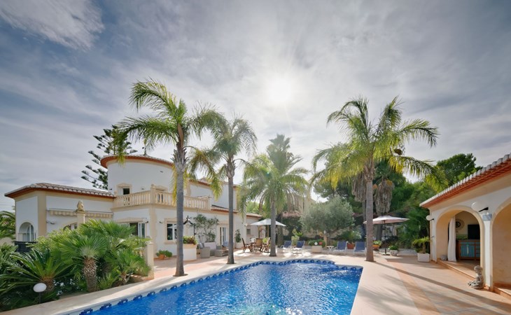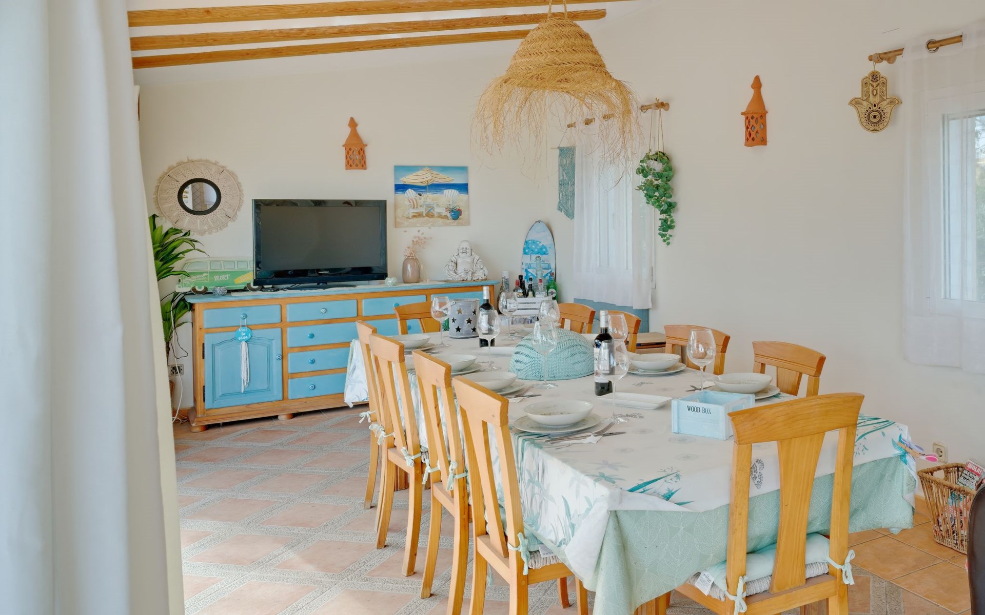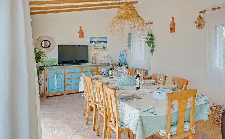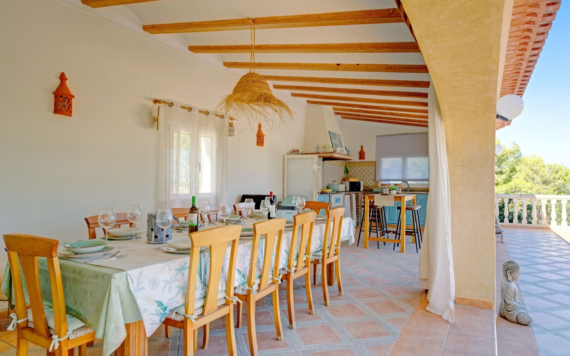 Very large, very beautiful, very comfortable villa "Carpe Diem", 3 storeys. In the district of Pinosol, in the resort 2.8 km from the centre of Arenal Javea, in a quiet, sunny position, 2.8 km from the sea, 2.8 km from the beach. Private: beautiful, well-kept garden (fenced), orchard (fenced), swimming pool (14 x 5 m, depth 40 - 210 cm, seasonal availability: 01.Jan. - 31.Dec.) with internal staircase. Shower/WC in the pool area, pool house with fridge and cooking stove, pergola, garden furniture, barbecue house, parking (for 4 cars) on the premises. Supermarket 2.3 km, restaurant 500 m, café 550 m, bus stop "Parada antiguo Mas y Mas" 2 km, sandy beach "El Arenal" 2.8 km, rocky beach "Segundo Muntanya" 3 km. Sports harbour 2.8 km, surf school 2.8 km, sailing school 2.8 km, tennis 3 km. The owner does not accept any youth groups.