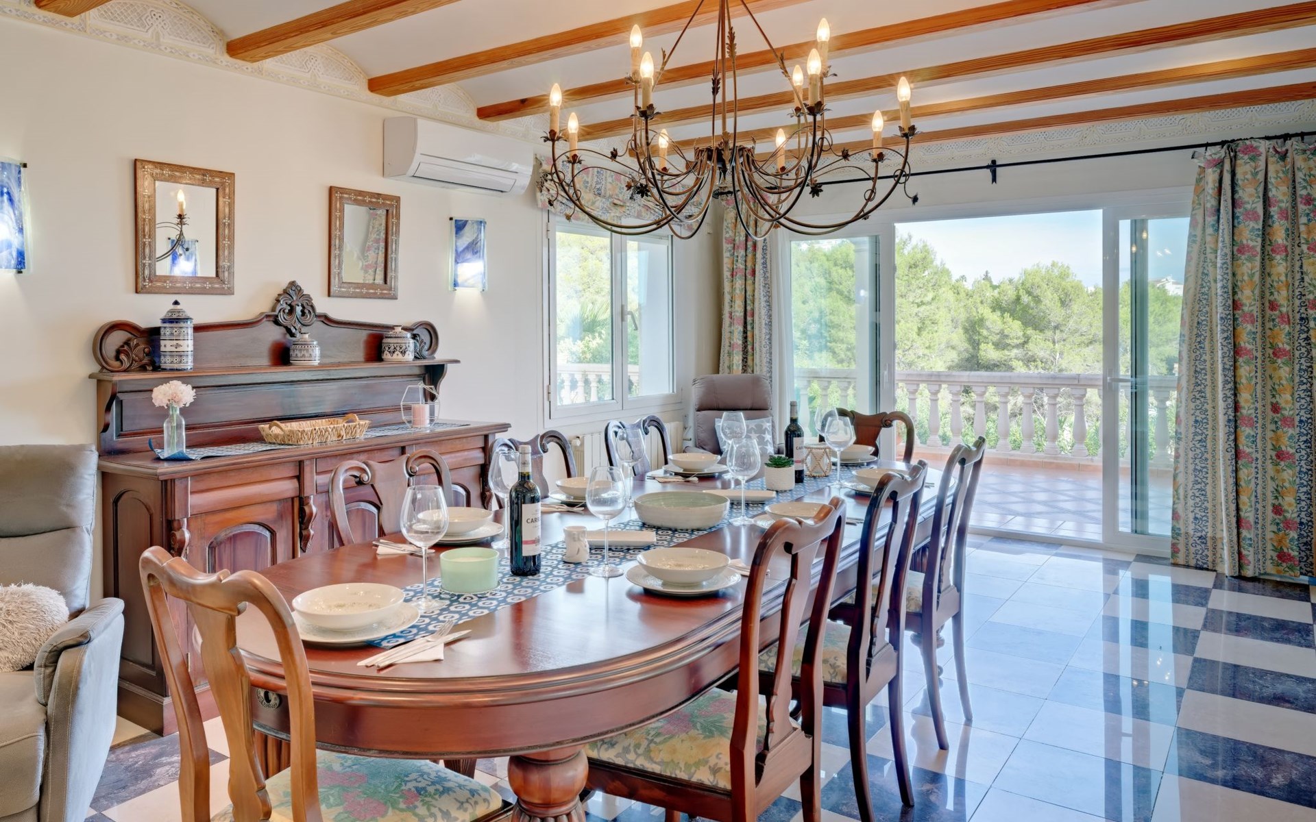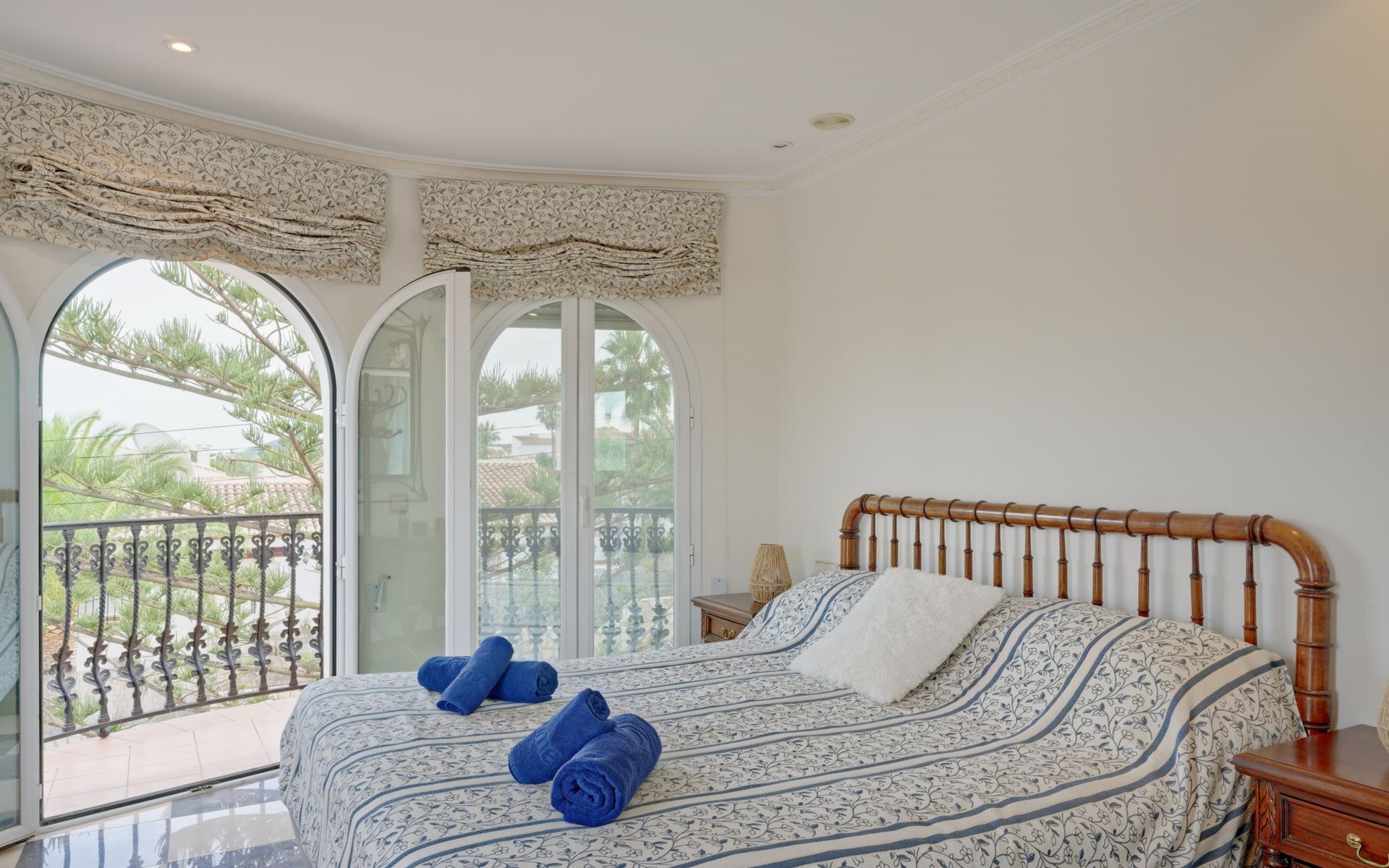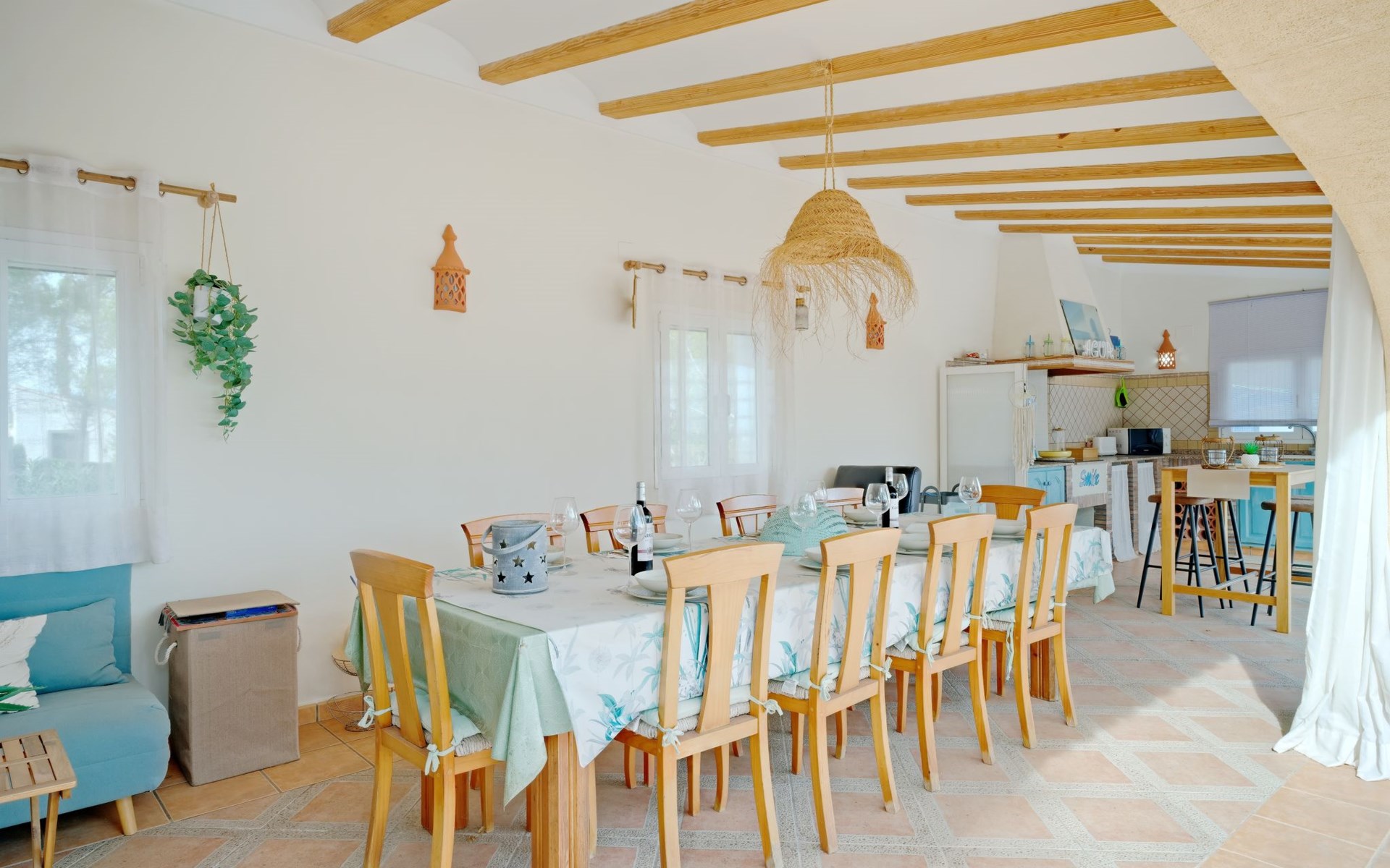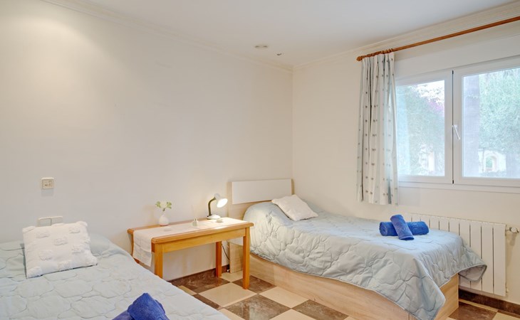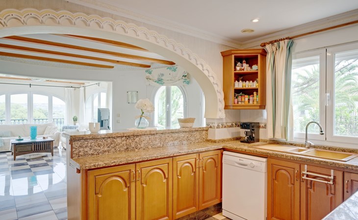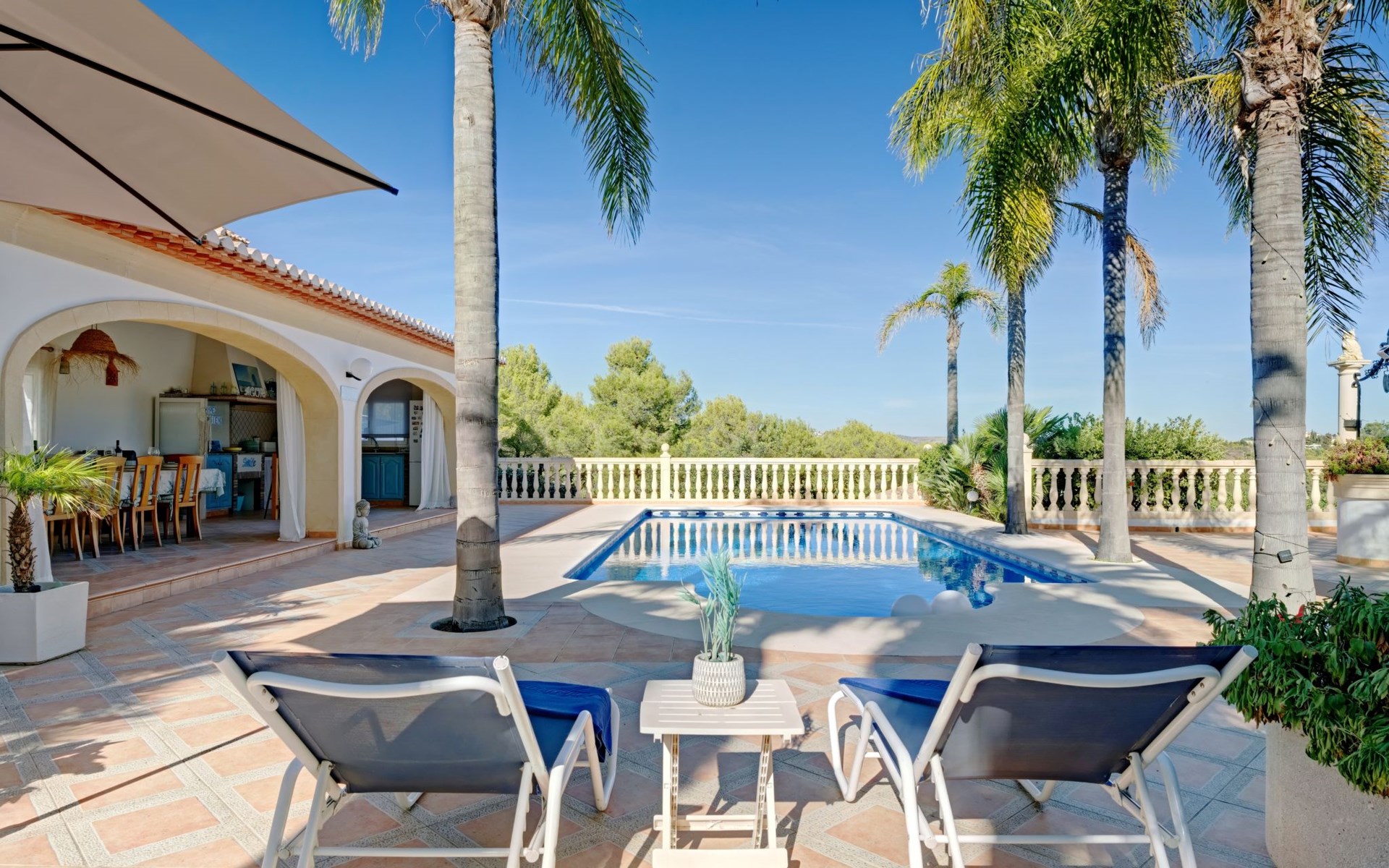 Very large, very beautiful, very comfortable villa "Carpe Diem", 3 storeys. In the district of Pinosol, in the resort 2.8 km from the centre of Arenal Javea, in a quiet, sunny position, 2.8 km from the sea, 2.8 km from the beach. Private: beautiful, well-kept garden (fenced), orchard (fenced), swimming pool (14 x 5 m, depth 40 - 210 cm, seasonal availability: 01.Jan. - 31.Dec.) with internal staircase. Shower/WC in the pool area, pool house with fridge and cooking stove, pergola, garden furniture, barbecue house, parking (for 4 cars) on the premises. Supermarket 2.3 km, restaurant 500 m, café 550 m, bus stop "Parada antiguo Mas y Mas" 2 km, sandy beach "El Arenal" 2.8 km, rocky beach "Segundo Muntanya" 3 km. Sports harbour 2.8 km, surf school 2.8 km, sailing school 2.8 km, tennis 3 km. The owner does not accept any youth groups.