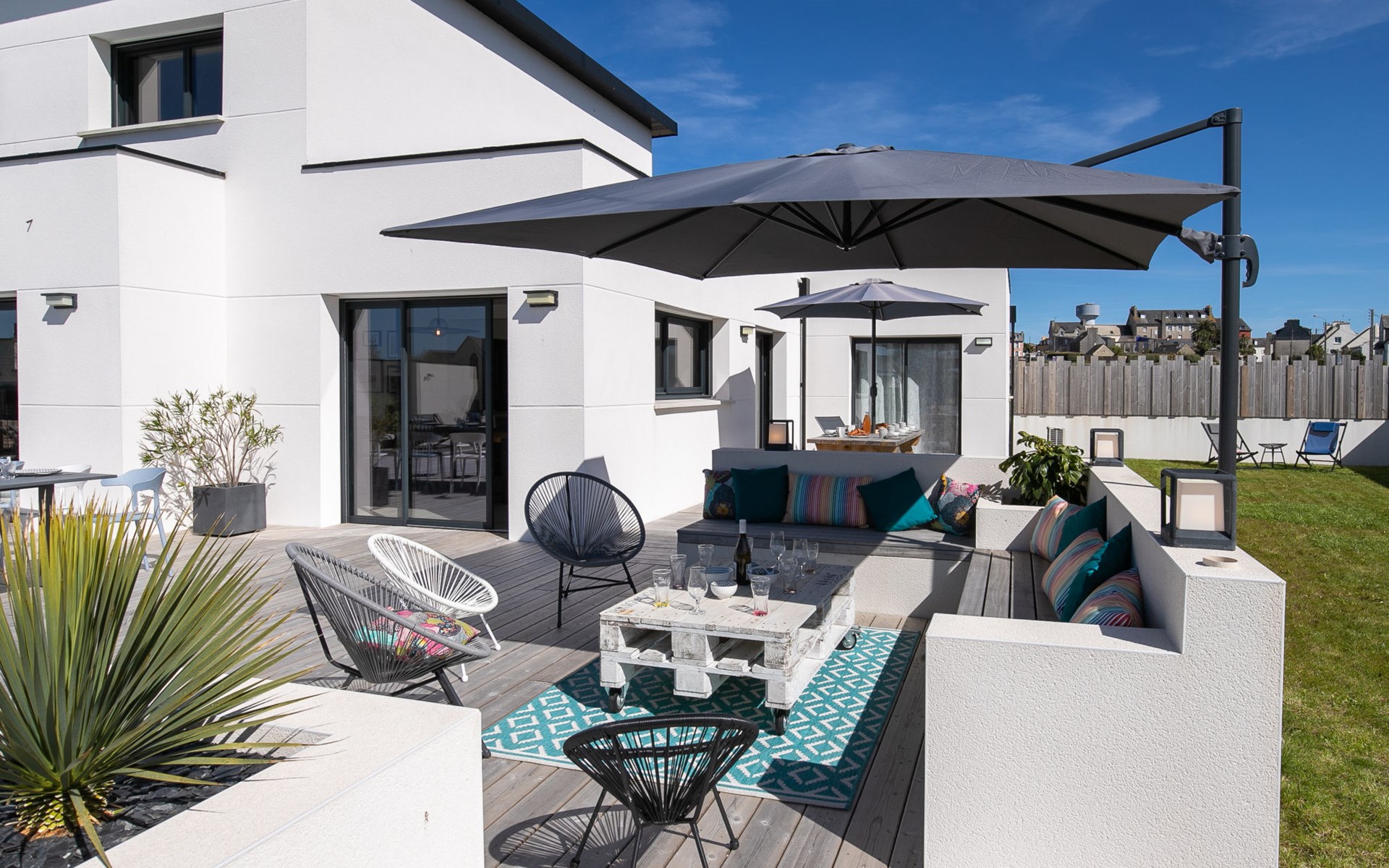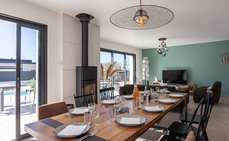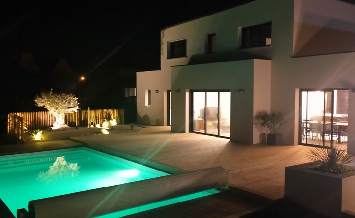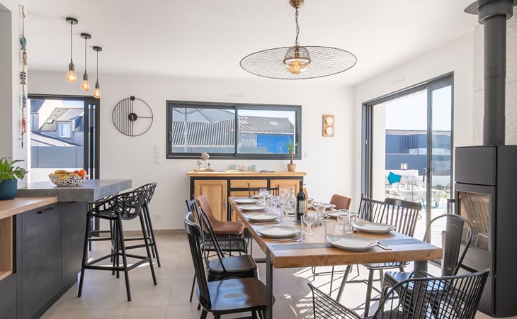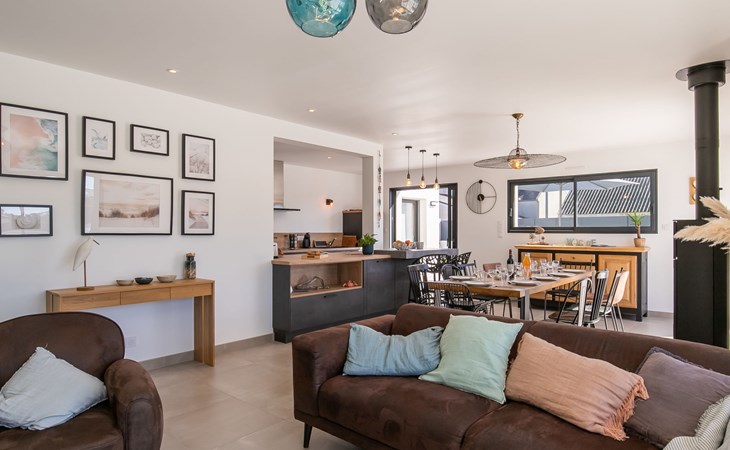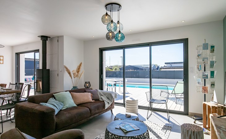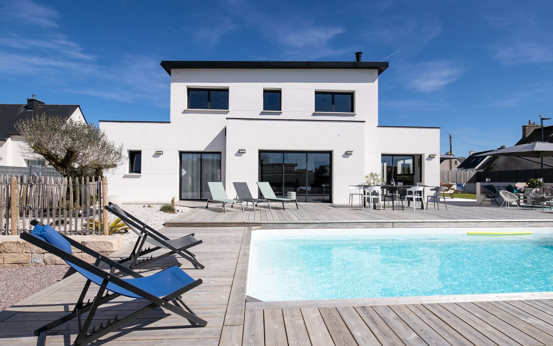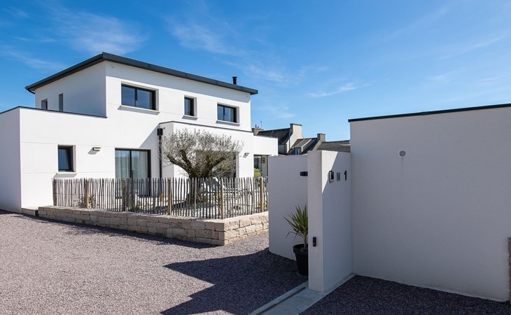 Very modern, beautiful, comfortable single-family house "Au Gré du Vent", built in 2022. 200 m from the centre of Brignogan-Plage, 11 km from the centre of Lesneven, in the residential district, 300 m from the sea, 300 m from the beach, south-west facing position. Private: property 800 m2 (fenced), well-kept garden with lawn and wildlife garden, swimming pool angular, heated, with privacy (8 x 4 m, 32 m2, depth 150 cm, seasonal availability: 20.May. - 28.Sep.) with shutter cover. WC in the pool area, outdoor shower, pool maintenance by the owner/gardener. Parking (for 4 cars) on the premises, single garage. Shop 11 km, grocery 550 m, supermarket 500 m, shopping centre 13 km, restaurant 650 m, bakery 3 km, café 500 m, bus stop "Centre" 400 m, sandy beach "Plage de sable fin" 300 m. Golf course (18 hole) 35 km, surf school, sailing school 600 m, tennis 1.5 km, walking paths from the house 300 m. Nearby attractions: Meneham, Kerlouan 5 km, Dunes de Keremma, Réserve ornithologique 10 km, Plouguerneau, Pays des Abers 2 km, Roscoff, Jardin exotique, Île de Batz 36 km, Château de Kerjean 25 km, Brest, Océanopolis 40 km. Hiking paths: GR34, sentier des douaniers 300 m. Please note: airfield 34 km from the property.