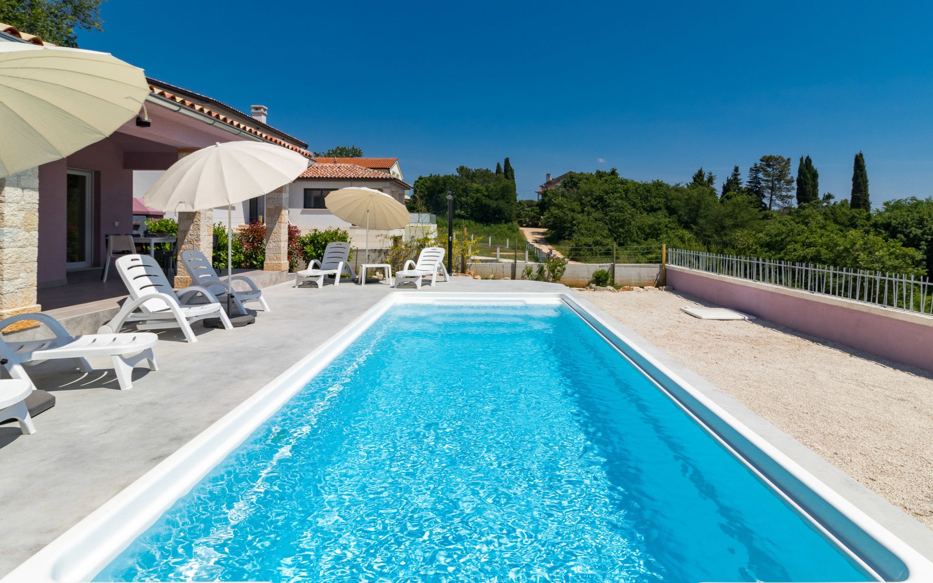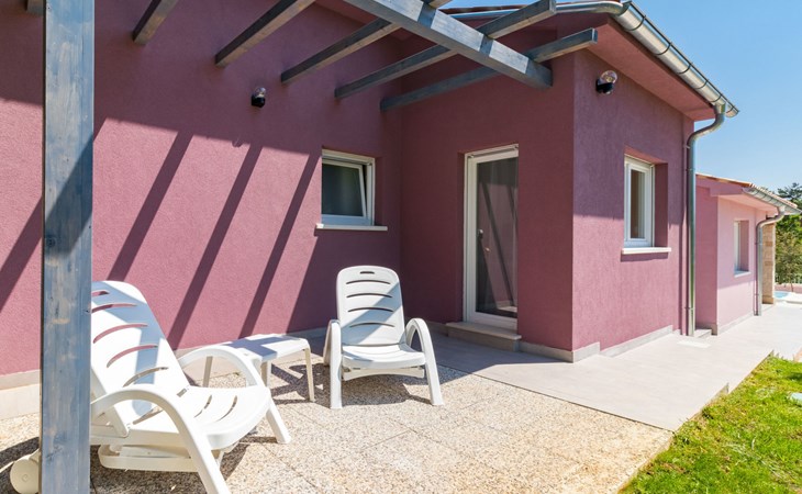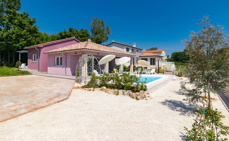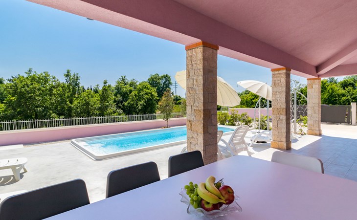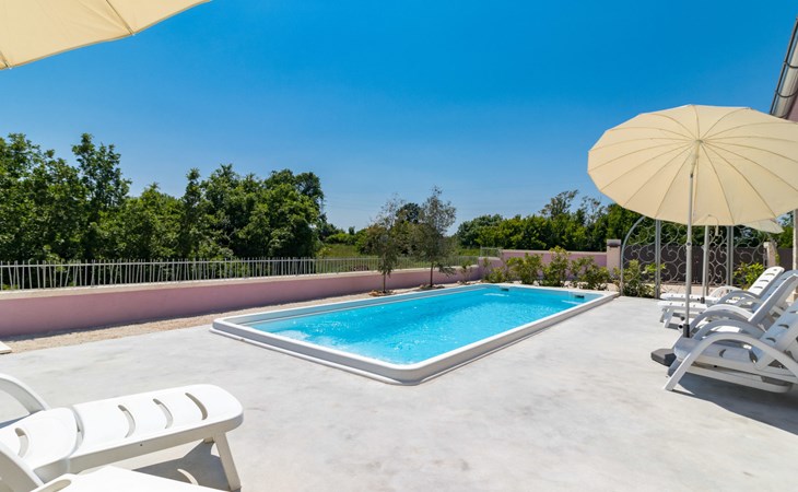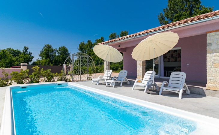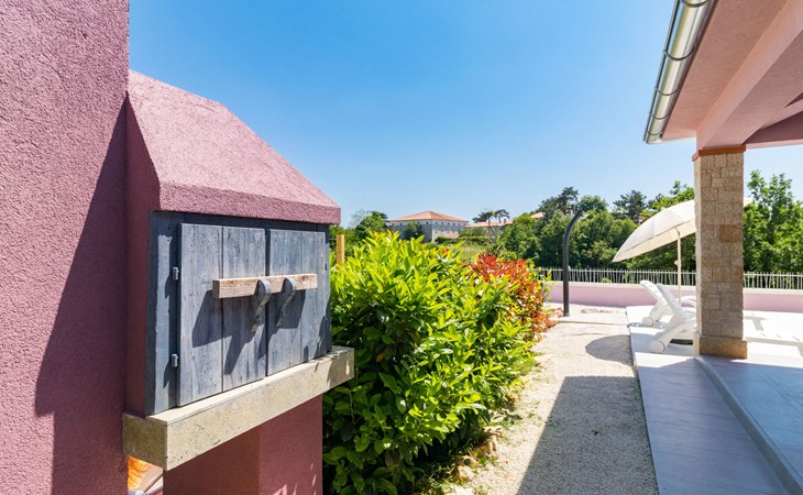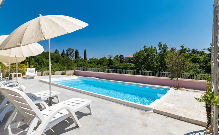 Single-family house "Mario". 200 m from the centre of Svetvinčenat, in a sunny position, 23 km from the sea. Private: property 550 m2 (fenced), swimming pool angular, heated (7 x 3 m, depth 140 cm, seasonal availability: 01.Apr. - 28.Oct.) with internal staircase. Outdoor shower, terrace, garden furniture, barbecue, pool maintenance by the owner/gardener. Motor access to the house (100 m via unmade road). Parking (for 3 cars) at the house on the premises. Shop 150 m, supermarket 7 km, restaurant, café 200 m, bus stop 300 m, pebble beach 23 km. Please note: airfield 32 km from the property. Swimming pool heated (extra). It is necessary to announce 7 days in advance if the pool heating is required.