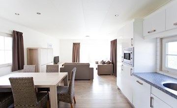 The Unique Luxe 4 is a cosy and comfortable chalet with a contemporary interior. This chalet is detached, ground floor and suitable for 4 persons. The common room has a cosy sitting area with television, a dining area and a kitchen with a 4-burner cooker, coffee maker and refrigerator. There are 2 bedrooms with 2 single beds each and a bathroom with toilet, washbasin and shower. Enjoy the sun on the furnished terrace in the garden. You can park 1 car at Unique Luxe 4 and there is free Wi-Fi.