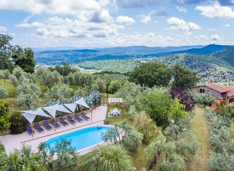 Casaglia 8 km from San Gimignano: Very beautiful, cosy country house "Podere San Lorenzo", semi-detached, renovated in 2005, surrounded by meadows, fields and vineyards. In the hamlet Casaglia. 8 km from the centre of San Gimignano, 8 km from the centre of Poggibonsi, 30 km from the centre of Siena, in a sunny, elevated position on a slope, 80 km from the sea, 80 km from the beach, in the countryside. Private: terraced garden, 2'000 m2 (fenced) with flowers and trees, natural garden, meadow, orchard, swimming pool (above ground) (6 x 3 m, depth 140 cm, seasonal availability: 01.May. - 10.Oct.). Outdoor shower, terrace, garden furniture, barbecue, pool maintenance by the owner/gardener. 2 km long motor access (via unmade road). Parking (for 3 cars) on the premises. Shop 5 km, grocery 5 km, supermarket 5 km, shopping centre 5 km, restaurant 500 m, bicycle rental 8 km, bus stop 6 km, railway station "Poggibonsi" 5 km, sandy beach "Cecina Mare" 80 km. Nearby attractions: Certaldo 16 km, Volterra 40 km, Firenze 60 km, Pisa 94 km. Please note: car recommended. Suitable for families. Object suitable for 8 adults groups of teenagers on request only.