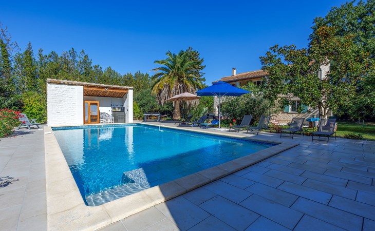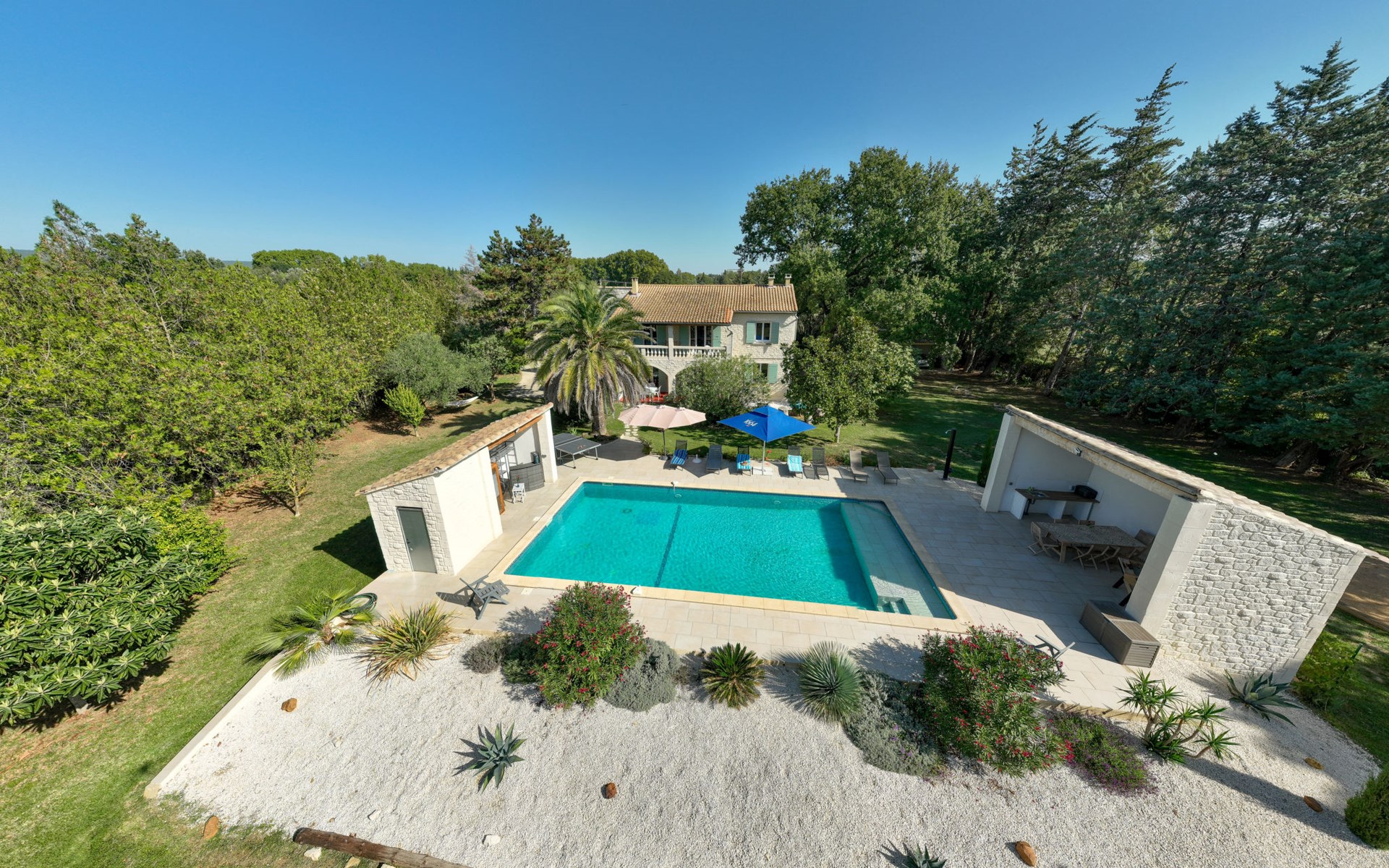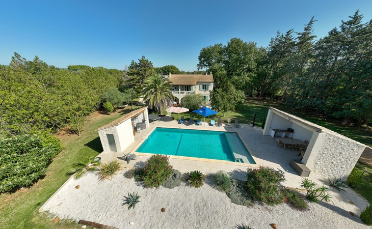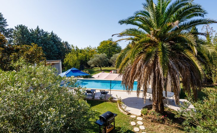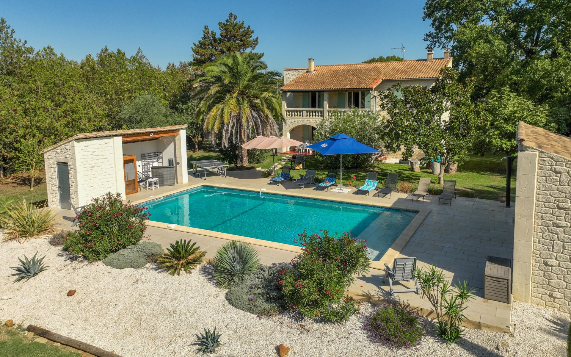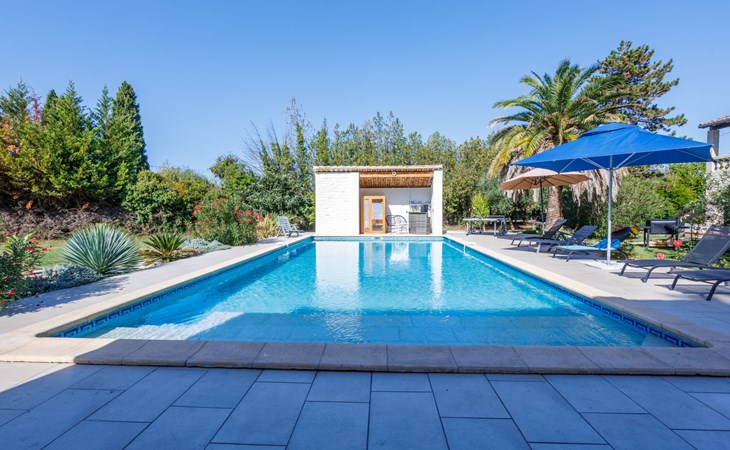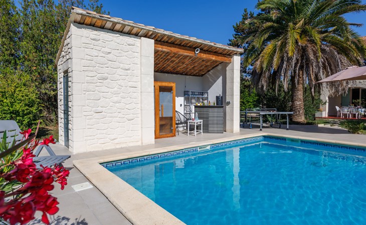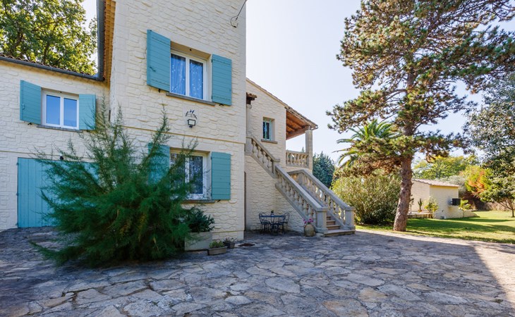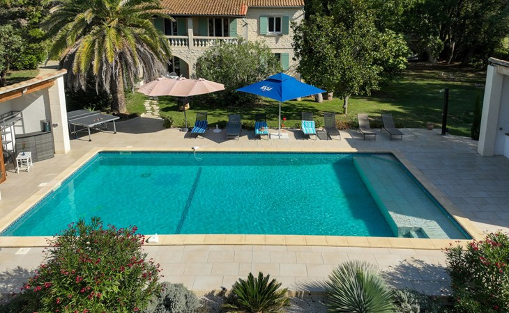 Uzès: Beautiful single-family house "L'Aouzet", 2 storeys, surrounded by trees. On the outskirts, 3 km from the centre of d'Uzès, in a secluded, quiet position, 73 km from the sea, 10 km from the lake, south facing position. Private: well-kept garden 3'000 m2 (fenced) with lawn and wildlife garden, swimming pool angular, heated, with privacy (12 x 6 m, depth 100 - 190 cm, seasonal availability: 01.May. - 15.Oct.) with alarm system. Outdoor shower, pool house, boules, badminton, garden furniture, barbecue, pool maintenance by the owner/gardener. In the house: table tennis, table football, trampoline. Parking (for 3 cars). Shop 3 km, grocery 3 km, supermarket 3 km, bakery 3 km, bus stop "Mairie" 1.5 km, bathing lake "Lac de la Bouscarasse" 10 km. Sports harbour 36 km, golf course (9 hole) 6 km, tennis 3 km, riding stable 15 km. Nearby attractions: Arènes de Nîmes 27 km, Vignobles de Tavel 24 km, Le Pont du Gard 15 km, Palais des Papes d'Avignon 40 km, Musée 1900 6 km, Musée du Bonbon 5 km. Well-known lakes can easily be reached: Lac Dupuy 10 km. Hiking paths: Sentier des Capitelles 2.5 km, La Vallée de l'Eure à Uzès 1.4 km, Le Belvédère des Garrigues 1.5 km. Please note: baby equipment (included).