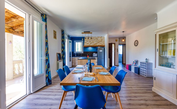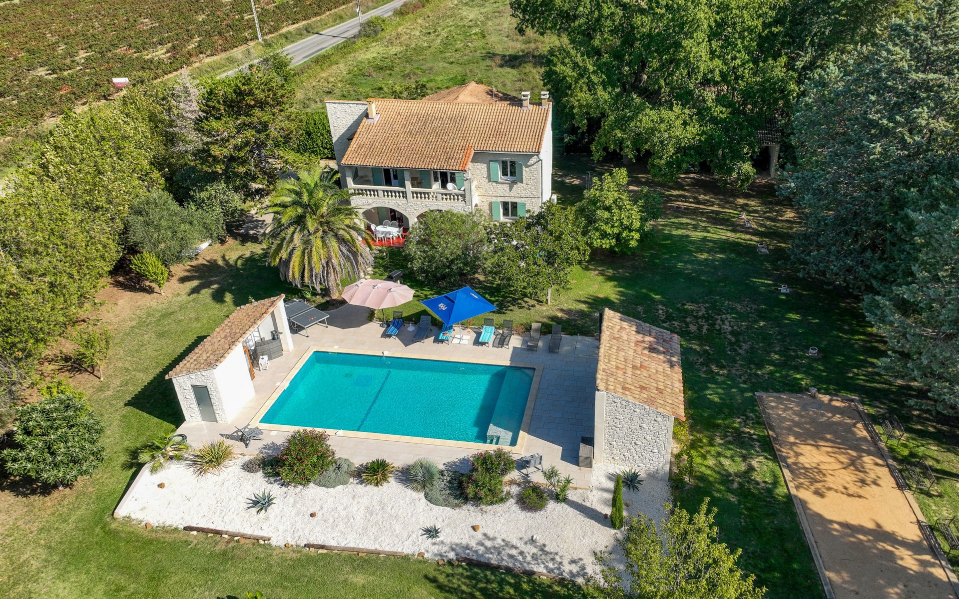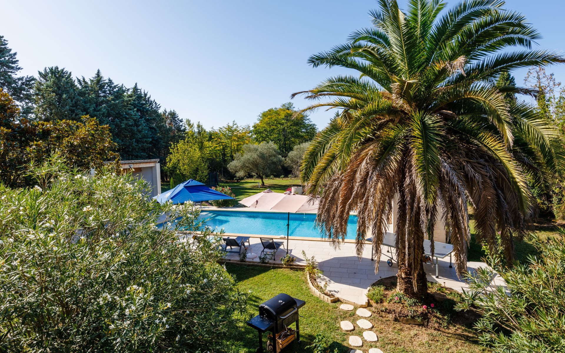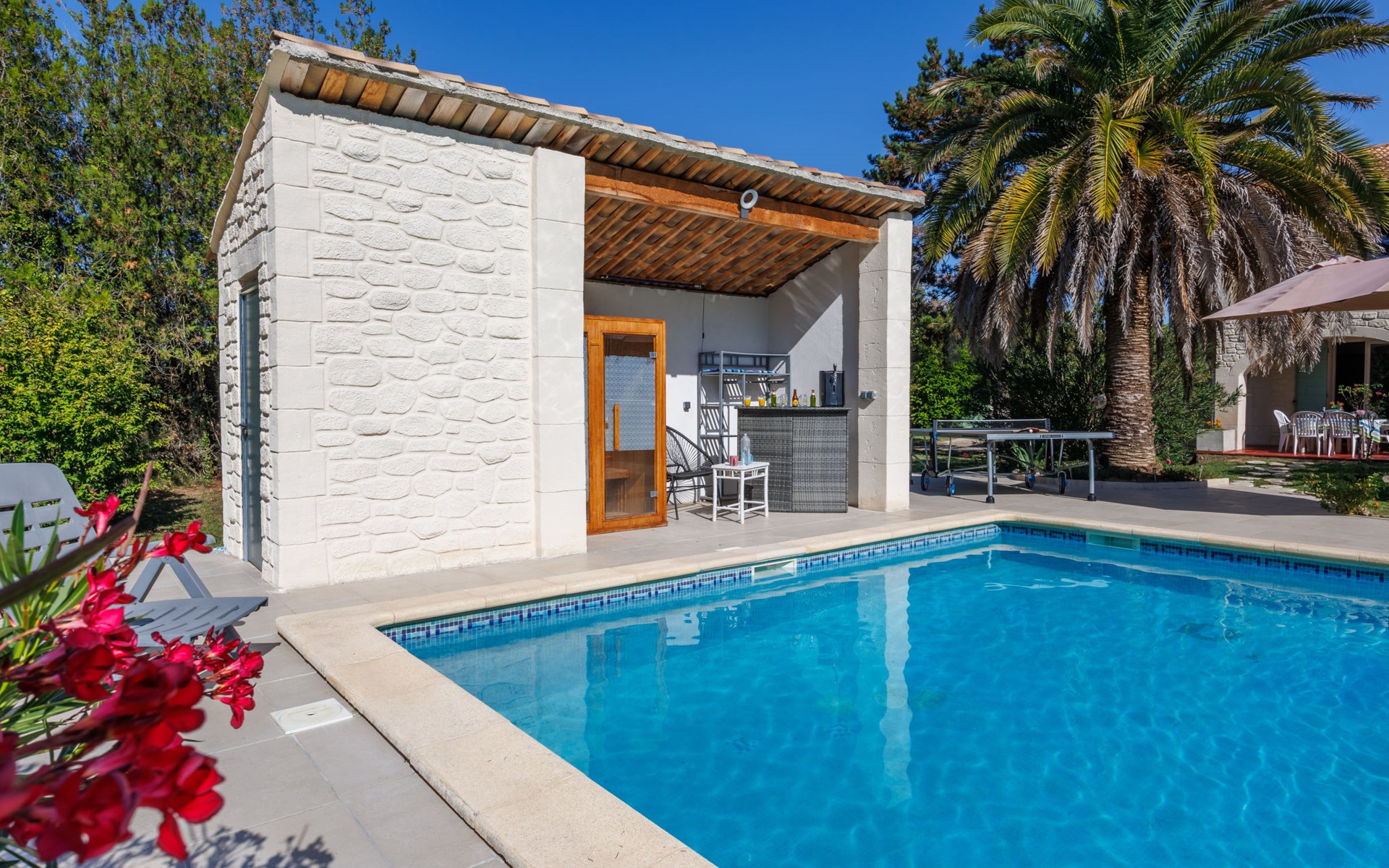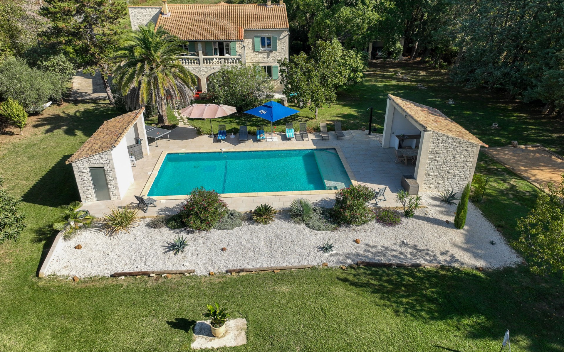 Uzès: Beautiful single-family house "L'Aouzet", 2 storeys, surrounded by trees. On the outskirts, 3 km from the centre of d'Uzès, in a secluded, quiet position, 73 km from the sea, 10 km from the lake, south facing position. Private: well-kept garden 3'000 m2 (fenced) with lawn and wildlife garden, swimming pool angular, heated, with privacy (12 x 6 m, depth 100 - 190 cm, seasonal availability: 01.May. - 15.Oct.) with alarm system. Outdoor shower, pool house, boules, badminton, garden furniture, barbecue, pool maintenance by the owner/gardener. In the house: table tennis, table football, trampoline. Parking (for 3 cars). Shop 3 km, grocery 3 km, supermarket 3 km, bakery 3 km, bus stop "Mairie" 1.5 km, bathing lake "Lac de la Bouscarasse" 10 km. Sports harbour 36 km, golf course (9 hole) 6 km, tennis 3 km, riding stable 15 km. Nearby attractions: Arènes de Nîmes 27 km, Vignobles de Tavel 24 km, Le Pont du Gard 15 km, Palais des Papes d'Avignon 40 km, Musée 1900 6 km, Musée du Bonbon 5 km. Well-known lakes can easily be reached: Lac Dupuy 10 km. Hiking paths: Sentier des Capitelles 2.5 km, La Vallée de l'Eure à Uzès 1.4 km, Le Belvédère des Garrigues 1.5 km. Please note: baby equipment (included).