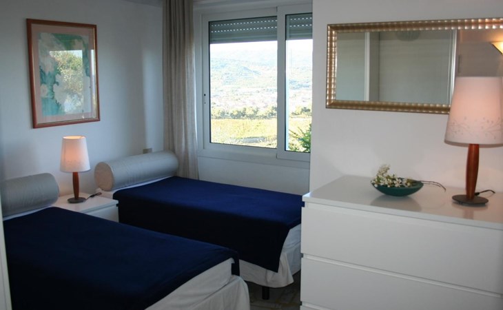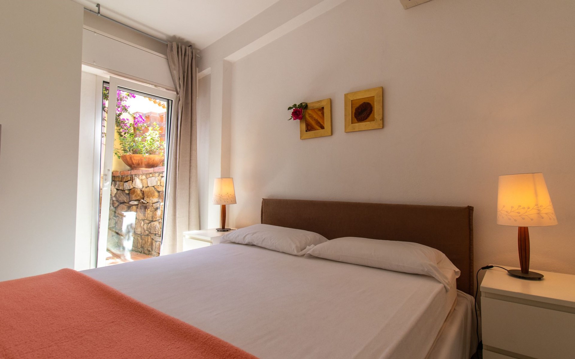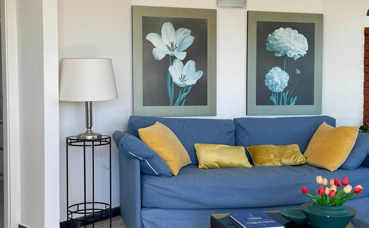 It has a very well-maintained and elegant interior and is therefore ideal for a comfortable stay. It is suitable for a family or friends who would like to spend their holiday together, as it can accommodate up to six people. The first bedroom is furnished with a double bed (160 x 190cm), a wardrobe and bedside tables, while the second has two single beds (each 80 x 190cm), a wardrobe and a dresser. The spacious living room has wicker seating, a big dining table and a sofa bed for two people. You go through an archway to the kitchen space with a modern kitchen block equipped with a gas stove, oven, toaster, coffee machine, washing machine, dishwasher and fridge-freezer. There are also two bathrooms, each with a shower cubicle, a bidet, a washbasin and a WC. The house can be heated, so it is suitable for stays all year round. It also has air conditioning throughout. An Internet surfstick is available on request, which can be activated with your own credit card. Satellite TV and a stereo system are provided.