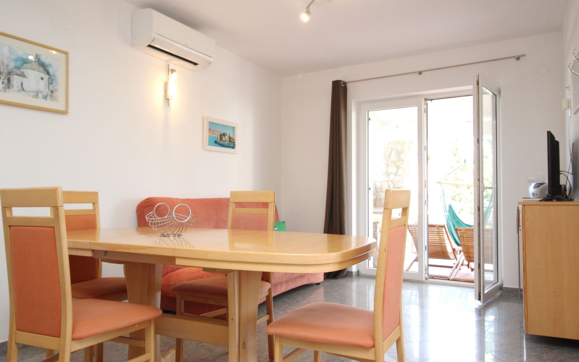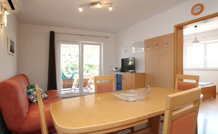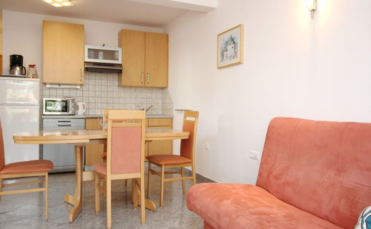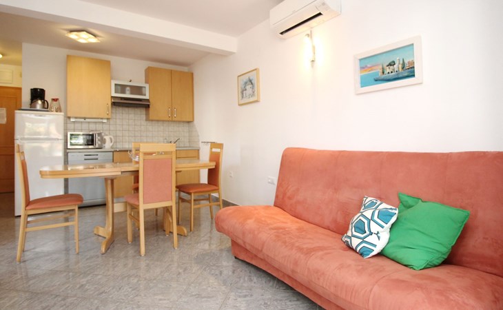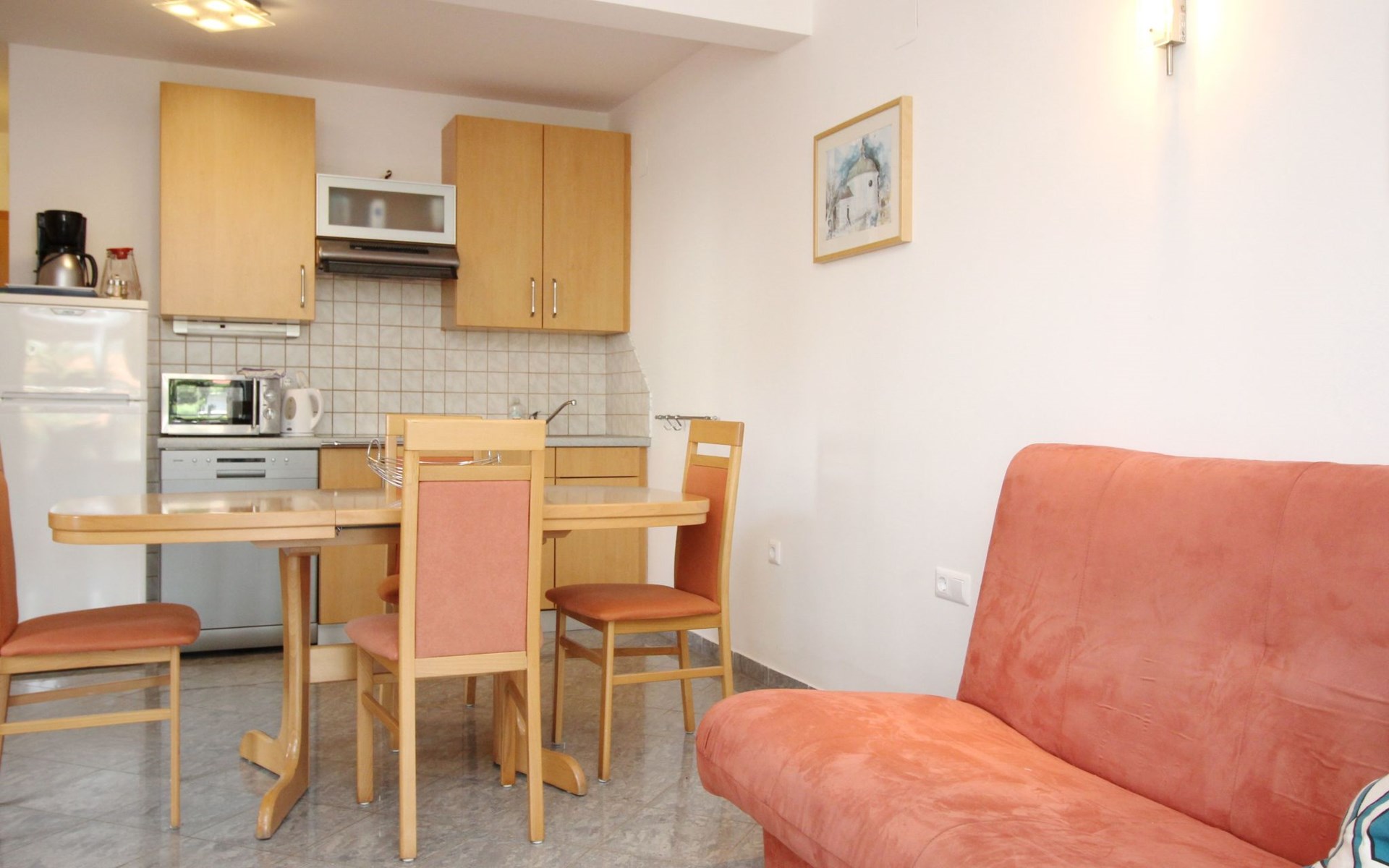 Living area : living room, dining room and kitchen are one unit; dining table and seating for all persons; one additional sleeping possibility on a sofa bed; with balcony; tiled