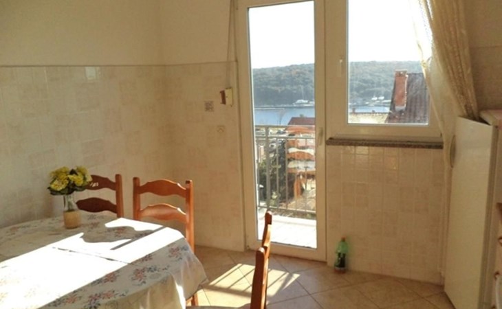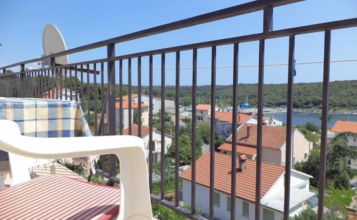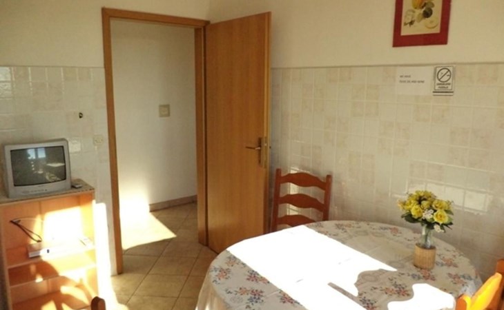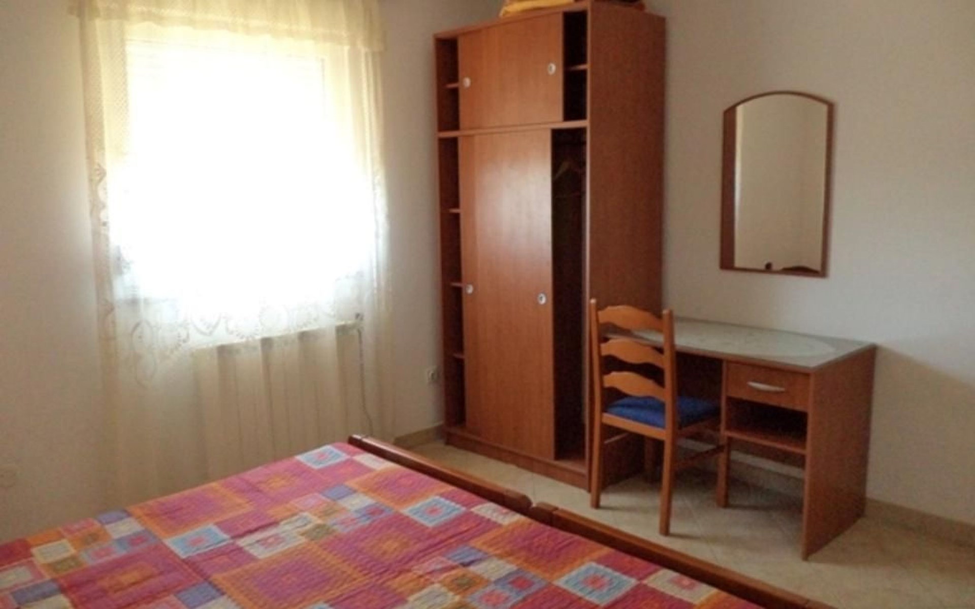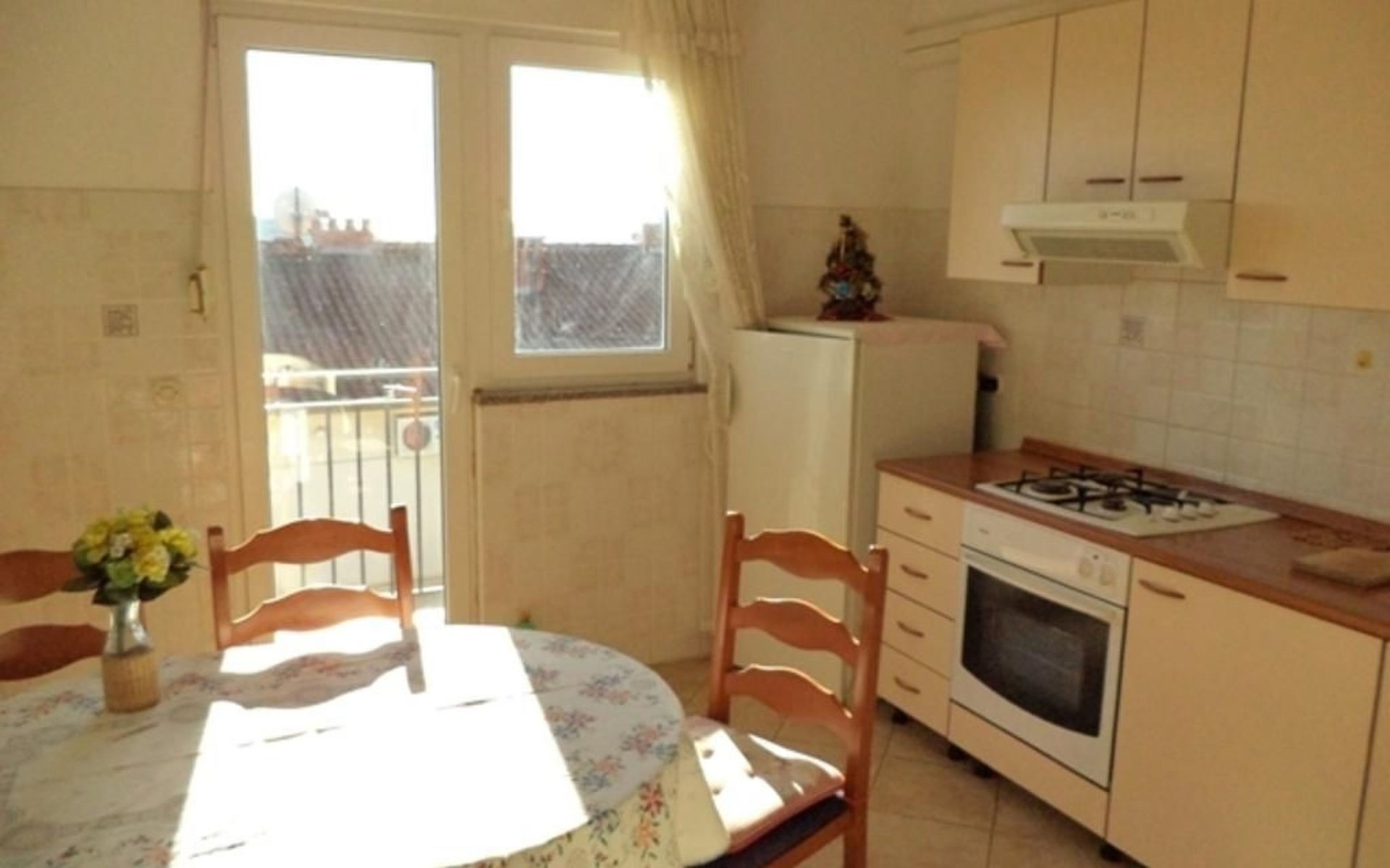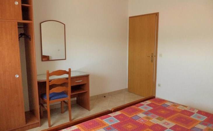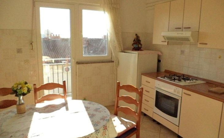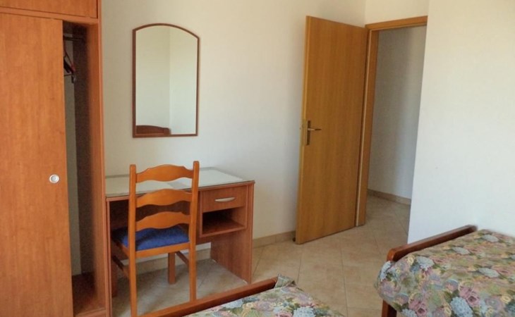 Inside, the apartment reveals a meticulously curated living environment featuring two bedrooms, each furnished with two single beds (90 x 200cm), a wardrobe, a desk, and a mirror for your convenience. A bathroom equipped with a window, shower, washing machine, ironing board, iron, and a washbasin complements your stay. The heart of the apartment, a combined living room-kitchen, is appointed with a dining area, round table, four chairs, and a kitchen unit fully stocked with a gas stove, oven, coffee machine, fridge, freezer compartment, and microwave. The presence of an air conditioning unit in the hallway ensures your comfort regardless of the season.