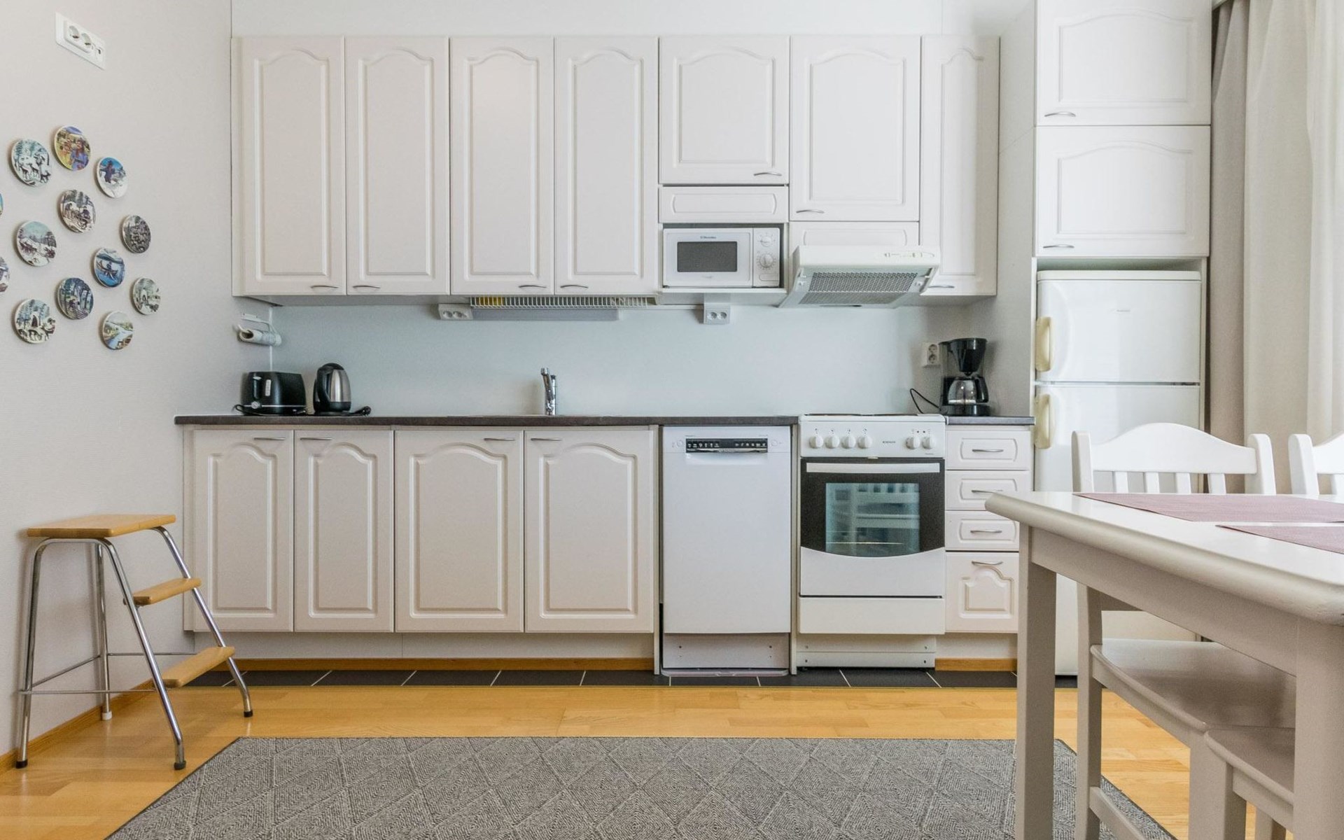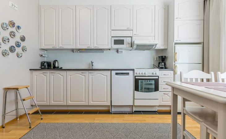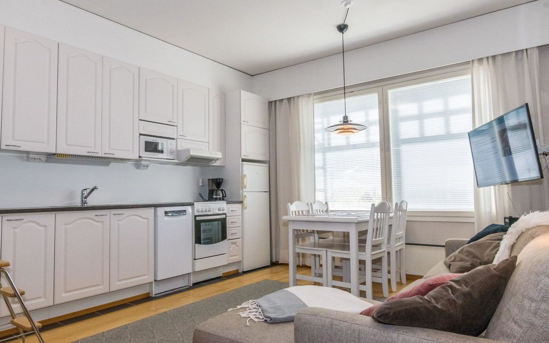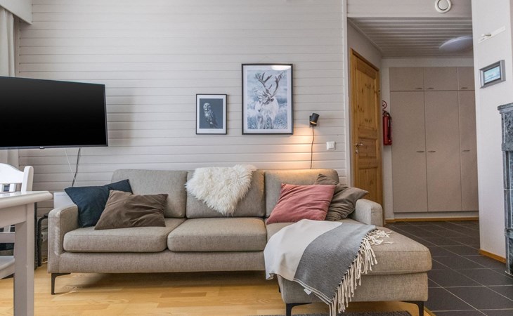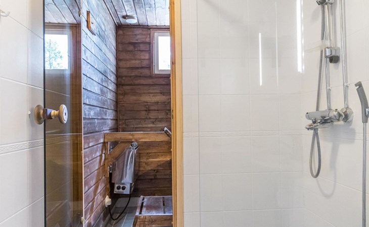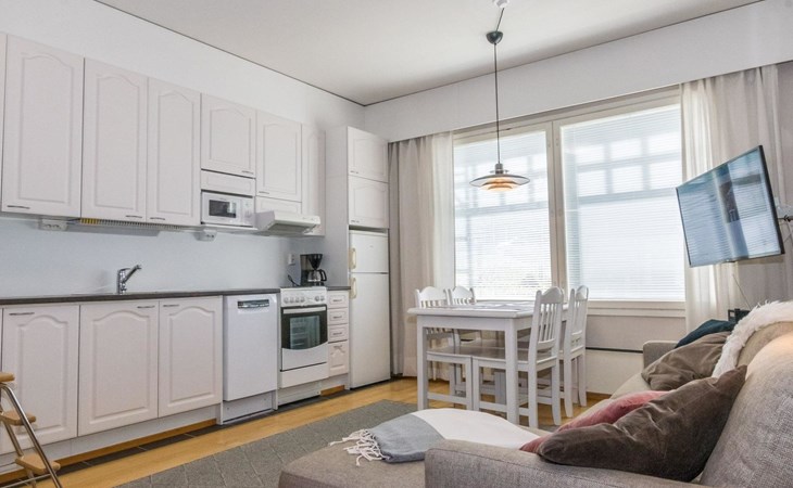 The kitchenette has everything you need for cooking and socialising. You can enjoy the warmth of the fireplace while dining, and the apartment's own sauna provides extra warmth after a day's excursions.