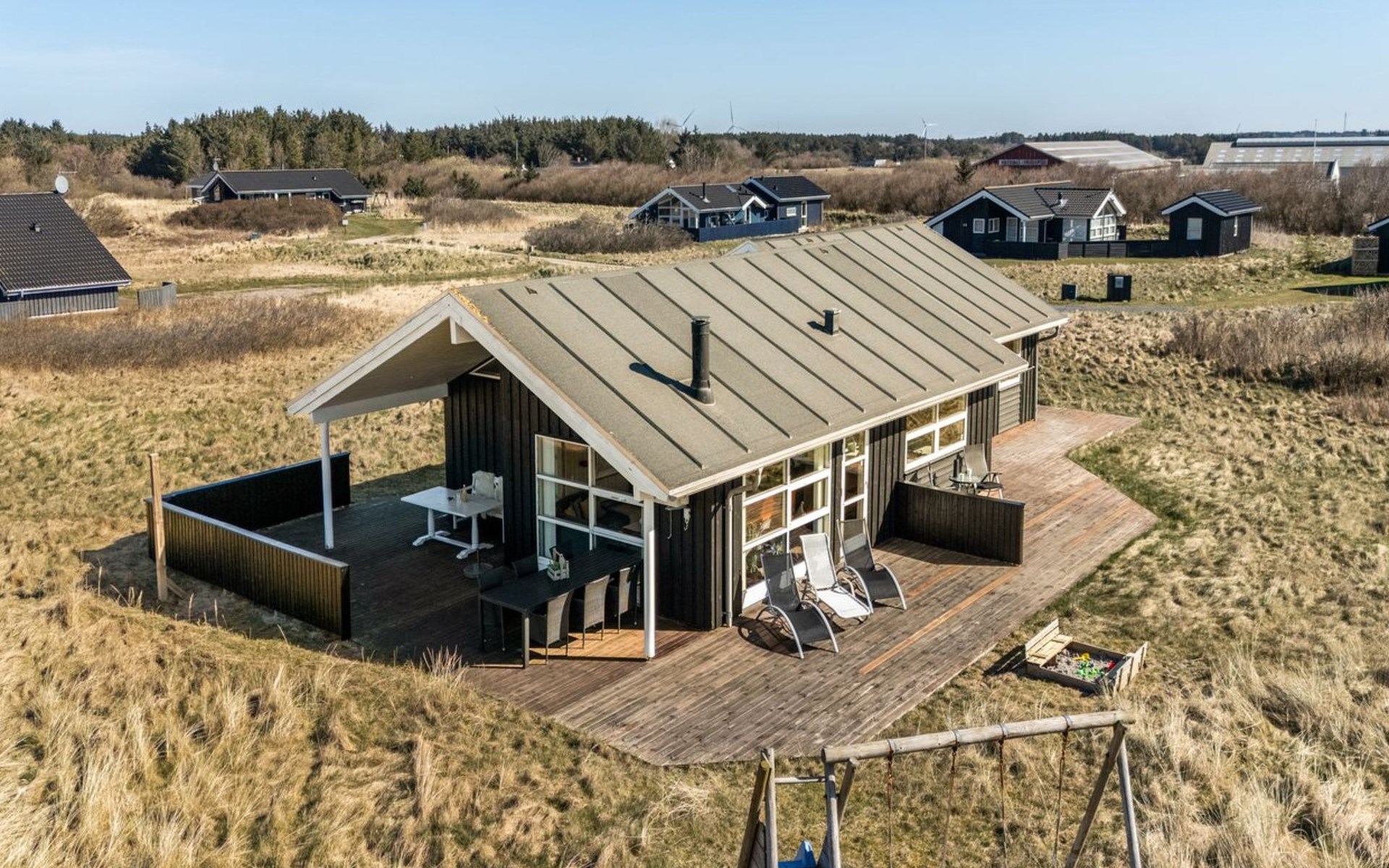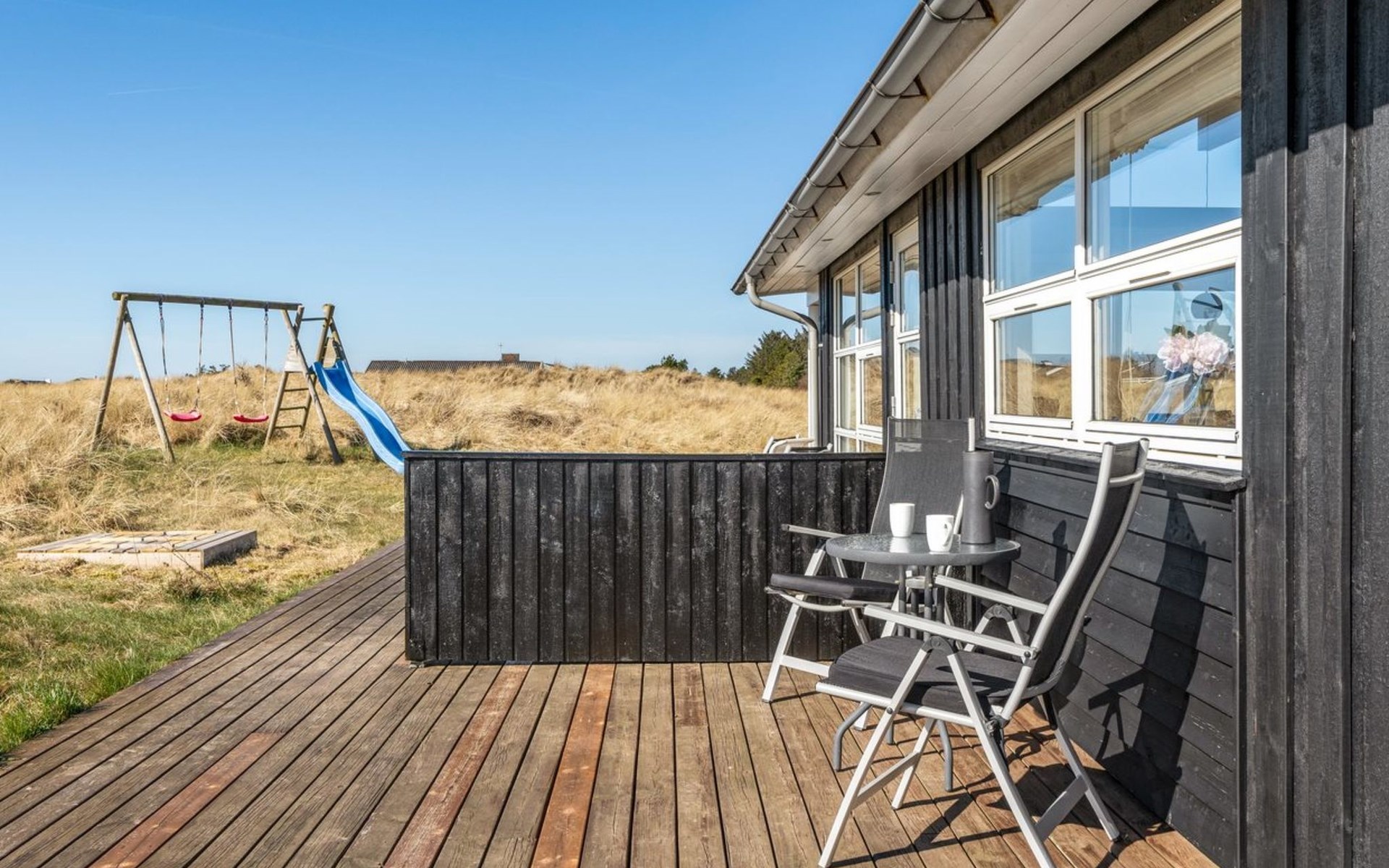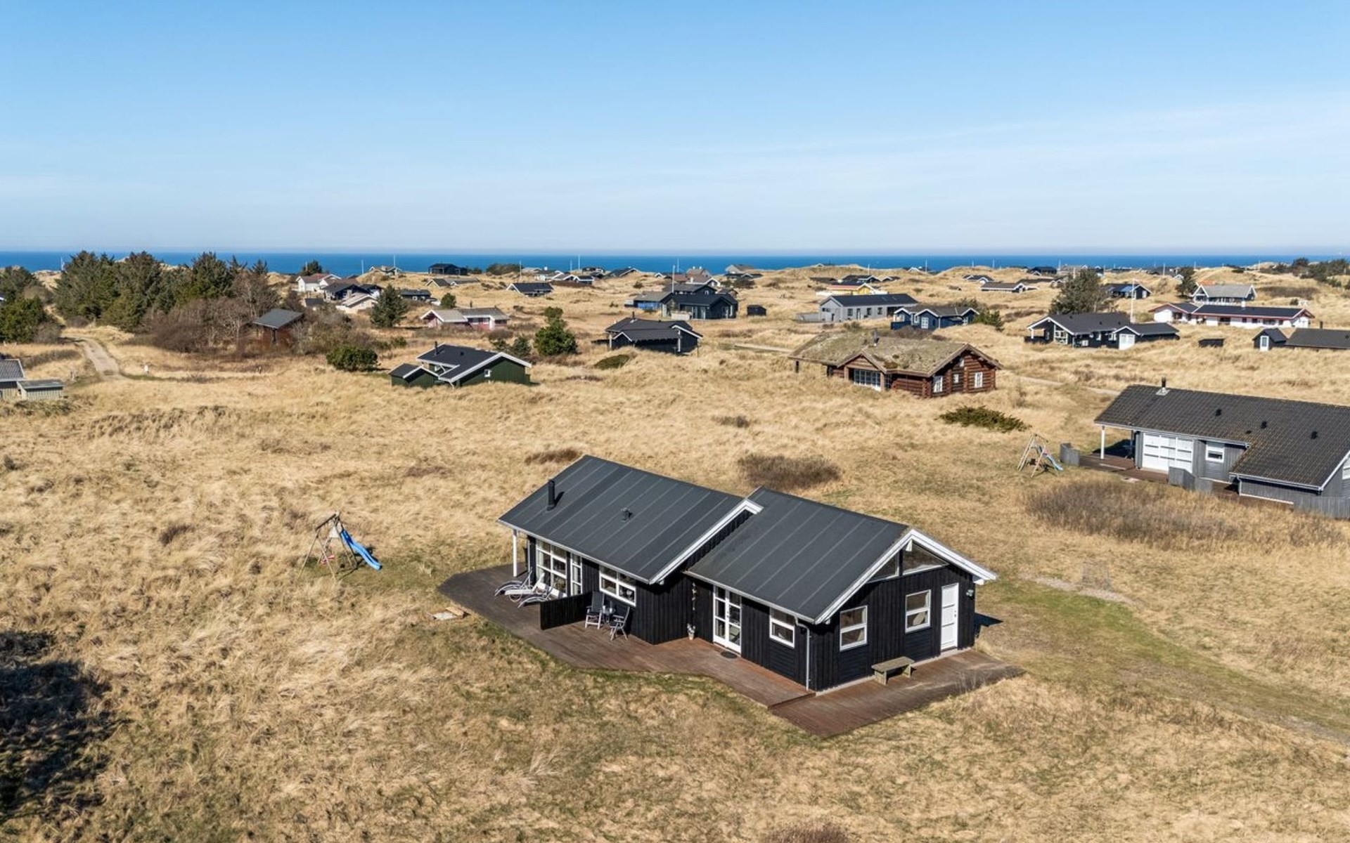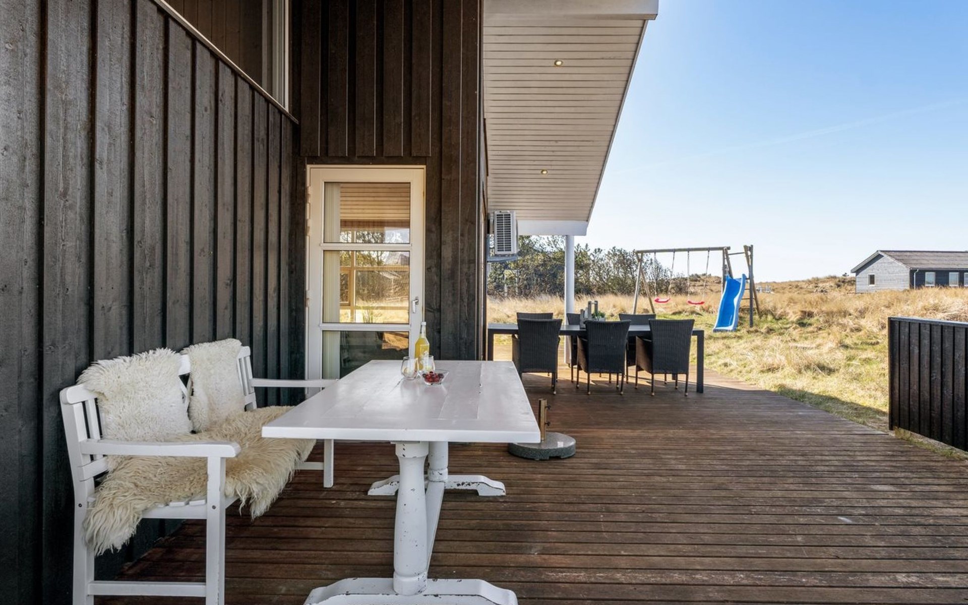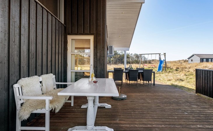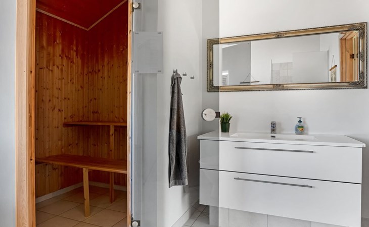 Single-family house, built in 2007. 902 m from the sea. Private: natural state property 2'600 m2. Terrace (90 m2), barbecue, children's playground (swing). In the house: sauna, washing machine, tumble dryer. Parking at the house. Grocery 2 km. The owner does not accept any youth groups.