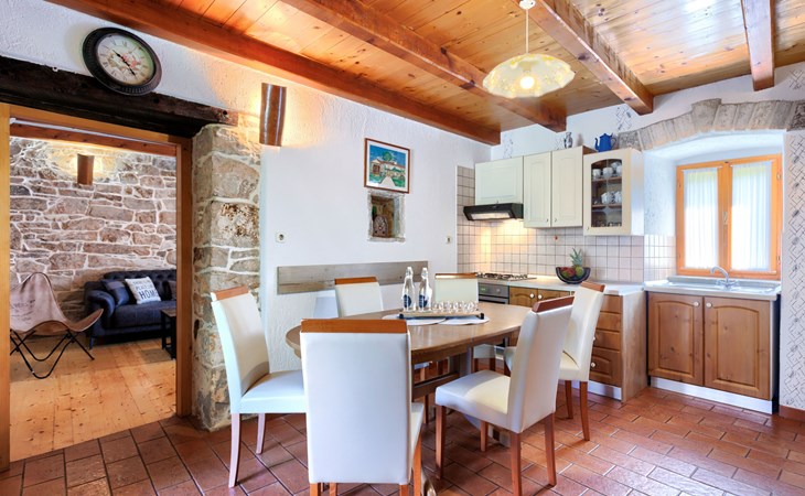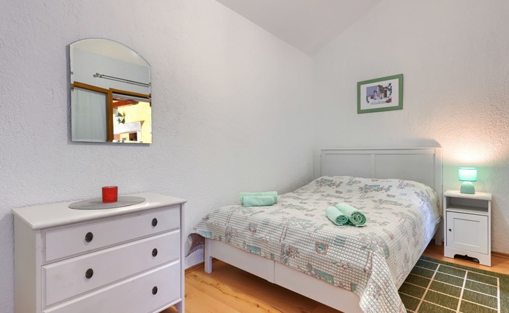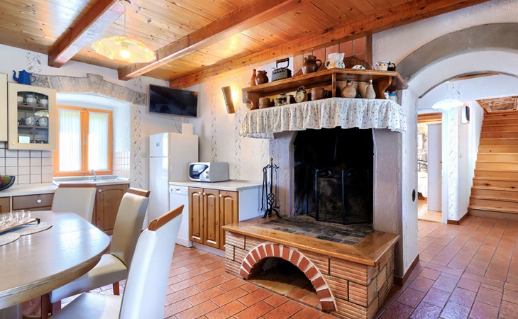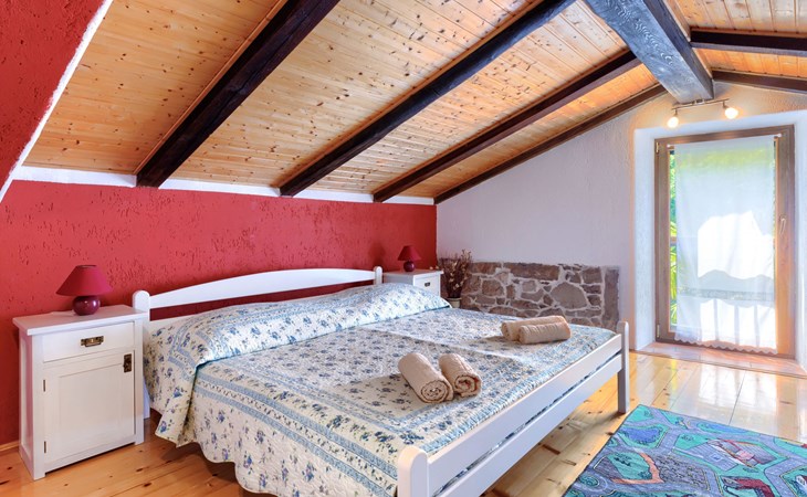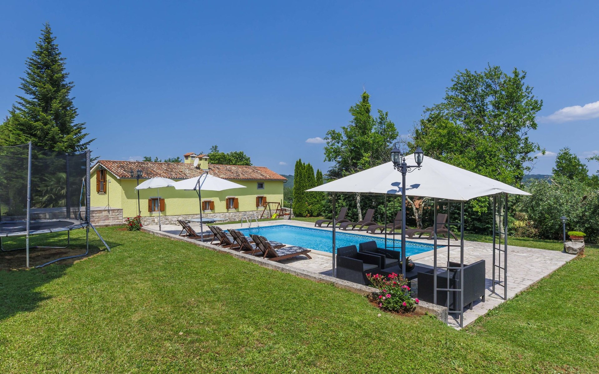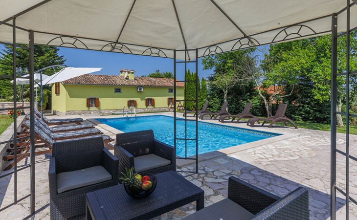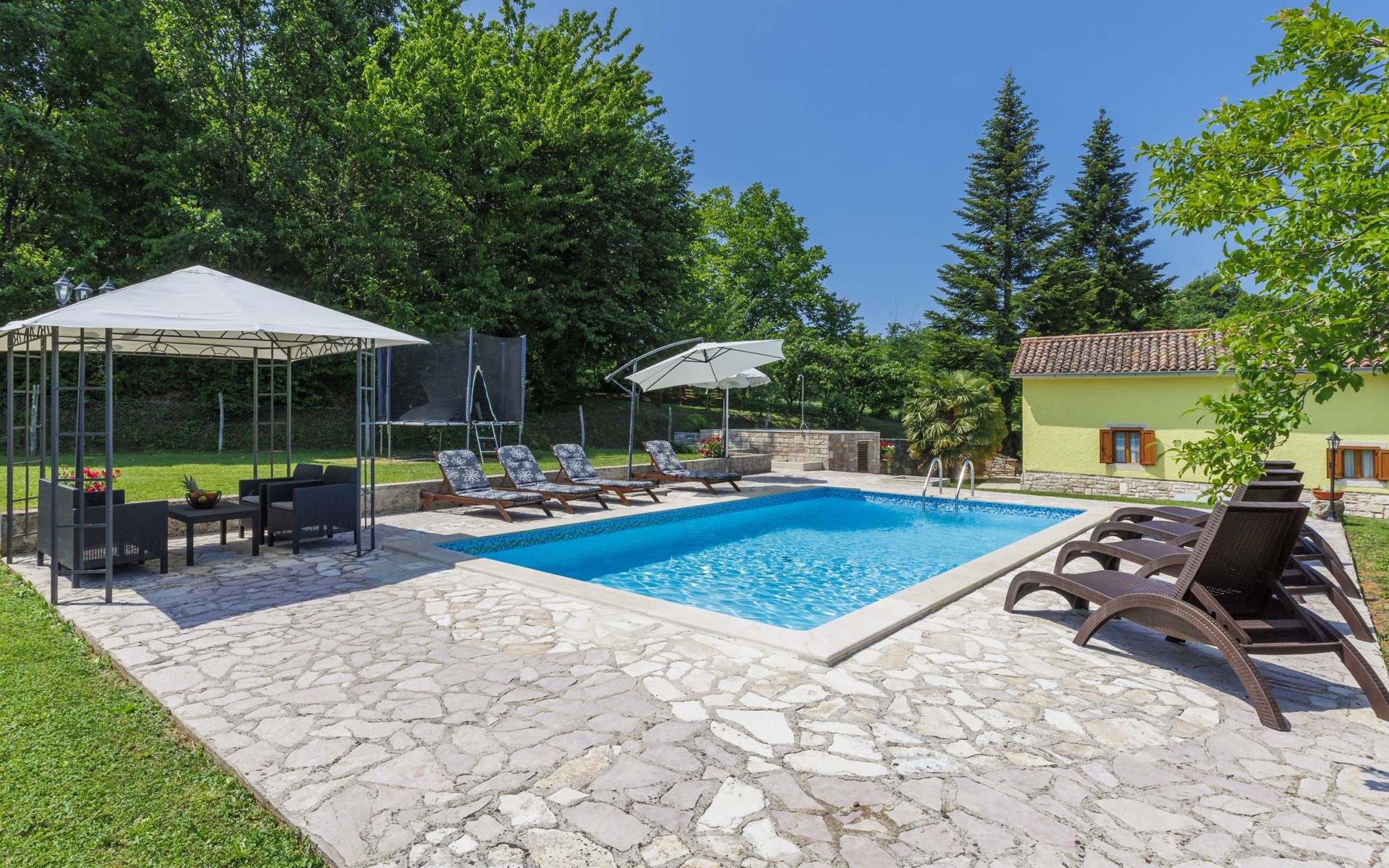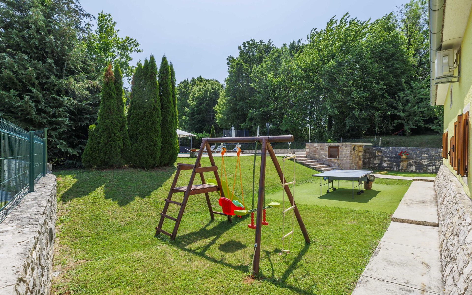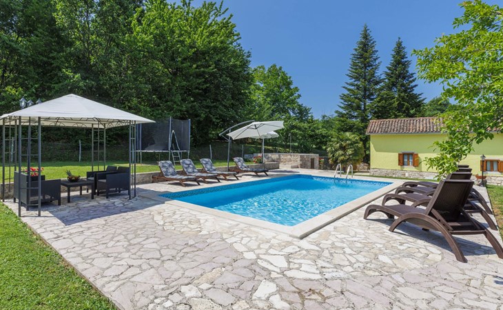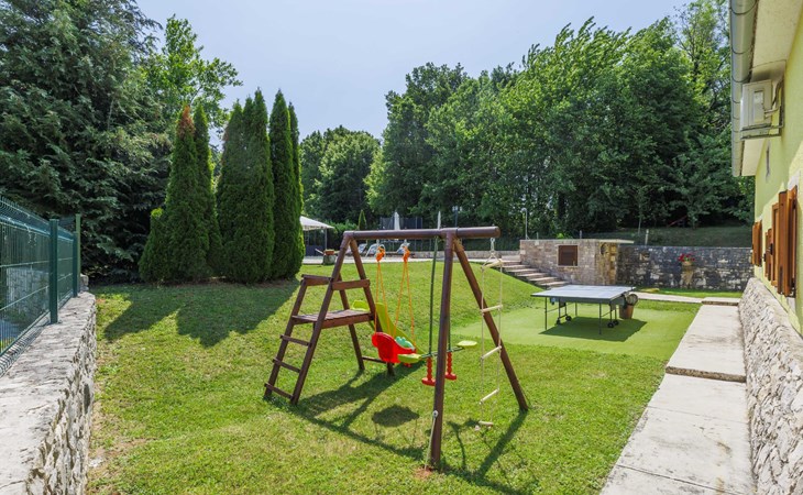 Single-family house "Donada", 2 storeys. In the hamlet Ružići 8 km from the centre of Labin, 12 km from the centre of Rabac, 12 km from the sea, in the countryside. Private: property 2'000 m2 (fenced) with lawn and trees, swimming pool angular (8 x 4 m, depth 140 cm, seasonal availability: 01.May. - 02.Oct.). Outdoor shower, table tennis, volleyball court patio, terrace, barbecue (slide, swing), pool maintenance by the owner/gardener. In the house: internet access, trampoline, washing machine. Motor access to the house (100 m via unmade road). Parking (for 3 cars) at the house on the premises. Shop 2 km, restaurant 2 km, bus stop 7.9 km, pebble beach 12 km, rocky beach 12 km. Marina 12 km.