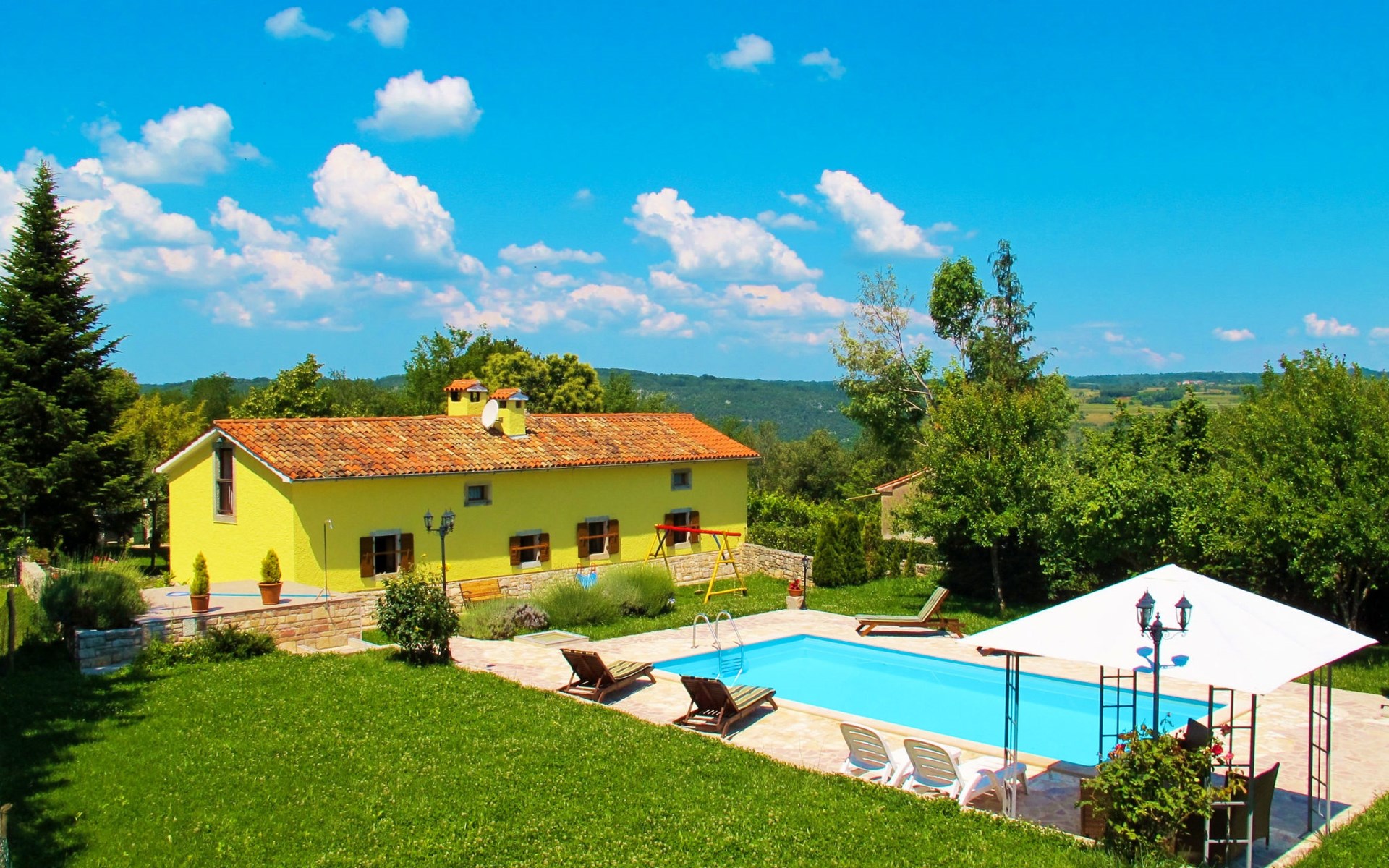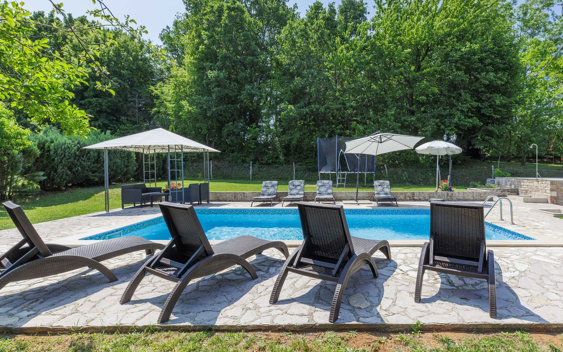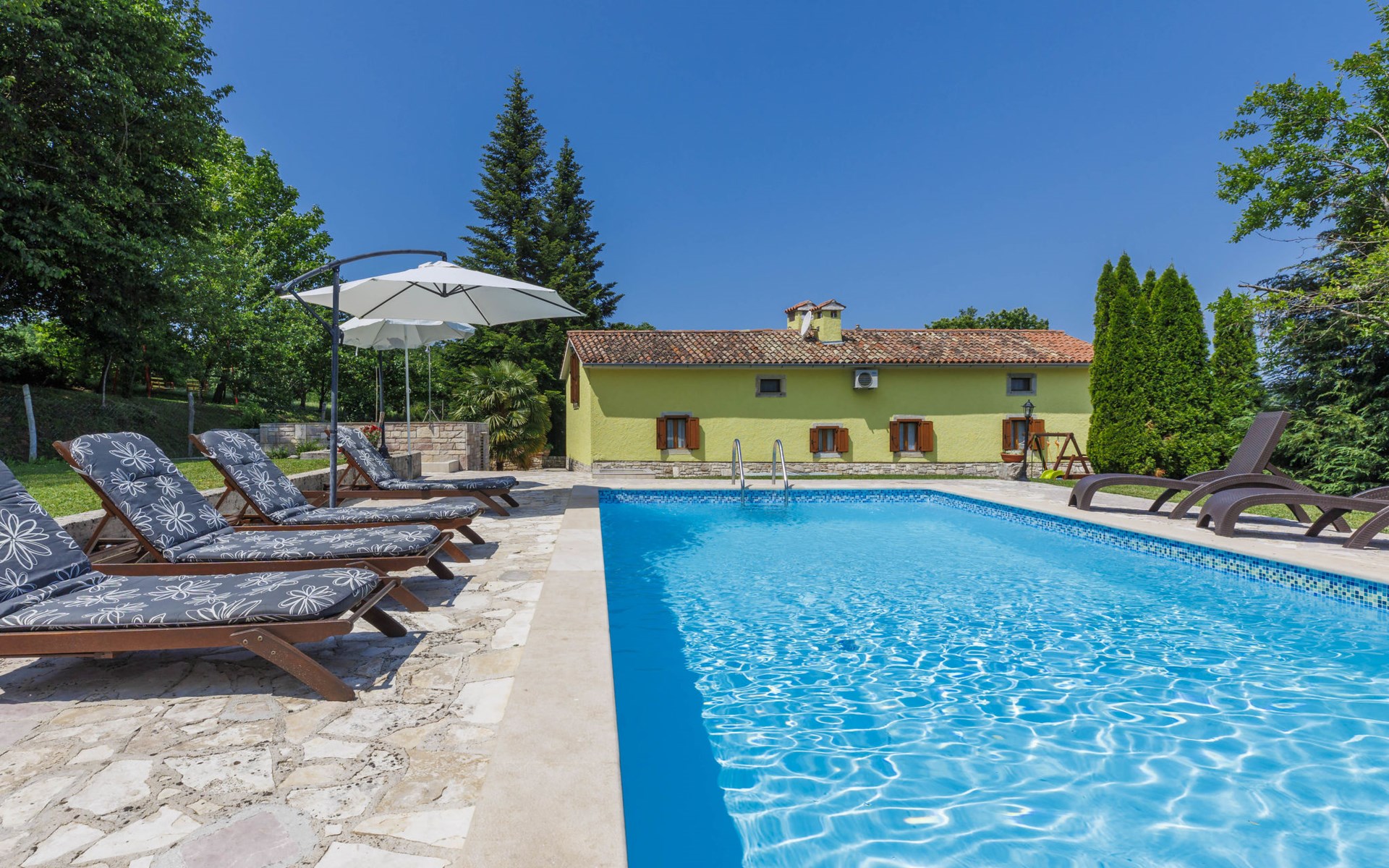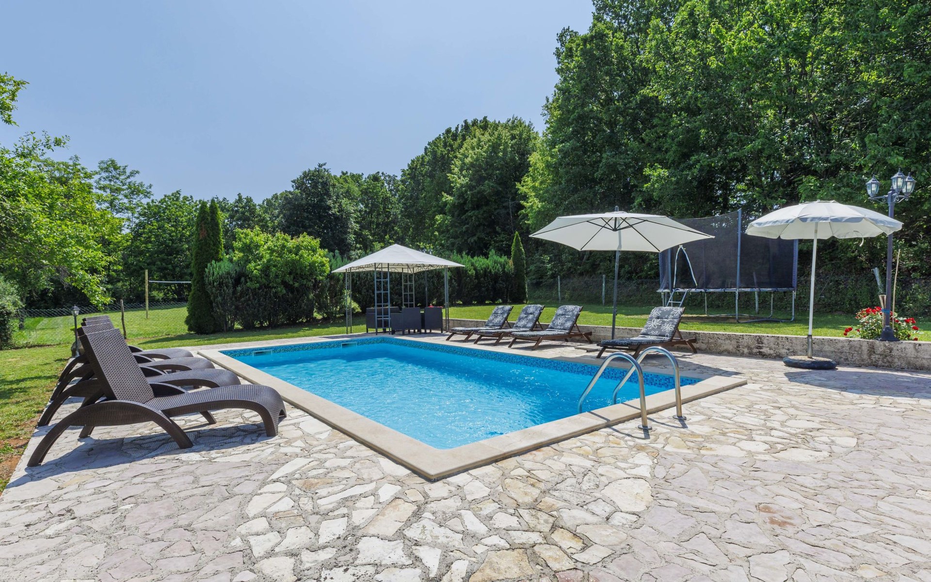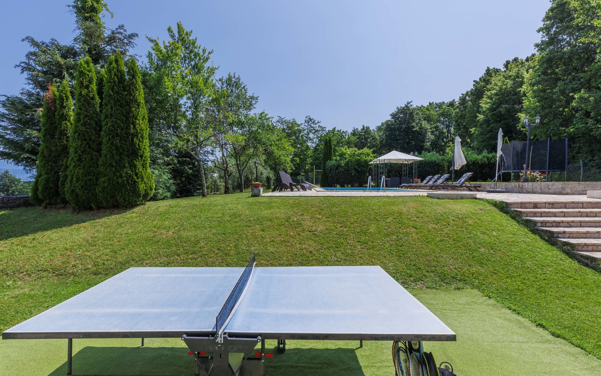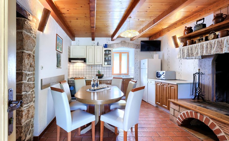 Single-family house "Donada", 2 storeys. In the hamlet Ružići 8 km from the centre of Labin, 12 km from the centre of Rabac, 12 km from the sea, in the countryside. Private: property 2'000 m2 (fenced) with lawn and trees, swimming pool angular (8 x 4 m, depth 140 cm, seasonal availability: 01.May. - 02.Oct.). Outdoor shower, table tennis, volleyball court patio, terrace, barbecue (slide, swing), pool maintenance by the owner/gardener. In the house: internet access, trampoline, washing machine. Motor access to the house (100 m via unmade road). Parking (for 3 cars) at the house on the premises. Shop 2 km, restaurant 2 km, bus stop 7.9 km, pebble beach 12 km, rocky beach 12 km. Marina 12 km.