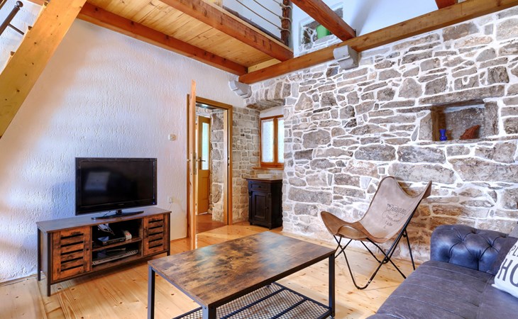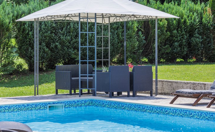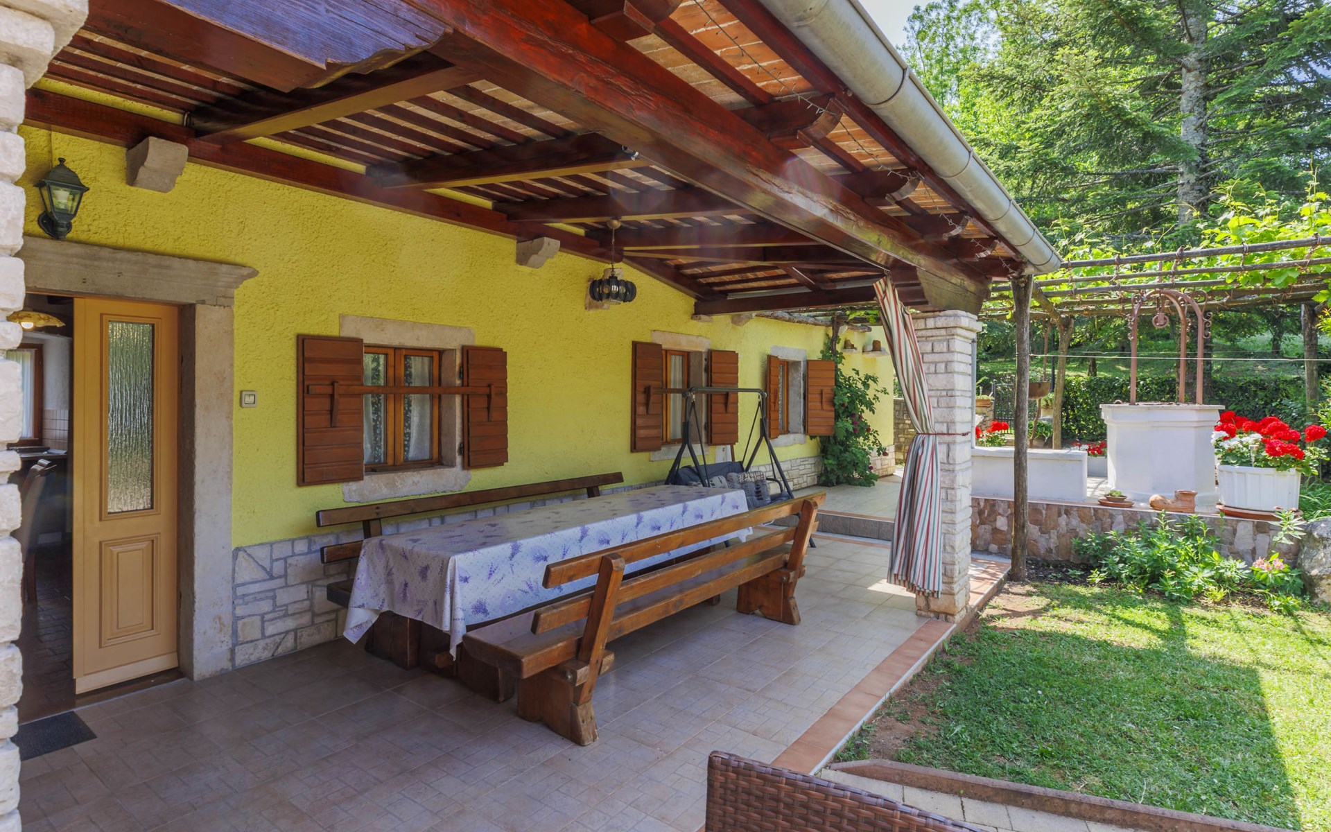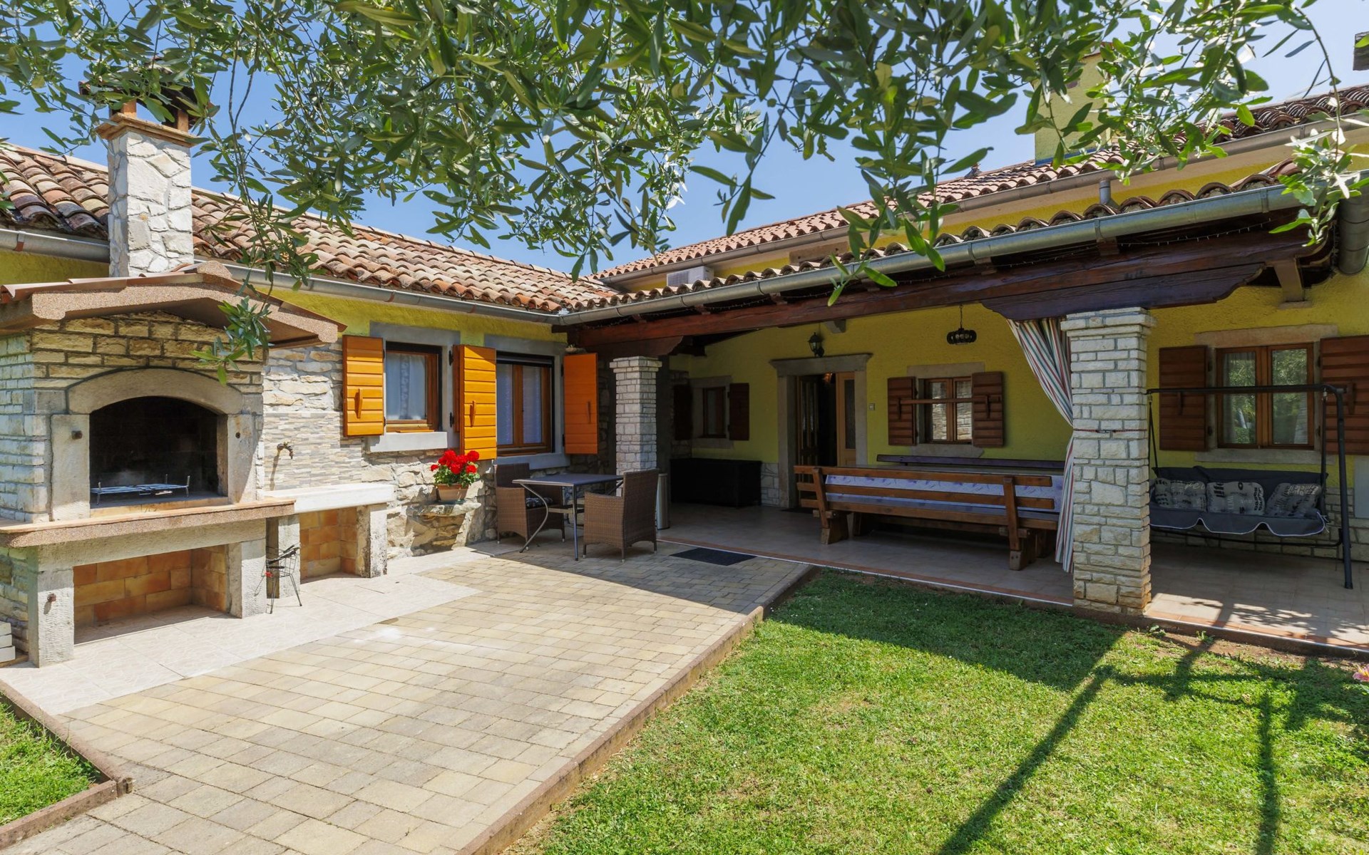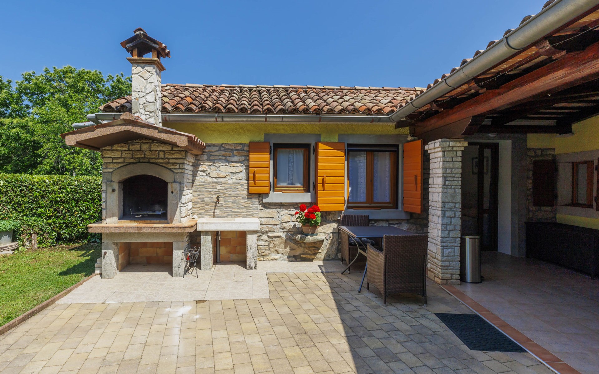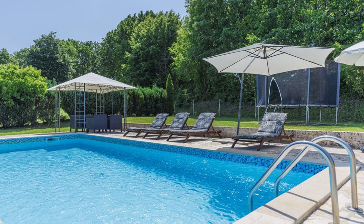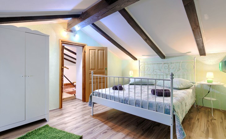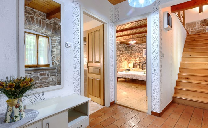 Single-family house "Donada", 2 storeys. In the hamlet Ružići 8 km from the centre of Labin, 12 km from the centre of Rabac, 12 km from the sea, in the countryside. Private: property 2'000 m2 (fenced) with lawn and trees, swimming pool angular (8 x 4 m, depth 140 cm, seasonal availability: 01.May. - 02.Oct.). Outdoor shower, table tennis, volleyball court patio, terrace, barbecue (slide, swing), pool maintenance by the owner/gardener. In the house: internet access, trampoline, washing machine. Motor access to the house (100 m via unmade road). Parking (for 3 cars) at the house on the premises. Shop 2 km, restaurant 2 km, bus stop 7.9 km, pebble beach 12 km, rocky beach 12 km. Marina 12 km.