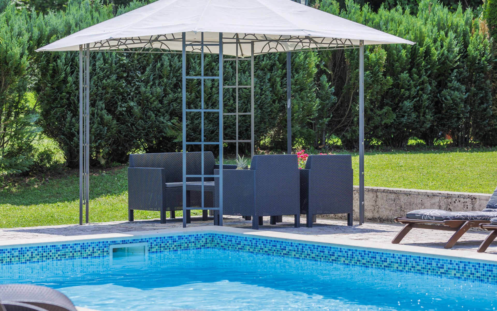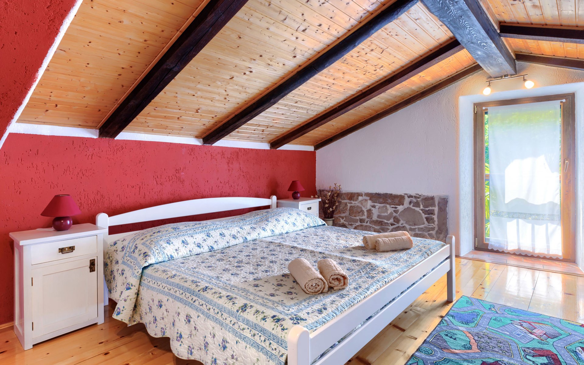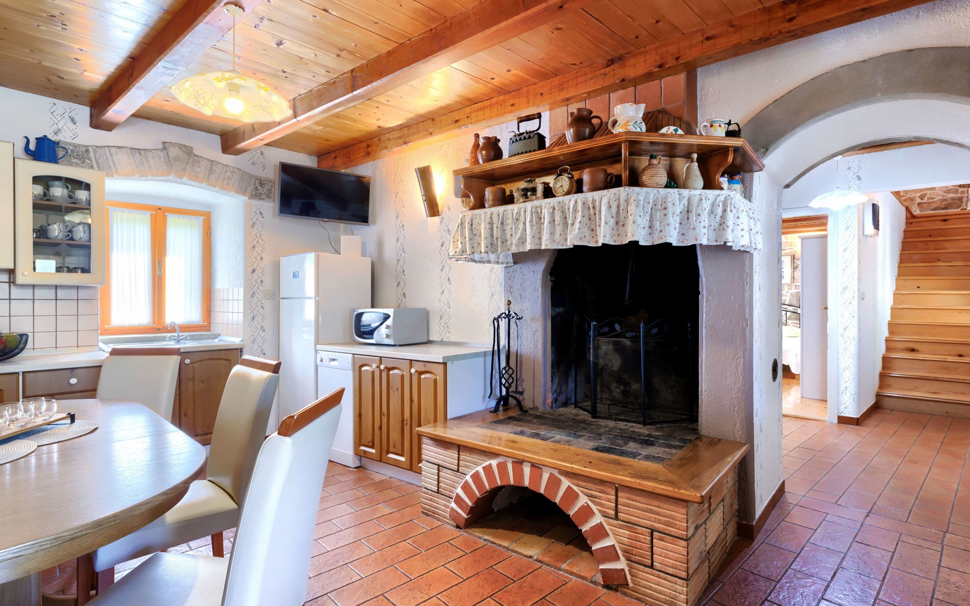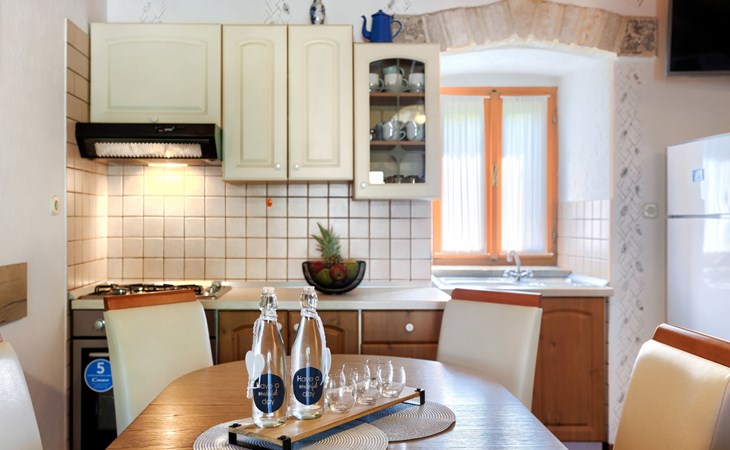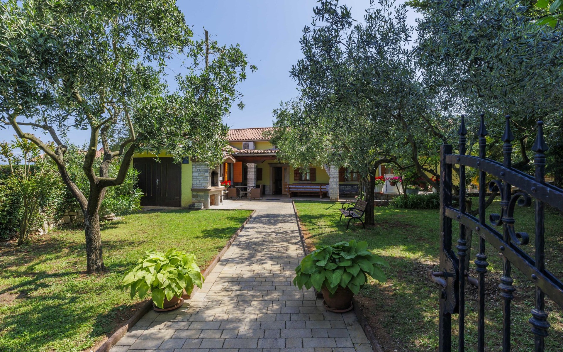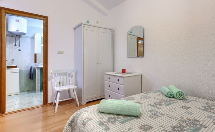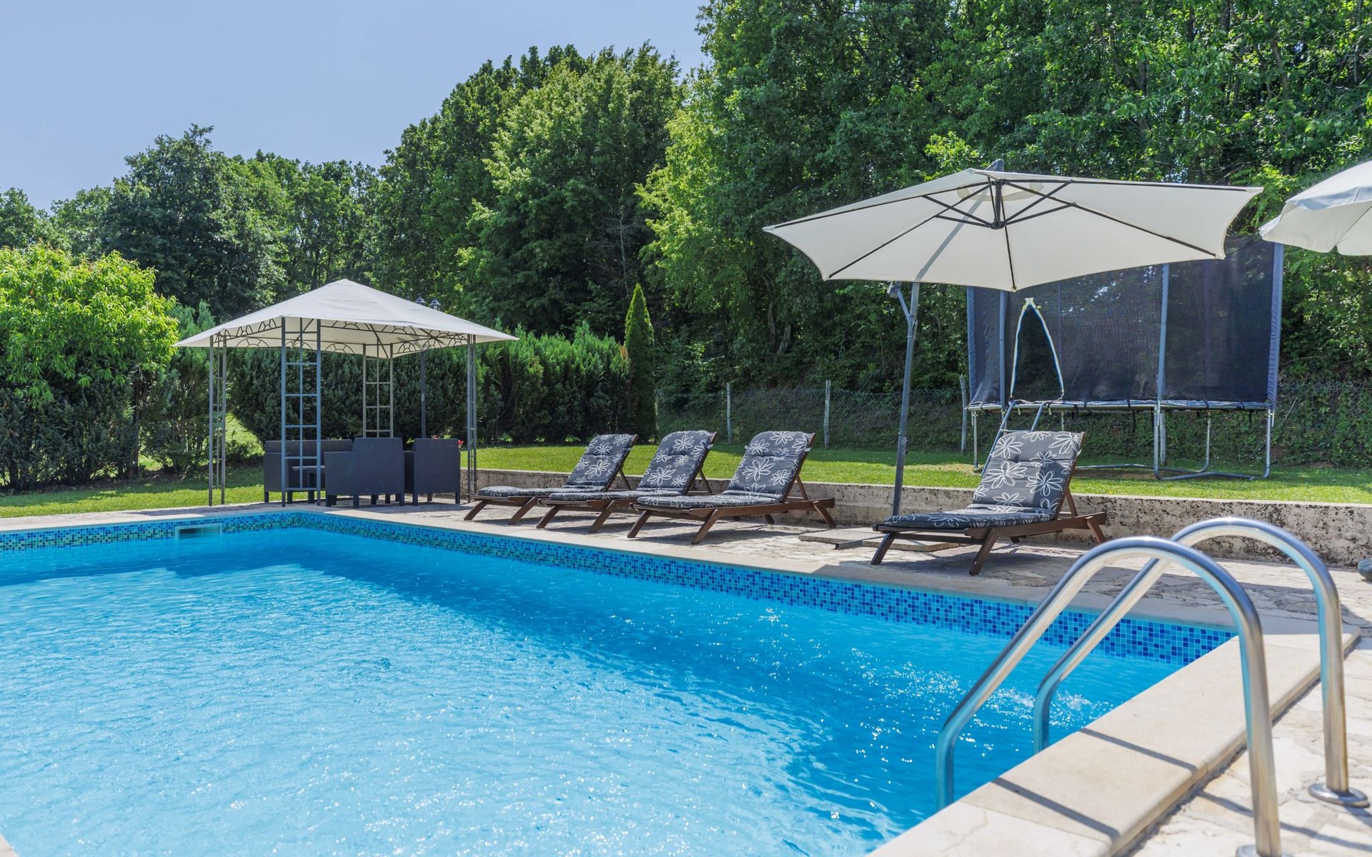 Single-family house "Donada", 2 storeys. In the hamlet Ružići 8 km from the centre of Labin, 12 km from the centre of Rabac, 12 km from the sea, in the countryside. Private: property 2'000 m2 (fenced) with lawn and trees, swimming pool angular (8 x 4 m, depth 140 cm, seasonal availability: 01.May. - 02.Oct.). Outdoor shower, table tennis, volleyball court patio, terrace, barbecue (slide, swing), pool maintenance by the owner/gardener. In the house: internet access, trampoline, washing machine. Motor access to the house (100 m via unmade road). Parking (for 3 cars) at the house on the premises. Shop 2 km, restaurant 2 km, bus stop 7.9 km, pebble beach 12 km, rocky beach 12 km. Marina 12 km.