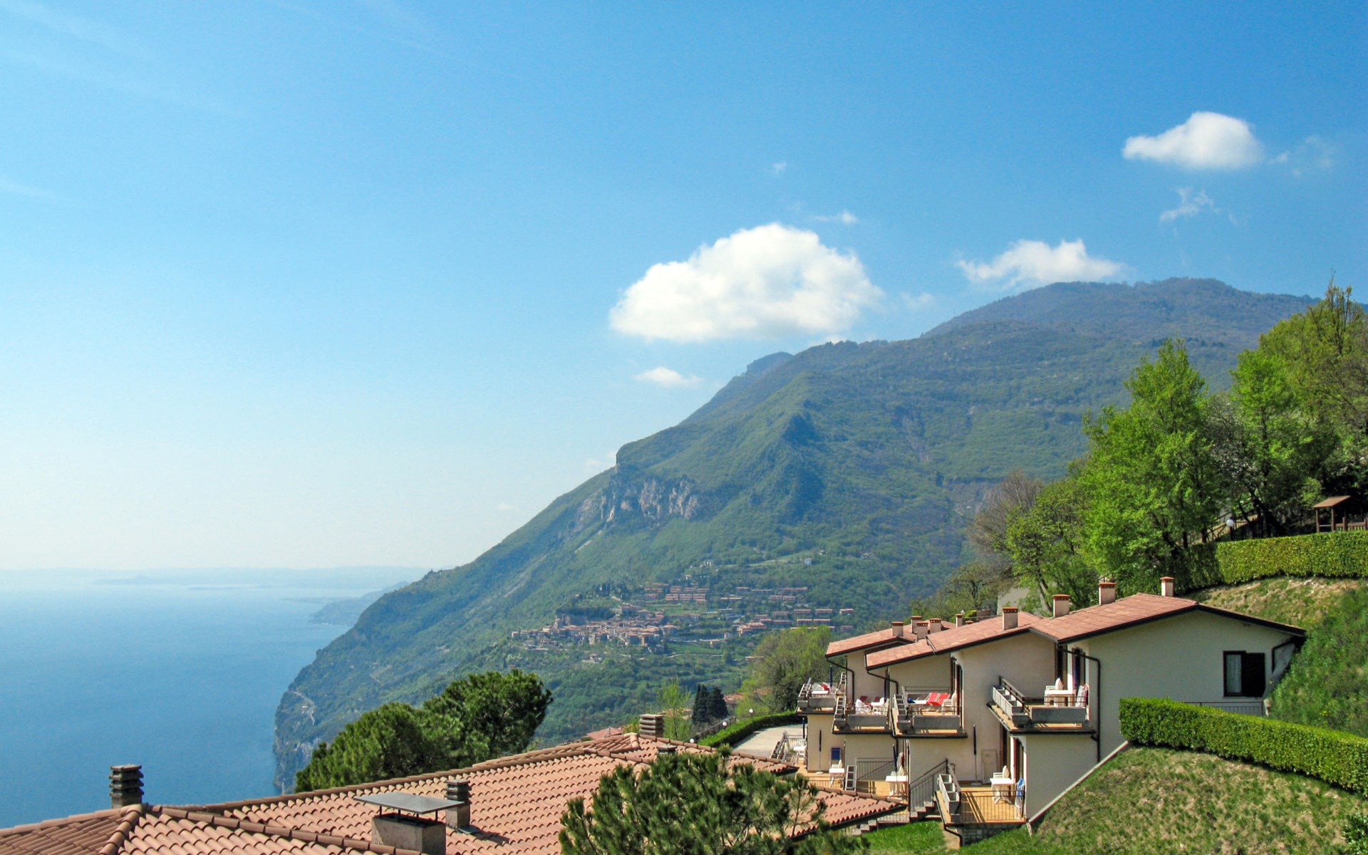 Child friendly resort "La Rotonda", 550 m a.s.l.. 80 apartments in the residence. 1.5 km from the centre of Tignale, outside the resort, 700 m from the centre of Gardola, in an elevated position on a slope, 4.5 km from the lake, 7.5 km from the beach. For shared use: property, well-kept terraced garden with plants, 2 swimming pools (18 x 7 m, seasonal availability: 15.May. - 15.Sep.). Children's pool, tennis (extra), table tennis, garden furniture. In the house: reception, restaurant, bar, lounge with TV, WiFi, sauna (extra). Fitness room, table tennis, table football, storage room for bicycles, laundry. Breakfast and half board possible on request (extra). Stepped path to the house. Parking (limited number of spaces) on the premises. Shop 1.5 km, bus stop 500 m, ferry "Toscolano-Maderno" 19 km, pebble beach "Pra de la Fam" 7.5 km. Golf course (18 hole) 13.5 km. Nearby attractions: Limone sul Garda 22 km, Salò 27 km, Brescia 62 km.