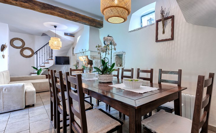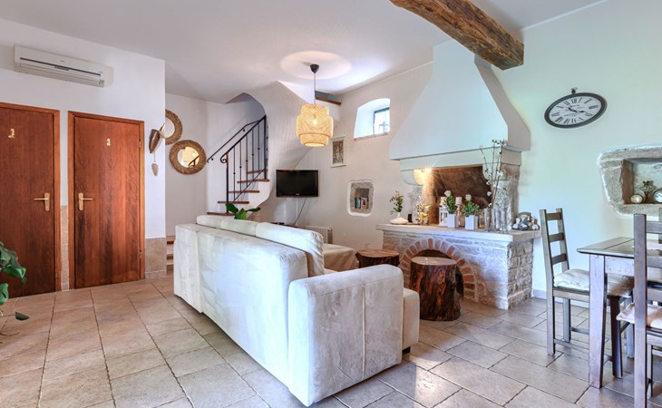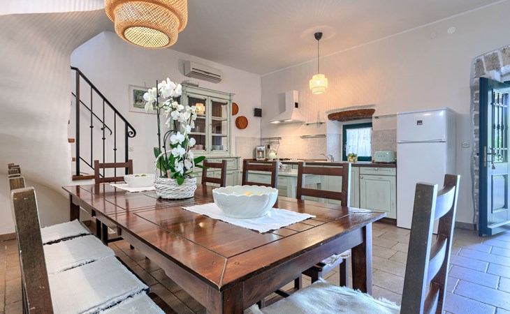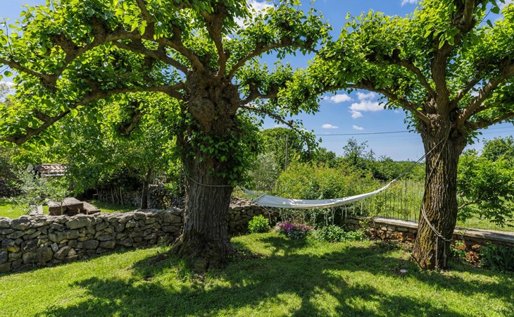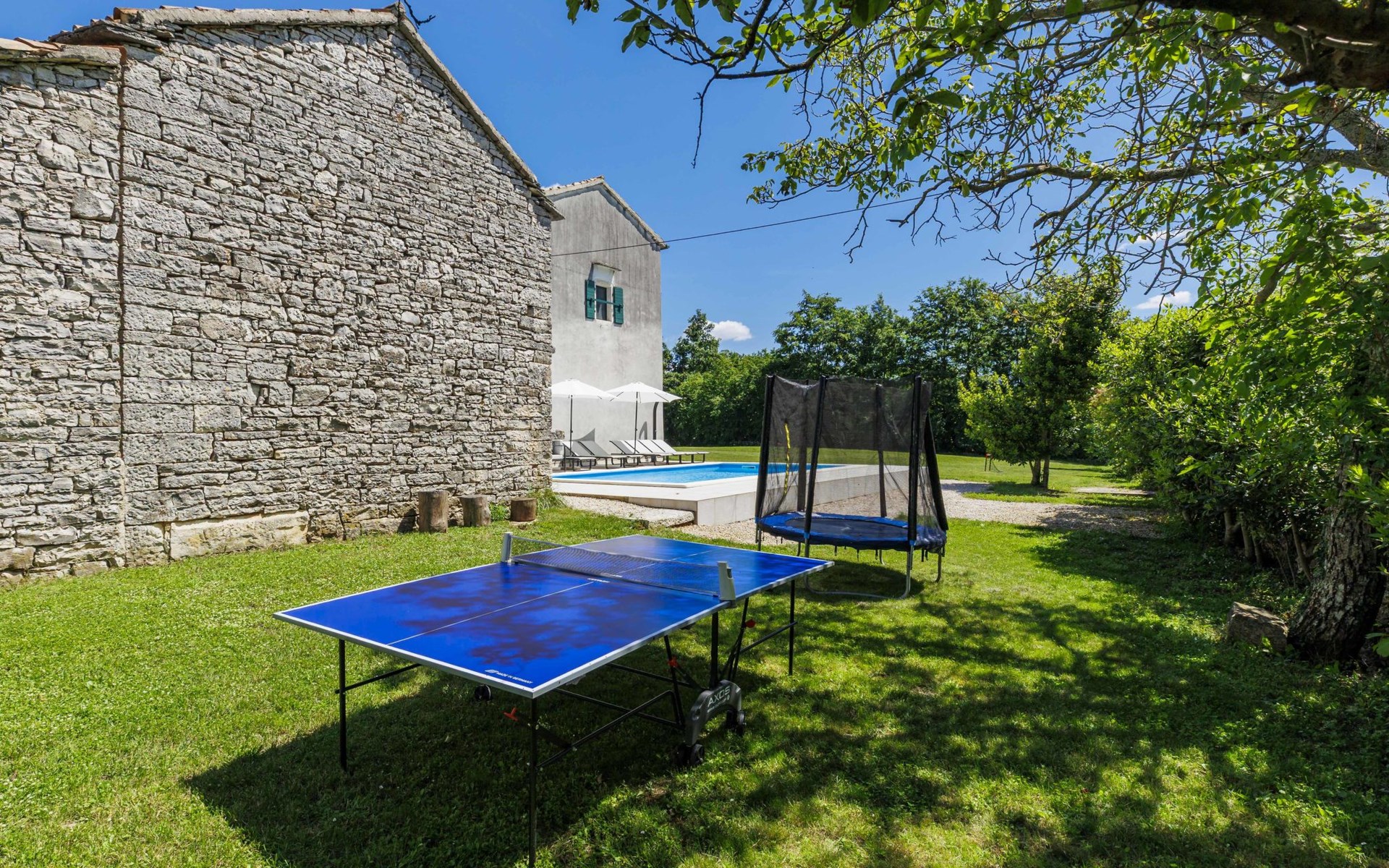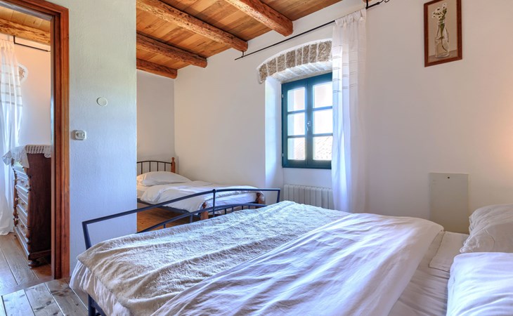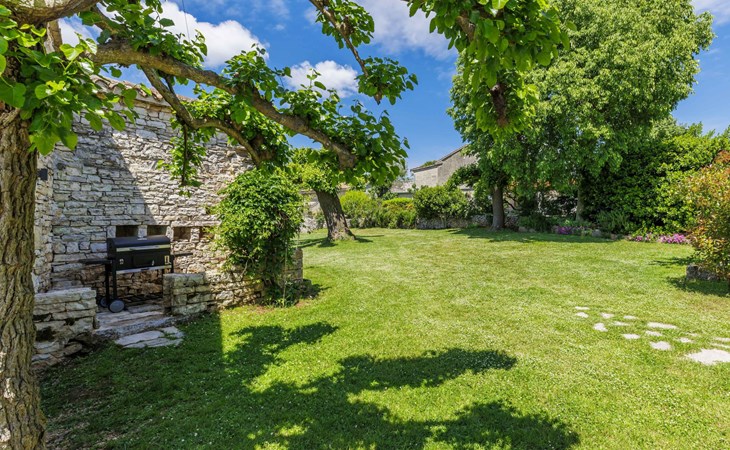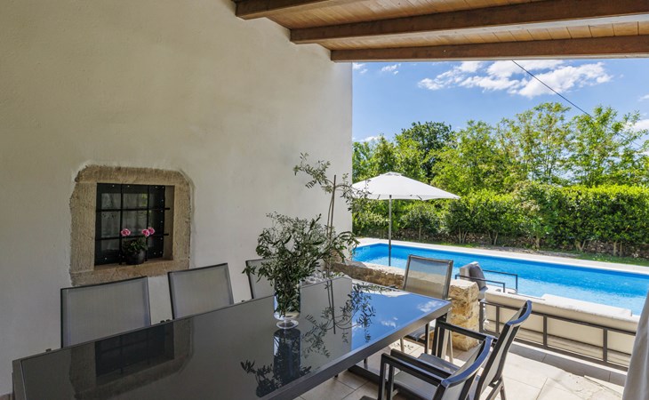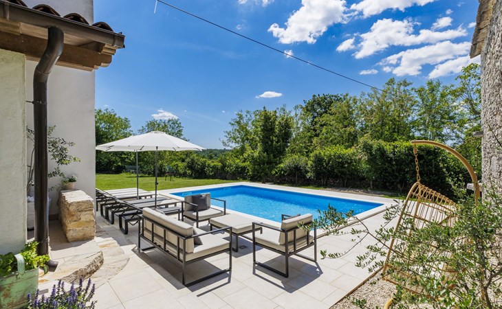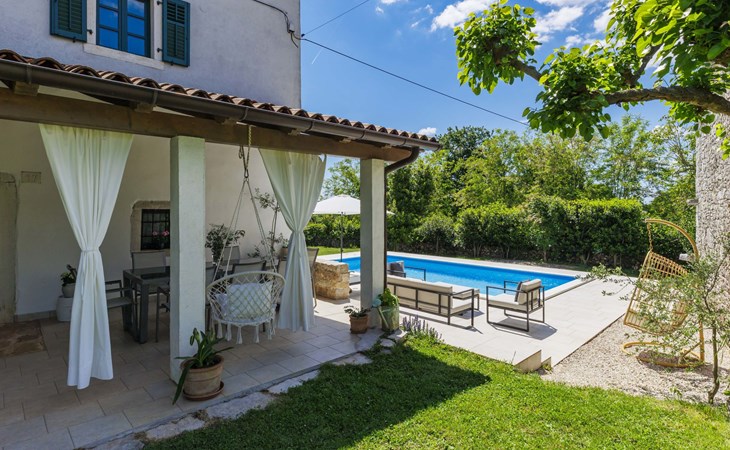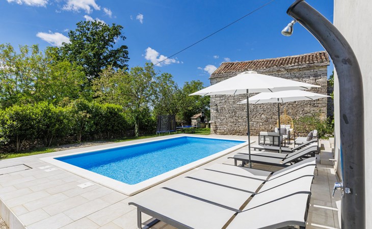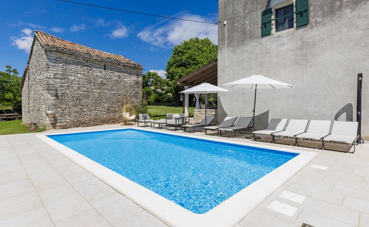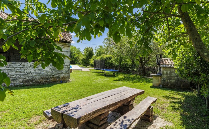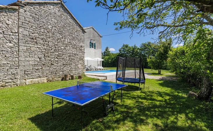 Single-family house "Marija", 3 storeys. In the hamlet Domijanići 5 km from the centre of Žminj, 25 km from the centre of Rovinj, 25 km from the sea. Private: property 5'000 m2, trees, meadow, swimming pool angular (8 x 4 m, depth 140 cm, seasonal availability: 30.Apr. - 01.Oct.) with internal staircase. Outdoor shower, table tennis, garden furniture, barbecue (swing). In the house: internet access, washing machine. Parking (for 5 cars) on the premises. Shop 5 km, restaurant 5 km, bus stop 3.1 km, rocky beach 25 km.