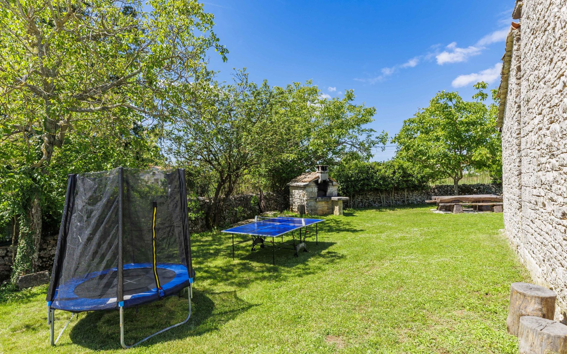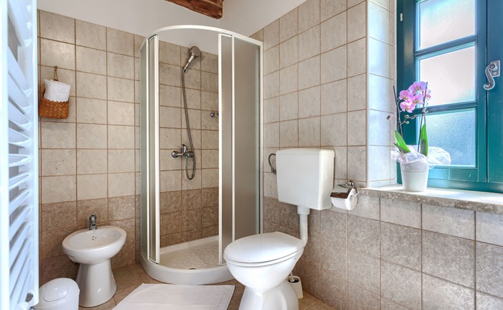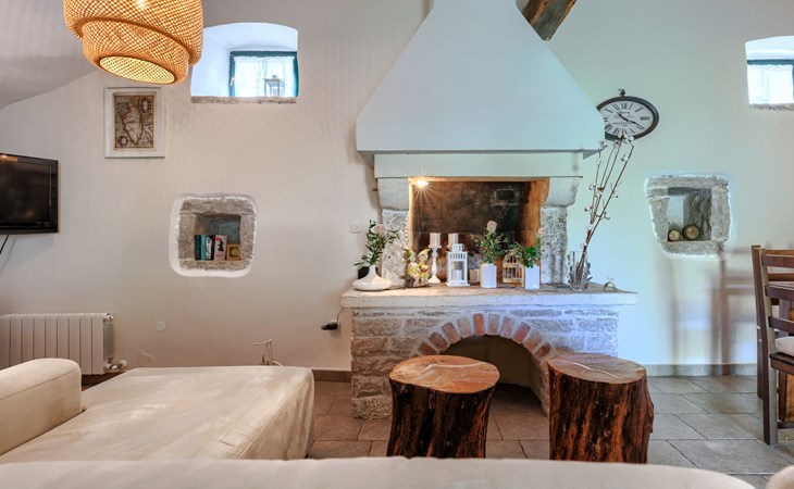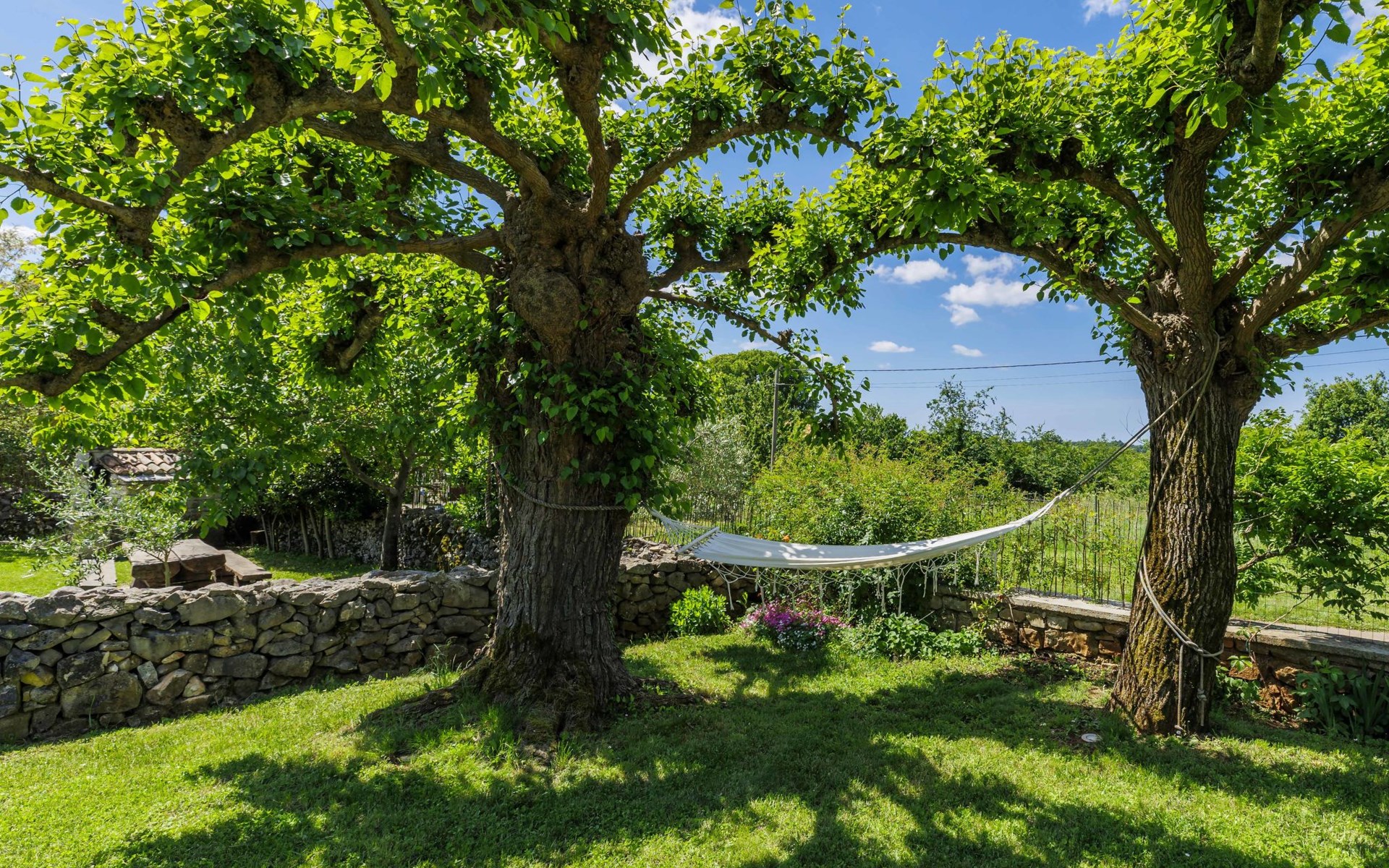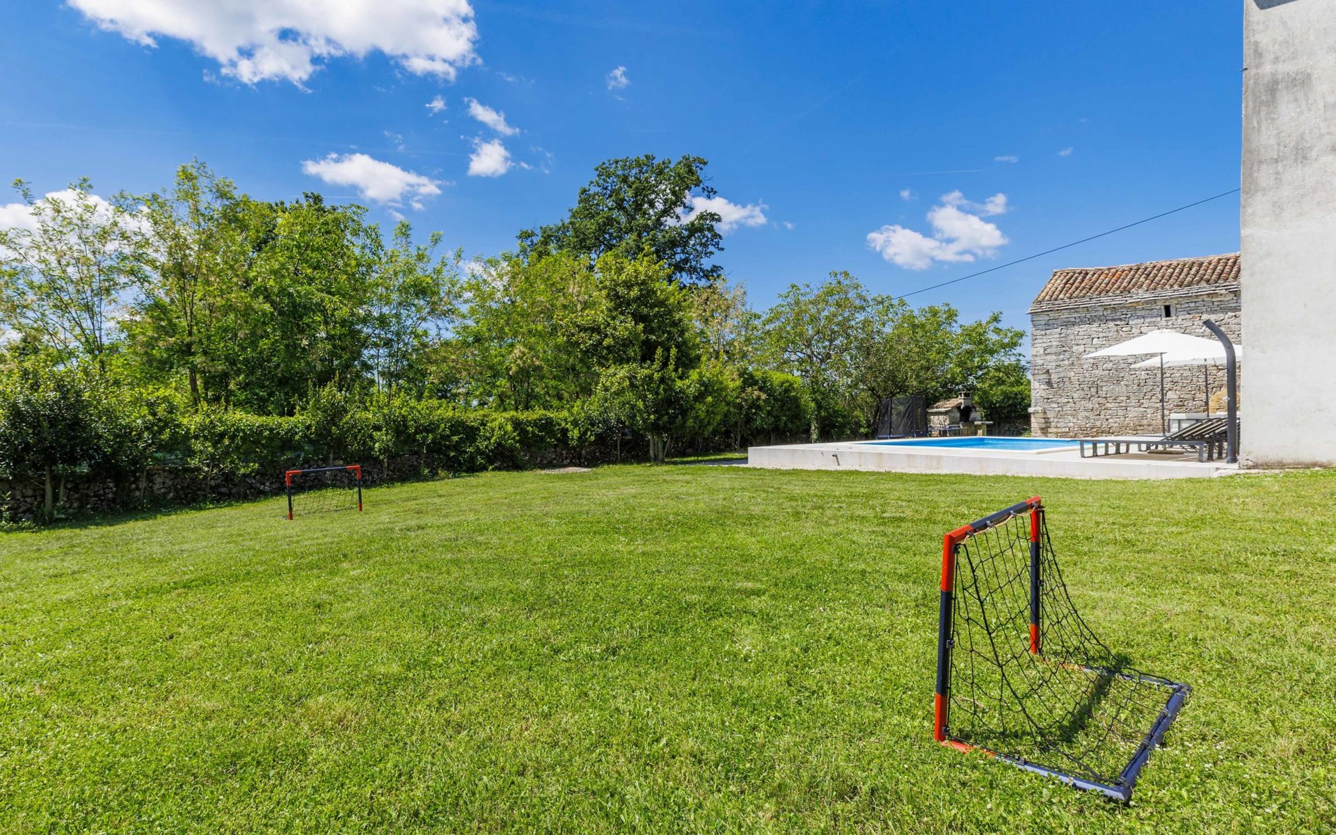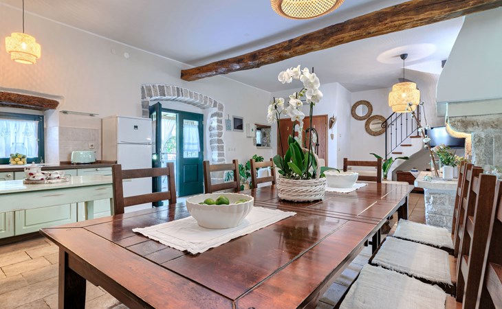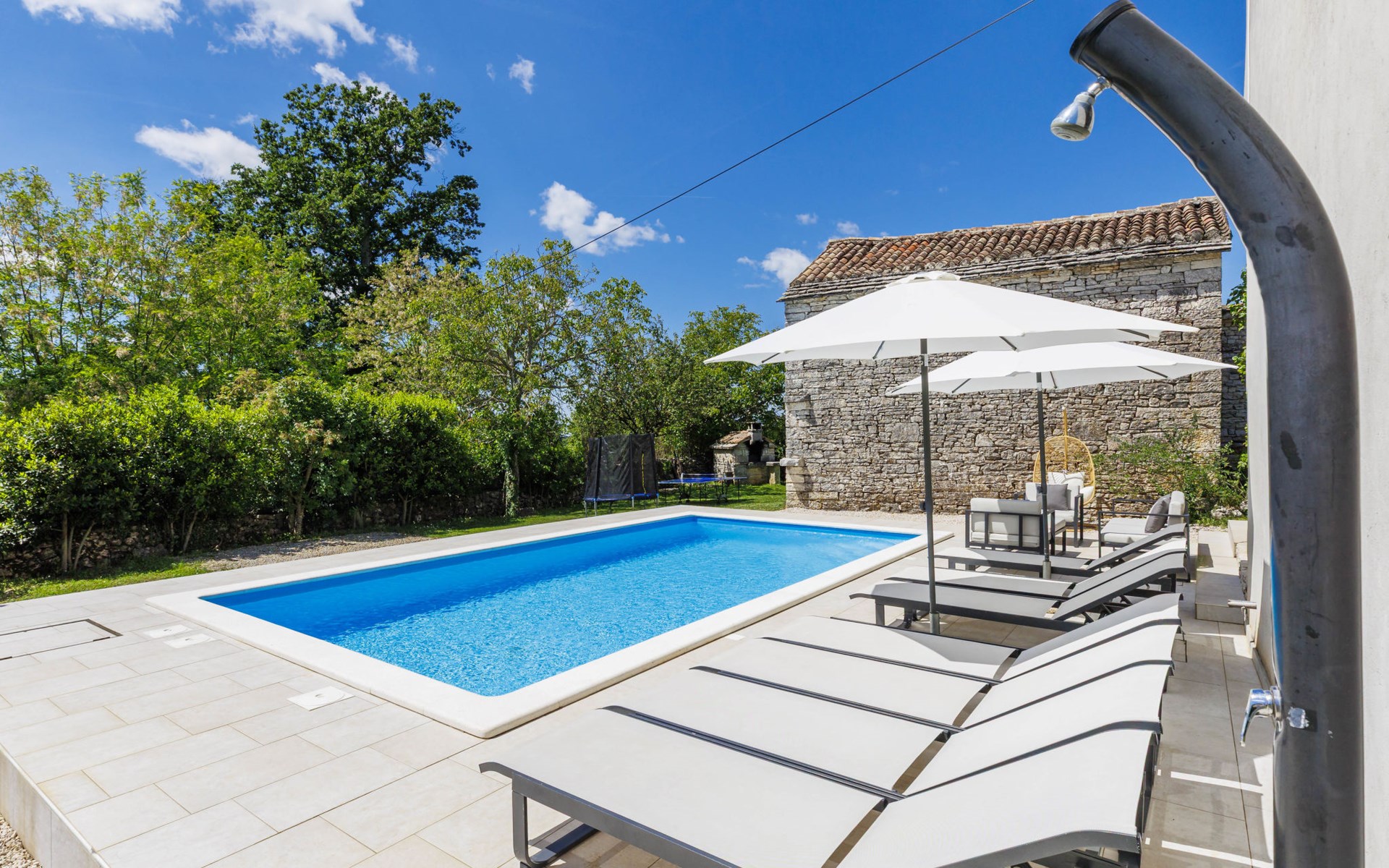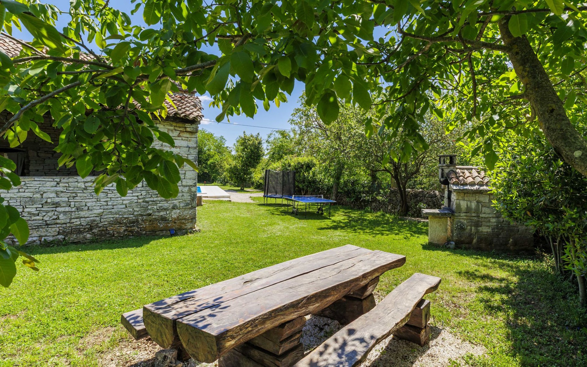 Single-family house "Marija", 3 storeys. In the hamlet Domijanići 5 km from the centre of Žminj, 25 km from the centre of Rovinj, 25 km from the sea. Private: property 5'000 m2, trees, meadow, swimming pool angular (8 x 4 m, depth 140 cm, seasonal availability: 30.Apr. - 01.Oct.) with internal staircase. Outdoor shower, table tennis, garden furniture, barbecue (swing). In the house: internet access, washing machine. Parking (for 5 cars) on the premises. Shop 5 km, restaurant 5 km, bus stop 3.1 km, rocky beach 25 km.