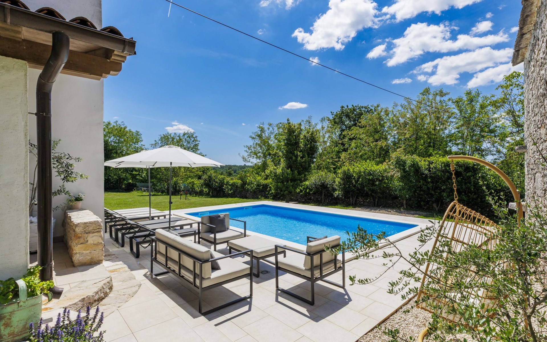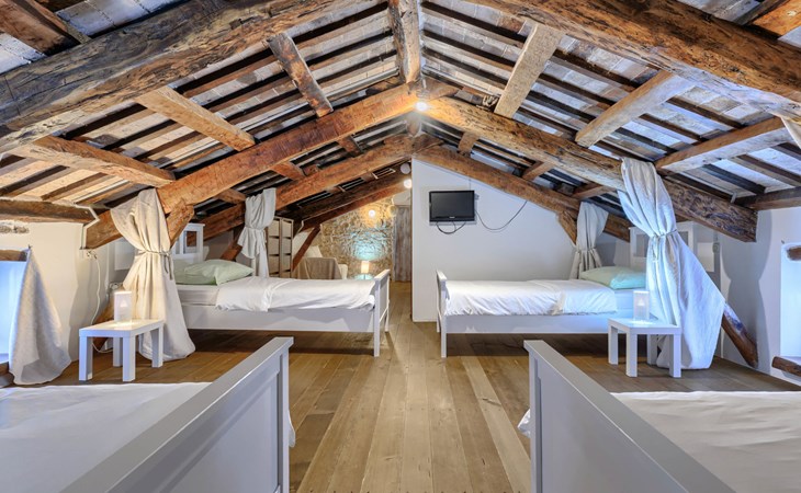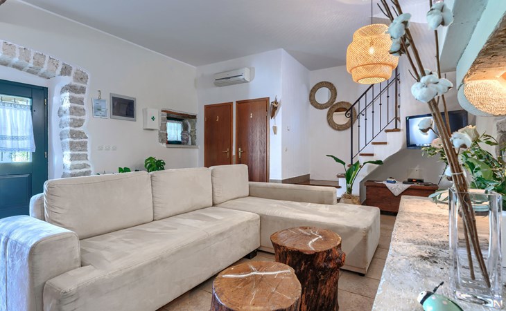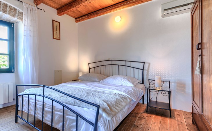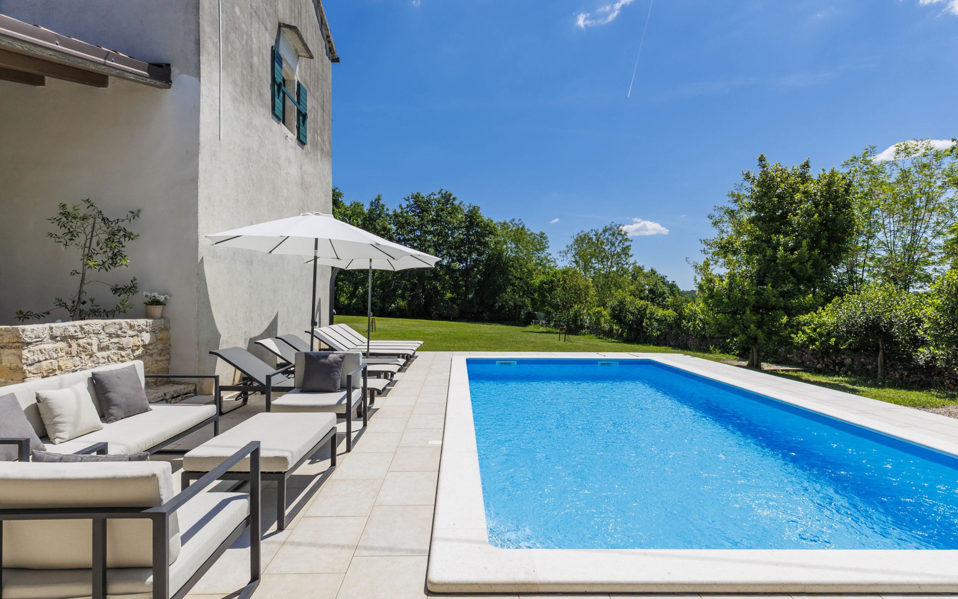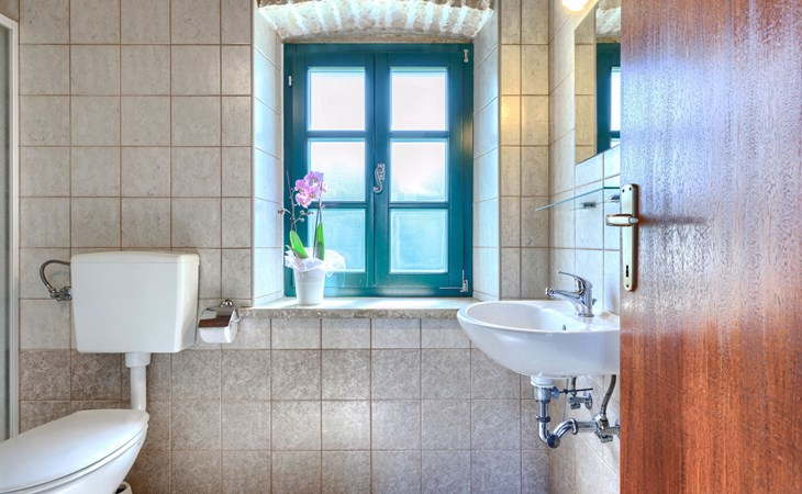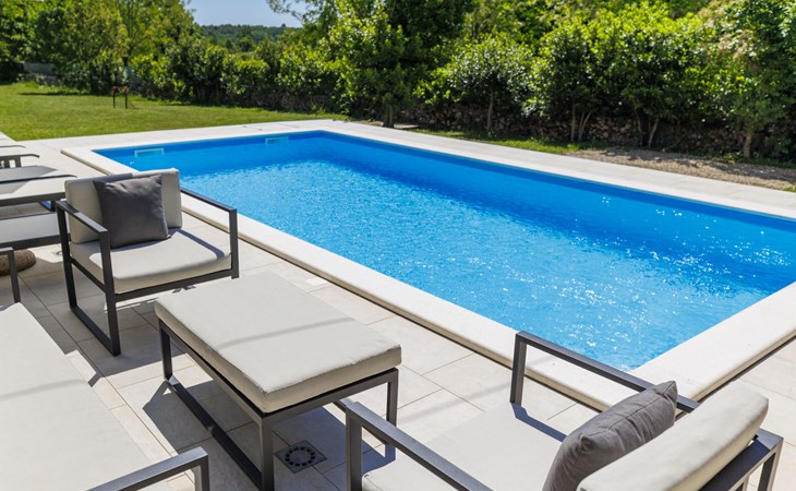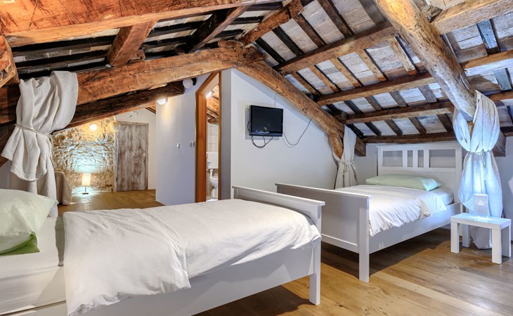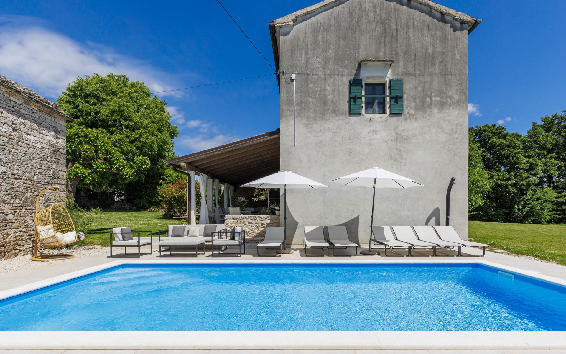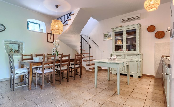Single-family house "Marija", 3 storeys. In the hamlet Domijanići 5 km from the centre of Žminj, 25 km from the centre of Rovinj, 25 km from the sea. Private: property 5'000 m2, trees, meadow, swimming pool angular (8 x 4 m, depth 140 cm, seasonal availability: 30.Apr. - 01.Oct.) with internal staircase. Outdoor shower, table tennis, garden furniture, barbecue (swing). In the house: internet access, washing machine. Parking (for 5 cars) on the premises. Shop 5 km, restaurant 5 km, bus stop 3.1 km, rocky beach 25 km.