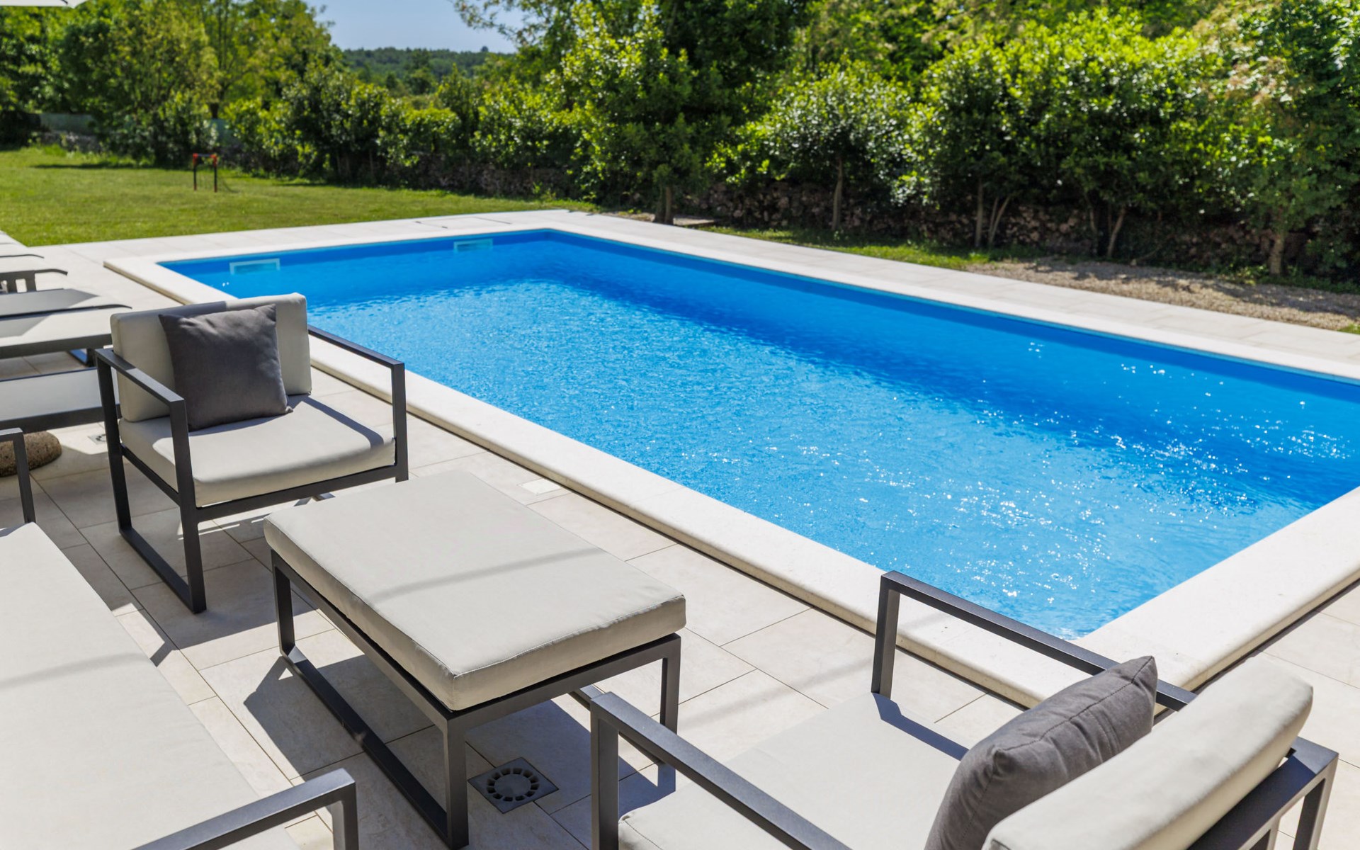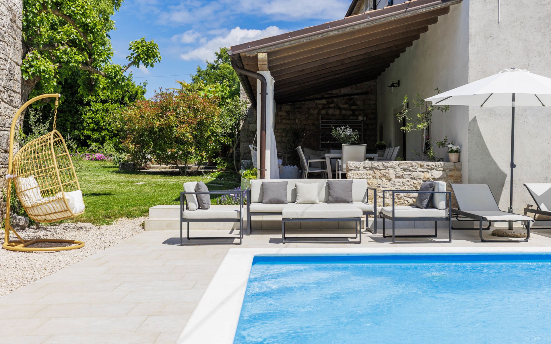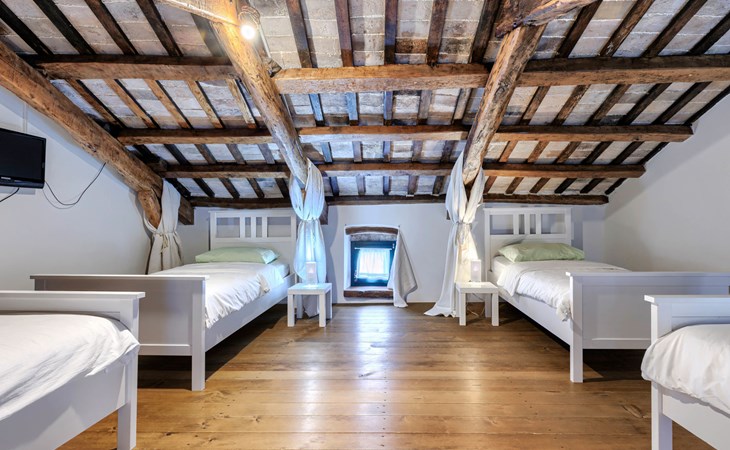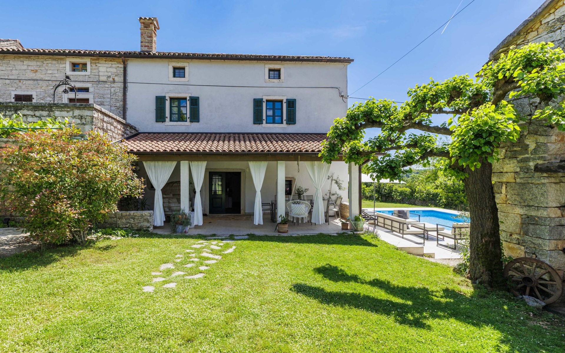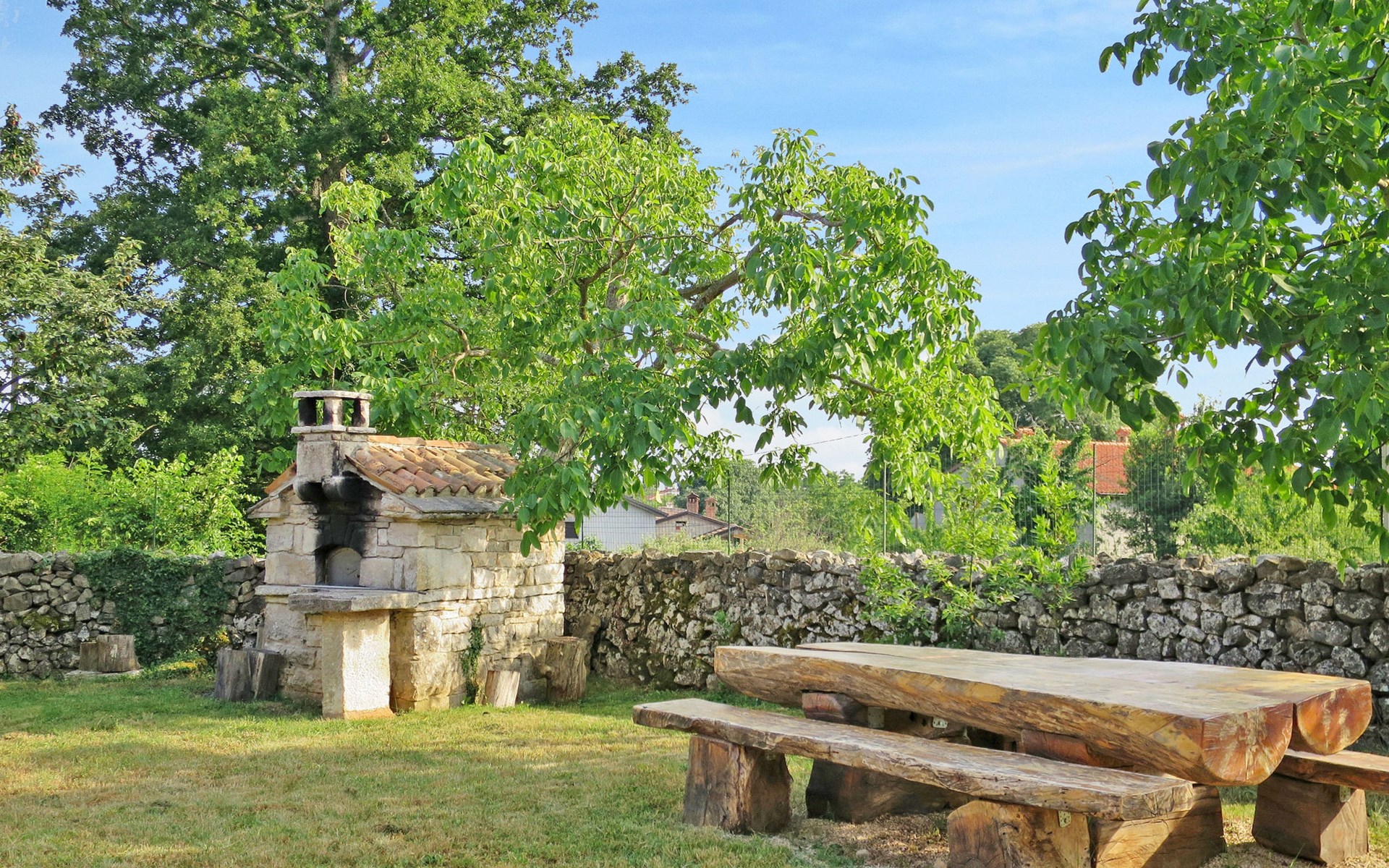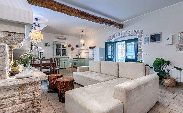 Single-family house "Marija", 3 storeys. In the hamlet Domijanići 5 km from the centre of Žminj, 25 km from the centre of Rovinj, 25 km from the sea. Private: property 5'000 m2, trees, meadow, swimming pool angular (8 x 4 m, depth 140 cm, seasonal availability: 30.Apr. - 01.Oct.) with internal staircase. Outdoor shower, table tennis, garden furniture, barbecue (swing). In the house: internet access, washing machine. Parking (for 5 cars) on the premises. Shop 5 km, restaurant 5 km, bus stop 3.1 km, rocky beach 25 km.