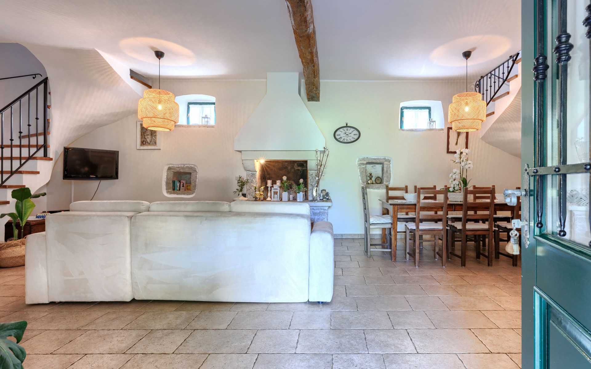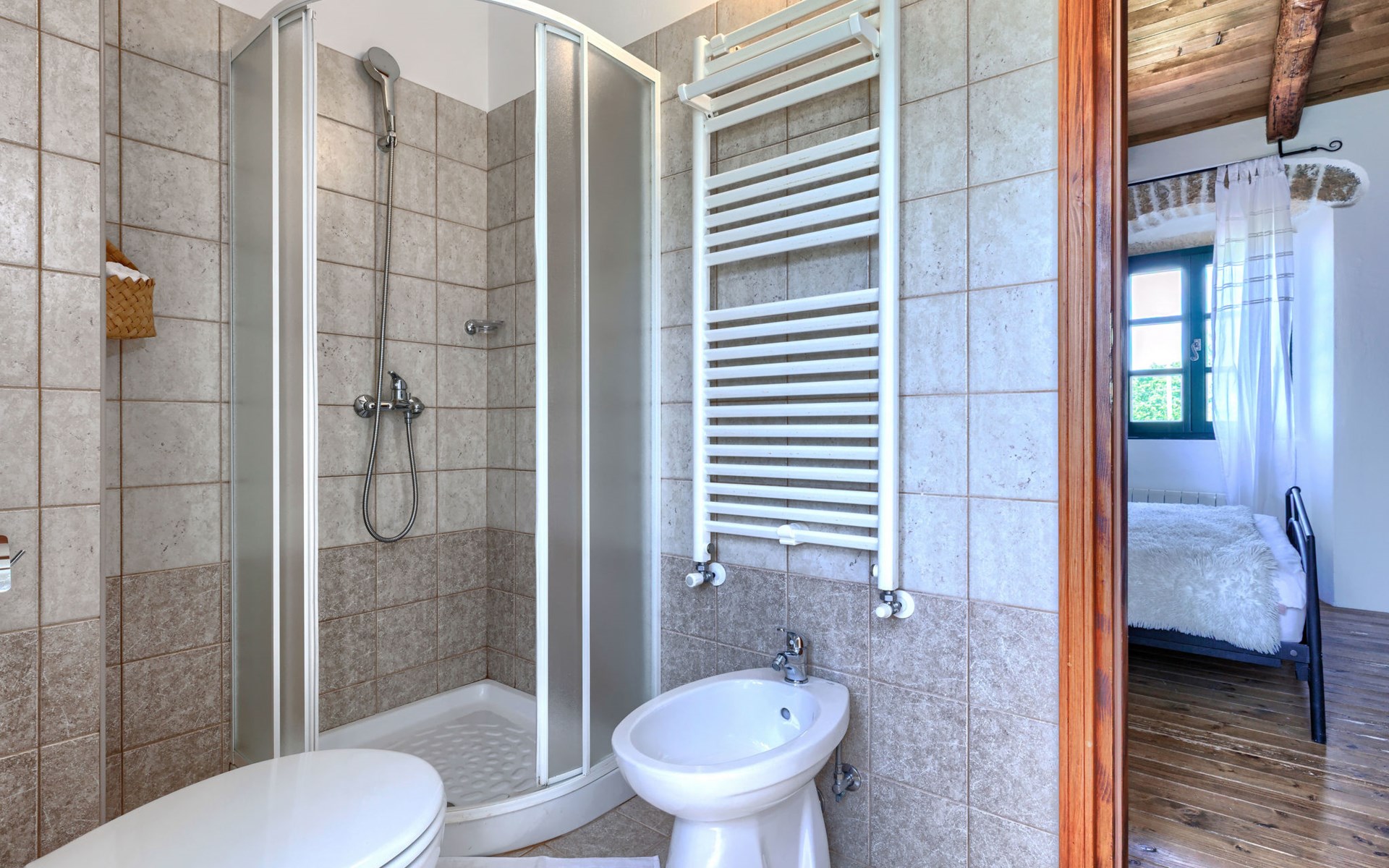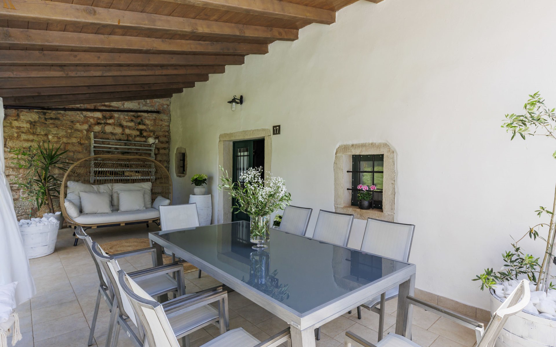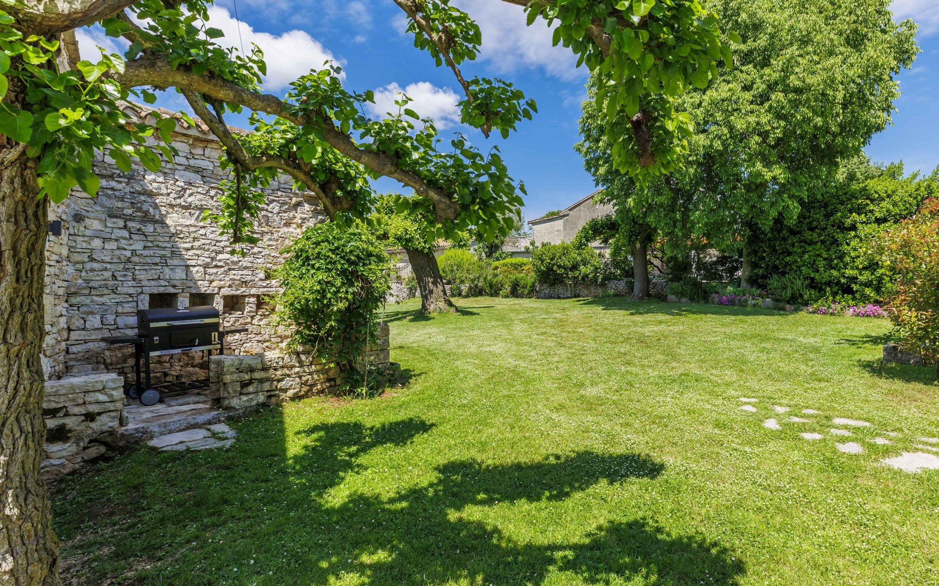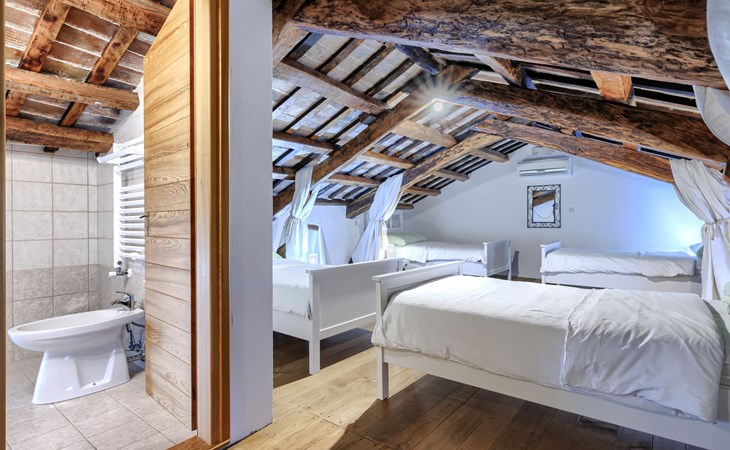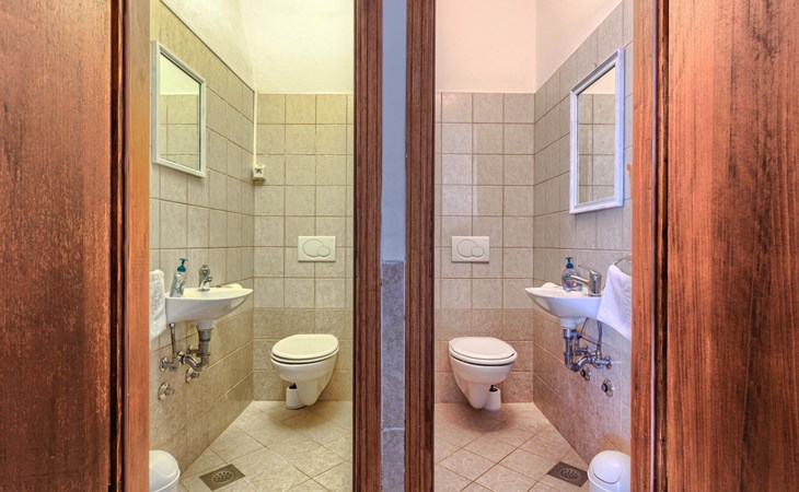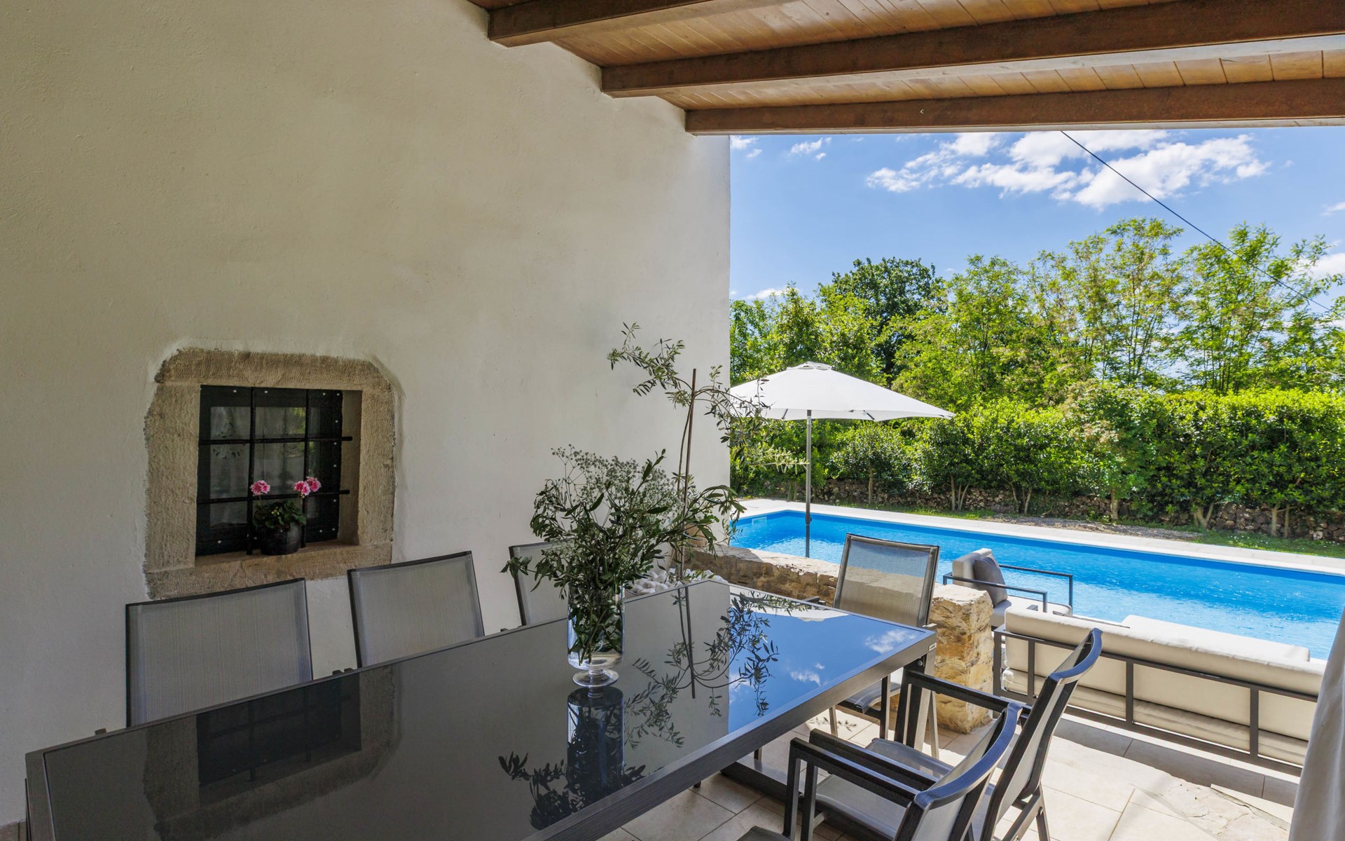 Single-family house "Marija", 3 storeys. In the hamlet Domijanići 5 km from the centre of Žminj, 25 km from the centre of Rovinj, 25 km from the sea. Private: property 5'000 m2, trees, meadow, swimming pool angular (8 x 4 m, depth 140 cm, seasonal availability: 30.Apr. - 01.Oct.) with internal staircase. Outdoor shower, table tennis, garden furniture, barbecue (swing). In the house: internet access, washing machine. Parking (for 5 cars) on the premises. Shop 5 km, restaurant 5 km, bus stop 3.1 km, rocky beach 25 km.