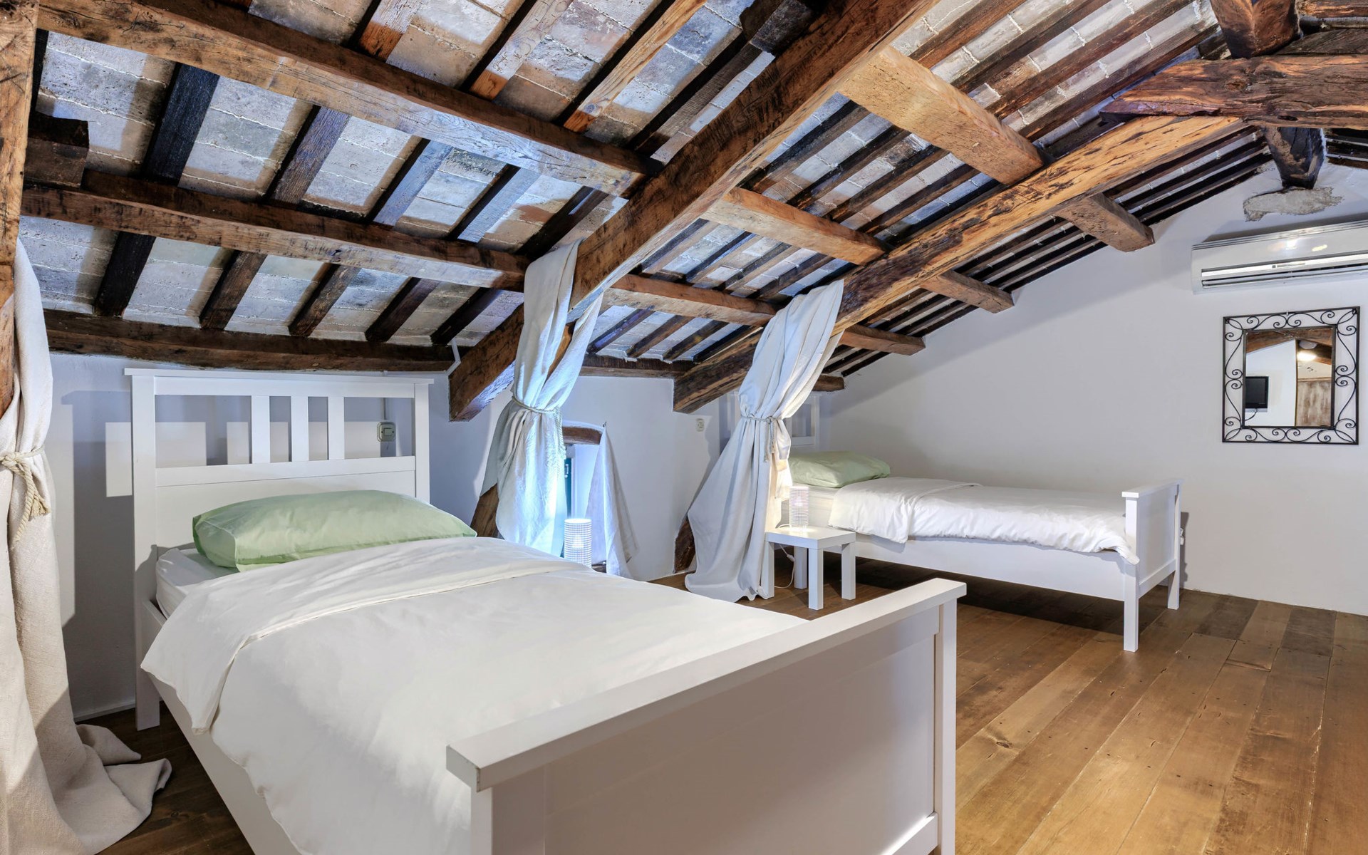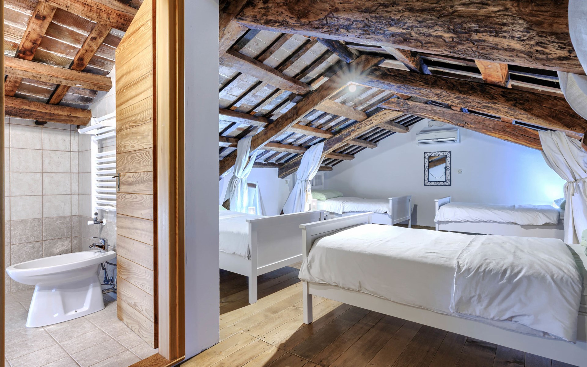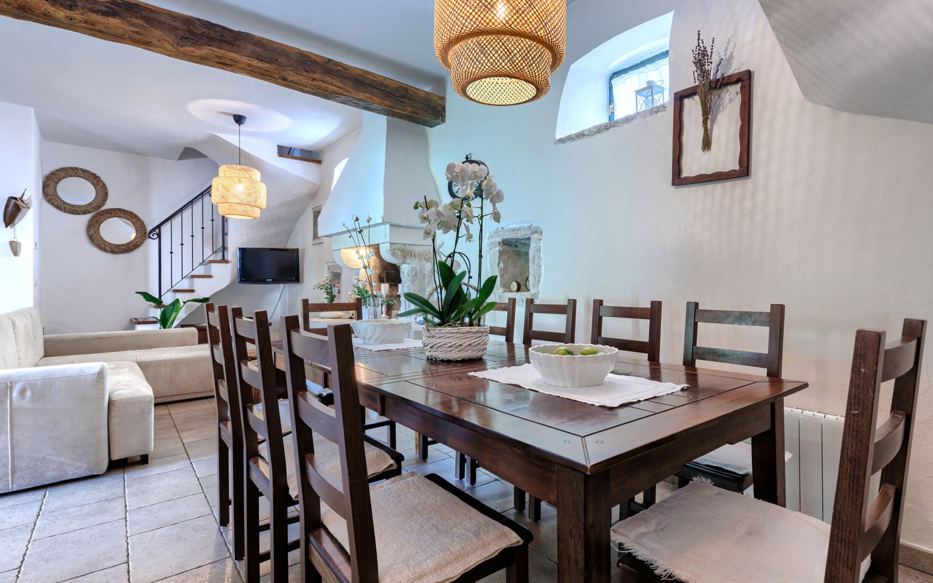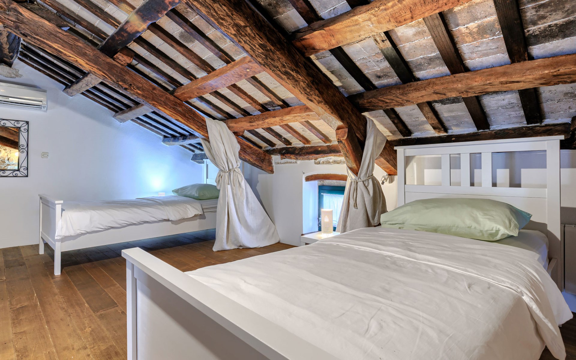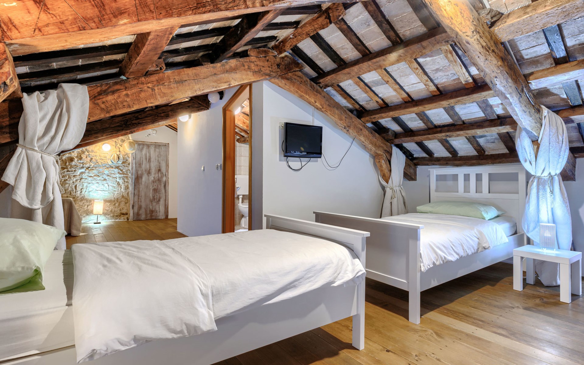 Single-family house "Marija", 3 storeys. In the hamlet Domijanići 5 km from the centre of Žminj, 25 km from the centre of Rovinj, 25 km from the sea. Private: property 5'000 m2, trees, meadow, swimming pool angular (8 x 4 m, depth 140 cm, seasonal availability: 30.Apr. - 01.Oct.) with internal staircase. Outdoor shower, table tennis, garden furniture, barbecue (swing). In the house: internet access, washing machine. Parking (for 5 cars) on the premises. Shop 5 km, restaurant 5 km, bus stop 3.1 km, rocky beach 25 km.