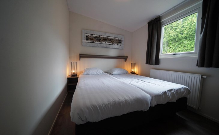 Pavilion 4 is a detached, single-storey chalet that can accommodate 4 people. In the compact holiday home you will find everything you need. The cosy living room has a sitting area with television and a separate dining area. The open kitchen is equipped with a dishwasher, microwave and coffeemaker. There are 2 bedrooms, both with 2 single beds. There is also a bathroom with a shower and toilet. Outside there is a terrace with garden furniture. You can park 1 car at this chalet and there is free Wi-Fi available.