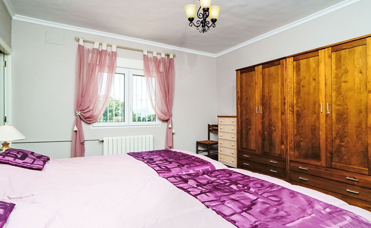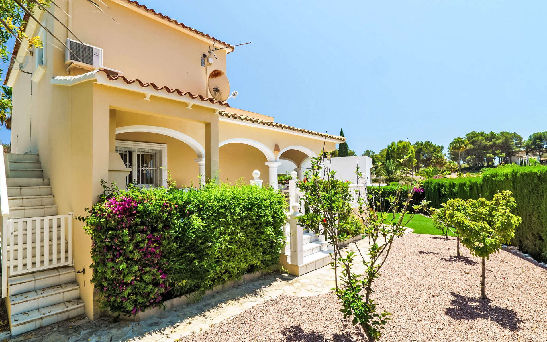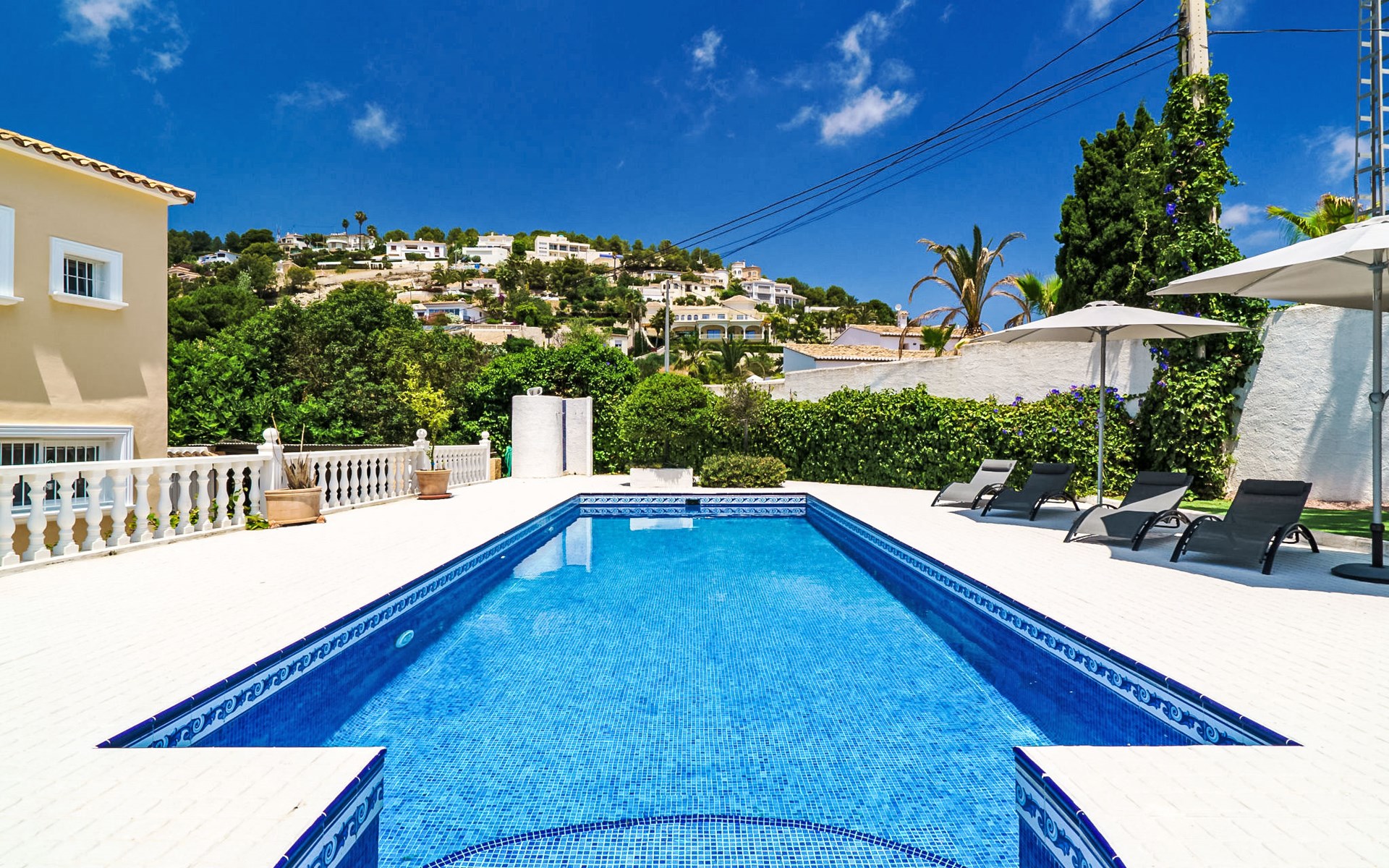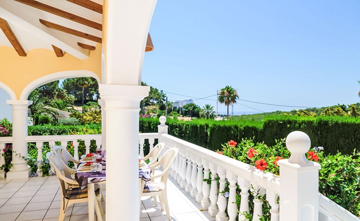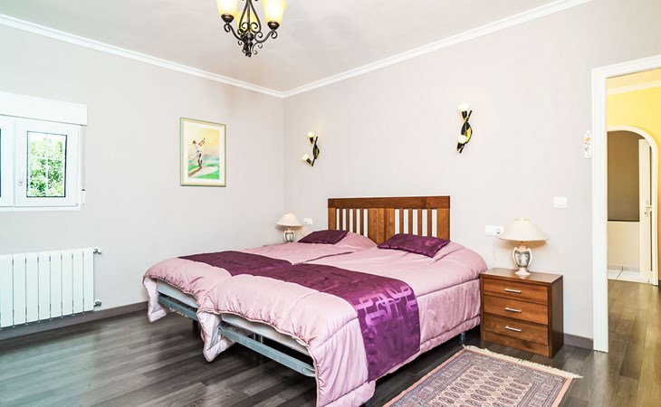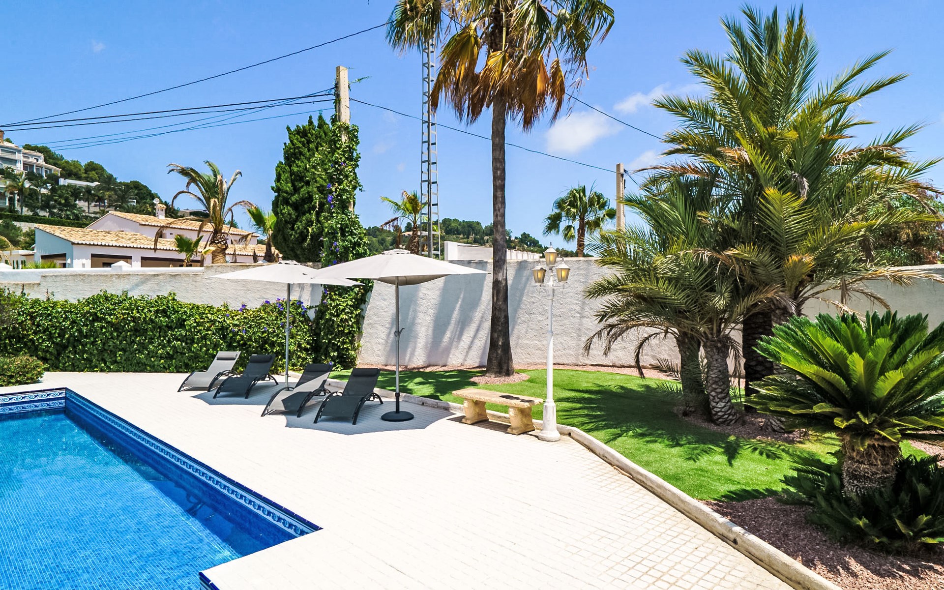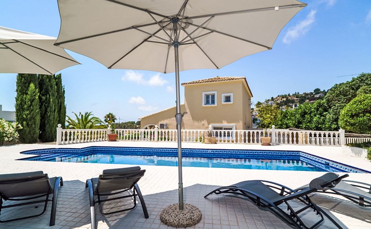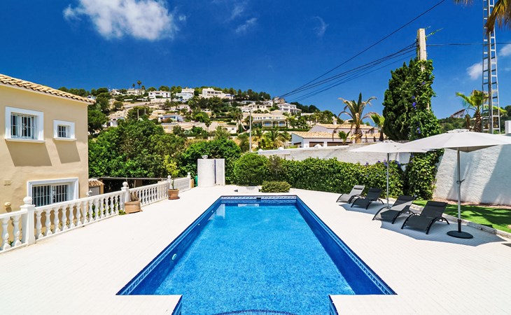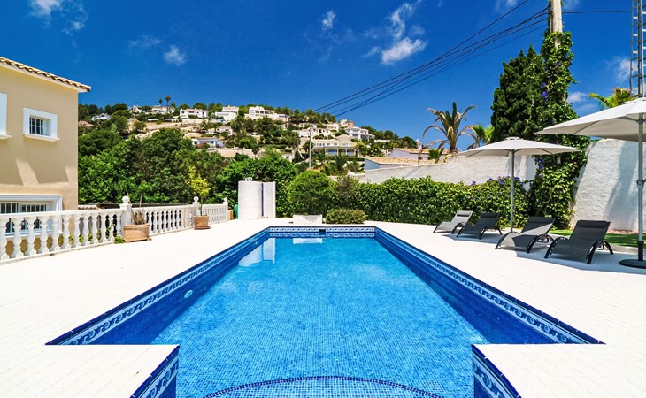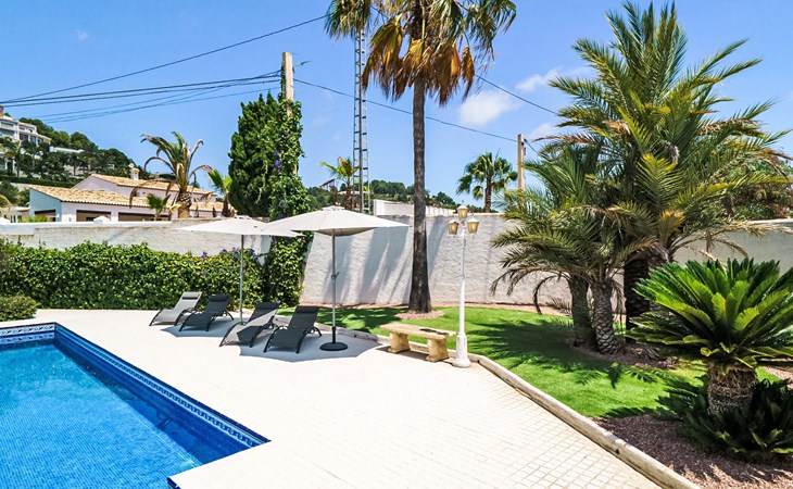 Los Bancales Benissa: Very beautiful, cosy, comfortable house "Alina", 2 storeys. In the district of Benissa 8 km from the centre of Moraira, 8 km from the centre of Calpe, in a secluded, quiet, sunny position, 1.5 km from the sea, 1.5 km from the beach, in a cul-de-sac. Private: large, beautiful, well-kept garden 910 m2 (fenced) with lawn and trees, swimming pool angular (4 x 10 m, depth 140 - 220 cm, seasonal availability: 01.Jan. - 31.Dec.) with internal staircase. Outdoor shower, terrace, garden furniture. In the house: internet access, WiFi, washing machine. Roofed, parking (for 3 cars) on the premises. Carport. Supermarket 1.5 km, restaurant 1.5 km, bus stop 7 km, sandy beach 5 km, swimming bay 1.5 km. Golf course (9 hole) 8 km. Please note: car recommended. Suitable for families, suitable for seniors. The owner does not accept any youth groups.