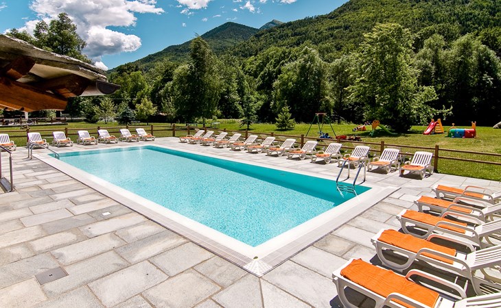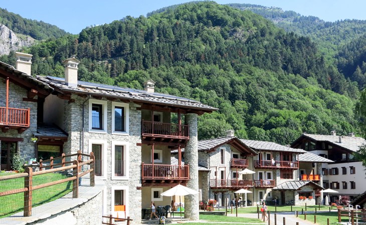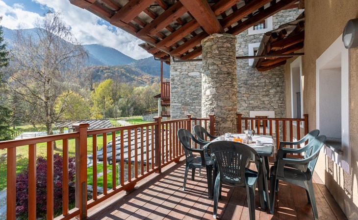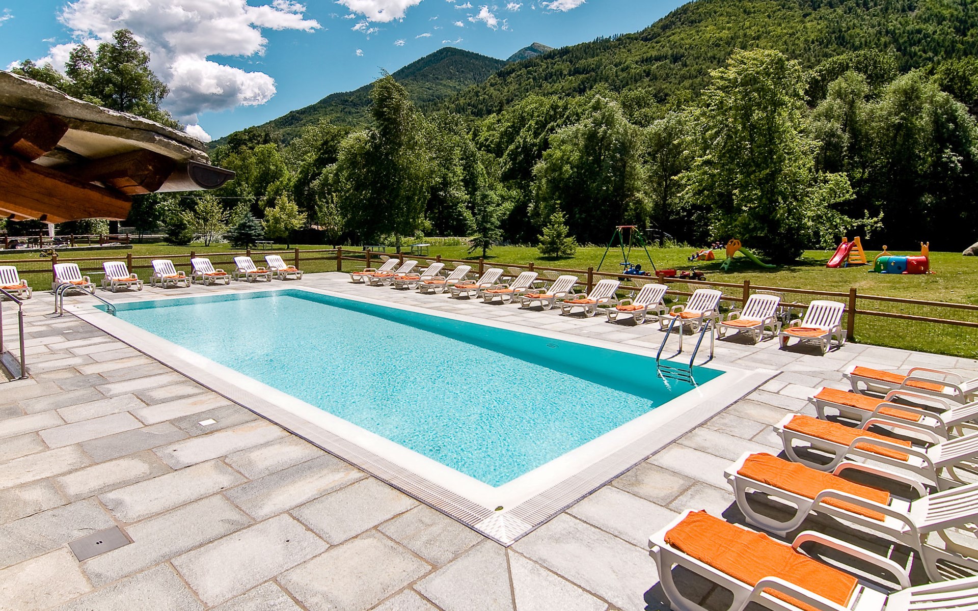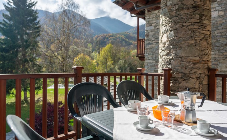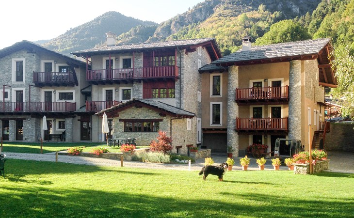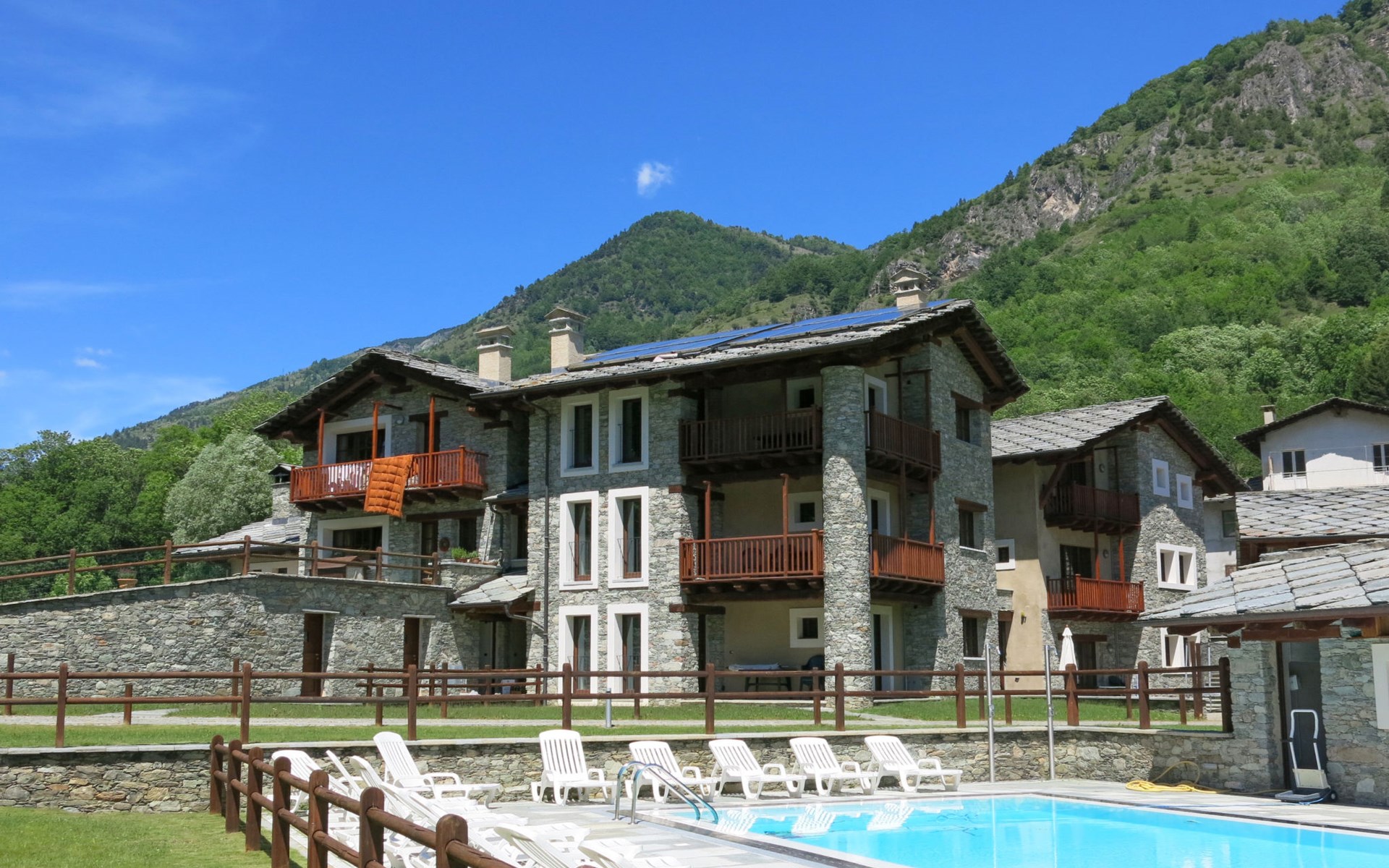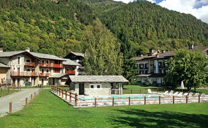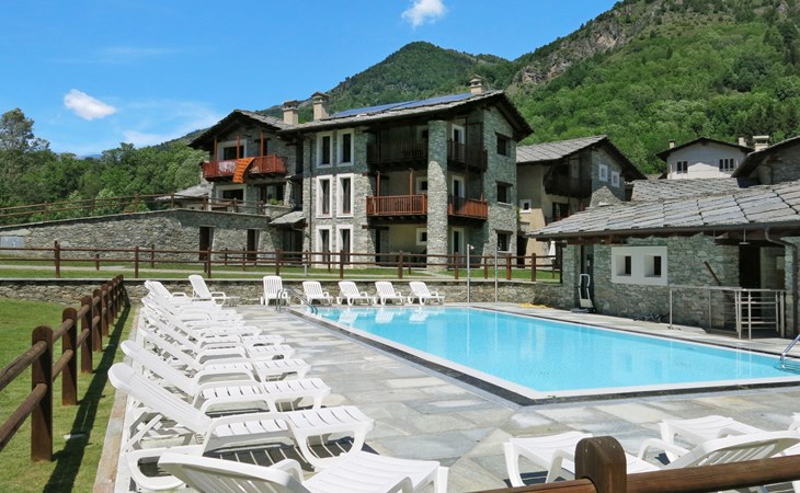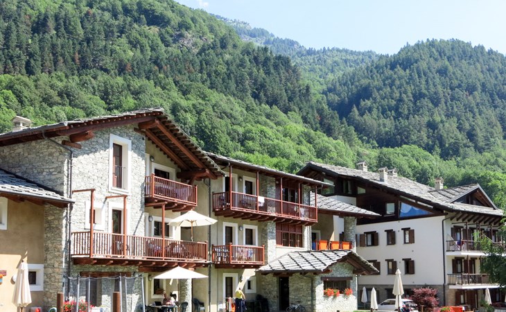Residence "Torinetto", 1'000 m a.s.l., 4 storeys. 18 apartments in the residence. In the district of Calchesio 1 km from the centre of Sampeyre, on the outskirts, 12 km from the centre of Casteldelfino, 35 km from the centre of Saluzzo, 50 m from the river. For shared use: park 5'000 m2, large, beautiful, well-kept garden (not fenced) with plants and trees, swimming pool fenced (12 x 5 m, depth 100 - 170 cm, seasonal availability: 01.Jun. - 30.Sep., extra). Shower/WC in the pool area, outdoor shower, boccia, terrace, garden furniture, barbecue, children's playground. In the complex: reception, restaurant, bar, lounge, WiFi, fitness room, storage room for bicycles, washing machine (for shared use, extra), heating available only from 15.Oct. - 15.Apr.. Breakfast and half board possible (extra). Parking. Supermarket 1.5 km, bus stop 2 km, railway station "Costigliole di Saluzzo" 35 km. The facilities for shared use are in the main building with another 40 hotel rooms. The pool is in approx. 50 m distance to «La Borgata» and approx. 150m from «Casa del Ponte». Wi-fi only at the reception.