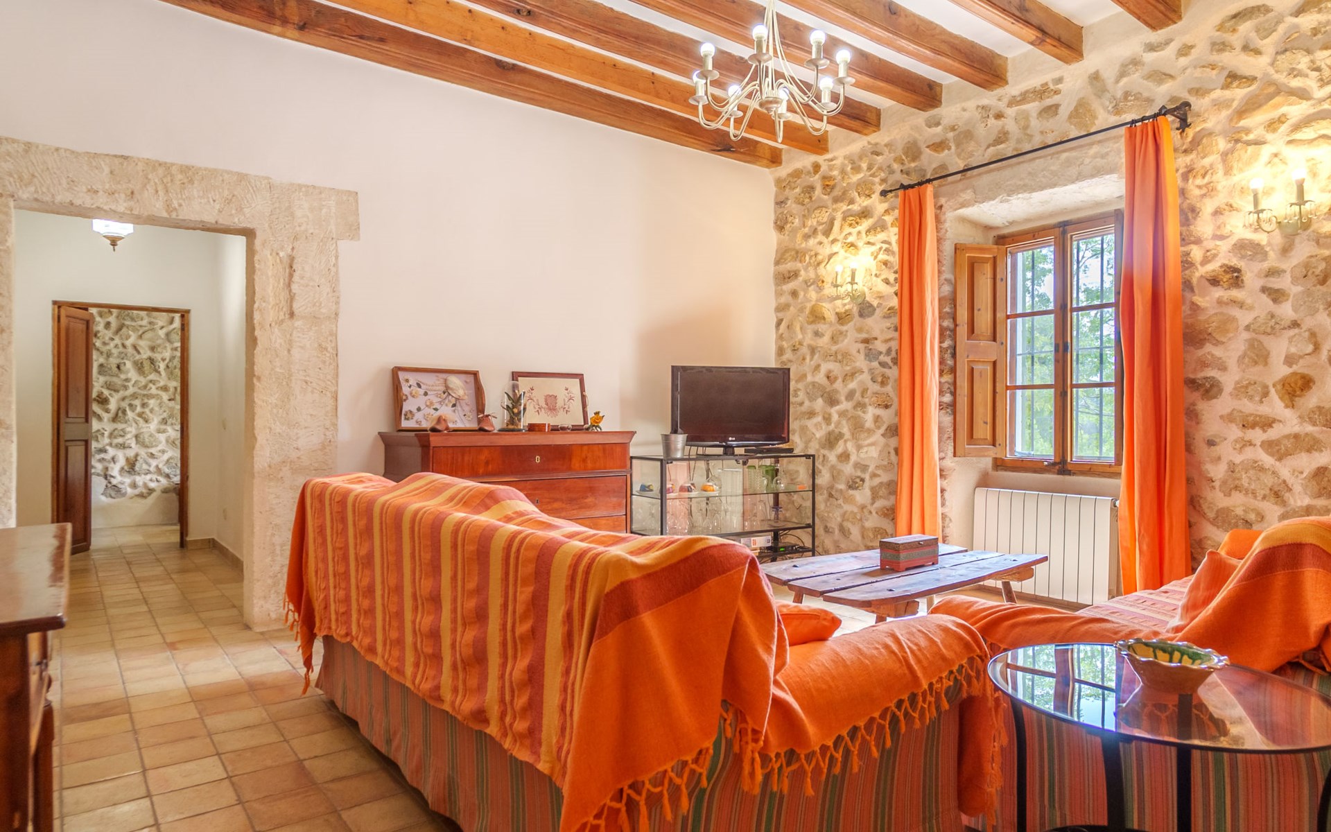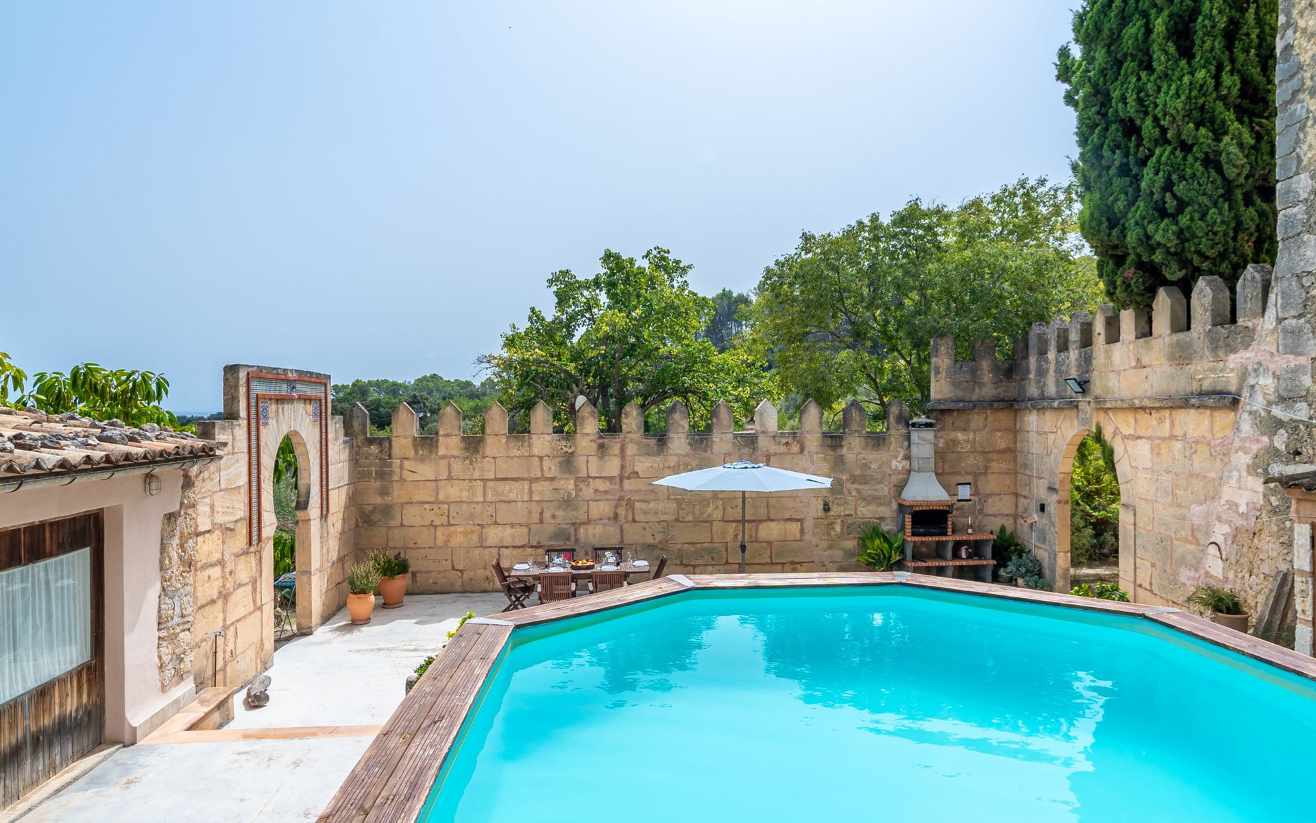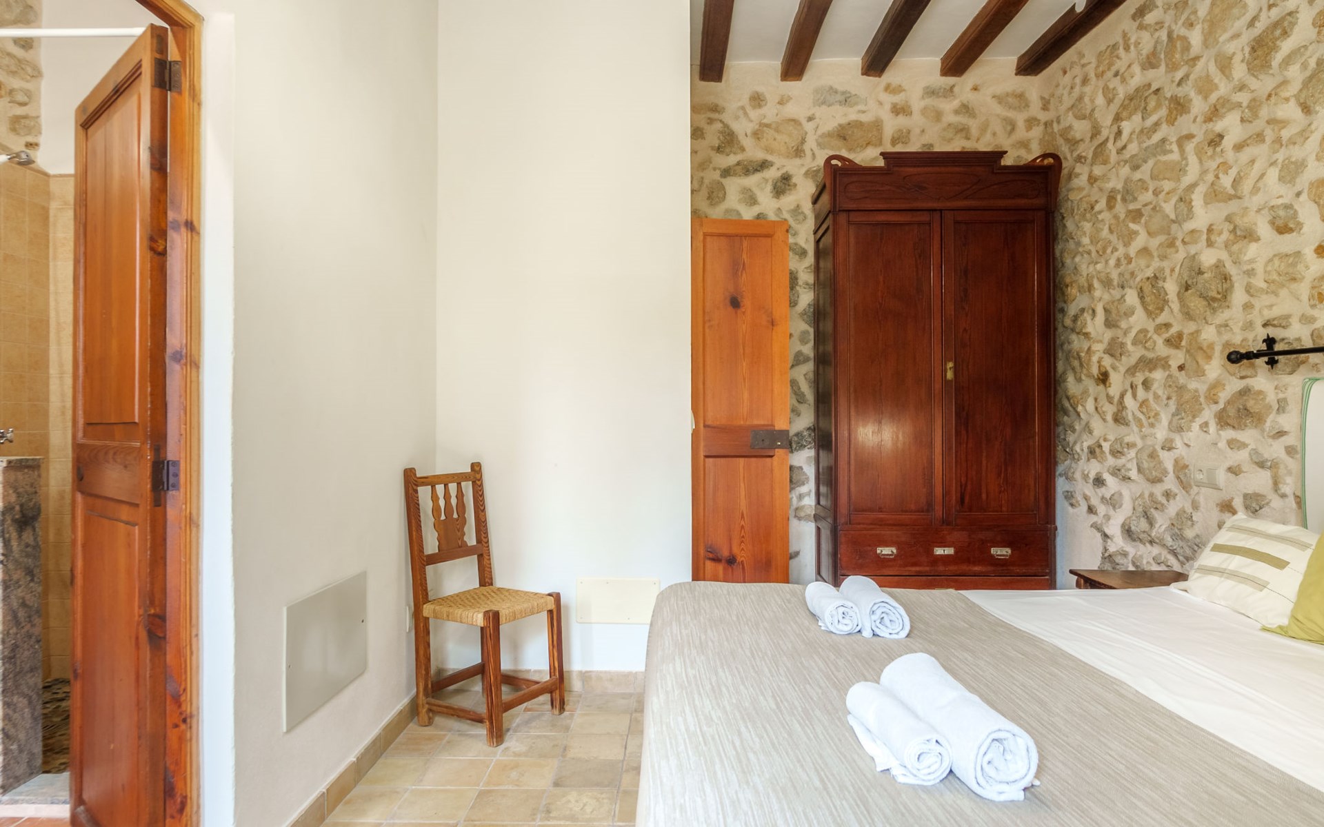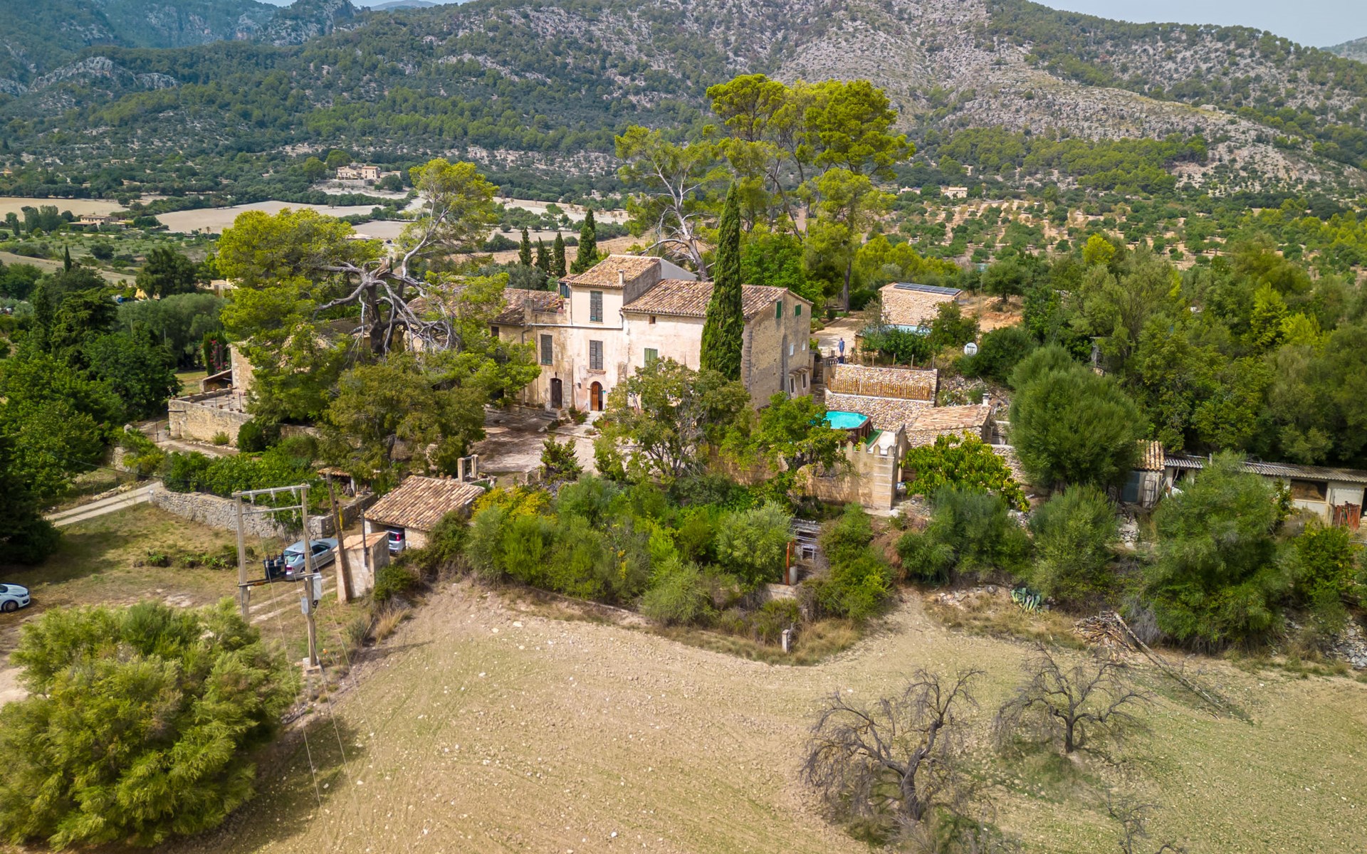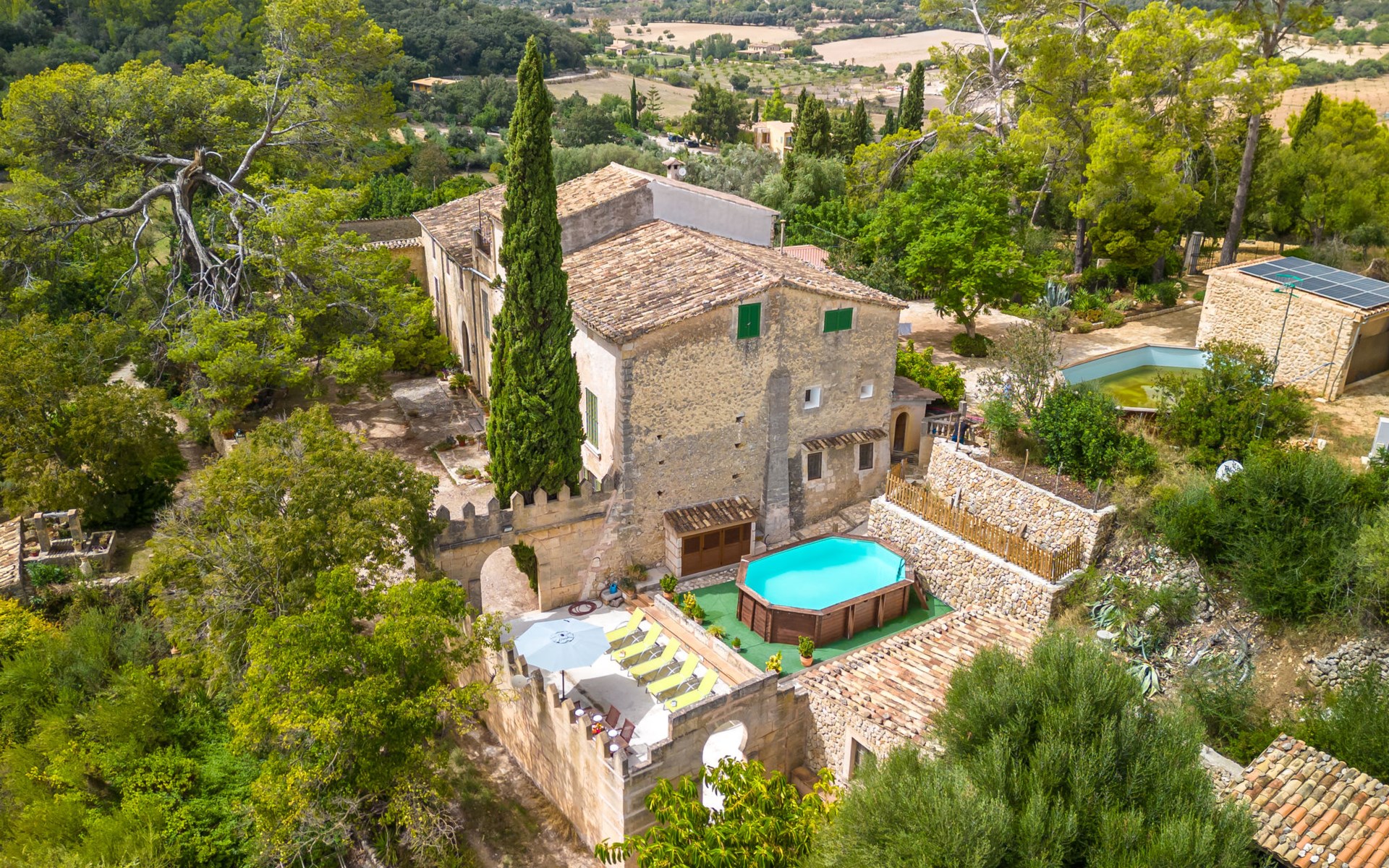 Beautiful, cosy apartment block "Sa Bisbal", renovated, surrounded by trees and fields. Outside the resort, 1.5 km from the centre of Moscari, in a quiet, sunny position, 24 km from the sea, in the countryside. Private: swimming pool (above ground) (6 x 4 m, depth 150 - 150 cm, seasonal availability: 01.Apr. - 25.Nov.). Patio, garden furniture, barbecue, pool maintenance by the owner/gardener. In the house: central heating system, heating to be paid on the spot. 700 m long bumpy, narrow motor access (mountain road). Parking at the house on the premises. Grocery 1.6 km, supermarket 7 km, restaurant 3.8 km, bar 1.5 km, bicycle rental 3.8 km, 21 minute walk to the centre, bus stop 1.6 km, sandy beach "Port d'Alcúdia" 23.4 km. Sports harbour 25 km, golf course (18 hole) 19 km, walking paths from the house 500 m, cycle lane. Nearby attractions: Moscari,Caimari,Selva,Campanet,Pollença, Ciudad de Inca 8 km, Santuari de Lluc 15 km, Port de Pollença 30 km, Palma City 42 km, Mallorca Fashion Outlet & Cinemas 28 km. Hiking paths: Serra de Tramuntana, Santa Magdalena Inca, Puig de Maria Pollença. Please note: car recommended. Object suitable for 6 adults. The owner does not accept any youth groups. Animals in the neighbourhood. Airfield 43 km from the property. Neighbourhood highly sensitive to noise. Quietness and good behaviour expected.