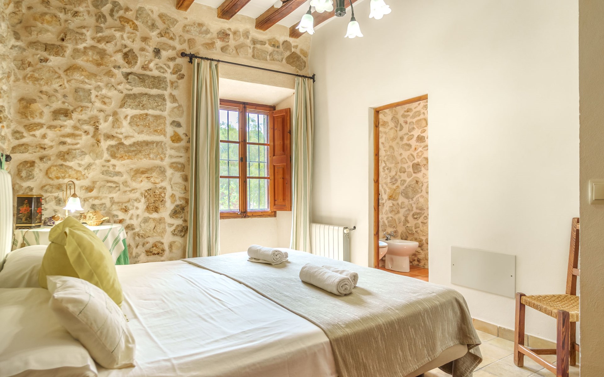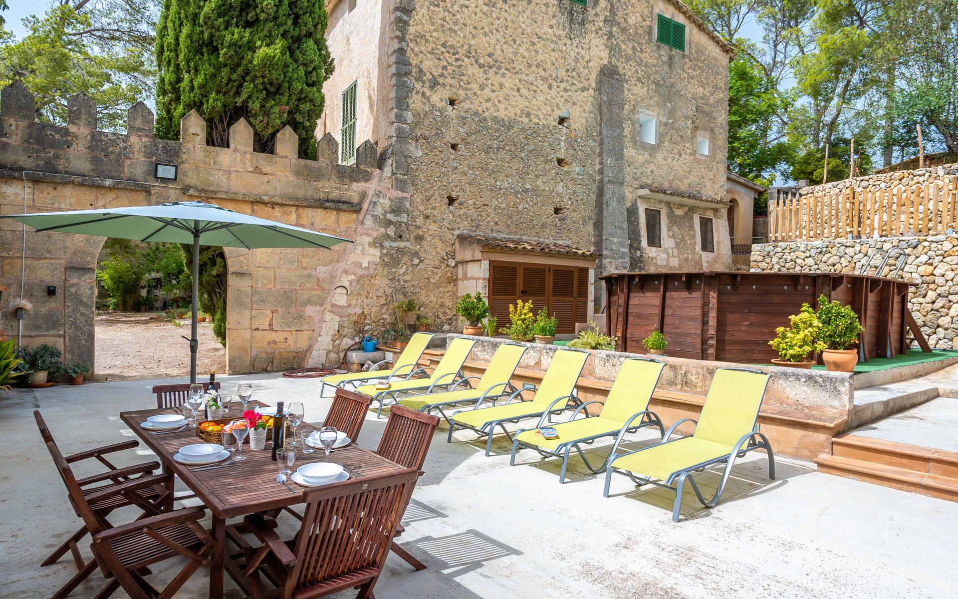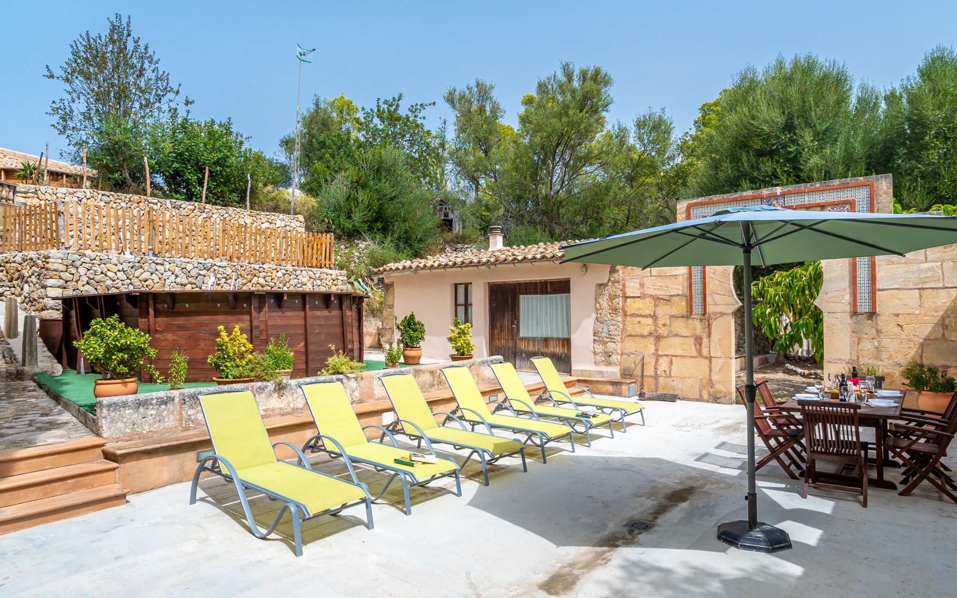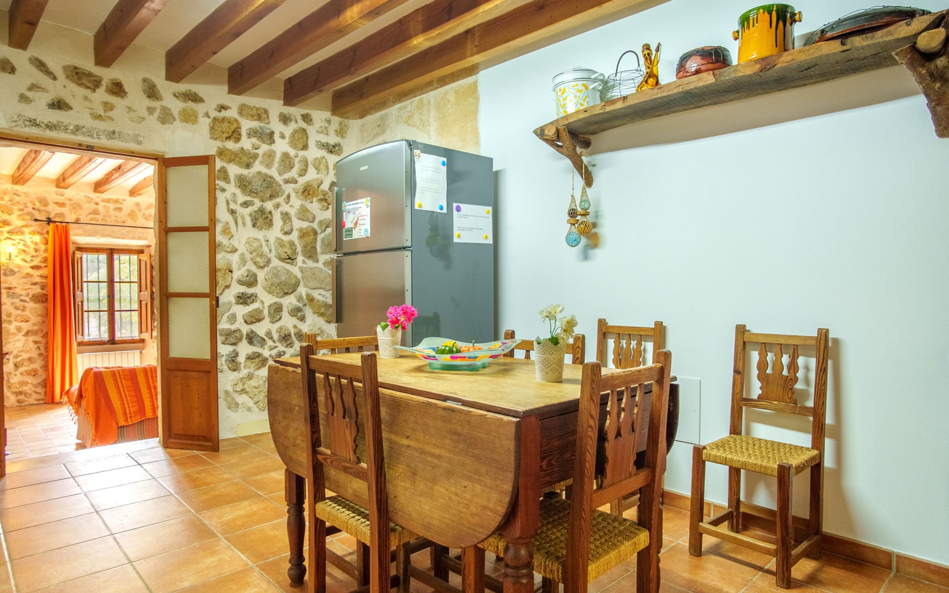 Beautiful, cosy apartment block "Sa Bisbal", renovated, surrounded by trees and fields. Outside the resort, 1.5 km from the centre of Moscari, in a quiet, sunny position, 24 km from the sea, in the countryside. Private: swimming pool (above ground) (6 x 4 m, depth 150 - 150 cm, seasonal availability: 01.Apr. - 25.Nov.). Patio, garden furniture, barbecue, pool maintenance by the owner/gardener. In the house: central heating system, heating to be paid on the spot. 700 m long bumpy, narrow motor access (mountain road). Parking at the house on the premises. Grocery 1.6 km, supermarket 7 km, restaurant 3.8 km, bar 1.5 km, bicycle rental 3.8 km, 21 minute walk to the centre, bus stop 1.6 km, sandy beach "Port d'Alcúdia" 23.4 km. Sports harbour 25 km, golf course (18 hole) 19 km, walking paths from the house 500 m, cycle lane. Nearby attractions: Moscari,Caimari,Selva,Campanet,Pollença, Ciudad de Inca 8 km, Santuari de Lluc 15 km, Port de Pollença 30 km, Palma City 42 km, Mallorca Fashion Outlet & Cinemas 28 km. Hiking paths: Serra de Tramuntana, Santa Magdalena Inca, Puig de Maria Pollença. Please note: car recommended. Object suitable for 6 adults. The owner does not accept any youth groups. Animals in the neighbourhood. Airfield 43 km from the property. Neighbourhood highly sensitive to noise. Quietness and good behaviour expected.