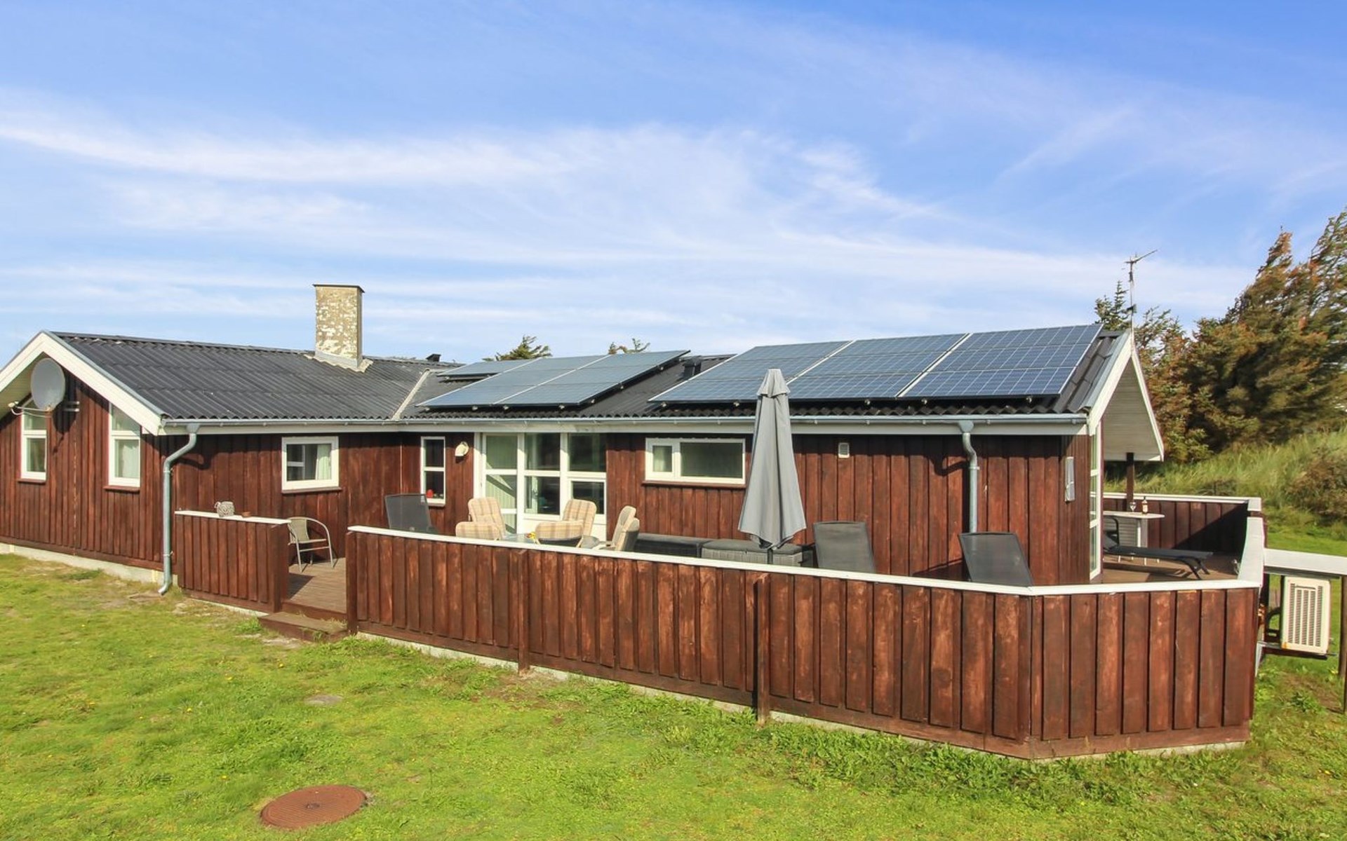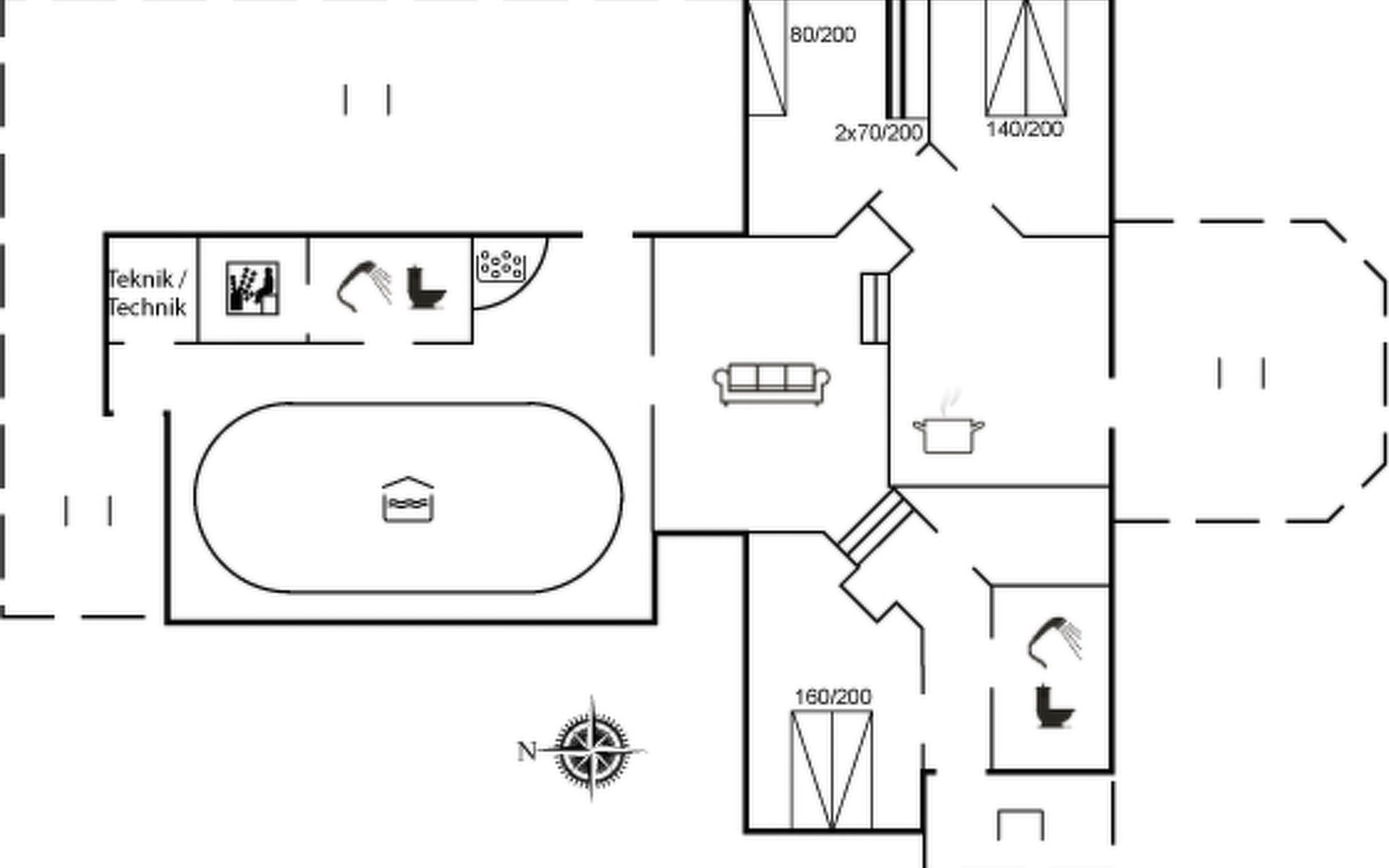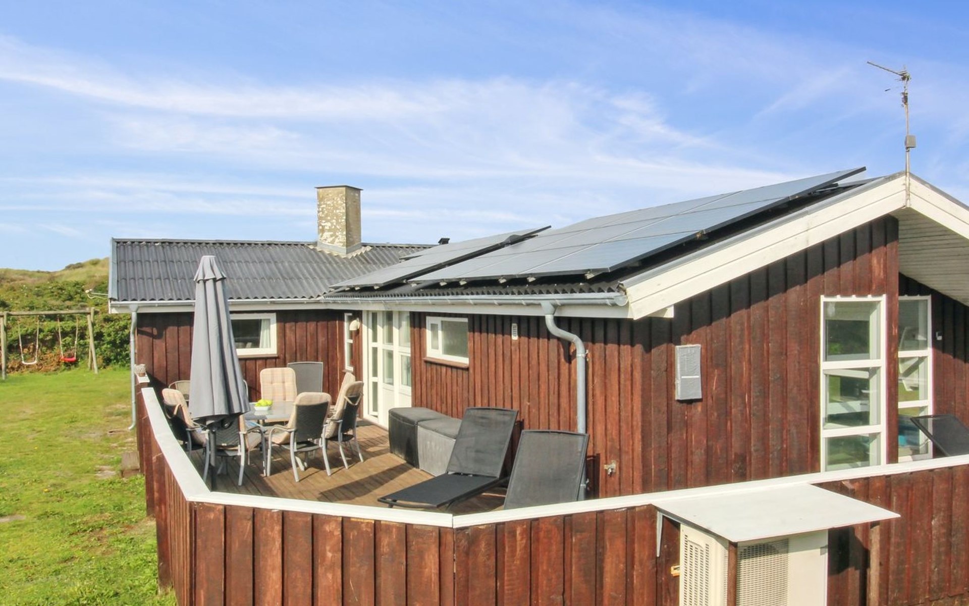 Single-family house, built in 1988. 250 m from the sea. Private: property 2'500 m2, indoor pool (3 x 6 m, 18 m2, depth 110 - 110 cm). Terrace (55 m2), children's playground (swing). In the house: sauna, washing machine, tumble dryer. Parking at the house. Grocery 1 km. The owner does not accept any youth groups.
