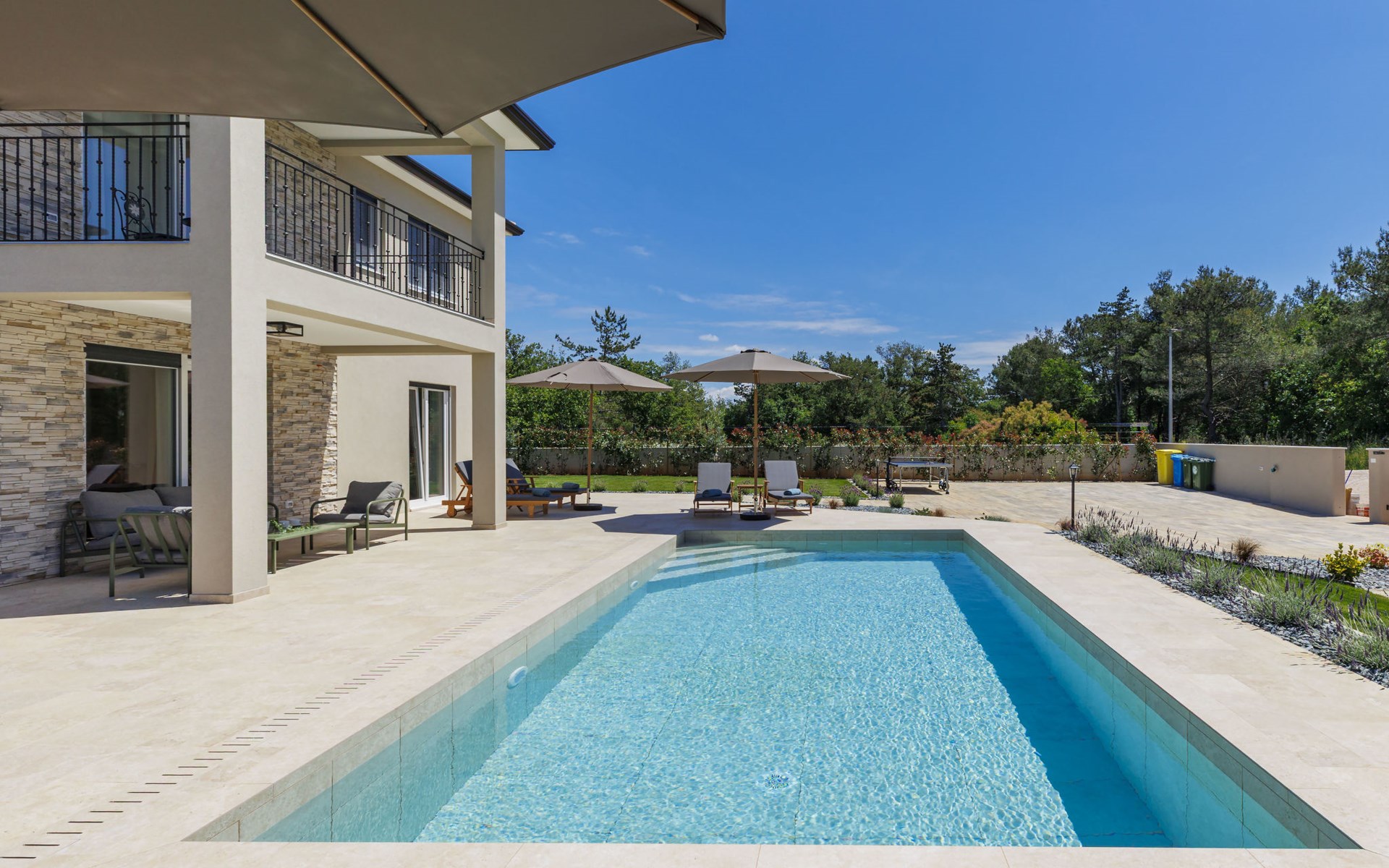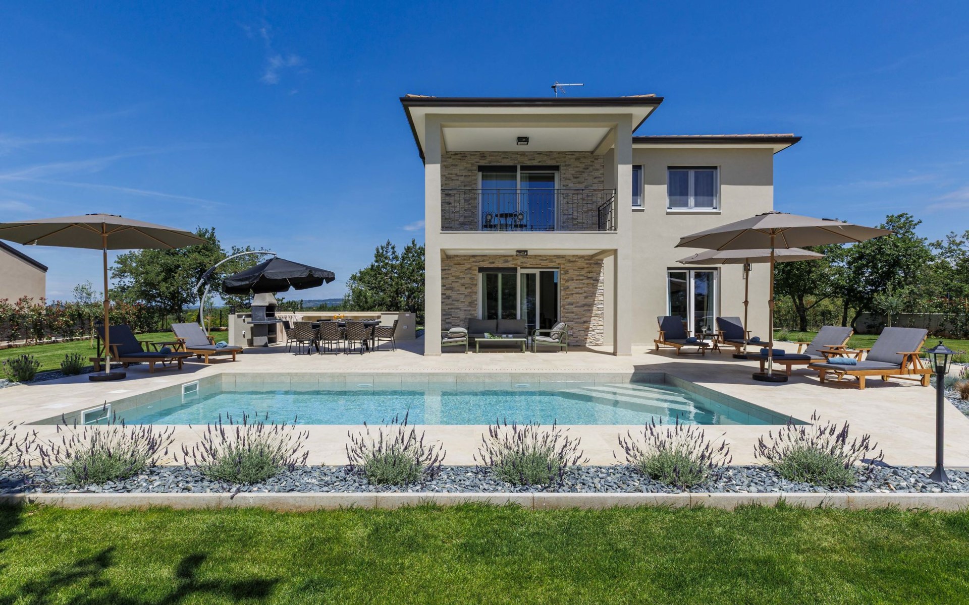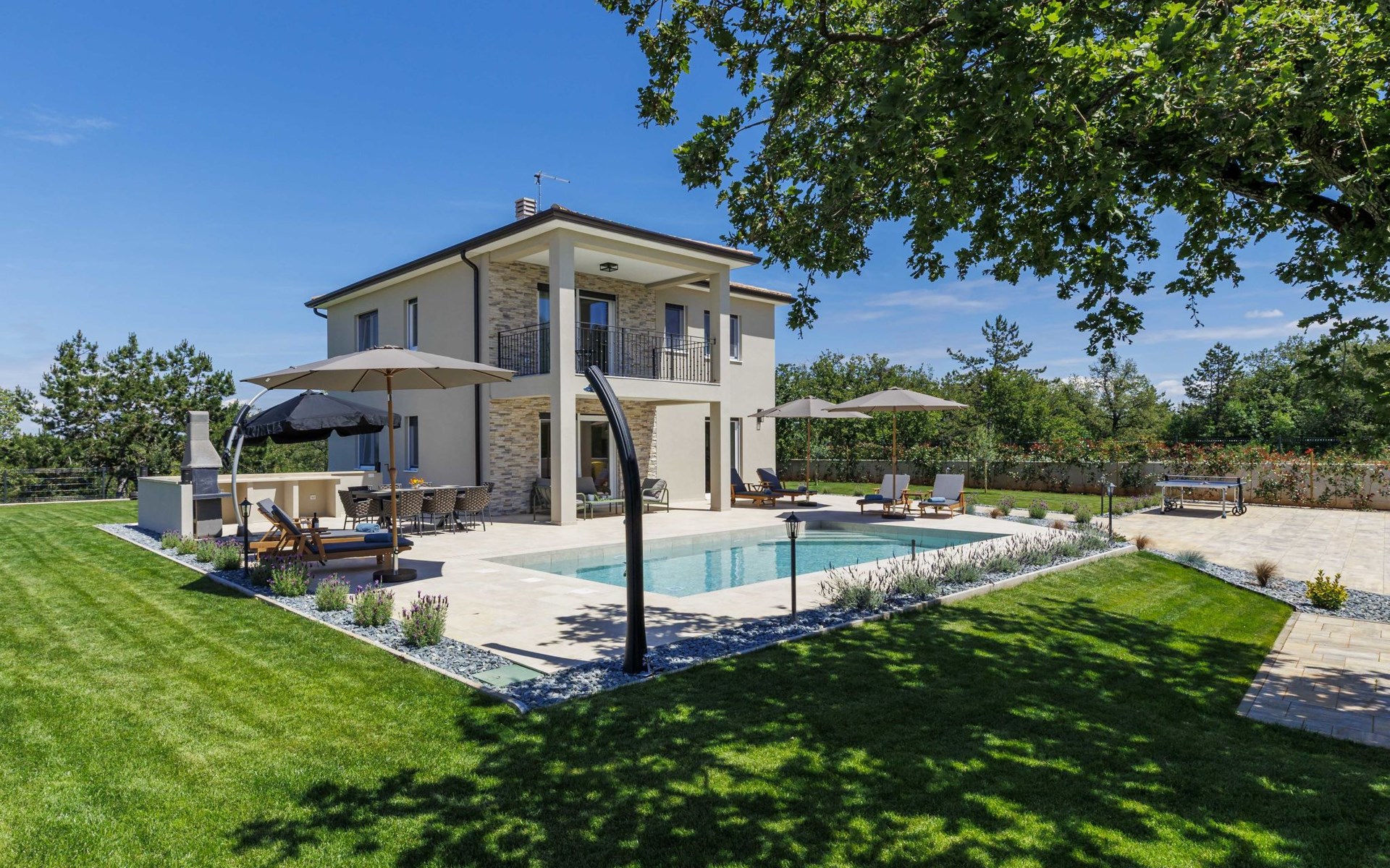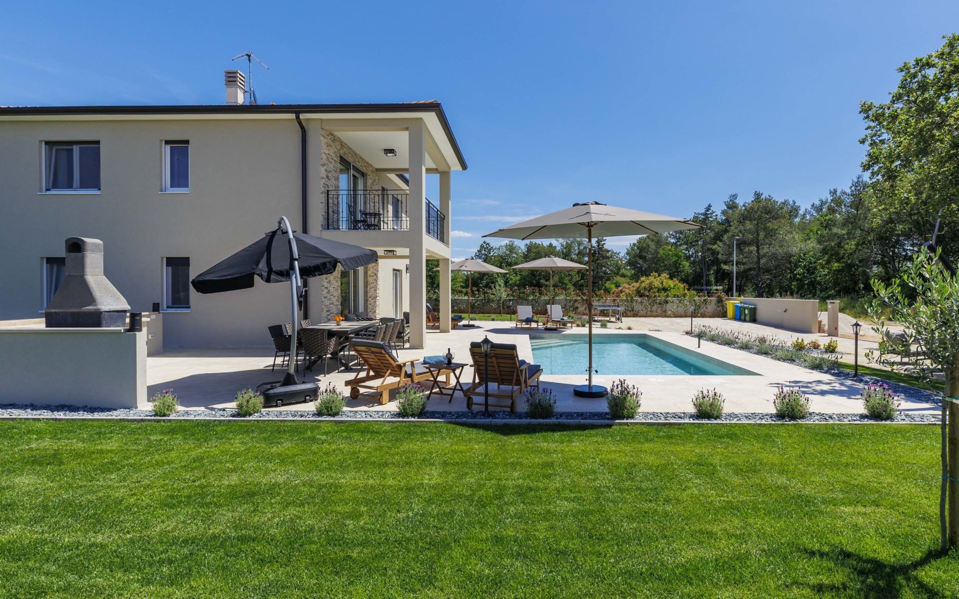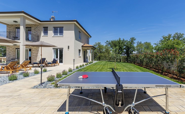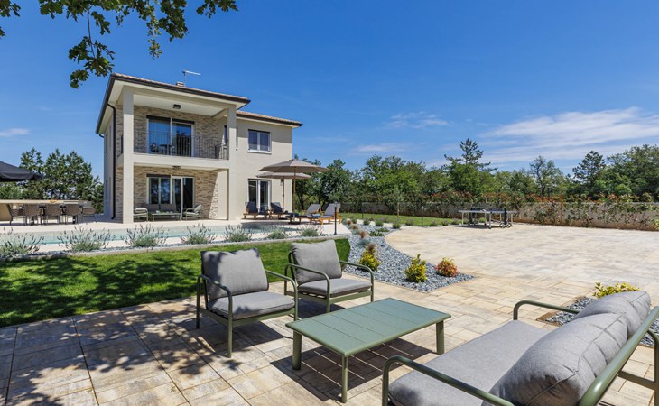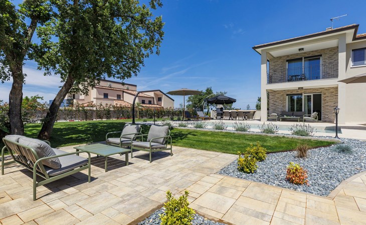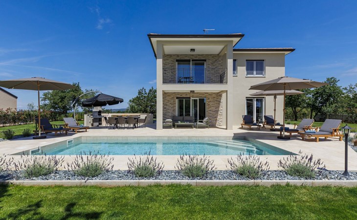 Modern, beautiful villa "Tramonto", 2 storeys. In the hamlet Gamboci 4 km from the centre of Buje, 12.5 km from the centre of Umag, 16.5 km from the centre of Novigrad, in a quiet position, 12 km from the sea, in a cul-de-sac. Private: property 1'200 m2 (fenced) with wildlife garden, swimming pool angular, heated (8 x 4 m, depth 150 cm, seasonal availability: 01.Apr. - 01.Nov.) with internal staircase. Outdoor shower, terrace (10 m2), garden furniture, barbecue. In the house: internet access, washing machine. Motor access (300 m via unmade road). Parking (for 2 cars) at the house on the premises. Shop 3.5 km, supermarket 3.5 km, restaurant 2.5 km, café 4 km, bus stop 4.5 km. Tennis 4.5 km, walking paths from the house 50 m, cycle lane 100 m. Nearby attractions: Winery 10 km. Please note: airfield 17 km from the property. Swimming pool heated (extra). It is necessary to announce 7 days in advance if the pool heating is required.