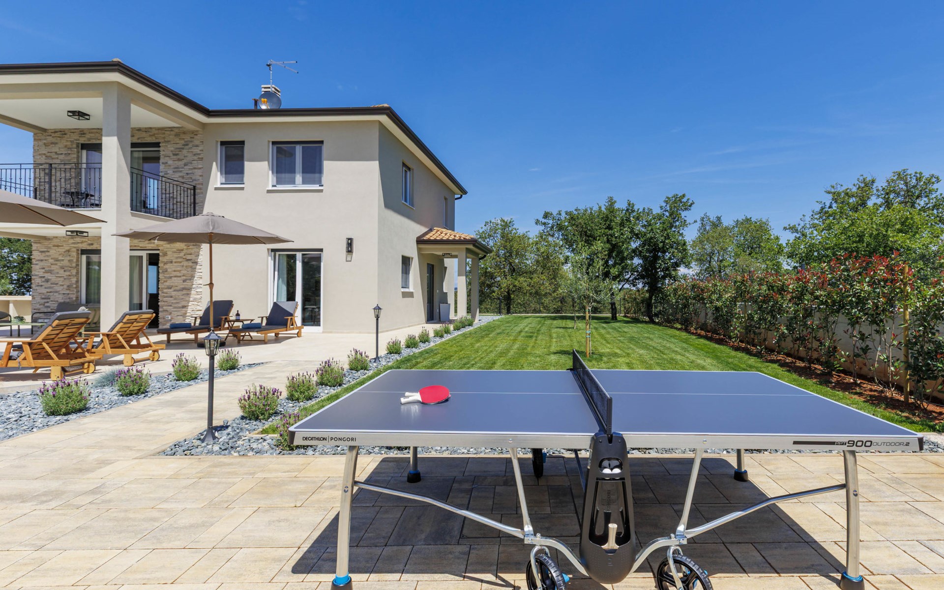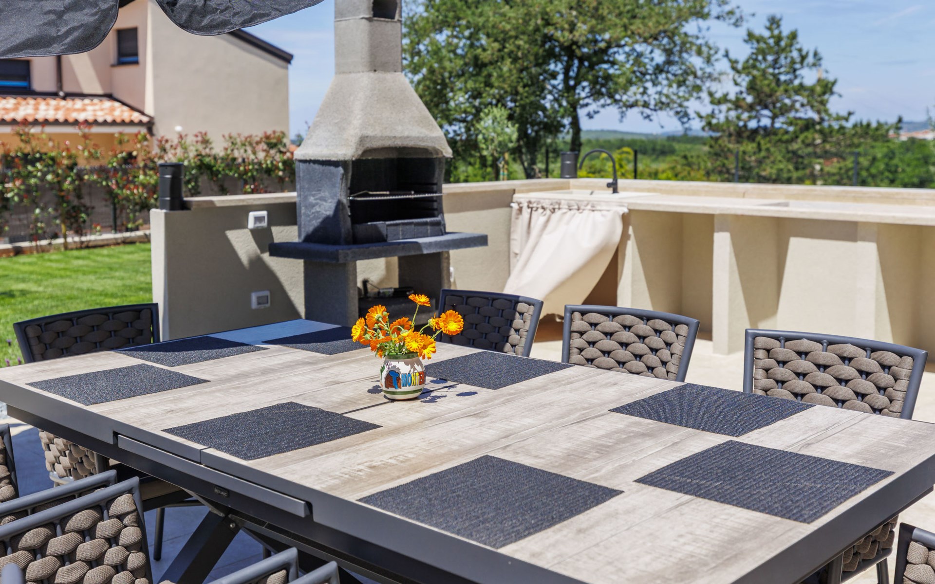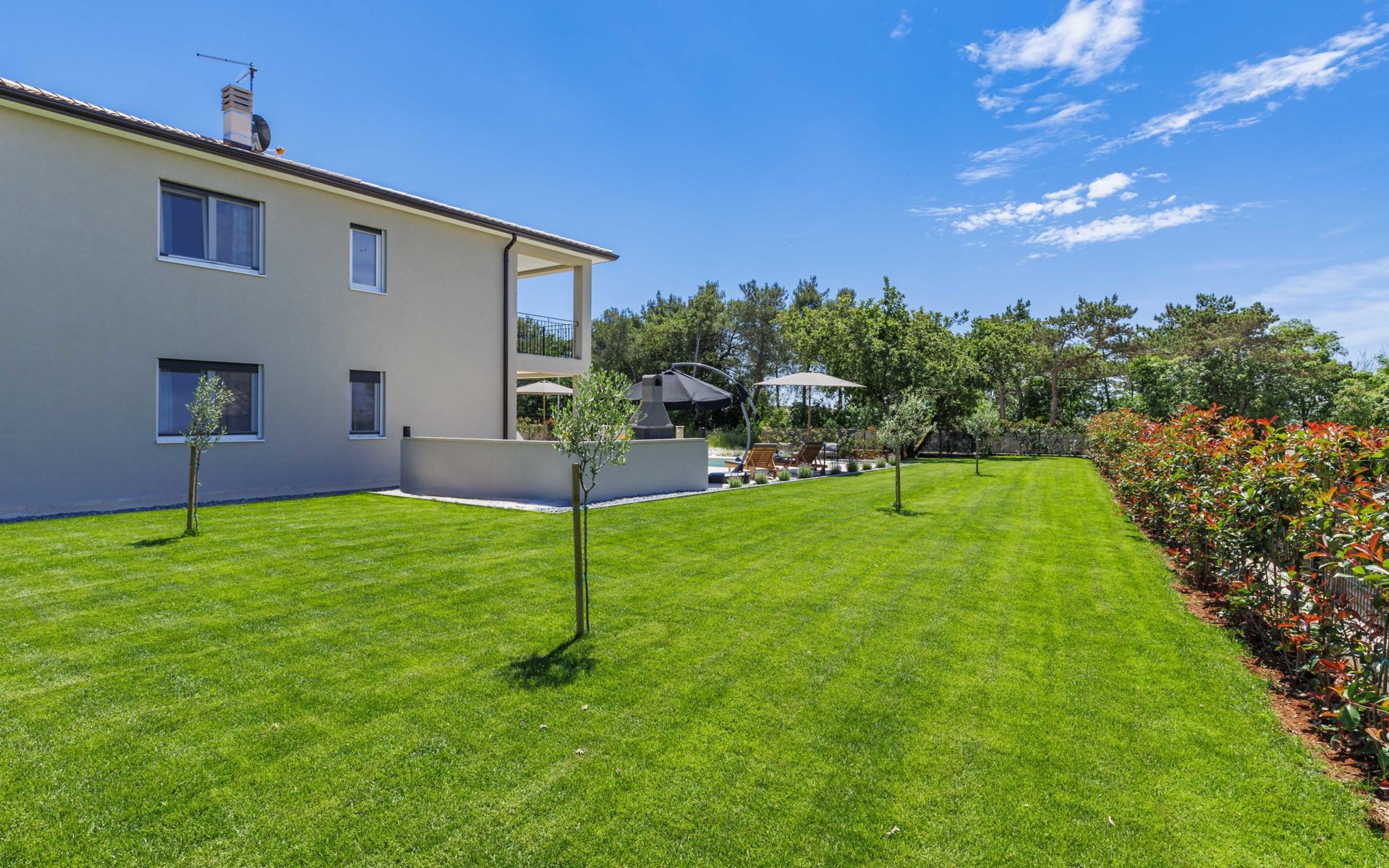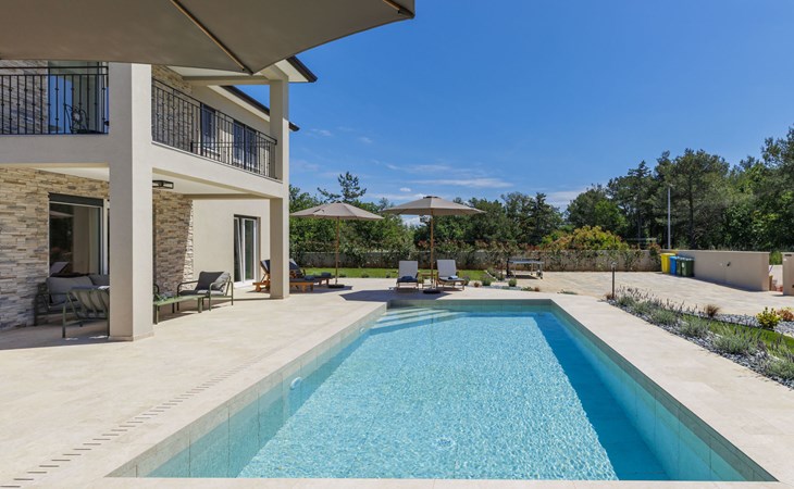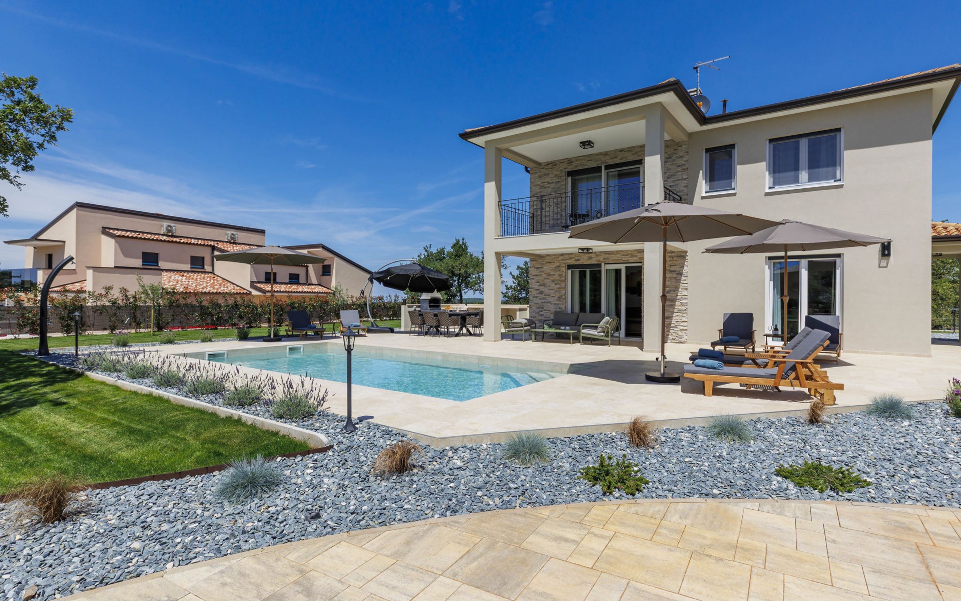 Modern, beautiful villa "Tramonto", 2 storeys. In the hamlet Gamboci 4 km from the centre of Buje, 12.5 km from the centre of Umag, 16.5 km from the centre of Novigrad, in a quiet position, 12 km from the sea, in a cul-de-sac. Private: property 1'200 m2 (fenced) with wildlife garden, swimming pool angular, heated (8 x 4 m, depth 150 cm, seasonal availability: 01.Apr. - 01.Nov.) with internal staircase. Outdoor shower, terrace (10 m2), garden furniture, barbecue. In the house: internet access, washing machine. Motor access (300 m via unmade road). Parking (for 2 cars) at the house on the premises. Shop 3.5 km, supermarket 3.5 km, restaurant 2.5 km, café 4 km, bus stop 4.5 km. Tennis 4.5 km, walking paths from the house 50 m, cycle lane 100 m. Nearby attractions: Winery 10 km. Please note: airfield 17 km from the property. Swimming pool heated (extra). It is necessary to announce 7 days in advance if the pool heating is required.