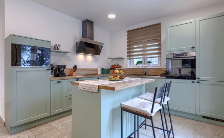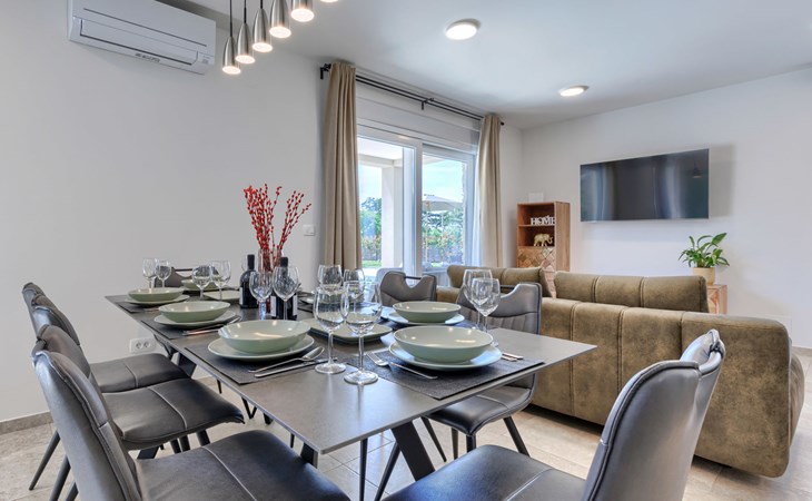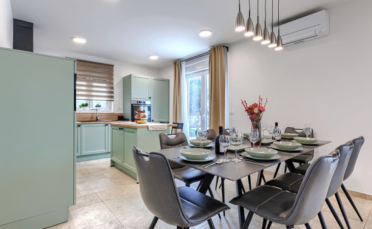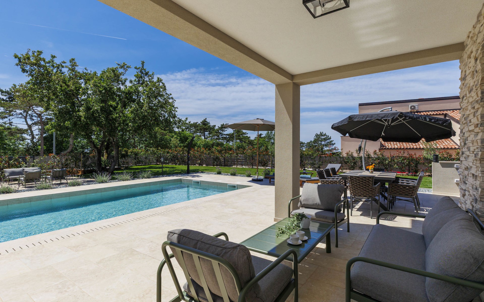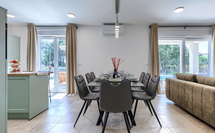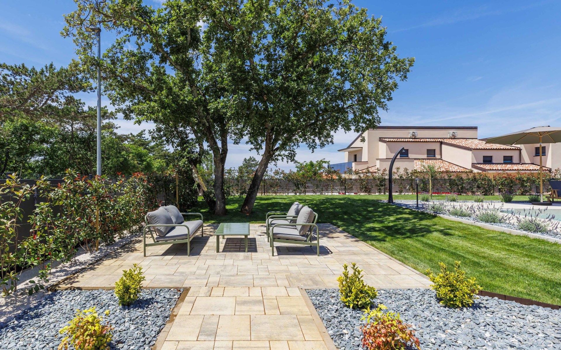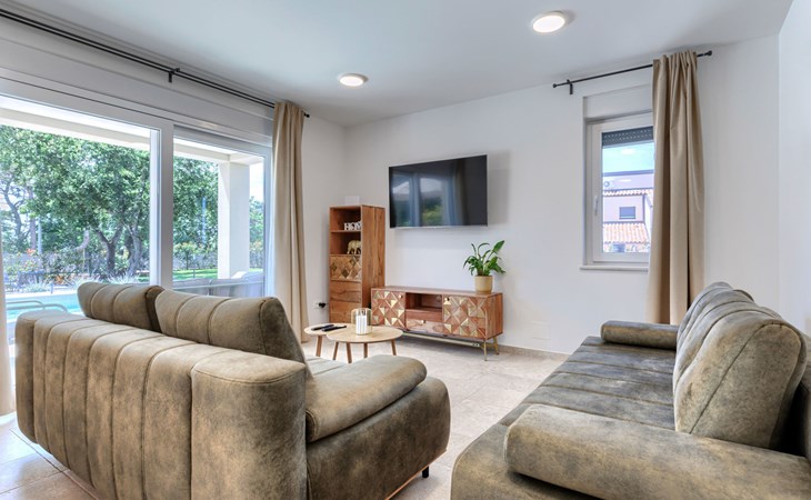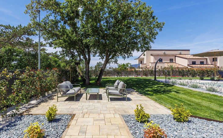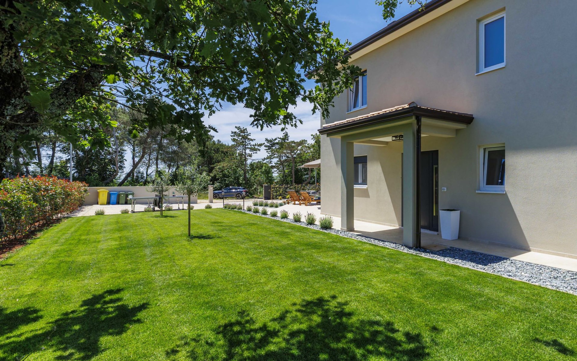 Modern, beautiful villa "Tramonto", 2 storeys. In the hamlet Gamboci 4 km from the centre of Buje, 12.5 km from the centre of Umag, 16.5 km from the centre of Novigrad, in a quiet position, 12 km from the sea, in a cul-de-sac. Private: property 1'200 m2 (fenced) with wildlife garden, swimming pool angular, heated (8 x 4 m, depth 150 cm, seasonal availability: 01.Apr. - 01.Nov.) with internal staircase. Outdoor shower, terrace (10 m2), garden furniture, barbecue. In the house: internet access, washing machine. Motor access (300 m via unmade road). Parking (for 2 cars) at the house on the premises. Shop 3.5 km, supermarket 3.5 km, restaurant 2.5 km, café 4 km, bus stop 4.5 km. Tennis 4.5 km, walking paths from the house 50 m, cycle lane 100 m. Nearby attractions: Winery 10 km. Please note: airfield 17 km from the property. Swimming pool heated (extra). It is necessary to announce 7 days in advance if the pool heating is required.