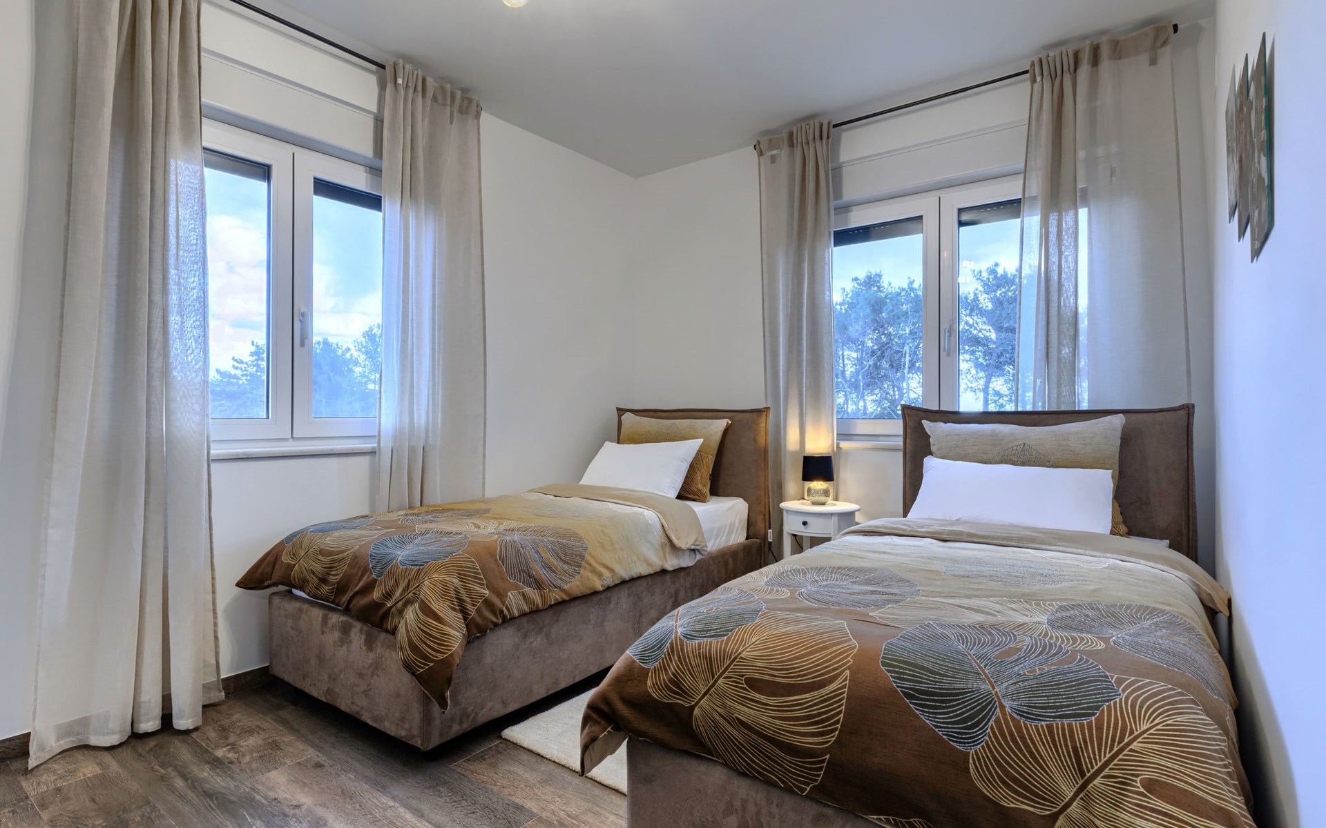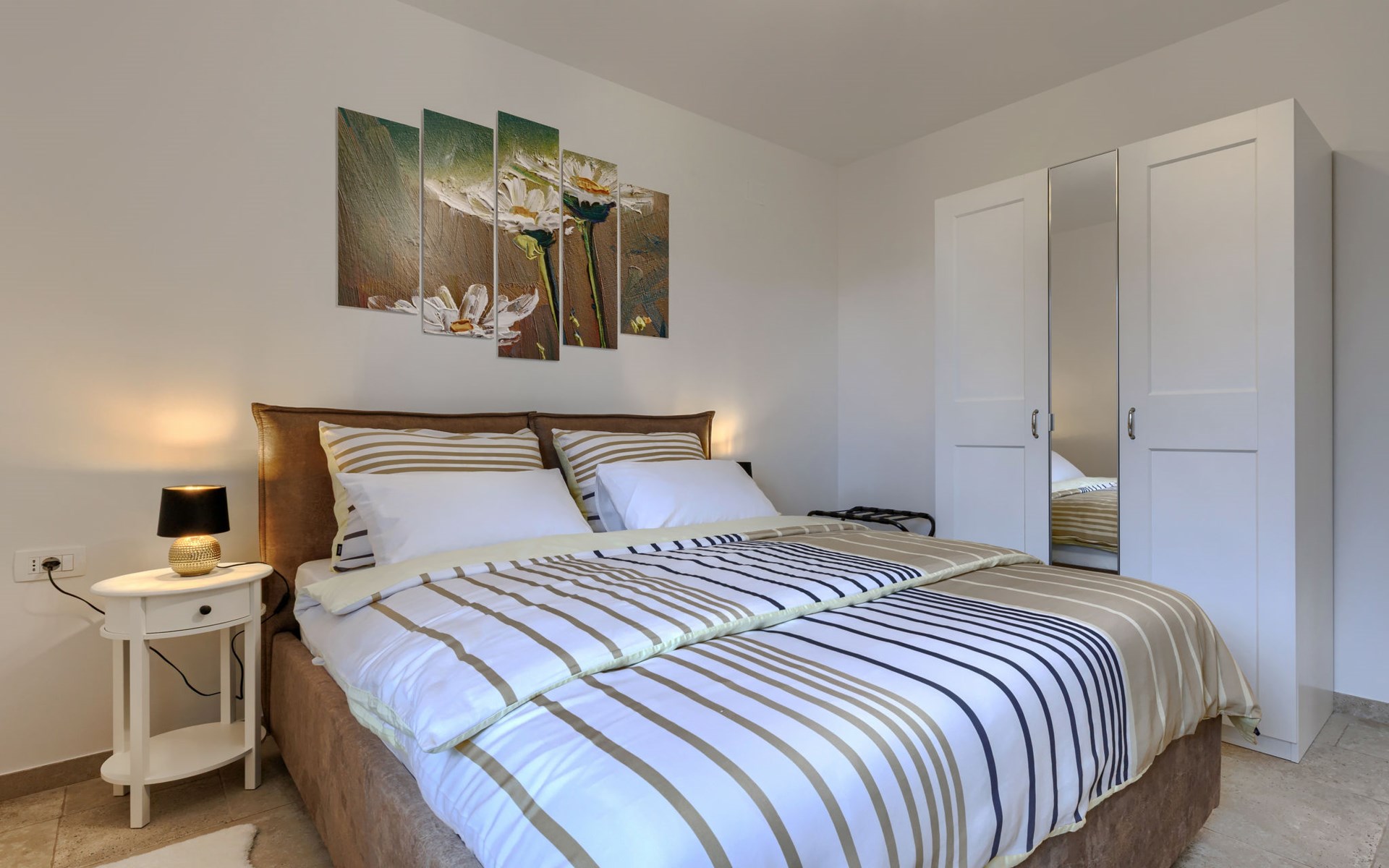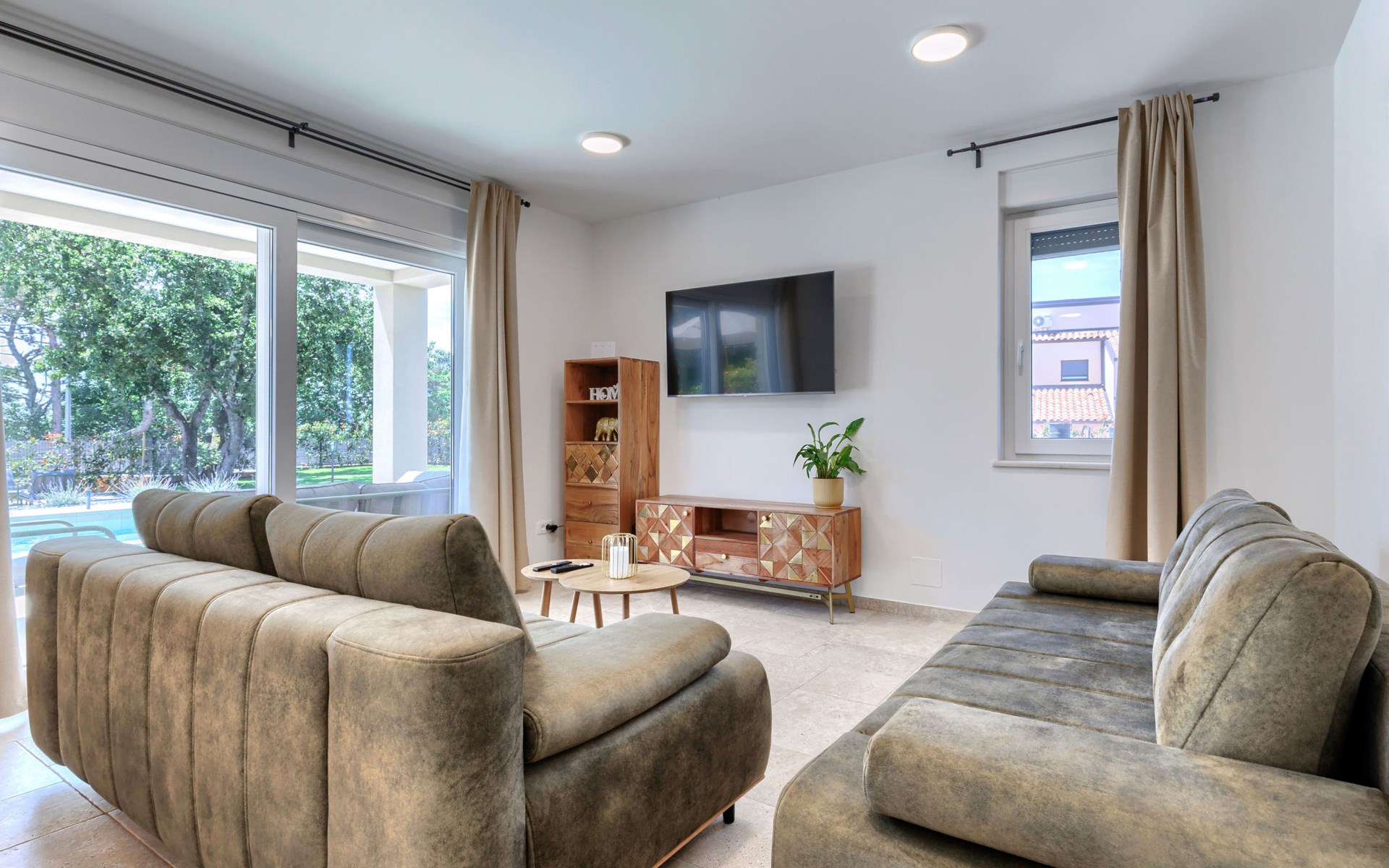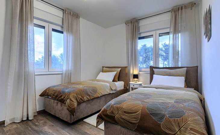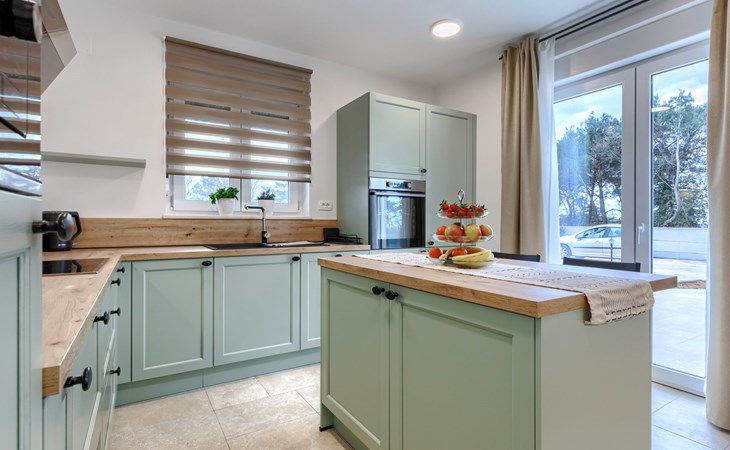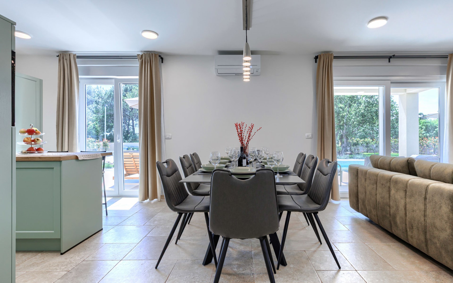 Modern, beautiful villa "Tramonto", 2 storeys. In the hamlet Gamboci 4 km from the centre of Buje, 12.5 km from the centre of Umag, 16.5 km from the centre of Novigrad, in a quiet position, 12 km from the sea, in a cul-de-sac. Private: property 1'200 m2 (fenced) with wildlife garden, swimming pool angular, heated (8 x 4 m, depth 150 cm, seasonal availability: 01.Apr. - 01.Nov.) with internal staircase. Outdoor shower, terrace (10 m2), garden furniture, barbecue. In the house: internet access, washing machine. Motor access (300 m via unmade road). Parking (for 2 cars) at the house on the premises. Shop 3.5 km, supermarket 3.5 km, restaurant 2.5 km, café 4 km, bus stop 4.5 km. Tennis 4.5 km, walking paths from the house 50 m, cycle lane 100 m. Nearby attractions: Winery 10 km. Please note: airfield 17 km from the property. Swimming pool heated (extra). It is necessary to announce 7 days in advance if the pool heating is required.
