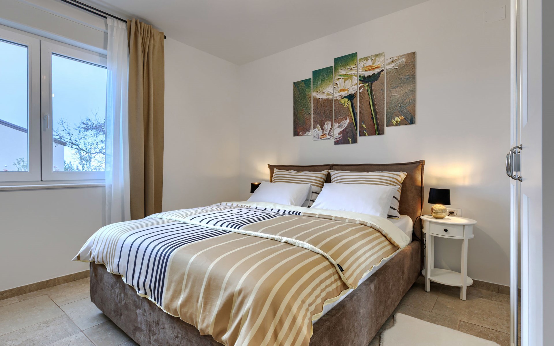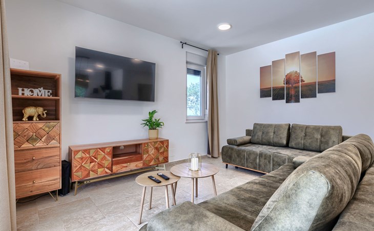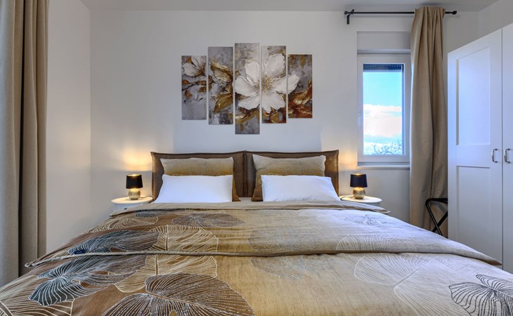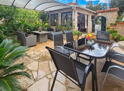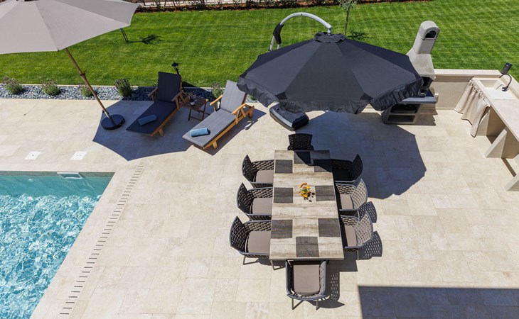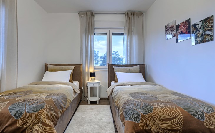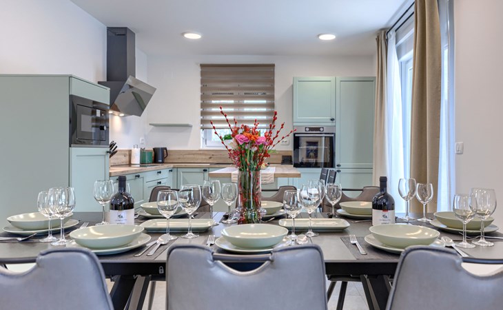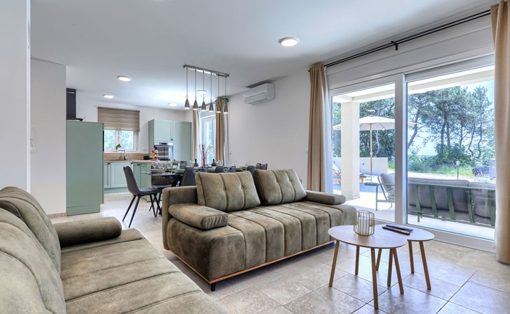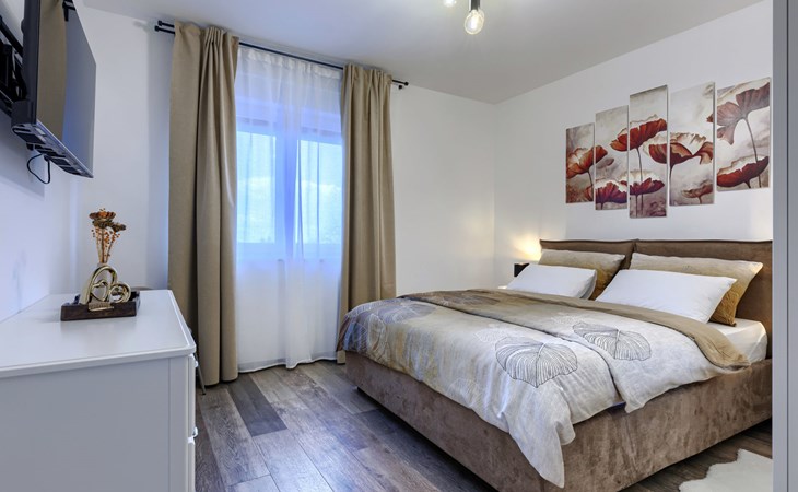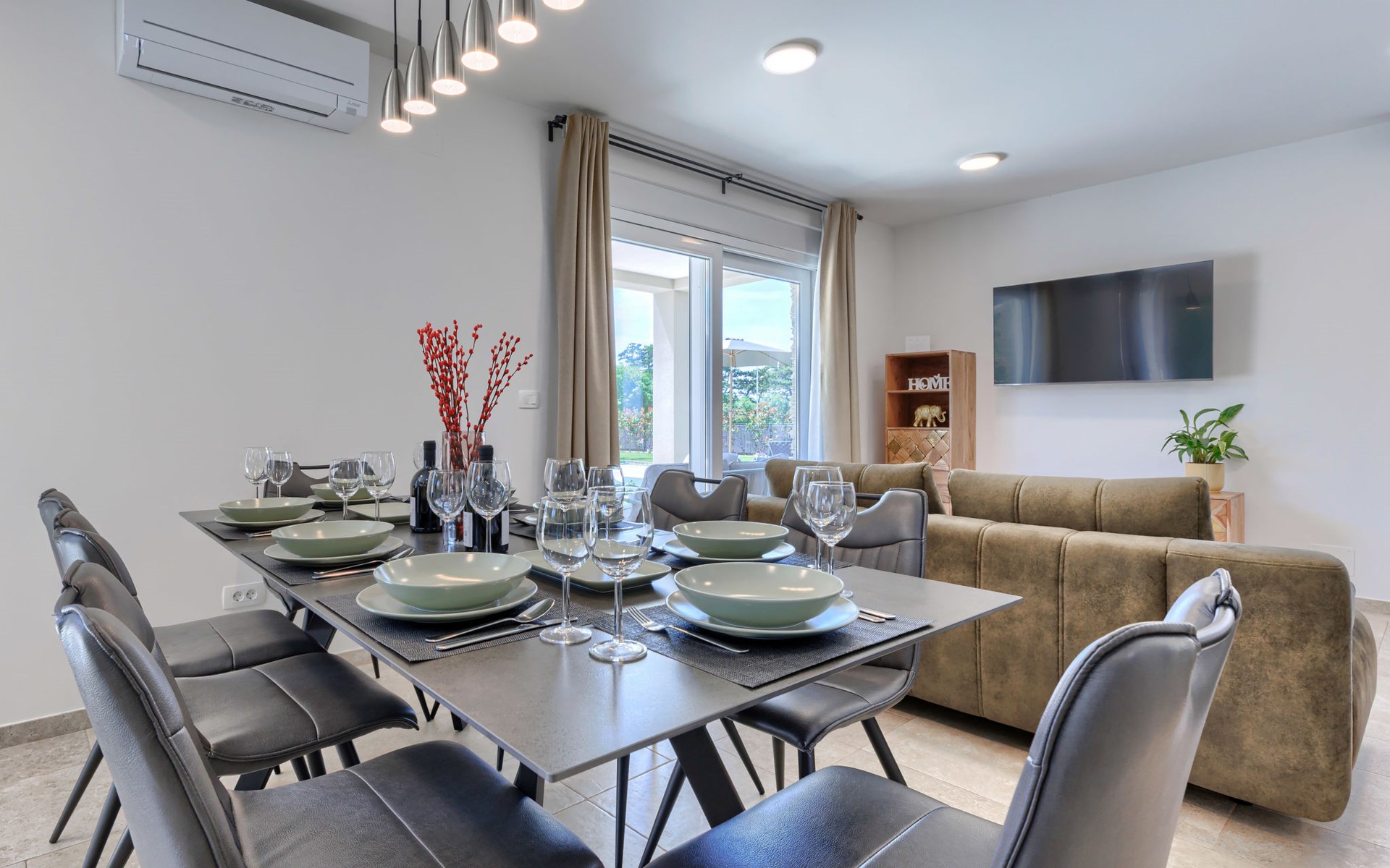 Modern, beautiful villa "Tramonto", 2 storeys. In the hamlet Gamboci 4 km from the centre of Buje, 12.5 km from the centre of Umag, 16.5 km from the centre of Novigrad, in a quiet position, 12 km from the sea, in a cul-de-sac. Private: property 1'200 m2 (fenced) with wildlife garden, swimming pool angular, heated (8 x 4 m, depth 150 cm, seasonal availability: 01.Apr. - 01.Nov.) with internal staircase. Outdoor shower, terrace (10 m2), garden furniture, barbecue. In the house: internet access, washing machine. Motor access (300 m via unmade road). Parking (for 2 cars) at the house on the premises. Shop 3.5 km, supermarket 3.5 km, restaurant 2.5 km, café 4 km, bus stop 4.5 km. Tennis 4.5 km, walking paths from the house 50 m, cycle lane 100 m. Nearby attractions: Winery 10 km. Please note: airfield 17 km from the property. Swimming pool heated (extra). It is necessary to announce 7 days in advance if the pool heating is required.