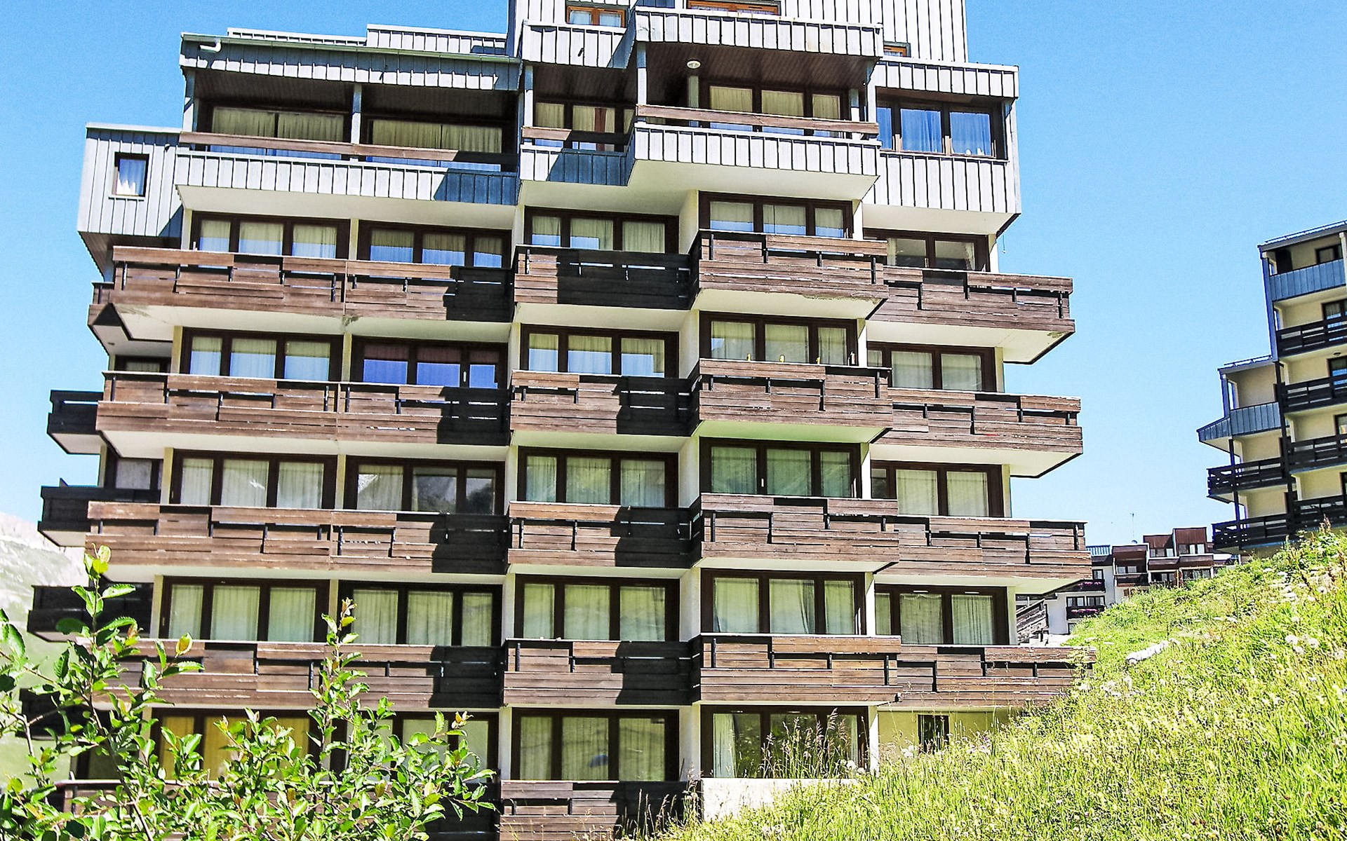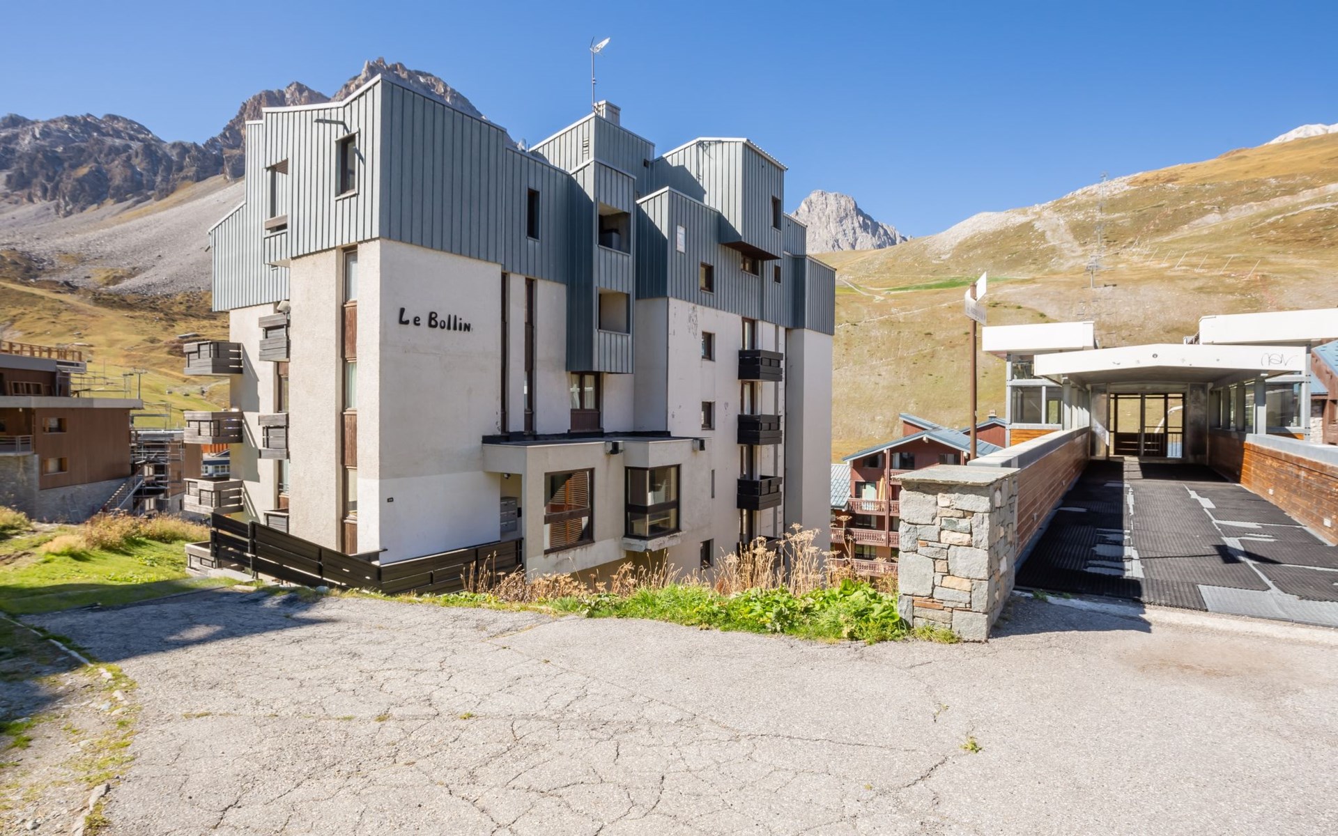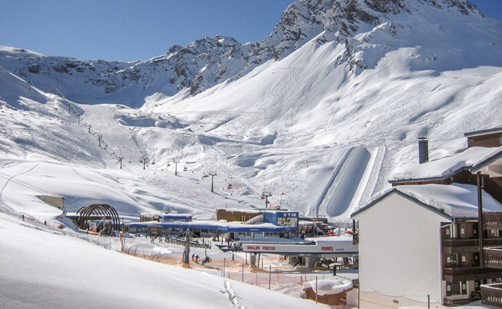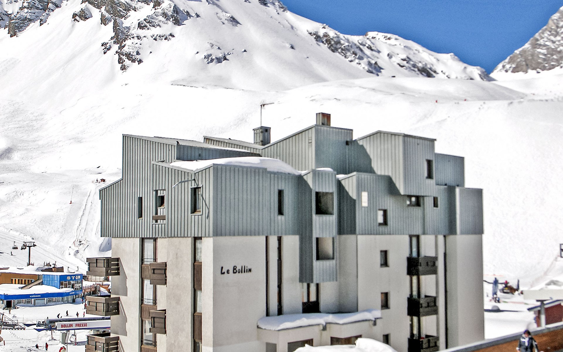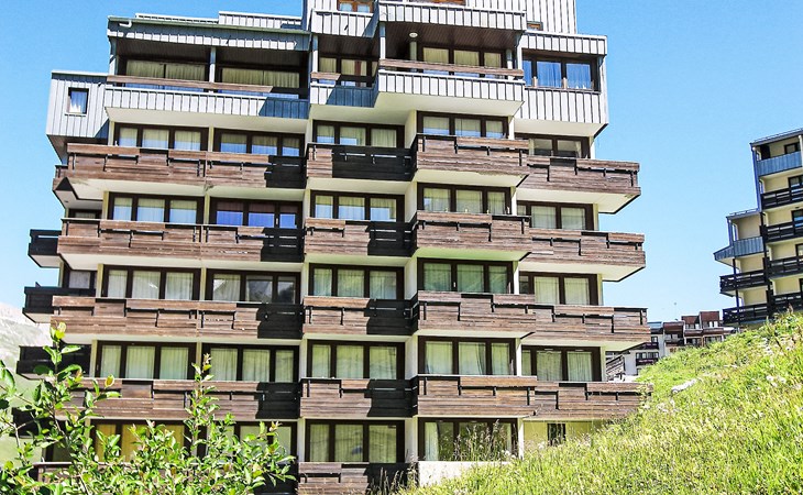 Tignes Val Claret: Residence "Le Bollin (Val Claret)", 6 storeys. Directly by the skiing area, situated at the foot of a mountain. In the complex: lift, storage room for skis, central heating system. Shop 200 m, supermarket 500 m, shopping centre 200 m, restaurant 100 m, bakery, bus stop 200 m, indoor swimming pool 2 km. Sports centre 2 km, skisport facilities 5 m, ski rental 100 m, ski bus stop 300 m, ski school 50 m, sled run, cross country ski track 2 km, ice rink 2 km. Well-known ski regions can easily be reached: TIGNES VAL D'ISERE 5 m. Please note: ski bus (free of charge).