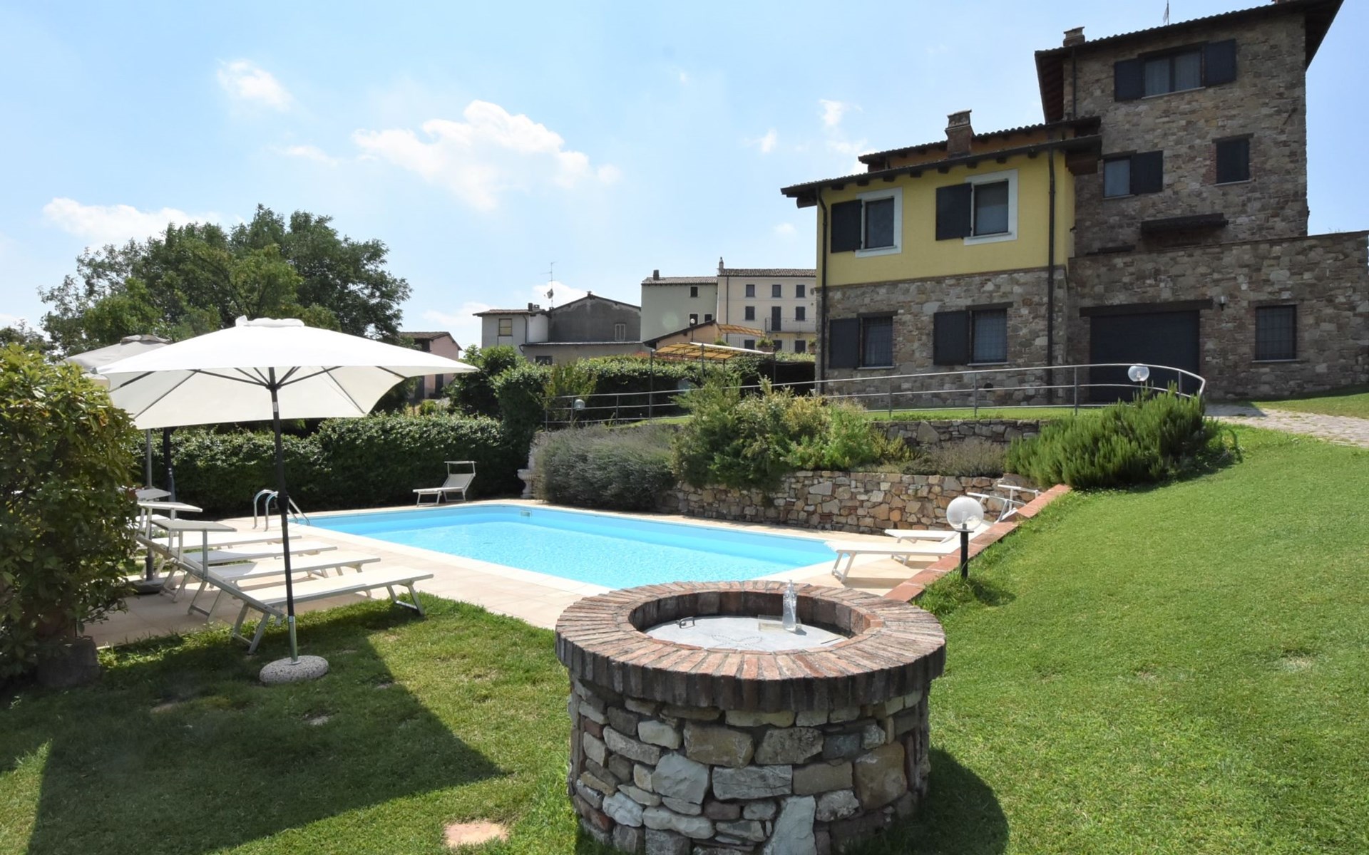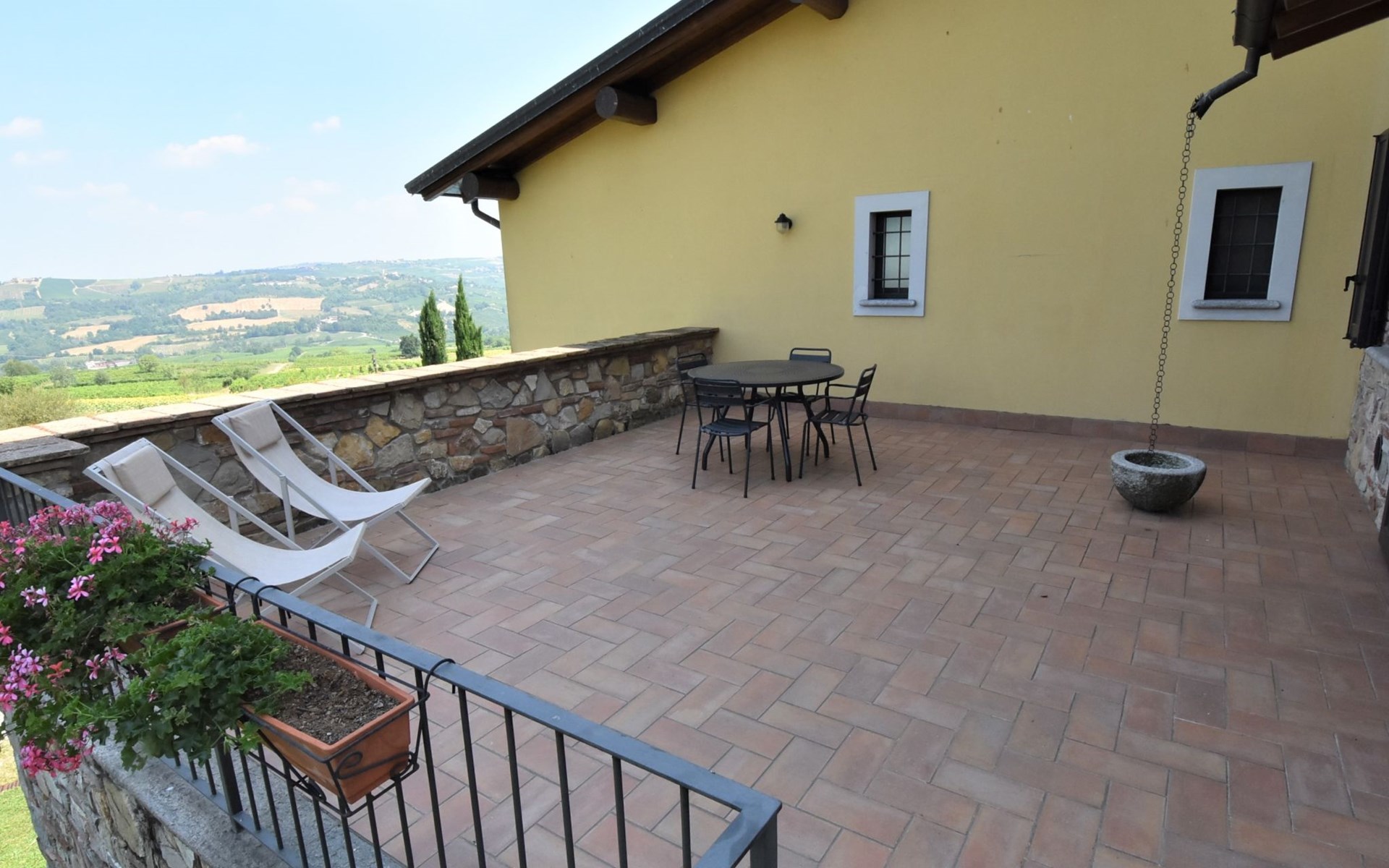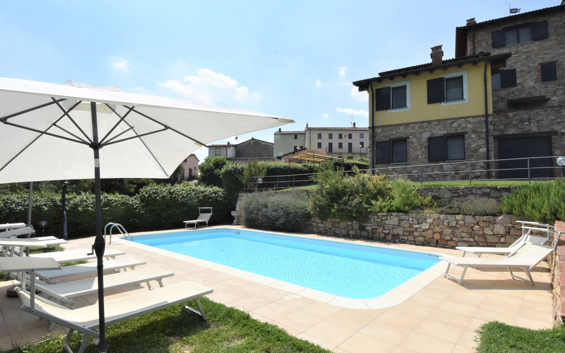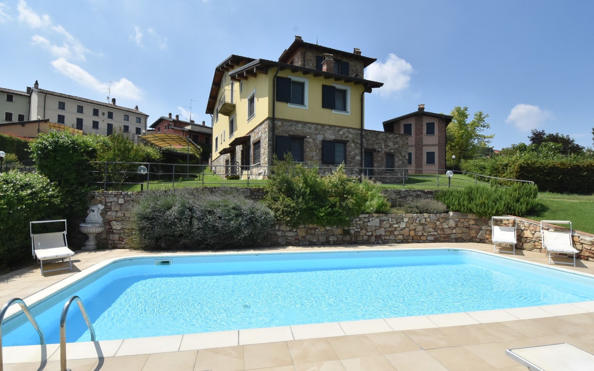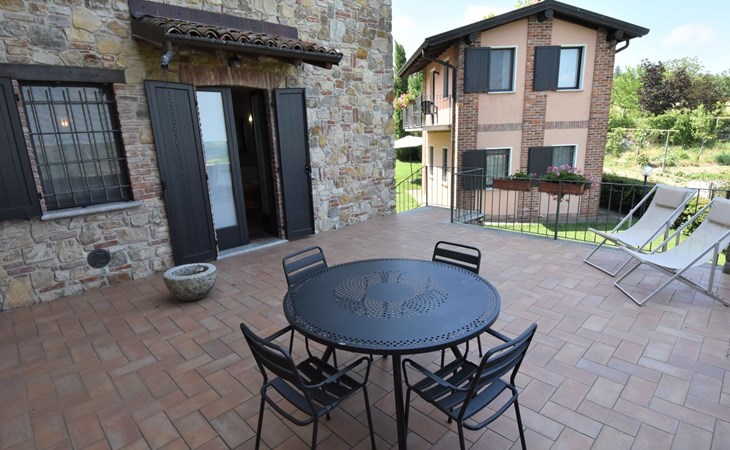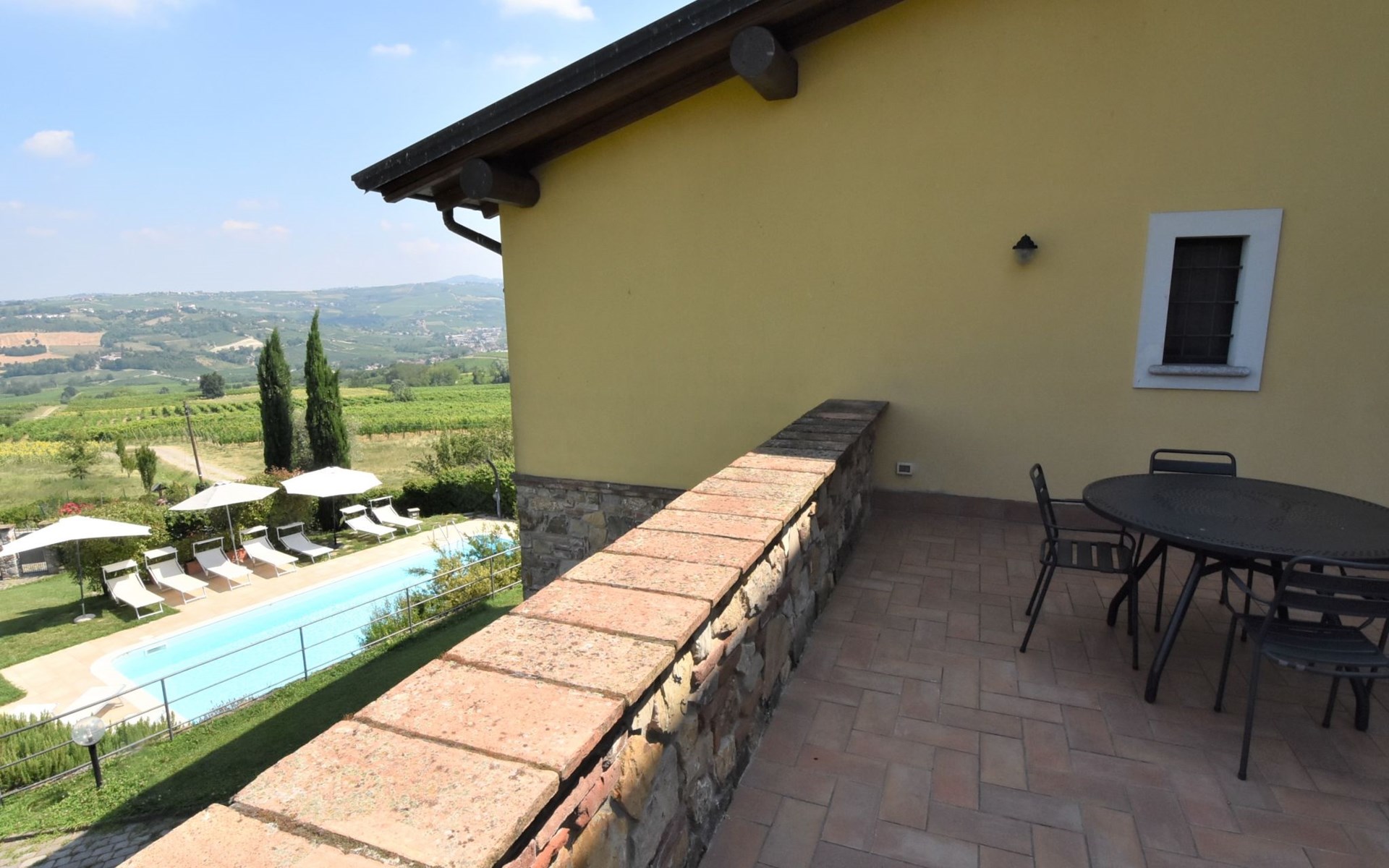 Beautiful residence 300 m a.s.l., surrounded by fields and vineyards. 6 apartments in the residence. In the hamlet Cristina 2.2 km from the centre of Castana, on the outskirts, 28 km from the centre of Pavia, 84 km from the centre of Milano, on top of a hill. For shared use: property 2'300 m2 (fenced), terraced garden with lawn and trees, swimming pool (10 x 5 m, depth 130 cm, seasonal availability: 01.May. - 15.Oct.). Outdoor shower, terrace, garden furniture, barbecue, pool maintenance by the owner/gardener. In the complex: storage room for bicycles. Parking on the premises. Shop 1.5 km, supermarket 3 km. Golf course 30 km. Please note: the owner lives on the same property. Please note: possibility of e-bike rental. Half day or full day e-bike tour, with lunch in a characteristic restaurant (extra).