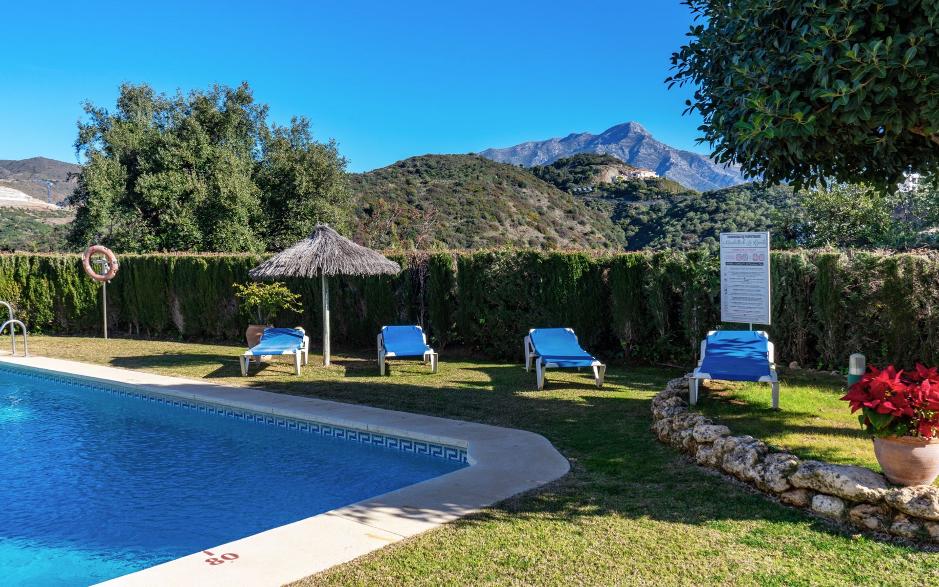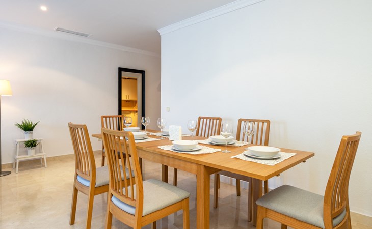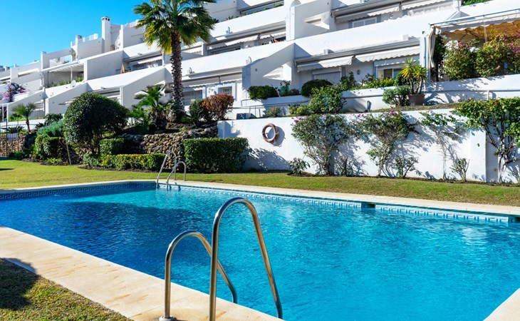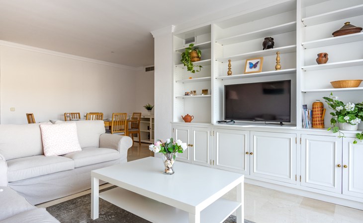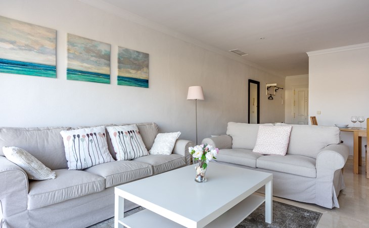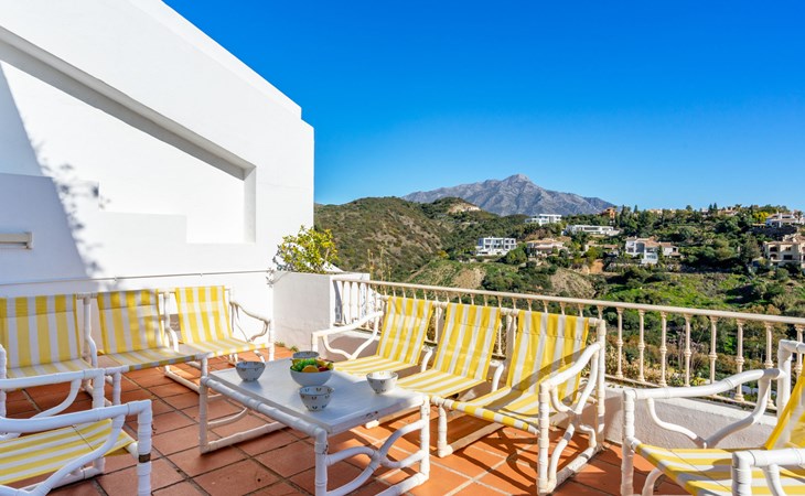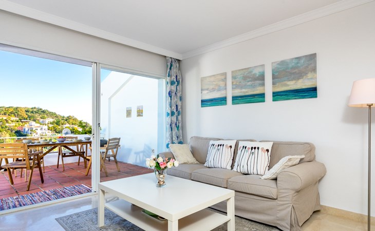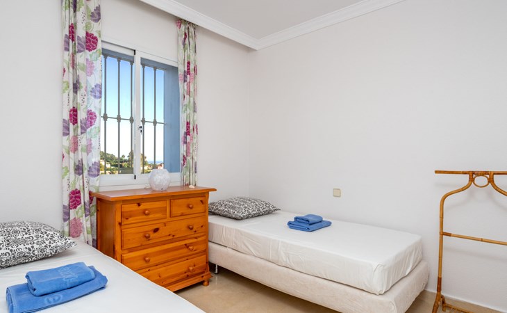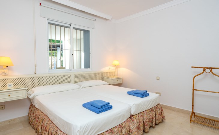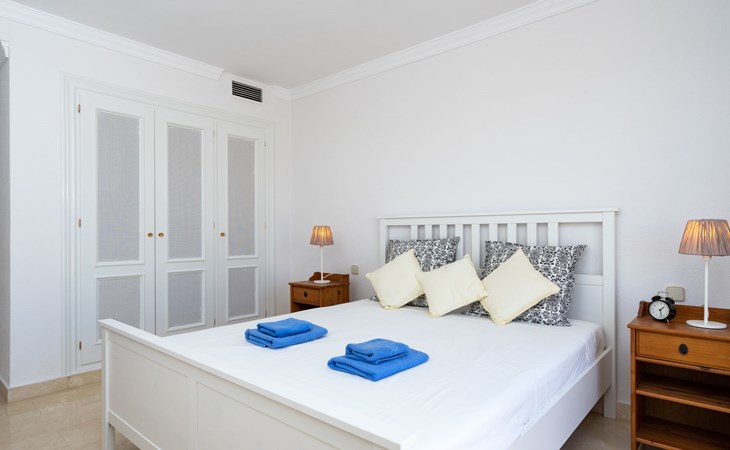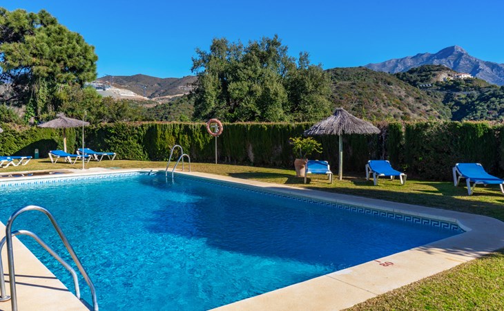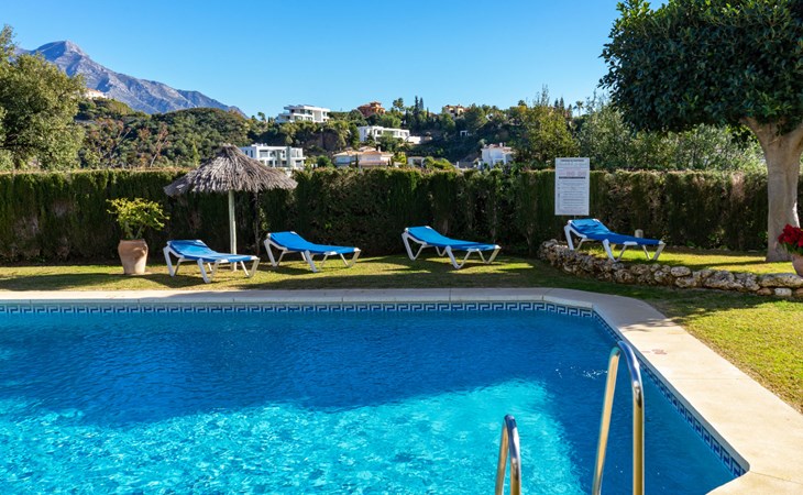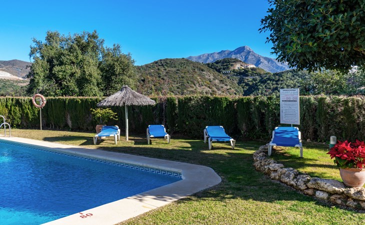 Apartment block "Mirador". 15 km from the centre of Marbella, outside the resort, 7 km from the centre of Puerto BanĂºs, 6 km from the sea, on the golf course, east facing position. For shared use: garden with lawn, swimming pool (depth 80 - 210 cm, seasonal availability: 01.May. - 31.Oct.). In the house: central heating system, air conditioning, washing machine. Parking. Supermarket 4 km, restaurant 5 km, bus stop "El Salto" 2.1 km, sandy beach 6 km. Golf course (18 hole) 1 km. Please note: car recommended. Neighbourhood highly sensitive to noise. Quietness and good behaviour expected.