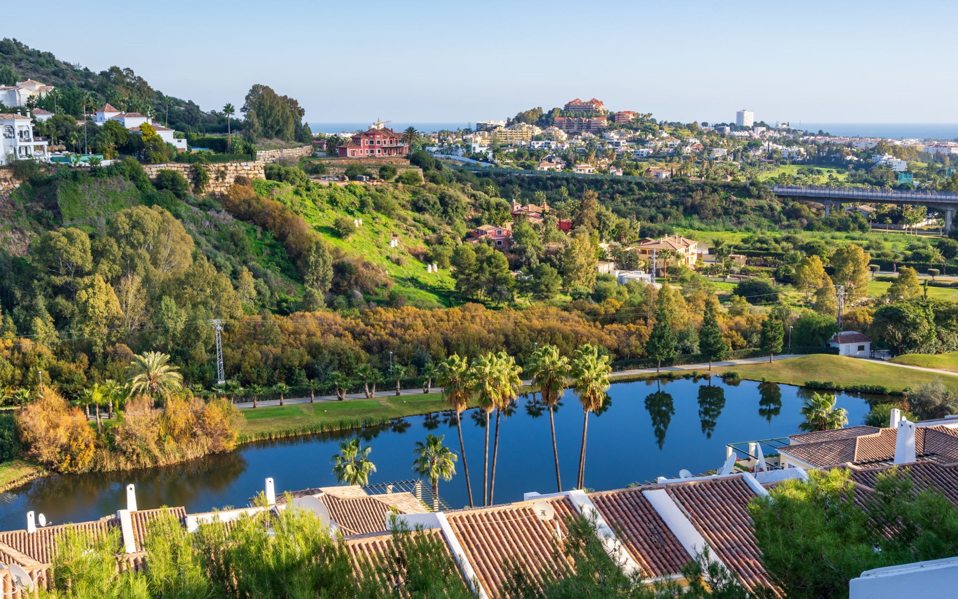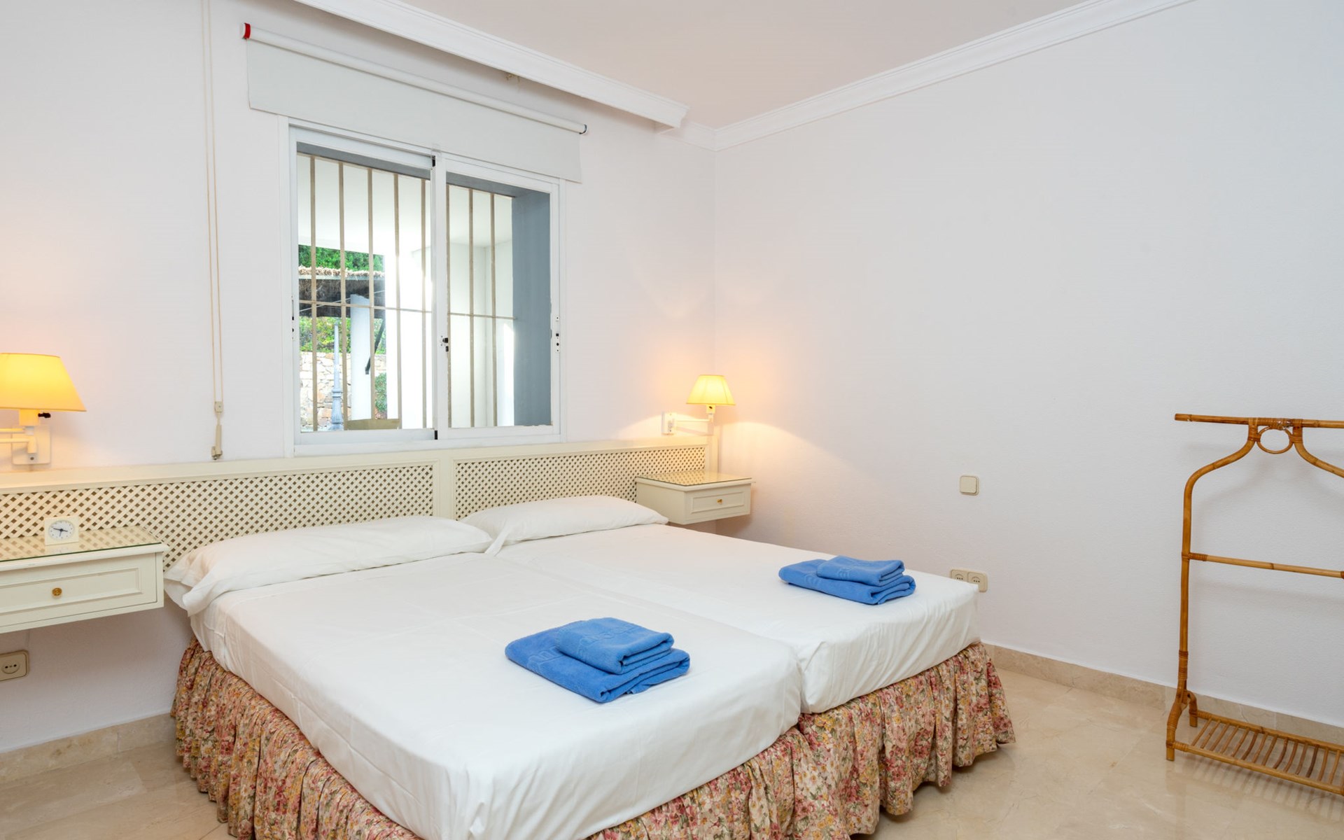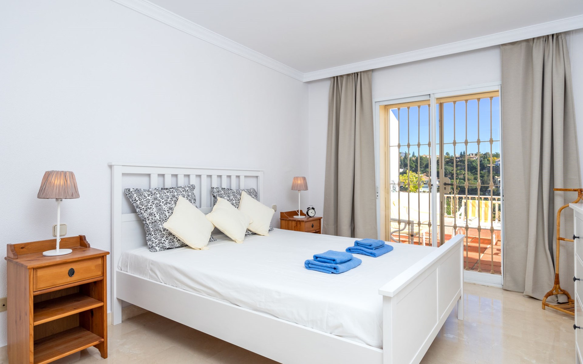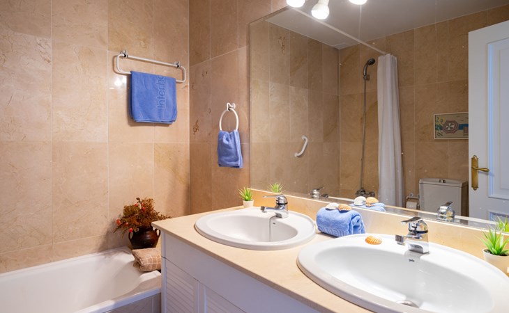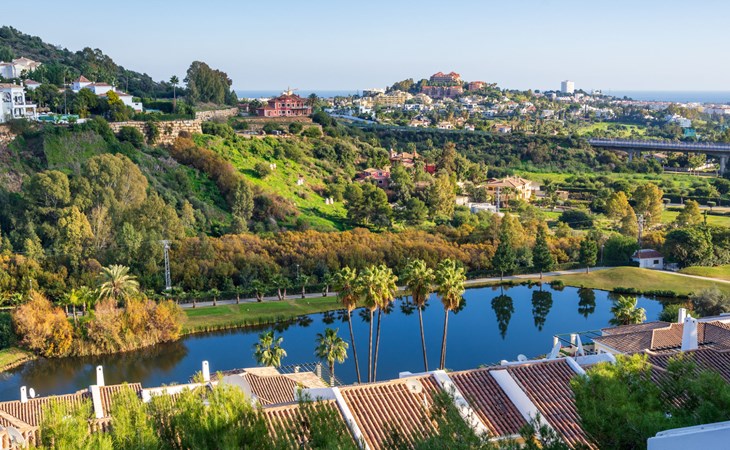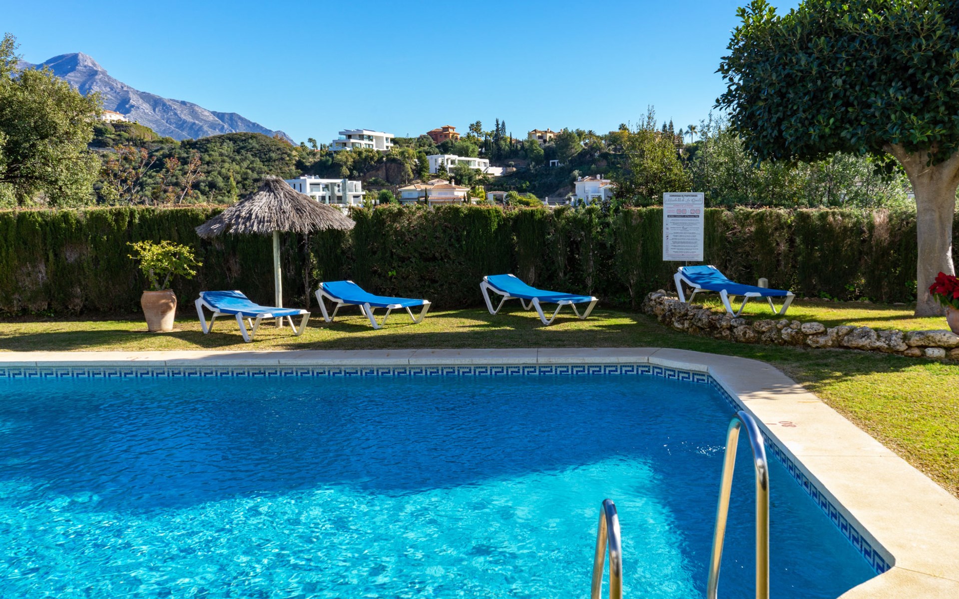 Apartment block "Mirador". 15 km from the centre of Marbella, outside the resort, 7 km from the centre of Puerto BanĂºs, 6 km from the sea, on the golf course, east facing position. For shared use: garden with lawn, swimming pool (depth 80 - 210 cm, seasonal availability: 01.May. - 31.Oct.). In the house: central heating system, air conditioning, washing machine. Parking. Supermarket 4 km, restaurant 5 km, bus stop "El Salto" 2.1 km, sandy beach 6 km. Golf course (18 hole) 1 km. Please note: car recommended. Neighbourhood highly sensitive to noise. Quietness and good behaviour expected.