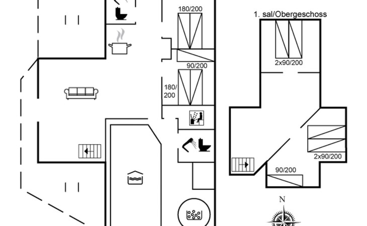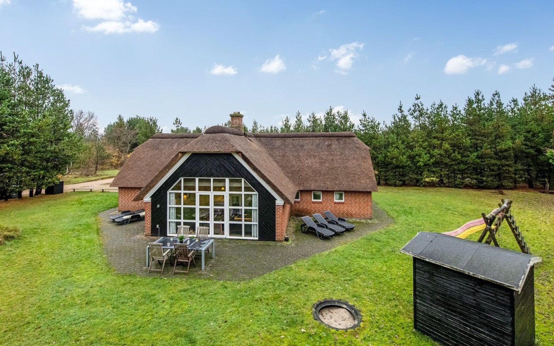 Single-family house, built in 1994. 4.3 km from the sea. Private: natural state property 1'800 m2, indoor pool (3 x 8 m, 24 m2, depth 140 - 140 cm). Terrace (55 m2), children's playground (slide). In the house: sauna, washing machine, tumble dryer. Parking at the house. E-charging station. Grocery 1 km.