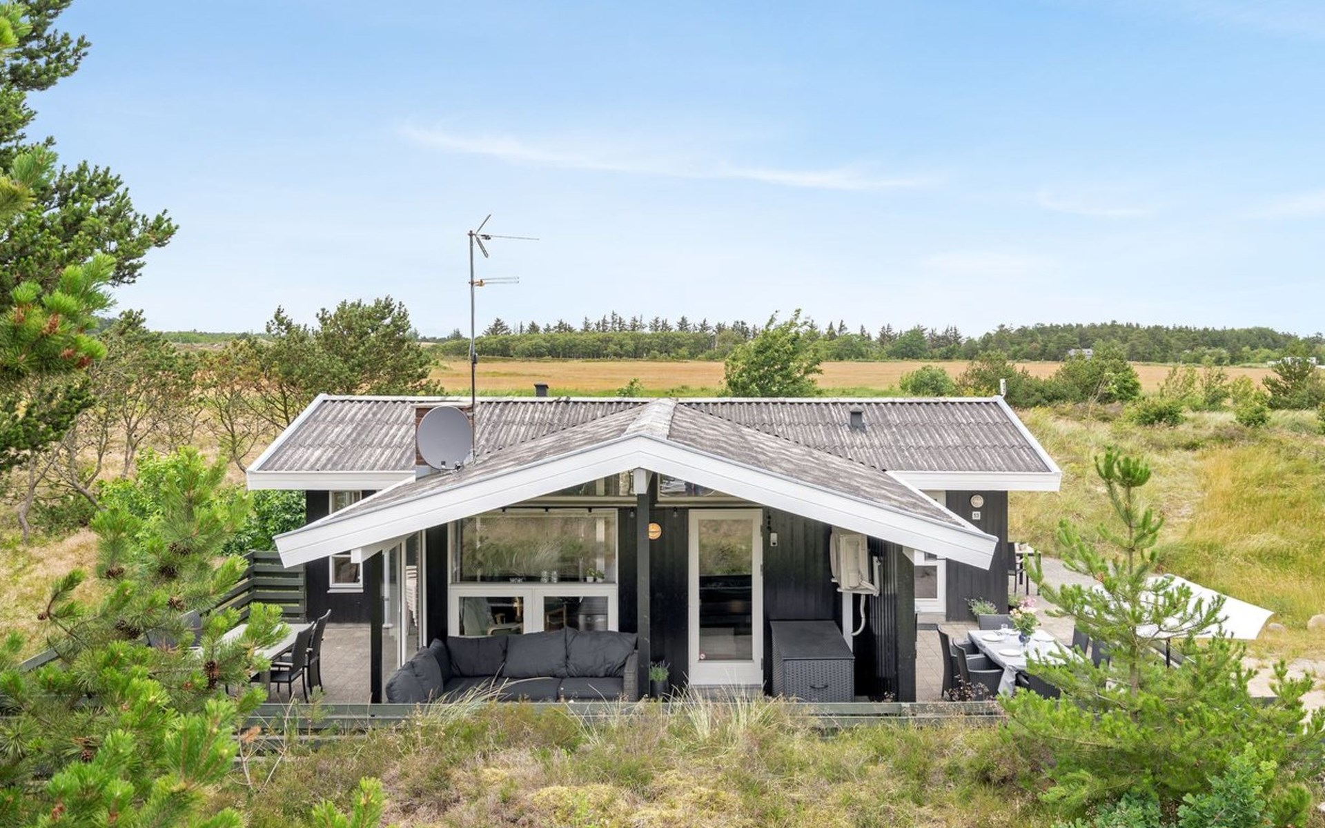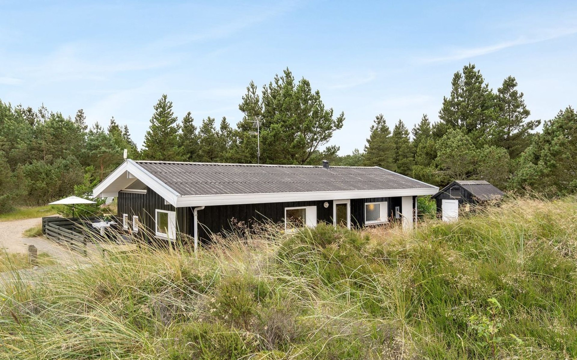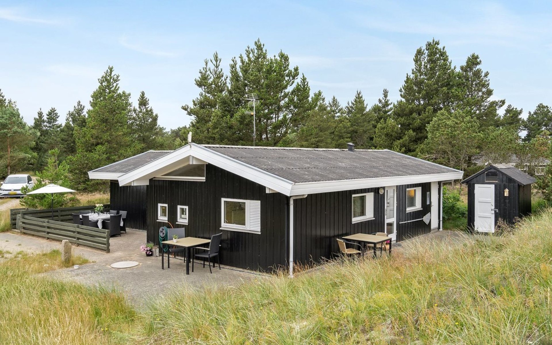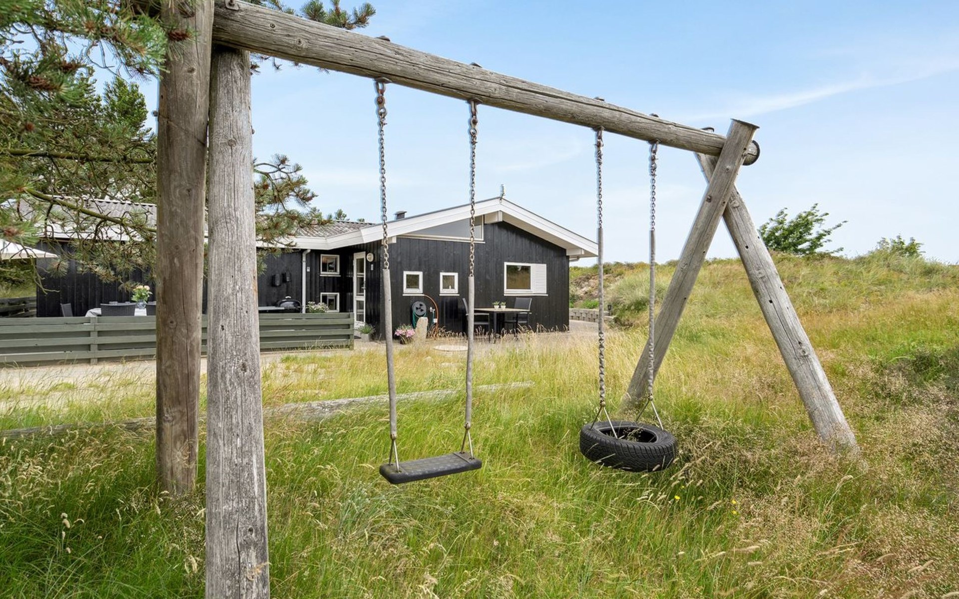 Single-family house, built in 1986. 3.9 km from the sea. Private: natural state property 2'750 m2. Terrace (80 m2), children's playground (swing). In the house: sauna, washing machine, tumble dryer. Parking at the house. Grocery 2.6 km. The owner does not accept any youth groups.