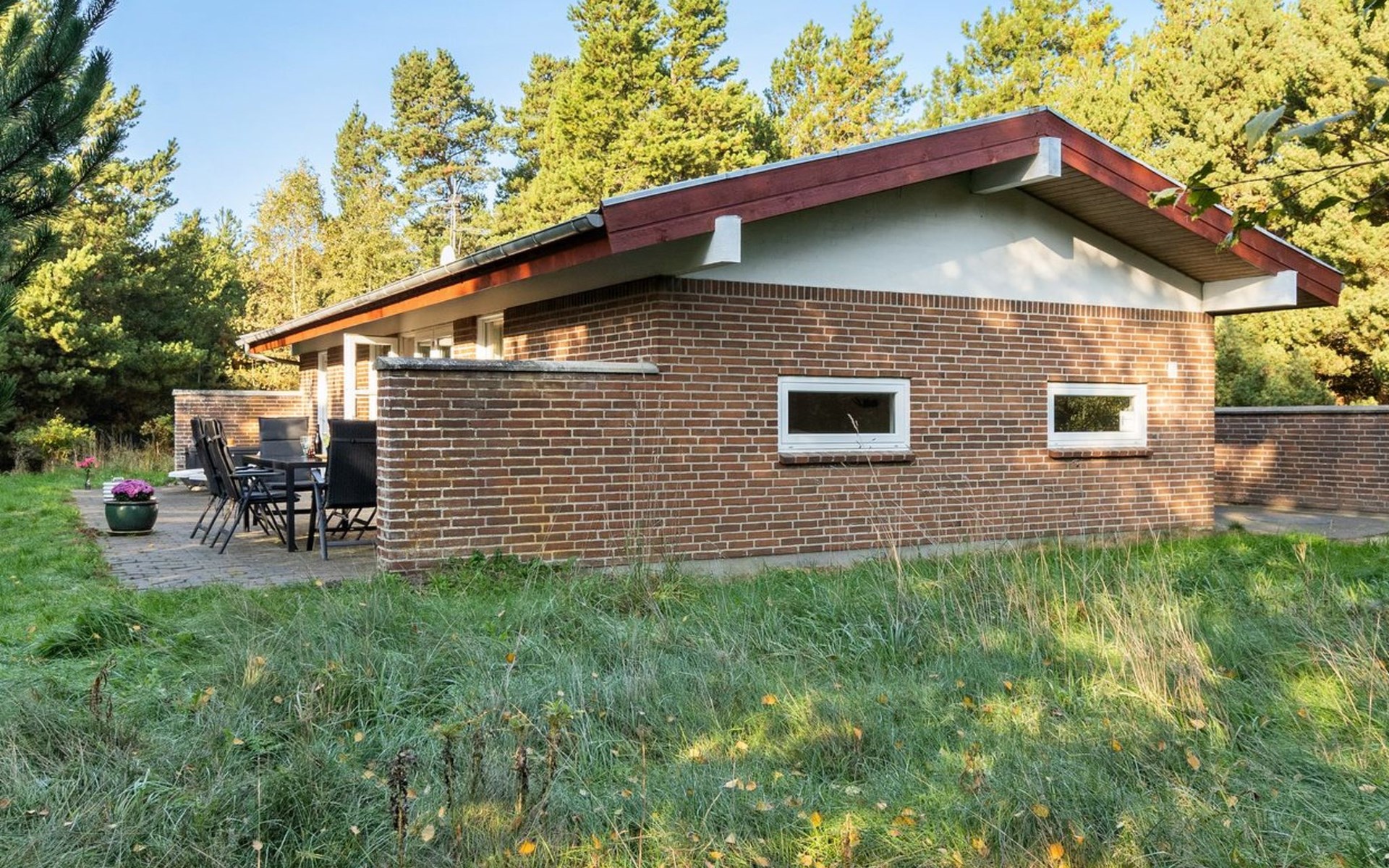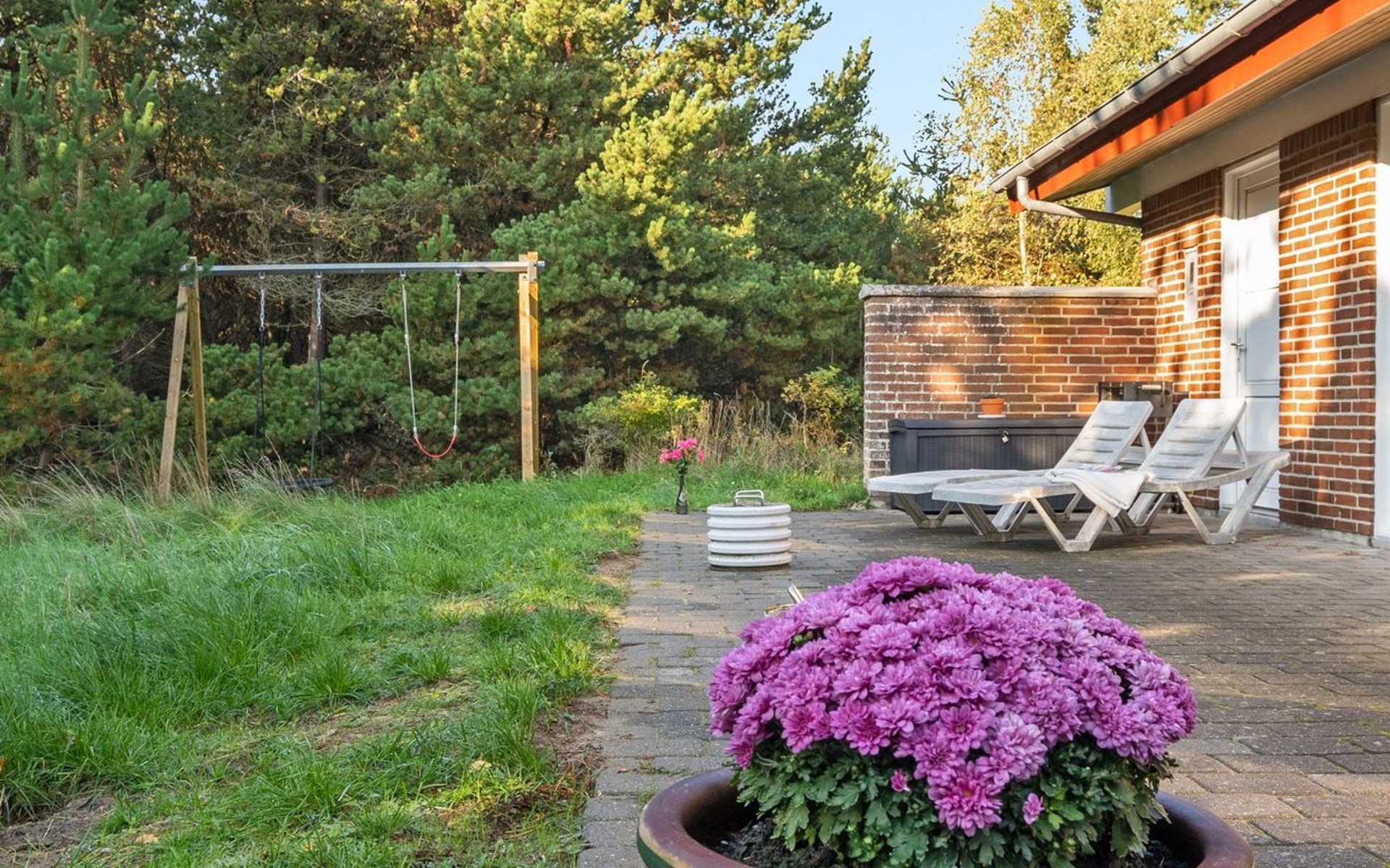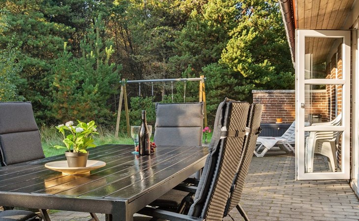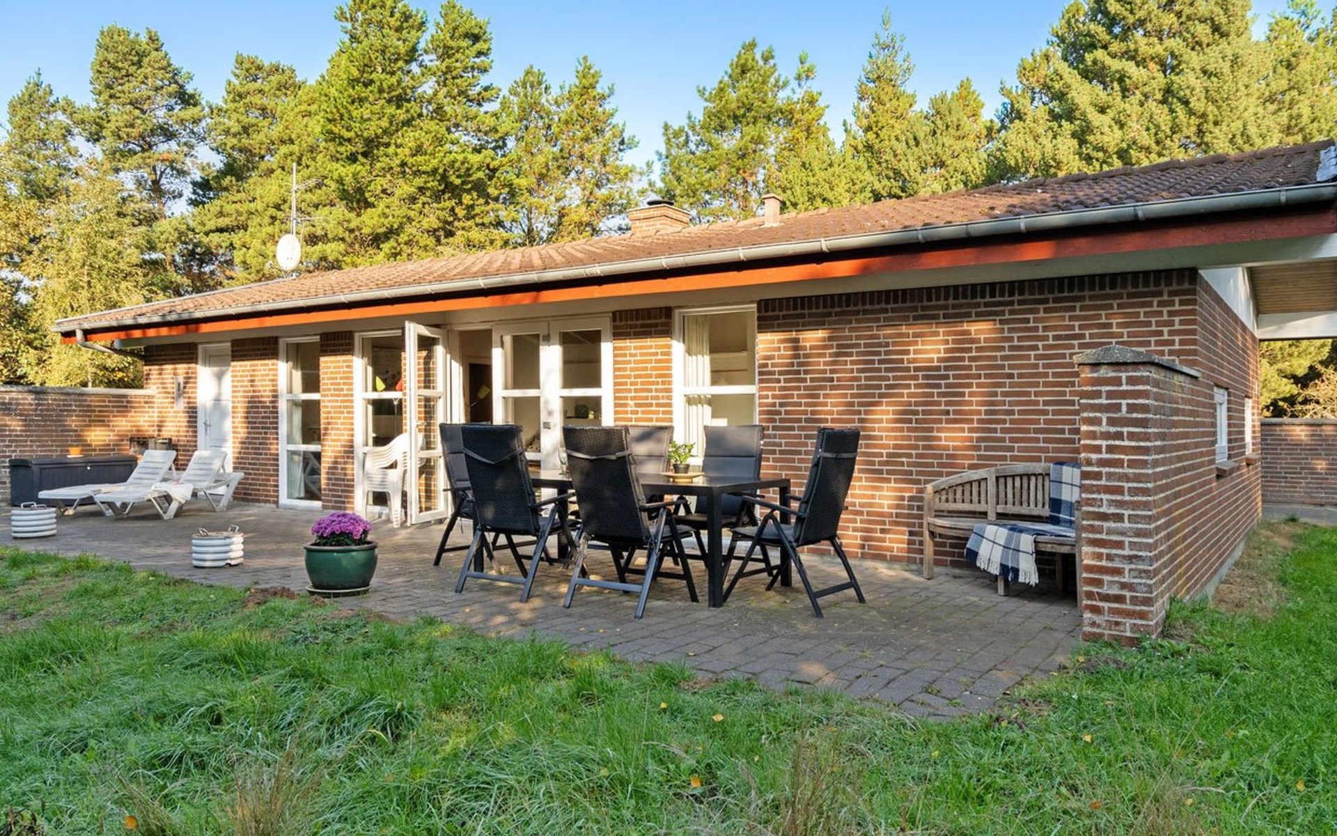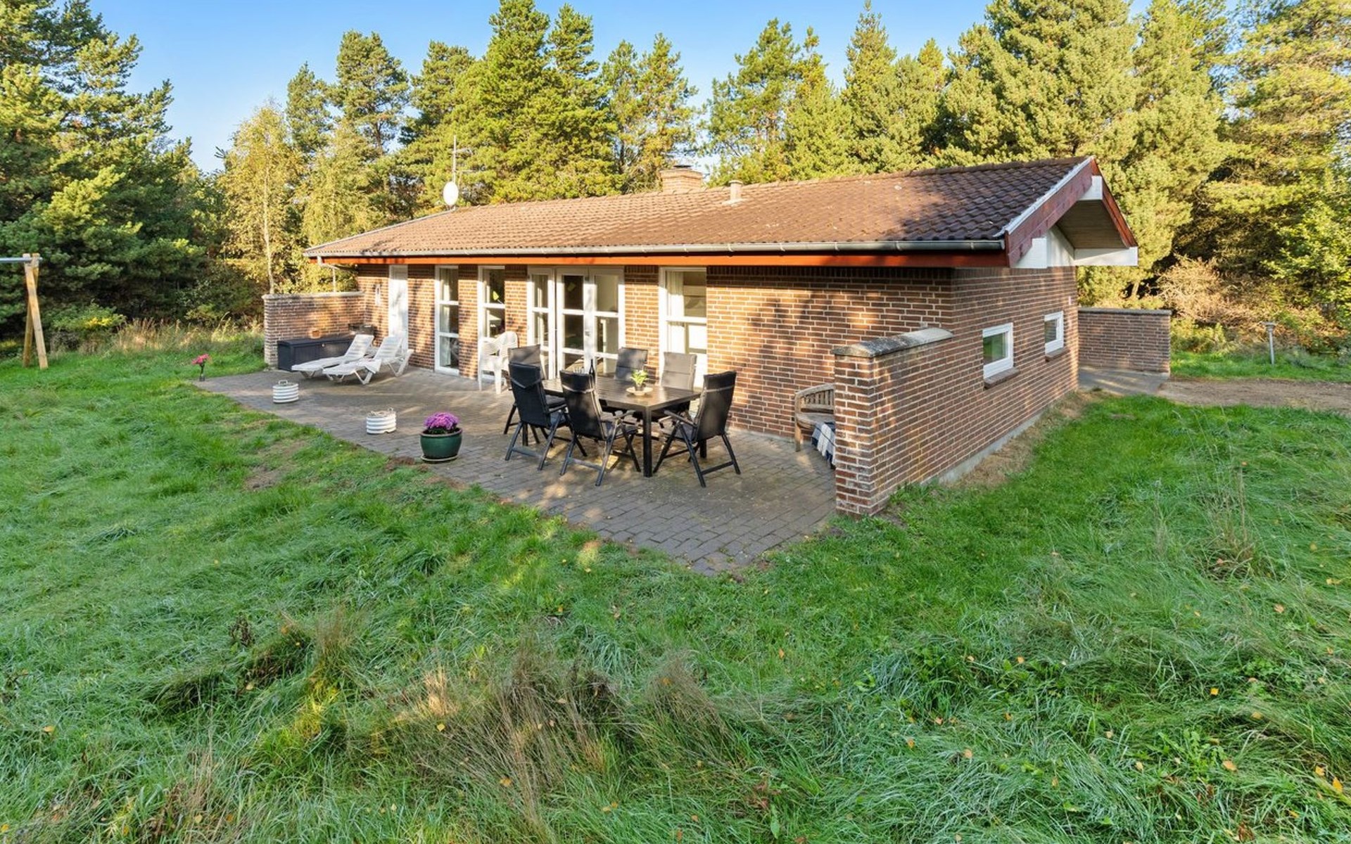 Single-family house, built in 1977. 1 km from the sea. Private: natural state property 2'908 m2. Children's playground (swing). In the house: washing machine, tumble dryer. Parking at the house. Grocery 2.8 km. Golf course 300 m. The owner does not accept any youth groups.