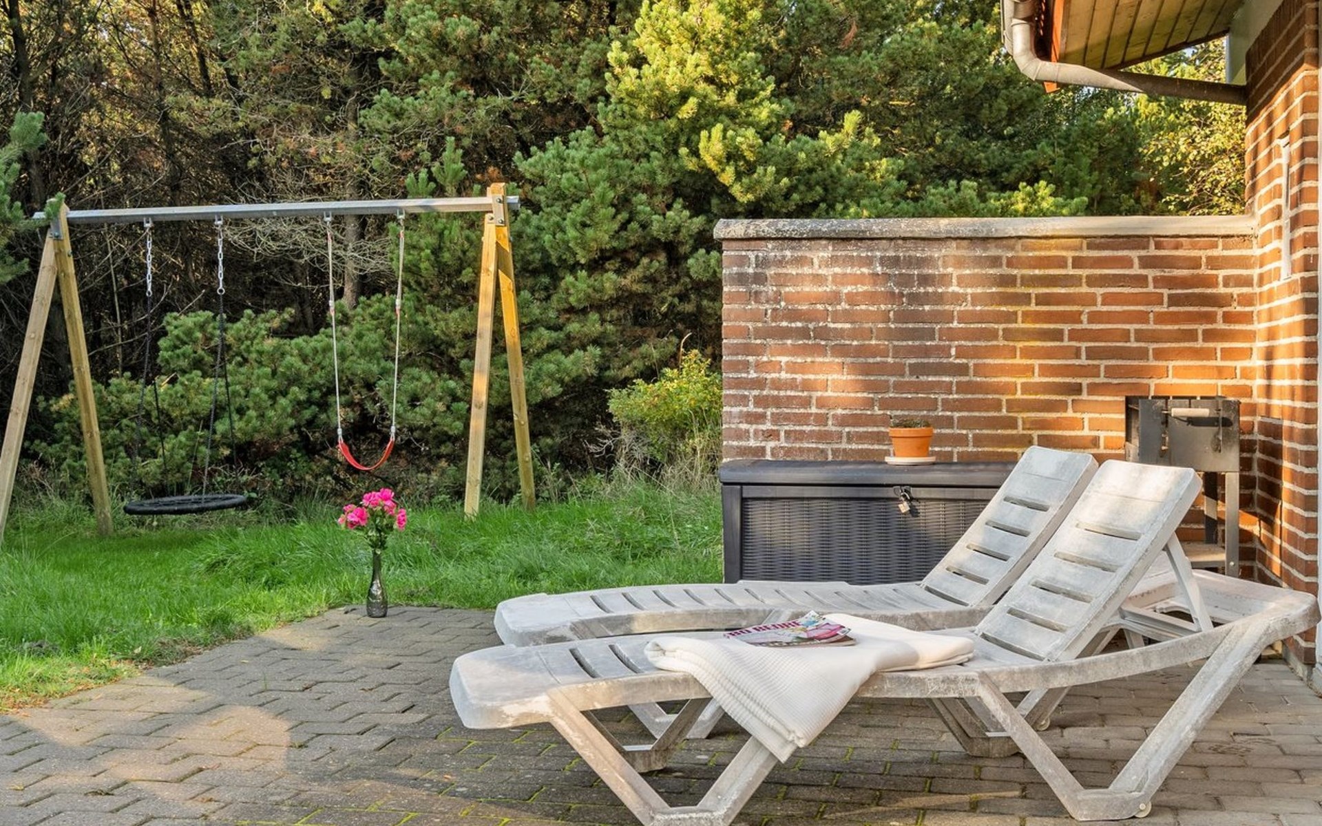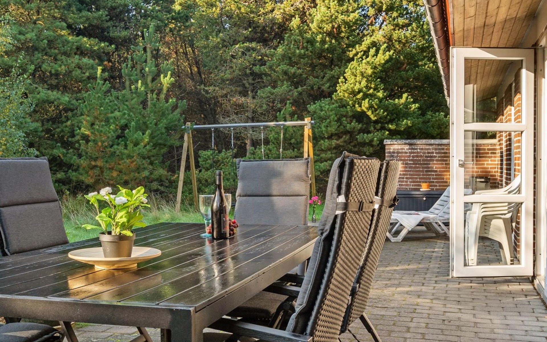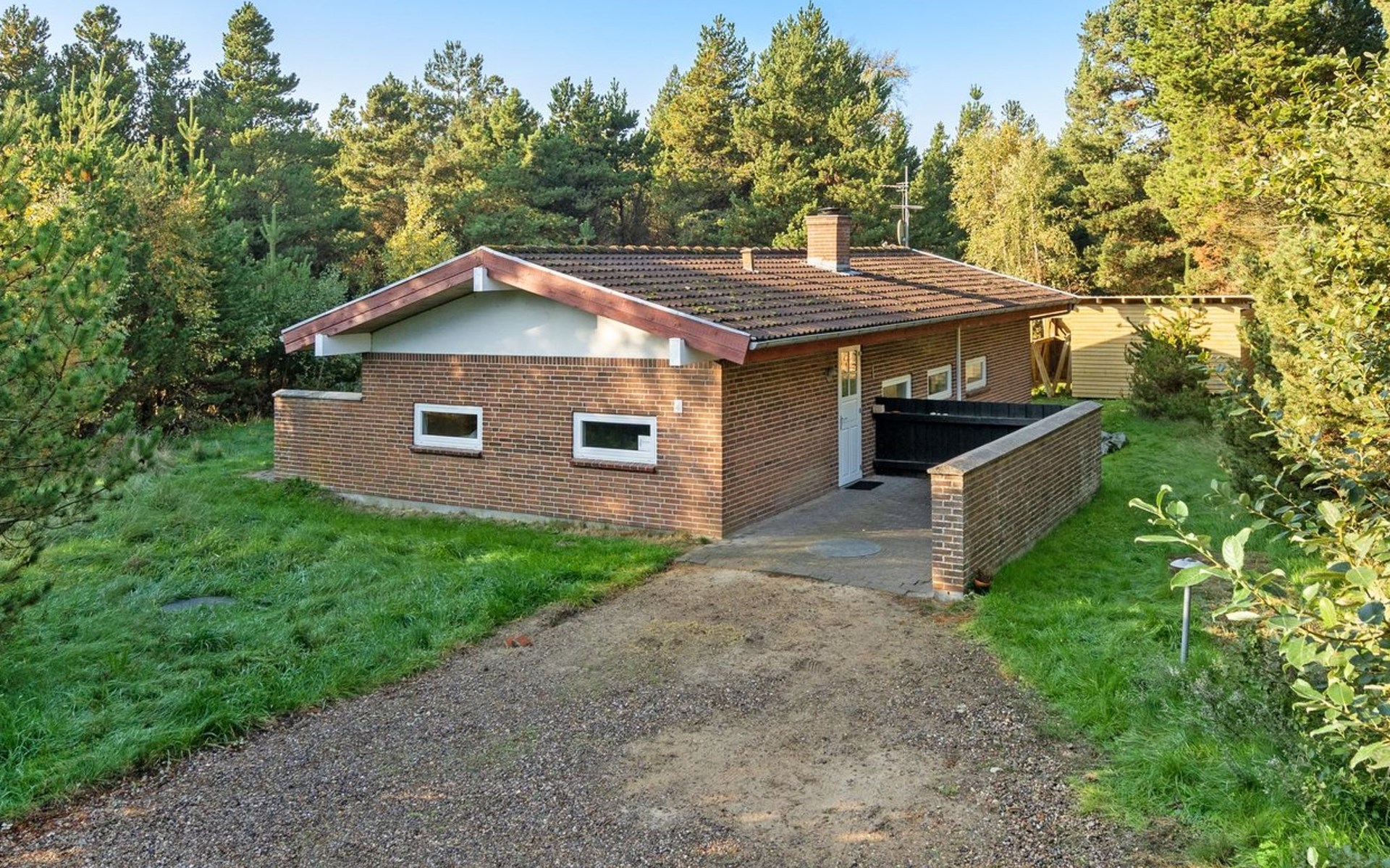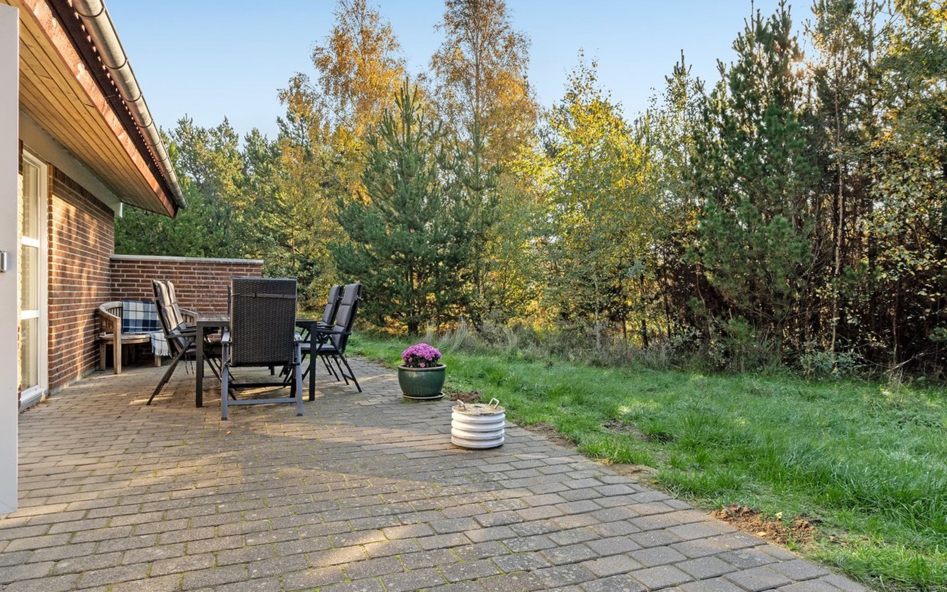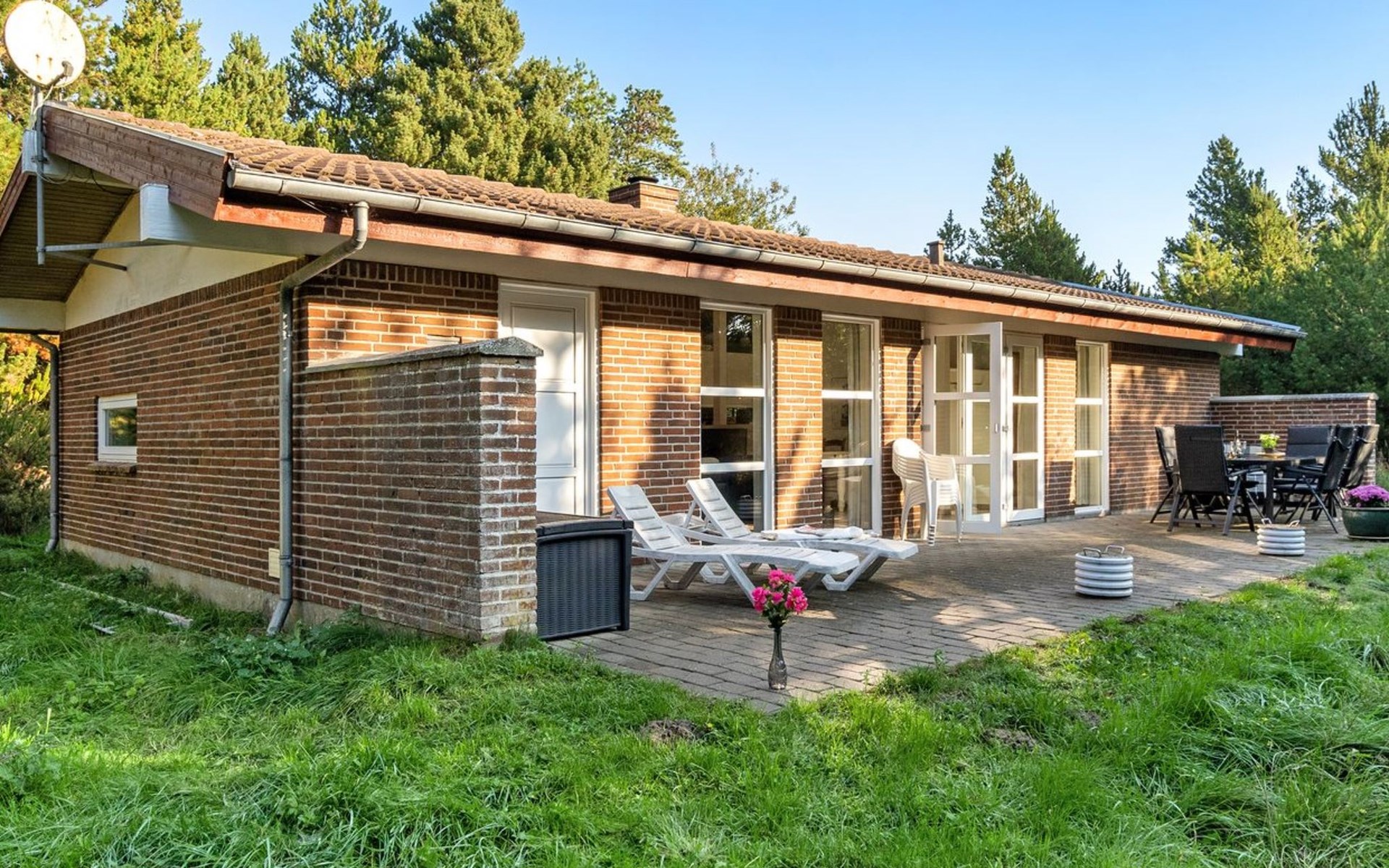 Single-family house, built in 1977. 1 km from the sea. Private: natural state property 2'908 m2. Children's playground (swing). In the house: washing machine, tumble dryer. Parking at the house. Grocery 2.8 km. Golf course 300 m. The owner does not accept any youth groups.