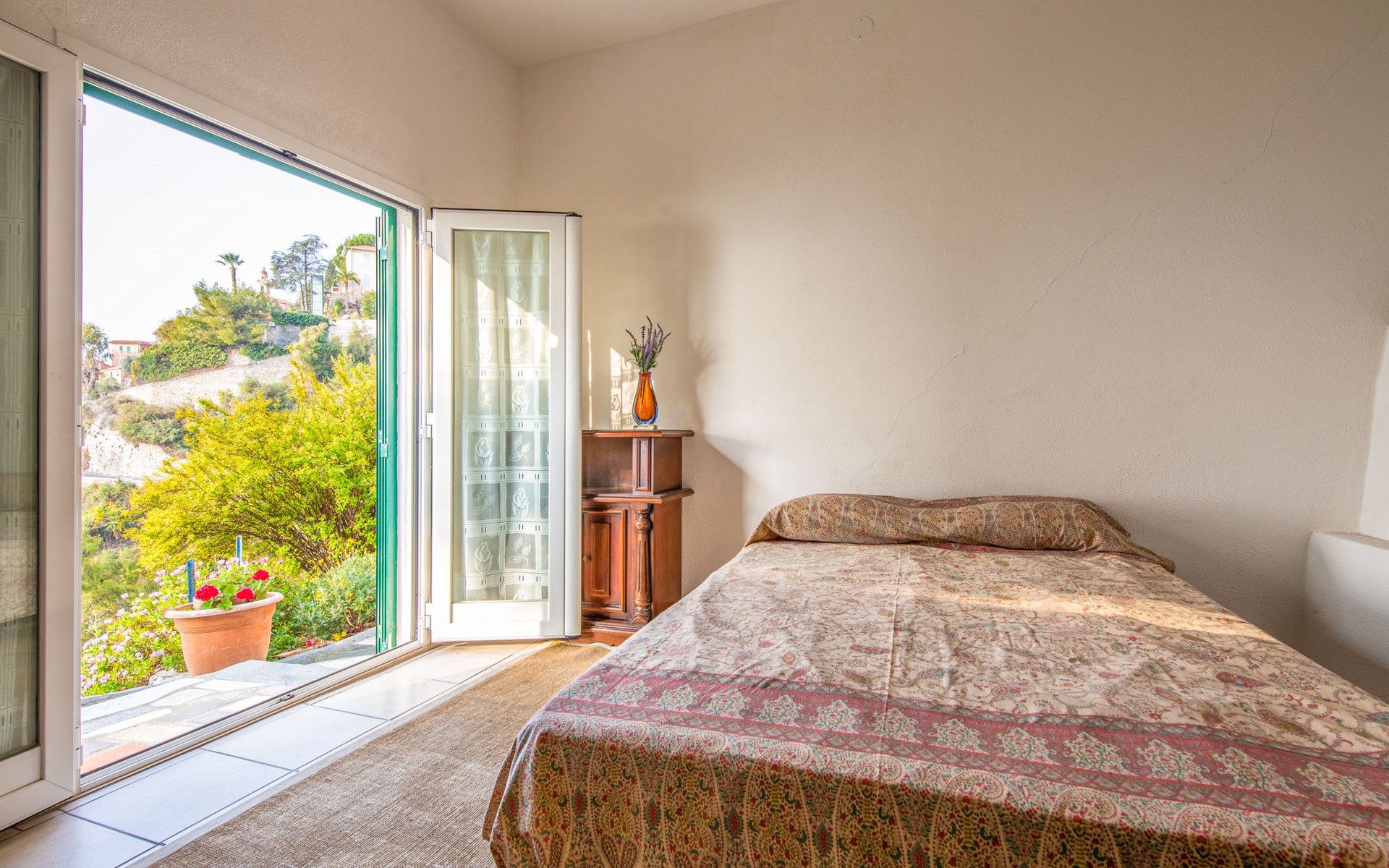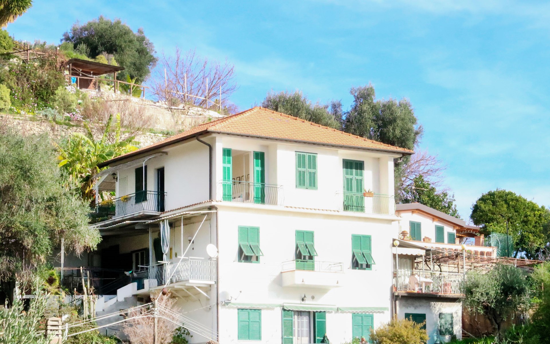 3-family house. In the district of Mortola Inferiore 1.5 km from the centre of Latte, 6 km from the centre of Ventimiglia, 6 km from the centre of Menton (Côte d'Azur), in a secluded, elevated position on a slope, 800 m from the sea. Private: small garden 20 m2 with wildlife garden. Steep footpath (40 steps) to the house. Public parking on the road. Supermarket 1.5 km, restaurant 2 km, bar 2 km, bus stop "Mortola Inferiore/Giardini Hanbu" 300 m, railway station "Ventimiglia" 6 km, sandy beach "Ventimiglia/Menton" 4 km pebble beach 1.5 km. Golf course (18 hole) 25 km. Nearby attractions: Giardini Botanici Hanbury 300 m, Balzi Rossi 3 km.