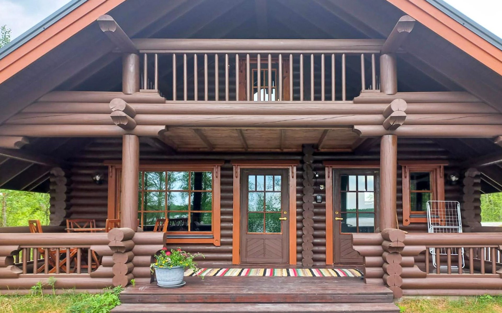 Log cottage 2003, living room/kitchen, bedroom double bed, sleeping loft (30 m²) 4 beds, washroom, sauna (electric stove), open porch and balcony. Separate lakeshore sauna with dressing room, shared with neighbouring cottage 8121. Sauna has manual water pump and hot water container on stove.
