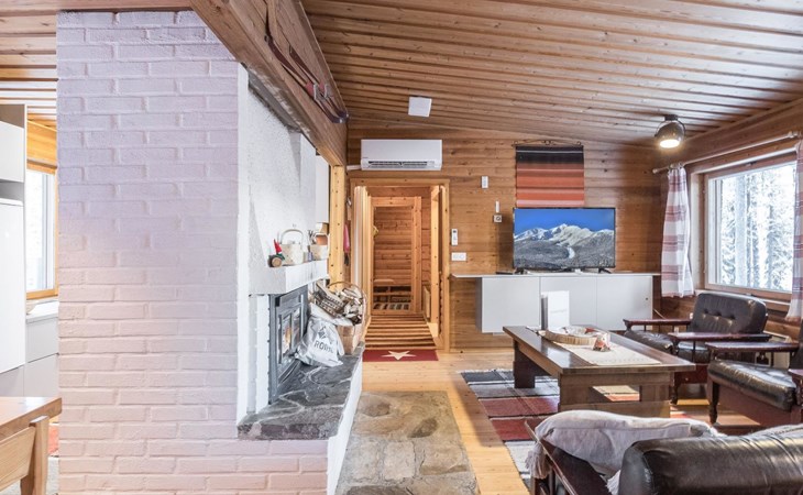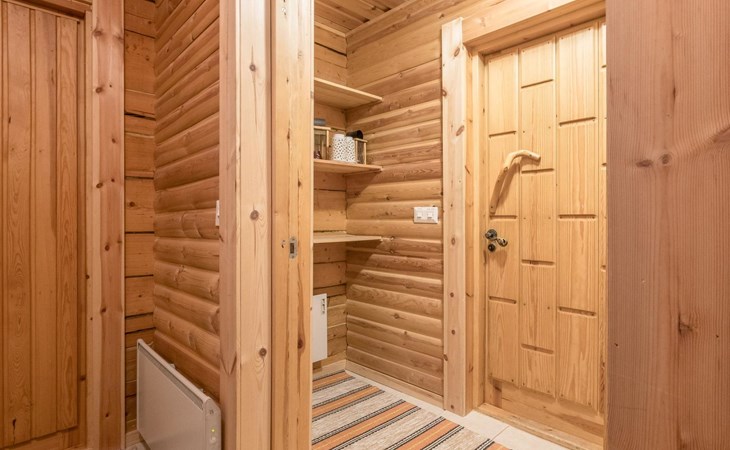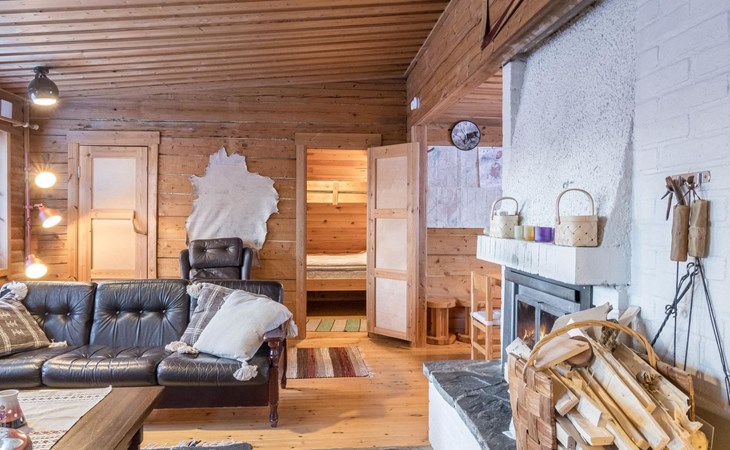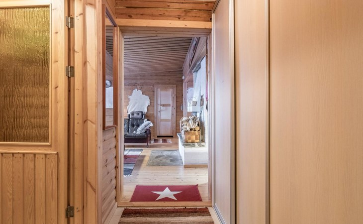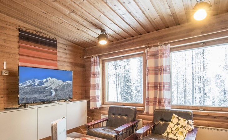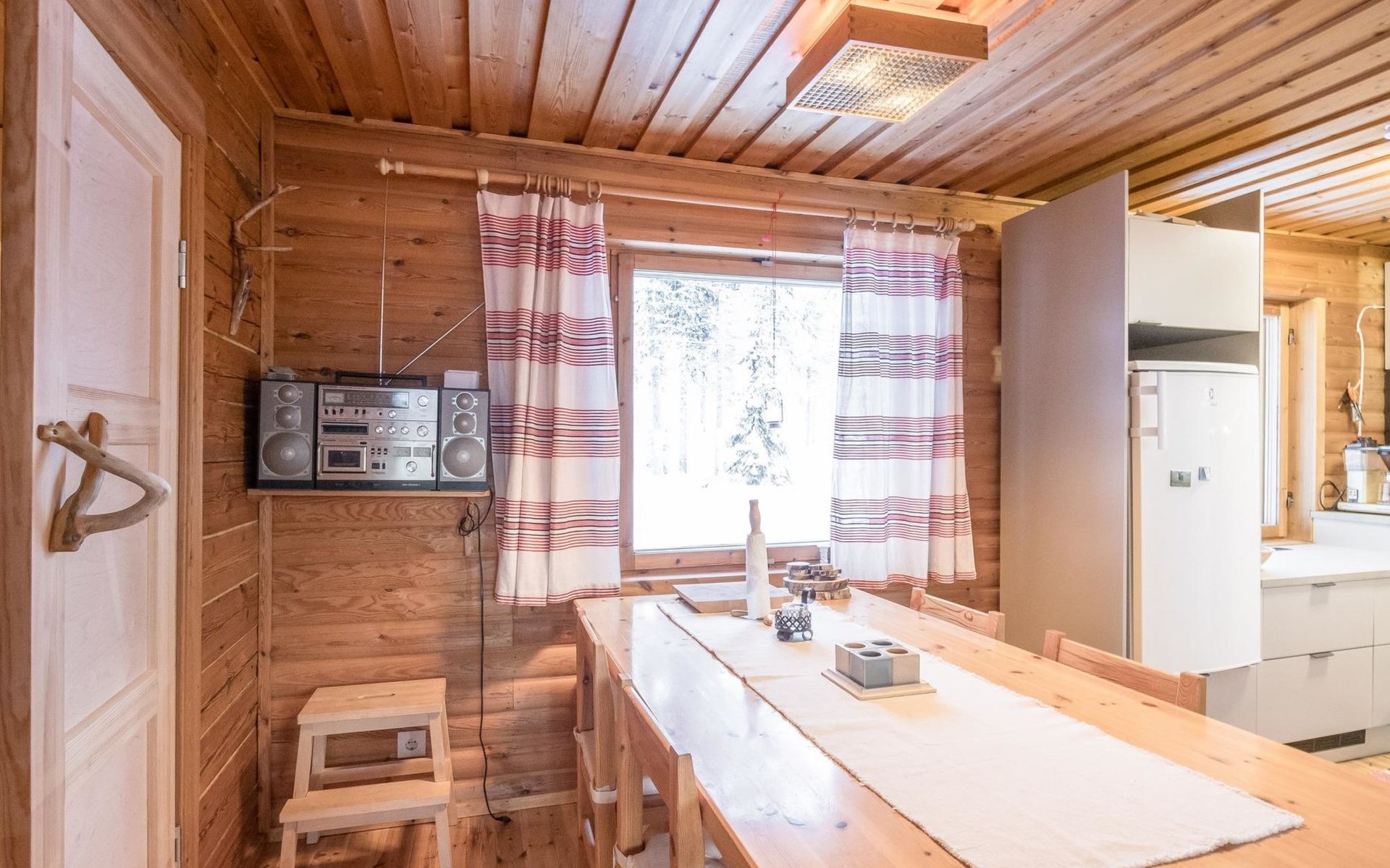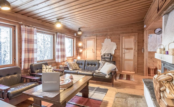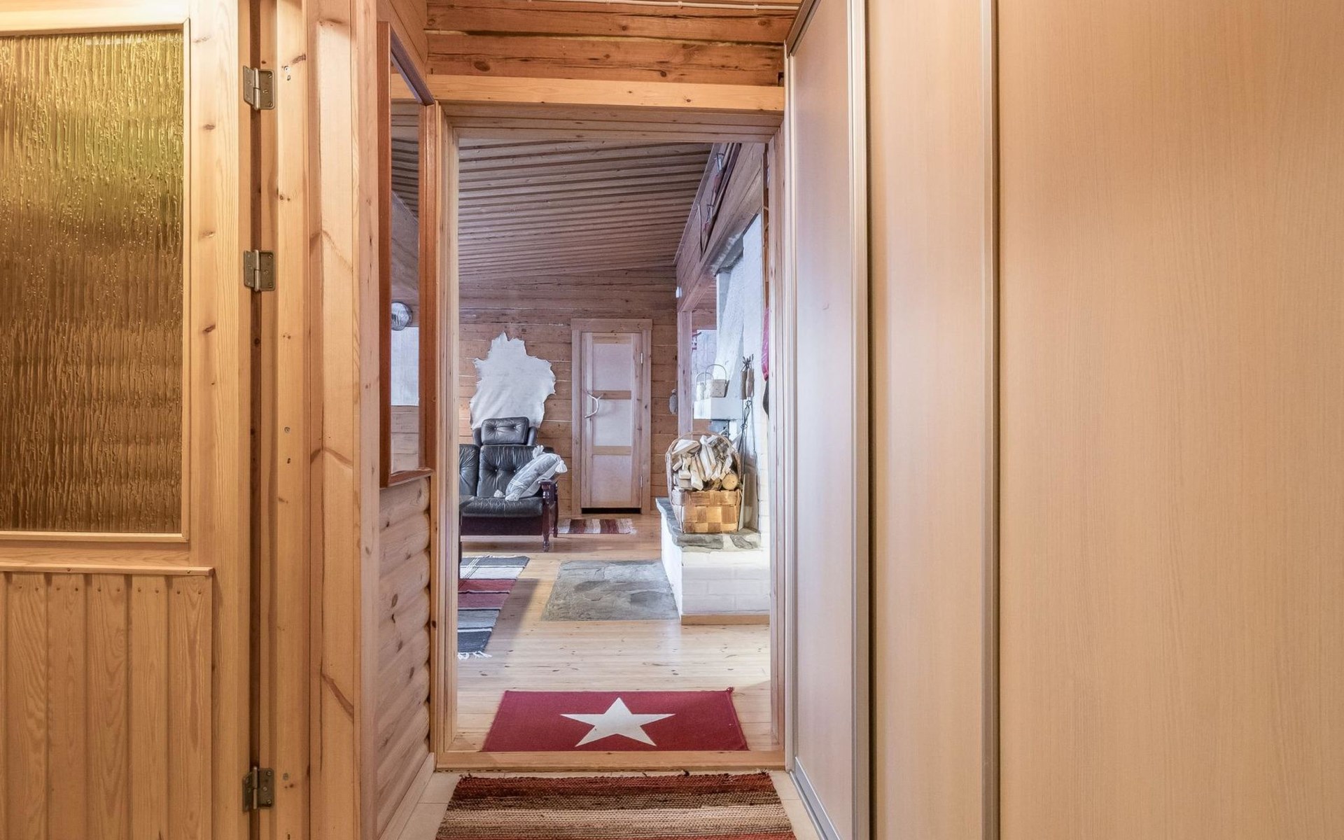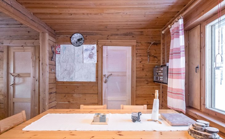 This atmospheric cabin combines nostalgic charm with modern comfort – the kitchen was renovated in 2024, and the cabin has everything needed for a relaxing holiday. The cabin is also equipped with fiber optic internet and Wi-Fi, ensuring a fast and reliable connection. The cozy open-plan kitchen and living area invite you to relax: the dining area has seating for six people, and the living room’s sofa set offers a comfortable spot to rest by the heat-storing fireplace while enjoying the forest views. You may even spot reindeer wandering through the area.